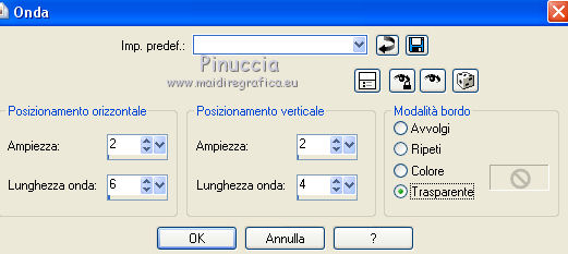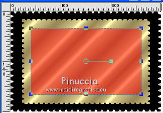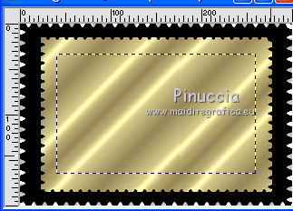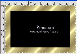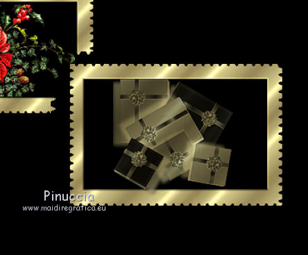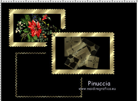 qui puoi trovare qualche risposta ai tuoi dubbi. Se l'argomento che ti interessa non è presente, ti prego di segnalarmelo. Questo tutorial è stato creato con Psp 9, ma può essere eseguito anche con le altre versioni di PSP. Per tradurlo, ho usato PSP X. Questo tutorial è ©Daty*Le-Beatrice e non può essere copiato su altri siti nè essere offerto per il download. Lo stesso vale per la mia traduzione. Il materiale viene da vari gruppi di condivisione. Il copyright appartiene ai rispettivi autori. Grazie ai creatori dei tubes che mettono a disposizione il loro lavoro in vari gruppi di condivisione. Occorrente: Materiale qui Per il materiale grazie Kara e RW. Rispetta il lavoro degli autori, non cambiare il nome del file e non cancellare il watermark. Metti il pennello "packen" nella cartella Pennelli. Attenzione, il pennello è composto da due files che non devono essere separati. Vedi gli appunti sui pennelli qui 1. Imposta il colore di primo piano con il colore nero. Passa il colore di sfondo a Motivi e seleziona un motivo oro a tua scelta. Apri una nuova immagine trasparente 300 x 200 pixels e riempila con il colore nero.Effetti>Effetti di distorsione>Onda. ![]() Attiva lo strumento Bacchetta magica ![]() e clicca al centro dell'immagine per selezionare la parte nera. Riempi con il motivo oro.Selezione>Deseleziona. 2. Selezione>Seleziona tutto. Selezione>Modifica>Contrai - 25 pixels. Riempi con il colore nero.Effetti>Effetti 3D>Smusso a rilievo. ![]() Selezione>Deseleziona. La prima cornice è fatta. ![]() Minimizza la cornice, che userai più tardi. 3. Apri una nuova immagine trasparente 300 x 200 pixels, e riempila con il colore nero.Effetti>Effetti di distorsione>Onda, con i settaggi precedenti. Attiva lo strumento Bacchetta magica ![]() e clicca al centro dell'immagine per selezionare la parte nera. Livelli>Nuovo livello raster. Riempi con il motivo oro.Immagine>Ridimensiona, all'85%, tutti i livelli non selezionato. Selezione>Seleziona tutto. Selezione>Modifica>Contrai - 40 pixels. Selezione>Modifica Selezione e l'area selezionata diventerà rossa. Attiva lo strumento Puntatore ![]() deformazione se stai usando PSP 9,e usa i nodi centrali per dare alla selezione una forma più regolare. ![]() Di nuovo Selezione>Modifica selezione e la selezione sarà nuovamente normale. ![]() Mantieni selezionato. Effetti>Effetti 3D>Smusso a rilievo, con i settaggi precedenti. Riempi nuovamante la selezione con il colore nero.Selezione>Deseleziona. Livelli>Unisci>Unisci visibile. Ed è fatta anche la seconda cornice. ![]() Minimizza anche questa cornice. 4. Apri una nuova immagine trasparente 300 x 200 pixels e riempila con il colore nero.Effetti>Effetti di distorsione>Onda, con i settaggi precedenti. Attiva lo strumento Bacchetta magica ![]() e clicca al centro dell'immagine per selezionare la parte nera. Livelli>Nuovo livello raster. Riempi con il motivo oro.Selezione>Modifica>Contrai - 2 pixels. Premi sulla tastiera il tasto CANC ![]() Selezione>Deseleziona. Livelli>Unisci>Unisci visibile. Ed è fatta anche la terza cornice. ![]() 5. Apri una nuova immagine nera 550 x 400 pixels. Attiva la prima cornice e vai a Modifica>Copia. Torna al tuo lavoro e vai a Modifica>incolla come nuovo livello. Immagine>Ridimensiona, 1 volta all'85% e una volta al 90%, tutti i livelli non selezionato. Sposta la cornice in alto a sinistra.Apri il tube weihnachsstern e vai a Modifica>Copia. Torna al tuo lavoro e vai a Modifica>Incolla come nuovo livello. Spostalo al centro della cornice.![]() Attiva la seconda cornice e vai a Modifica>Copia. Torna al tuo lavoro e vai a Modifica>incolla come nuovo livello. Sposta la cornice a destra.Attiva lo strumento Pennello ![]() cerca e seleziona il pennello packen ![]() e applicalo al centro della cornice, cliccando con il tasto destro del mouse, per usare il motivo oro. Effetti>Effetti 3D>Sfalsa ombra. ![]() ![]() 6. Apri la terza cornice e vai a Modifica>Copia. Torna al tuo lavoro e vai a Modifica>Incolla come nuovo livello. Immagine>Ridimensiona, al 90%, tutti i livelli non selezionato. Spostala in basso a sinistra.Porta questo livello sotto il livello della seconda cornice. ![]() 7. Attiva lo strumento Testo ![]() Scegli un font e scrivi un testo nella cornice. Attiva il livello superiore. Apri il tube Kerzen e vai a Modifica>Copia. Torna al tuo lavoro e vai a Modifica>Incolla come nuovo livello. Immagine>Ridimensiona, all'85%, tutti i livelli non selezionato. Spostalo in basso a destra.8. Firma il tuo lavoro. Se vuoi, un piccolo bordo, e salva in formato jpg. ![]() Se hai problemi o dubbi, o trovi un link non funzionante, o anche soltanto per un saluto, scrivimi 26 Novembre 2012 |
