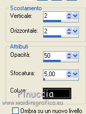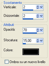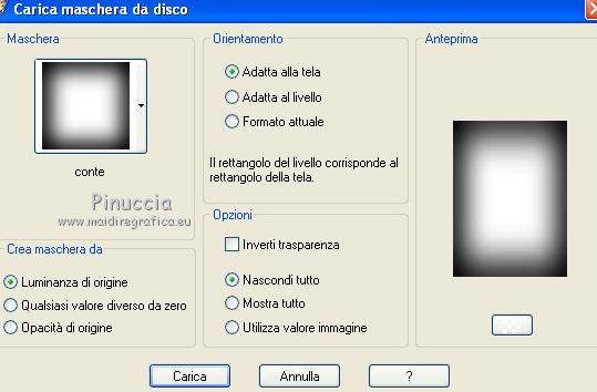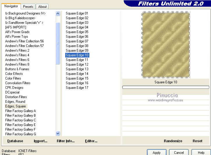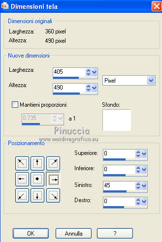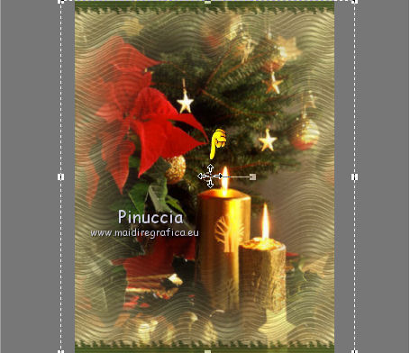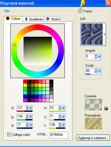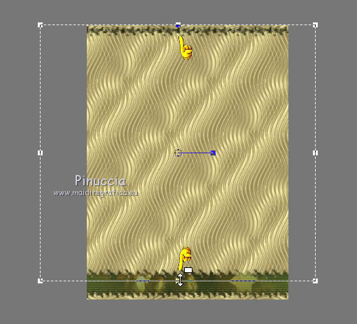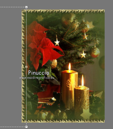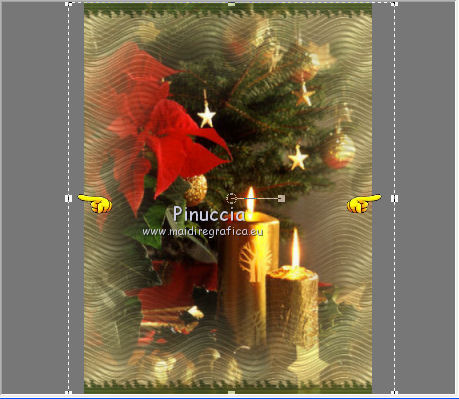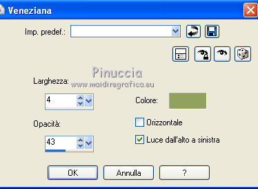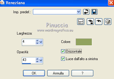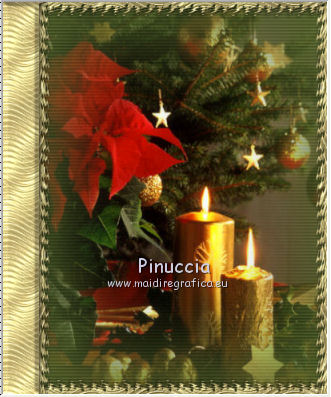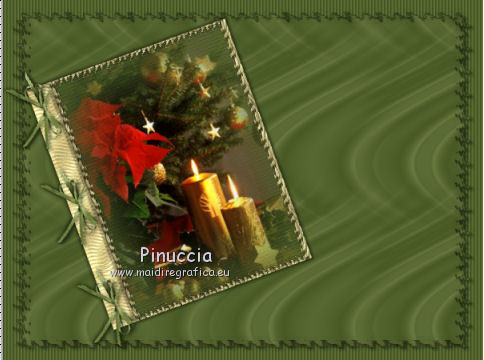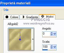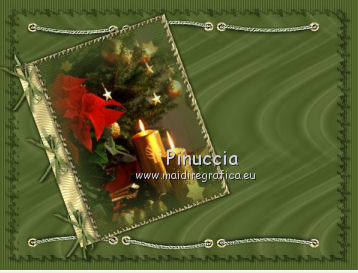 qui puoi trovare qualche risposta ai tuoi dubbi. Se l'argomento che ti interessa non è presente, ti prego di segnalarmelo. Questo tutorial è stato creato con PSP 9, ma può essere eseguito anche con le altre versioni di PSP. Per tradurlo, ho usato PSP X. Questo tutorial è ©Daty*Le-Beatrice e non può essere copiato su altri siti nè essere offerto per il download. Lo stesso vale per la mia traduzione. Il materiale viene da vari gruppi di condivisione. Il copyright appartiene ai rispettivi autori. Grazie ai creatori dei tubes che mettono a disposizione il loro lavoro in vari gruppi di condivisione. Occorrente: Materiale qui Per i tubes grazie Becky, MD2000. Rispetta il lavoro degli autori, non cambiare il nome del file e non cancellare il watermark. Filtri: FM Tile Tools qui Filters Unlimited qui ![]() Metti la maschera nella cartella Maschere. Metti la trama Lk6 nella cartella Trame. 1. Imposta il colore di primo piano con #79884d, e il colore di sfondo con #415220. Apri l'immagine "1903". Livelli>Carica/Salva maschera>Carica maschera da disco. Cerca e carica la maschera "Conte. ![]() Livelli>Unisci>Unisci gruppo. Livelli>Nuovo livello raster. Livelli>Disponi>Sposta giù. Riempi con il colore scuro.Effetti>Effetti di trama>Veneziana, con il colore #91a25e. ![]() Livelli>Nuovo livello raster. Livelli>Disponi>Porta in alto. Passa il colore di primo piano a Motivi, e seleziona il motivo "ABgold2" con i seguenti settaggi. ![]() Riempi il livello con questo motivo.Effetti>Plugins>Filters Unlimited - Edges Square - Square Edge 10. ![]() Attiva lo strumento Deformazione (o premi sulla tastiera il tasto D),e "tira" il livello a destra e a sinistra, in modo che copra la larghezza della tela. ![]() Poi quando appare l'icona dello strumento Spostamento: ![]() sposta l'immagine fino in basso in modo che rimanga soltanto una piccola parte del bordo. ![]() Effetti>Effetti 3D>Sfalsa ombra, con il colore nero. ![]() Livelli>Duplica. Immagine>Capovolgi. Livelli>Duplica. Sposta questo duplicato al centro dell'immagine.Immagine>Ruota per gradi - 90 gradi a destra. ![]() Attiva lo strumento Deformazione e tira l'immagine in modo da riempire tutta l'altezza della tela.![]() Poi sposta il livello a sinistra, in modo che rimanga visibile soltanto un piccolo bordo. ![]() Livelli>Duplica. Immagine>Rifletti. E dovresti avere questo. ![]() Chiudi i due livelli inferiori. Livelli>Unisci>Unisci visibile. Effetti>Plugins>FM Tile Tools - Blend Emboss, con i settaggi standard. ![]() Riapri i livelli chiusi. Livelli>Unisci>Unisci tutto. Livelli>Nuovo livello raster. Immagine>Dimensione tela. ![]() Se stai usando un'altra immagine, dovrai sempre aggiungere 45 pixels a sinistra alla larghezza della tua immagine). Attiva il livello inferiore. e clicca con la bacchetta magica sullo spazio trasparente.Attiva il livello superiore e riempilo con il motivo oro.Effetti>Effetti 3D>Sfalsa ombra, con i settaggi precedenti. Ripeti l'Effetto Sfalsa ombra, cambiando verticale e orizzontale con i valori positivi. ![]() Effetti>Effetti 3D>Smusso a incasso. ![]() Selezione>Deseleziona. Livelli>Unisci>Unisci tutto e metti da parte l'immagine per il momento. ![]() Apri una nuova immagine trasparente 600 x 450 pixels, e riempila con il colore di sfondo #415220.Effetti>Effetti di trama>Veneziana, con il colore #91a25e. ![]() Livelli>Nuovo livello raster. Riempi nuovamente con il colore di sfondo.Apri la paletta del colore di primo piano impostato con #79884d e seleziona Trama. Quindi cerca e seleziona la trama Lk6 con i seguenti settaggi. ![]() Riempi con questo colore+trama.Selezione>Seleziona tutto. Selezione>Modifica>Contrai - 10 pixels. Effetti>Plugins>Filters Unlimited 2.0 - Edges Square - Square Edge 10. Selezione>Inverti. Premi sulla tastiera il tasto CANC. Selezione>Deseleziona. Effetti>Effetti 3D>Sfalsa ombra, con i settaggi precedenti. Apri l'immagine che hai messo da parte prima e vai a Modifica>Copia. Torna al tuo lavoro e vai a Modifica>Incolla come nuovo livello. Immagine>Ridimensiona, al 65%, tutti i livelli non selezionato. Apri il tube "Schleife" e vai a Modifica>Copia. Torna al tuo lavoro e vai a Modifica>Incolla come nuovo livello. Regola>Tonalità e saturazione>Viraggio. ![]() Immagine>Ridimensiona, al 40%, tutti i livelli non selezionato. Immagine>Ruota per gradi - 90 gradi a destra. Effetti>Effetti 3D>Sfalsa ombra, con i settaggi precedenti. Sposta il nastro in alto sul bordo della piccola immagine.Livelli>Duplica, e sposta questo nastro sul bordo inferiore.Ancora Livelli>Duplica, e sposta questo duplicato al centro.Chiudi i due livelli inferiori e vai a Livelli>Unisci>Unisci visibile. Effetti>Effetti 3D>Sfalsa ombra, con i settaggi precedenti. Ripeti l'Effetto Sfalsa ombra, cambiando verticale e orizzontale con -2. Immagine>Ruota per gradi - 20 gradi a sinistra. ![]() Sposta l'immagine contro il bordo sinistro - vedi il mio esempio.![]() Apri il tube "Band" e vai a Modifica>Copia. Torna al tuo lavoro e vai a Modifica>Incolla come nuovo livello. Spostalo in alto al centro.Livelli>Duplica. Immagine>Capovolgi. ![]() Apri il tube "KersttakMD2000" e vai a Modifica>Copia. Torna al tuo lavoro e vai a Modifica>Incolla come nuovo livello. Immagine>Ridimensiona, al 60%, tutti i livelli non selezionato. Spostalo nell'angolo in alto a destra.Effetti>Effetti 3D>Sfalsa ombra, con i settaggi precedenti. Effetti>Plugins>FM Tile Tools - Blend Emboss, 2 volta con i settaggi standard. Apri il tube "HolidayVixen_Becky Tube" e vai a Modifica>Copia. Torna al tuo lavoro e vai a Modifica>Incolla come nuovo livello. Sposta questo tube a destra.Effetti>Effetti 3D>Sfalsa ombra: ![]() Livelli>Nuovo livello raster. Riempi con il motivo oro.Effetti>Plugins>Filters Unlimited 2.0 - Edges Square - Square Edge 10. Sposta il livello in alto, in modo che rimanga visibile soltanto una piccola parte.Effetti>Effetti 3D>Sfalsa ombra: ![]() Effetti>Plugins>FM Tile Tools - Blend Emboss, con i settaggi standard. Livelli>Duplica. Immagine>Capovolgi. Livelli>