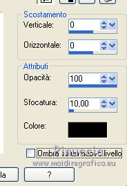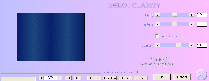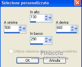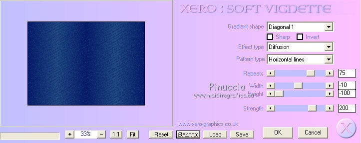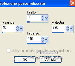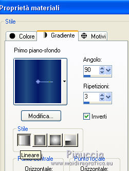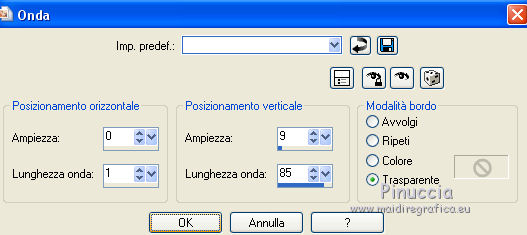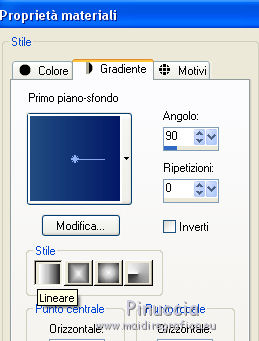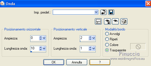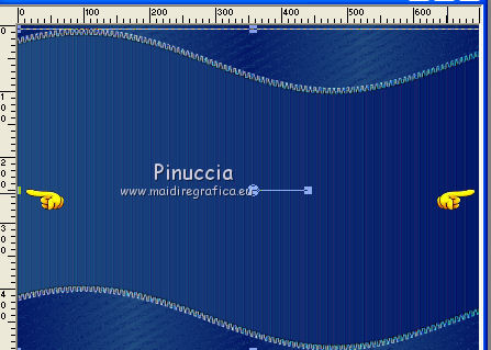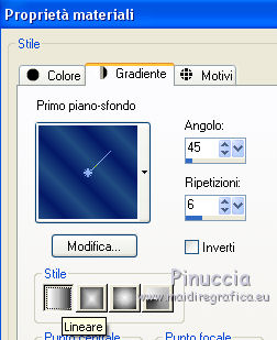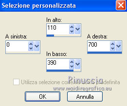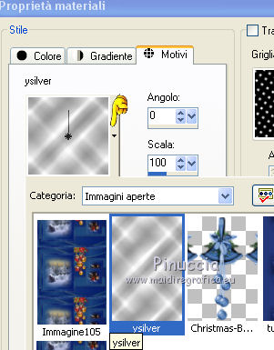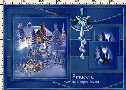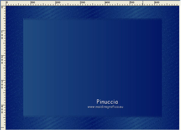 qui puoi trovare qualche risposta ai tuoi dubbi. Se l'argomento che ti interessa non è presente, ti prego di segnalarmelo. Questo tutorial è ©Daty*Le-Beatrice e non può essere copiato su altri siti nè essere offerto per il download. Lo stesso vale per la mia traduzione. Il materiale viene da vari gruppi di condivisione. Il copyright appartiene ai rispettivi autori. Grazie ai creatori dei tubes che mettono a disposizione il loro lavoro in vari gruppi di condivisione. Questo tutorial è stato creato con PspX2 e tradotto con PSP X, ma può essere eseguito anche con le altre versioni di PSP. Dalla versione X4, il comando Immagine>Rifletti è stato sostituito con Immagine>Capovolgi in orizzontale, e il comando Immagine>Capovolgi con Immagine>Capovolgi in verticale. Nelle versioni X5 e X6, le funzioni sono state migliorate rendendo disponibile il menu Oggetti. Con la nuova versione X7, sono tornati Rifletti>Capovolgi, ma con nuove varianti. Vedi la scheda sull'argomento qui Occorrente: Materiale qui Uno dei tube è di Tinnad. Filtri in caso di dubbi, ricorda di consultare la mia sezione filtri qui Xero - Soft Vignette qui Xero - Clarity qui ![]() non esitare a cambiare modalità di miscelatura e opacità secondo i colori utilizzati. Nelle ultime versioni di PSP non c'è il gradiente di primo piano/sfondo (Corel_06_029) Puoi usare i gradienti delle versioni precedenti. Trovi qui i gradienti Corel X. Apri il font e minimizzalo. Lo troverai nella lista dei font disponibili quando ti servirà. Con i nuovi sistemi operativi questo non è più possibile. Per usare un font, occorre copiarlo nella cartella Font di Windows. Apri il motivo argento in PSP e minimizzalo con il resto del materiale. 1. Scegli due colori dal tuo tube. Per l'esempio: imposta il colore di primo piano con #214c81 e il colore di sfondo con #041967. ![]() Passa il colore di primo piano a Gradiente di primo piano/sfondo, stile Lineare. ![]() Passa il colore di sfondo a Motivi e, sotto la categoria Immagini aperte, seleziona il motivo argento, con i seguenti settaggi. ![]() Apri una nuova immagine trasparente 700 x 500 pixels, e riempila con il gradiente.Effetti>Plugins>Xero - Soft Vignette ![]() Effetti>Plugins>Xero - Clarity. ![]() 2. Livelli>Nuovo livello raster. Cambia i settaggi del gradiente ![]() Riempi il livello con il gradiente.Effetti>Effetti di distorsione>Onda ![]() Immagine>Ridimensiona, all'80%, tutti i livelli non selezionato. Risultato ![]() Ripeti Effetti>Effetti di distorsione>Onda, con i seguenti settaggi ![]() Effetti>Effetti di bordo>Aumenta di più - 2 volte. Attiva lo strumento Puntatore ![]() o Deformazione ![]() in modalità Scala ![]() tira i bordi centrali a destra e a sinistra fino ai bordi ![]() Effetti>Effetti 3D>Sfalsa ombra. ![]() 3. Livelli>Nuovo livello raster. Attiva lo strumento Selezione ![]() (non importa il tipo di selezione impostato, perchè con la selezione personalizzata si ottiene sempre un rettangolo) clicca sull'icona Selezione personalizzata ![]() e imposta i seguenti settaggi. ![]() Riempi la selezione con il motivo argento di sfondo "ysilver".Selezione>Modifica>Contrai - 1 pixel. Passa il colore di primo piano a Colore e riempi la selezione con il colore di primo piano.Effetti>Effetti di trama>Intessitura. ![]() 4. Effetti>Effetti 3D>Sfalsa ombra, con i settaggi precedenti. Selezione>Deseleziona. Livelli>Nuovo livello raster. Selezione personalizzata ![]() ![]() Riempi la selezione con il motivo argento.Selezione>Modifica>Contrai - 1 pixel. Riporta il colore di primo piano a Gradiente ![]() Riempi la selezione con il gradiente.Effetti>Effetti di bordo>Aumenta di più - 2 volte. Selezione>Deseleziona. Effetti>Effetti 3D>Sfalsa ombra, con i settaggi precedenti. 5. Livelli>Nuovo livello raster. Selezione personalizzata ![]() ![]() Riempi la selezione con il motivo argento di sfondo "ysilver".Selezione>Modifica>Contrai - 1 pixel. Cambia i settaggi del gradiente ![]() Riempi la selezione con il gradiente.Selezione>Modifica>Contrai - 15 pixels. Riempi la selezione con il motivo argento di sfondo.Selezione>Modifica>Contrai - 1 pixel. Cambia ancora i settaggi del gradiente ![]() Riempi la selezione con il gradiente.Apri il tube "Winterlandschaft" e vai a Modifica>Copia. Torna al tuo lavoro e vai a Modifica>Incolla nella selezione. Selezione>Deseleziona. Effetti>Effetti 3D>Sfalsa ombra, con i settaggi precedenti. 6. Livelli>Nuovo livello raster. Selezione personalizzata ![]() ![]() Riempi la selezione con il motivo argento di sfondo "ysilver".Selezione>Modifica>Contrai - 1 pixel. Riempi la selezione con il gradiente.Selezione>Modifica>Contrai - 15 pixels. Riempi la selezione con il motivo argento di sfondo "ysilver".Selezione>Modifica>Contrai - 1 pixel. Riempi la selezione con il gradiente.Apri il tube "tubes tinnad (13)" e vai a Modifica>Copia. Torna al tuo lavoro e vai a Modifica>Incolla nella selezione. Effetti>Plugins>Xero - Clarity, con i settaggi precedenti - 2 volte. Selezione>Deseleziona. Effetti>Effetti 3D>Sfalsa ombra, con i settaggi precedenti. 7. Livelli>Duplica, Sposta questa cornice un po' più in basso e a sinistra.![]() Livelli>Nuovo livello raster. Selezione>Seleziona tutto. Riempi la selezione con il motivo argento di sfondo "ysilver".Selezione>Modifica>Contrai - 1 pixel. Cambia ancora i settaggi del gradiente ![]() Riempi la selezione con il gradiente.Selezione>Modifica>Contrai - 18 pixels. Riempi la selezione con il motivo argento.Selezione>Modifica>Contrai - 1 pixel. Effetti>Effetti 3D>Ritaglio. ![]() Selezione>Deseleziona. 8. Apri il tube "Christmas-Bells" e vai a Modifica>Copia. Torna al tuo lavoro e vai a Modifica>Incolla come nuovo livello. Immagine>Ridimensiona, al 45%, tutti i livelli non selezionato. Effetti>Plugins>Xero - Clarity, con i settaggi precedenti - 2 volte. Effetti>Effetti 3D>Sfalsa ombra, con i settaggi precedenti. Sposta il tube in alto al centro, come nell'esempio.![]() 9. Attiva lo strumento Testo , font Al Hurried Note![]() Chiudi il colore di