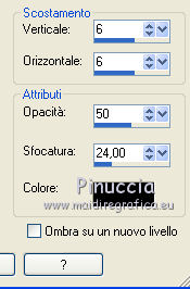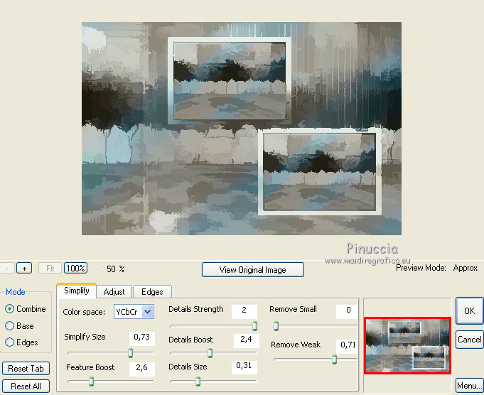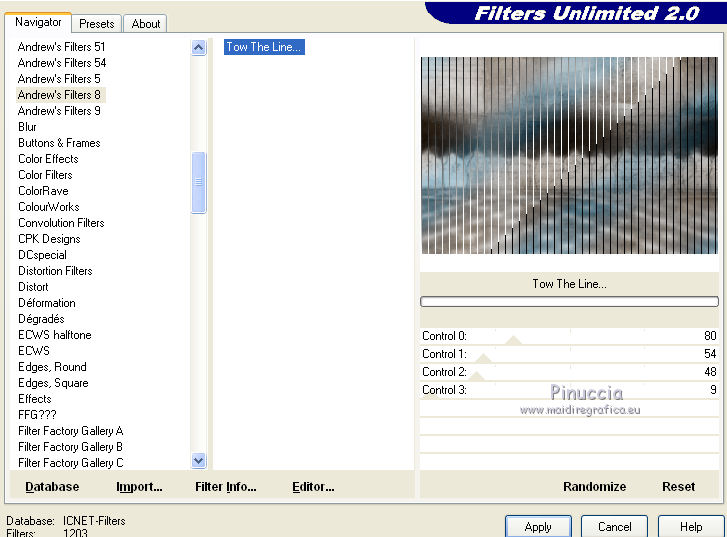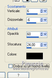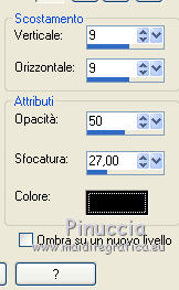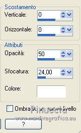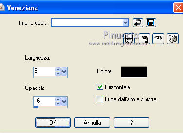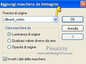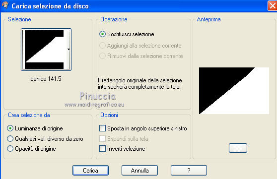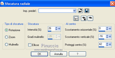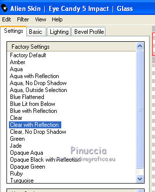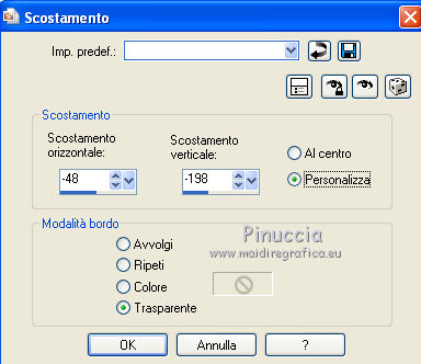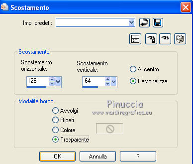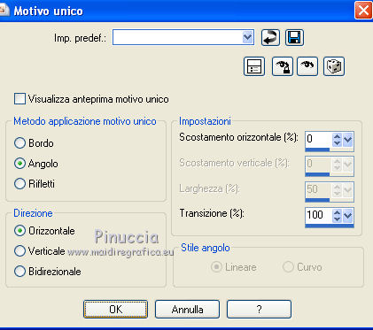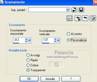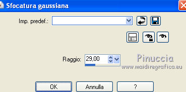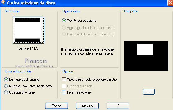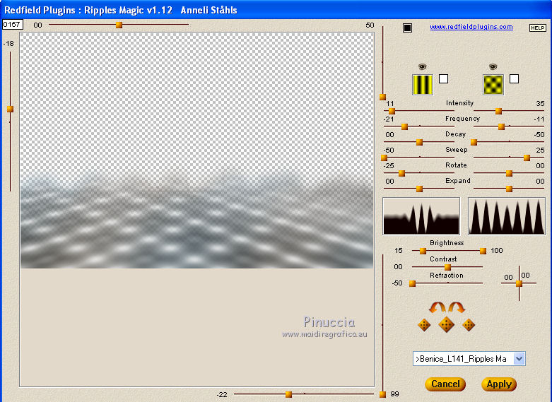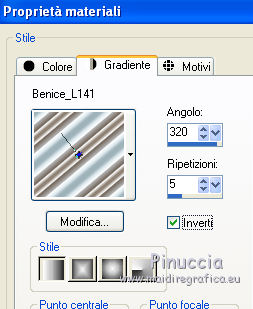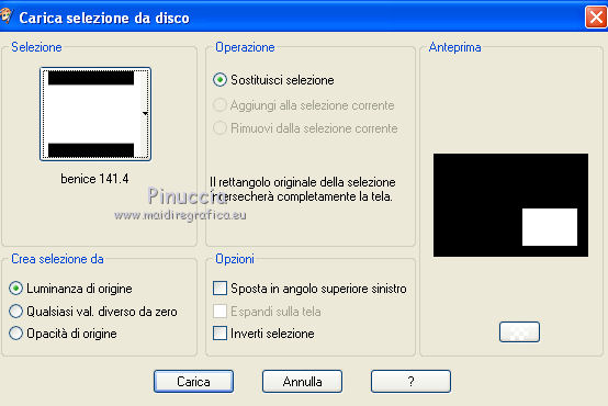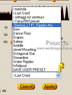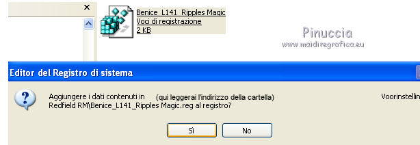 qui puoi trovare qualche risposta ai tuoi dubbi. Se l'argomento che ti interessa non è presente, ti prego di segnalarmelo. Occorrente: Materiale qui Il tube della donna è di Thafs. Il resto del materiale - che non può essere usato per altri tutorial - è di Benice. Filtri: consulta, se necessario, la mia sezione filtri qui Filters Unlimited 2.0 qui Alien Skin Eye Candy 5 Impact qui Andrew's Filter 8 qui Redfield - Ripples Magic qui Topaz - Simplify 2 qui vedi le note di installazione del filtro Topaz qui I filtri Andrew's per essere usati devono prima essere convertiti. Come fare vedi qui Si usano importandoli in Filters Unlimited (come fare vedi qui) ma possono funzionare anche da soli. Il filtro fornito è stato già convertito. ![]() Per installare il preset Benice_L141_Ripples Magic nella cartella del filtro, clicca sul file, e nella ok alla finestra che richiede la conferma. ![]() Metti il gradiente nella cartella Gradienti. Metti le selezioni nella cartella Selezioni. Apri la maschera in PSP e minimizzala con il resto del materiale. Passa il colore di primo piano a Gradiente, e seleziona il gradiente Benice_L141, con i seguenti settaggi. ![]() Imposta il colore di sfondo con il colore bianco. ![]() 1. Apri una nuova immagine trasparente 900 x 600 pixels, e riempila con il gradiente.Regola>Sfocatura>Sfocatura gaussiana - raggio 29. ![]() 2. Livelli>Nuovo livello raster. Selezione>Seleziona tutto. Apri l'immagine Donna-becher-lattice-impressions-i e vai a Modifica>Copia. Torna al tuo lavoro e vai a Modifica>Incolla nella selezione. Selezione>Deseleziona. Cambia la modalità di miscelatura di questo livello in Luminanza. 3. Livelli>Nuovo livello raster. Selezione>Seleziona tutto. Apri il tube Benice_L141_misted_landscape e vai a Modifica>Copia. Torna al tuo lavoro e vai a Modifica>Incolla nella selezione. Selezione>Deseleziona. Effetti>Effetti di immagine>Motivo unico. ![]() Cambia la modalità di miscelatura di questo livello in Luminanza (esistente). 4. Livelli>Nuovo livello raster. Selezione>Seleziona tutto. Apri il tube Benice_L141_misted _tekst e vai a Modifica>Copia. Torna al tuo lavoro e vai a Modifica>Incolla nella selezione. Selezione>Deseleziona. Effetti>Effetti di bordo>Aumenta. Effetti>Effetti di immagine>Scostamento. ![]() Cambia la modalità di miscelatura di questo livello in Moltiplica. Livelli>Unisci>Unisci visibile. 5. Selezione>Carica/Salva selezione>Carica selezione da disco. Cerca e carica la selezione Benice 141. ![]() Selezione>Innalza selezione a livello. Regola>Sfocatura>Sfocatura gaussiana - raggio 100. ![]() Effetti>Plugins>Redfield - Ripples Magic, apri il menu delle impostazioni predefinite e seleziona Benice_L141_Ripples Magic: ![]() Se hai problemi con il preset, puoi impostare manualmente i settaggi che vedi nella schermata. ![]() Selezione>Deseleziona. Cambia la modalità di miscelatura di questo livello in Luminanza, e abbassa l'opacità al 60%. 6. Livelli>Unisci>Unisci visibile. Finestra>Duplica (o maiuscola+D) per fare una copia. Minimizza la copia che userai più tardi. 7. Torna al tuo lavoro. Livelli>Nuovo livello raster. Riempi il livello con il colore di sfondo.Livelli>Nuovo livello maschera>Da immagine. Apri il menu sotto la finestra di origine e vedrai la lista dei files aperti. Seleziona la maschera Jillmask_mohm, con i seguenti settaggi: ![]() Livelli>Unisci>Unisci gruppo. Regola>Messa a fuoco>Metti a fuoco. Selezione>Carica/Salva selezione>Carica selezione da disco. Cerca e carica la selezione Benice 141.2. ![]() Premi sulla tastiera il tasto CANC. Selezione>Deseleziona. Cambia la modalità di miscelatura di questo livello in Sovrapponi, e abbassa l'opacità al 78%. 8. Livelli>Nuovo livello raster. Selezione>Carica/Salva selezione>Carica selezione da disco. Cerca e carica la selezione Benice 141.3. ![]() Attiva il duplicato del punto 6 e vai a Modifica>Copia. Minimizza nuovamente il duplicato, che ti servirà ancora. Torna al tuo lavoro e vai a Modifica>Incolla nella selezione. Selezione>Deseleziona. 9. Selezione>Carica/Salva selezione>Carica selezione da disco. Cerca e carica la selezione Benice 141.4. ![]() Modifica>Incolla nella selezione (l'immagine è ancora in memoria). Dovresti avere questo: ![]() 10. Passa il colore di primo piano da gradiente a colore e imposta il colore nero #000000. ![]() Selezione>Seleziona tutto. Selezione>Mobile. Selezione>Modifica>Seleziona bordature selezione. ![]() Livelli>Nuovo livello raster. Riempi la selezione con il colore di primo piano.Selezione>Deseleziona. Abbassa l'opacità di questo livello al 50%. 11. Livelli>Unisci>Unisci visibile. Effetti>Plugins>Topaz Labs - Topaz Simplify 2 vedi le note di installazione del filtro Topaz qui ![]() 12. Apri il tube ROSE by_Mago74 el (34) e vai a Modifica>Copia. Torna al tuo lavoro e vai a Modifica>Incolla come nuovo livello. Regola>Tonalità e Saturazione>Tonalità/Saturazione/Luminosità. ![]() Effetti>Plugins>Alien Skin Eye Candy 5 Impact - Glass. Seleziona il preset Clear with Reflection e ok. ![]() Effetti>Effetti di immagine>Scostamento. ![]() 13. Attiva lo strumento Selezione , rettangolo,e seleziona la parte del tube nella cornice. ![]() Selezione>Innalza selezione a livello. Selezione>Deseleziona. Immagine>Rifletti. Sposta le sfere nella cornice in alto.![]() Livelli>Unisci>Unisci giù. Abbassa l'opacità di questo livello al 60%. 14. Livelli>Unisci>Unisci tutto. Immagine>Aggiungi bordatura, 1 pixel, simmetriche, con il colore nero #000000. Immagine>Aggiungi bordatura, 20 pixels, simmetriche, con il colore bianco #ffffff. Attiva lo strumento bacchetta magica ![]() ![]() clicca nel bordo bianco per selezionarlo. Regola>Sfocatura>Sfocatura radiale. ![]() Selezione>Deseleziona. Immagine>Aggiungi bordatura, 1 pixel, simmetriche, con il colore nero #000000. Immagine>Ridimensiona - al 60%, tutti i livelli selezionato. Regola>Messa a fuoco>Metti a fuoco. Metti da parte l'immagine per il momento. 15. Attiva il duplicato del punto 6 e lavora su questa immagi