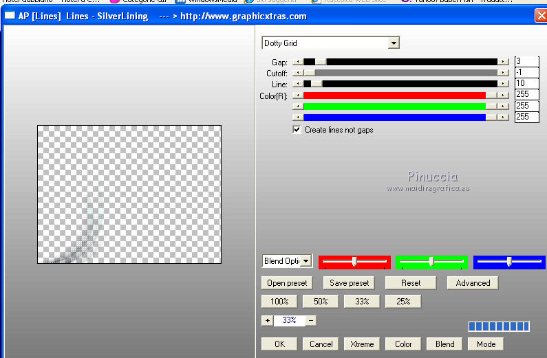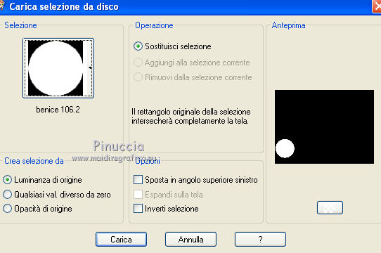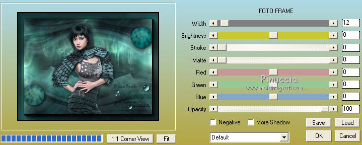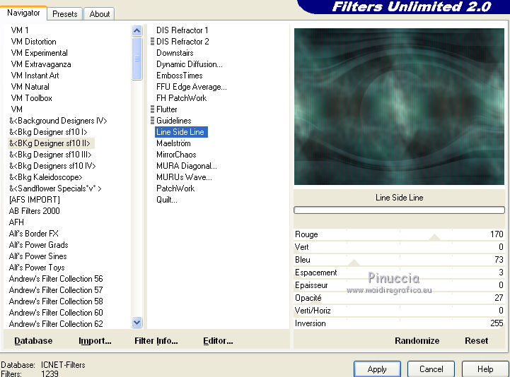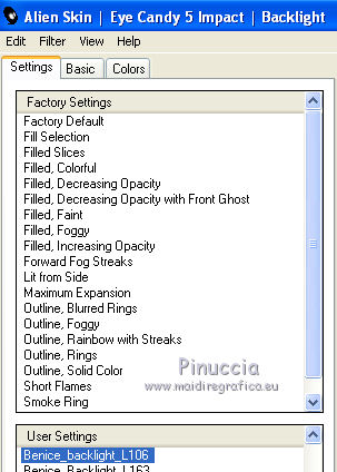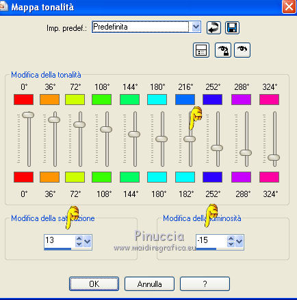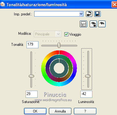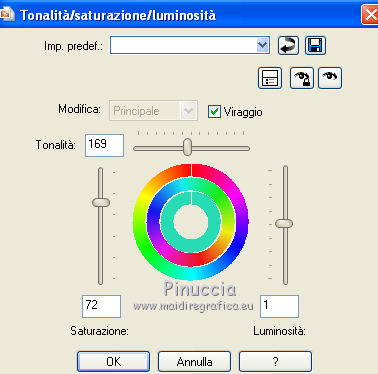 qui puoi trovare qualche risposta ai tuoi dubbi. Se l'argomento che ti interessa non è presente, ti prego di segnalarmelo. Occorrente: Materiale qui Filtri: consulta, se necessario, la mia sezione filtri qui AAA Frames qui AP Lines - Lines SilverLining qui Alien Skin Eye Candy 5 Impact qui Filters Unlimited 2.0 qui Blur (da importare in Unlimited) qui &<Bkg Designer sf10II> (da importare in Unlimited) qui ![]() Metti i preset per Flood in una cartella a scelta. Li importerai da questa cartella, quando ti serviranno. Metti il preset Benice_backlight_L106 nella cartella del filtro Alien Skin Eye Candy 5 Impact>Settings>Backlight. Cliccando sul file (una o due volte, a seconda delle tue impostazioni), automaticamente il preset si installerà nella cartella corretta. Metti le selezioni nella cartella Selezioni. Imposta il colore di primo piano con #2a3c3f, e il colore di sfondo con il colore nero #000000. ![]() 1. Apri la maschera Masque-mentali 72. Attiva lo strumento Selezione , cerchio,e traccia un cerchio al centro della maschera. ![]() Riempi con il colore di sfondo.Selezione>Deseleziona. Minimizza la maschera. 2. Apri una nuova immagine trasparente 800 x 600 pixels. Selezione>Seleziona tutto. Apri l'immagine Background Benice 106, e vai a Modifica>Copia. Torna al tuo lavoro e vai a Modifica>Incolla nella selezione. Selezione>Deseleziona. 3. Livelli>Nuovo livello raster. Riempi il livello con il colore di primo piano.Livelli>Nuovo livello maschera>Da immagine. Apri il menu sotto la finestra di origine e vedrai la lista dei files aperti. Seleziona la maschera masque-mentali72, con i seguenti settaggi: ![]() Livelli>Unisci>Unisci gruppo. Cambia la modalità di miscelatura di questo livello in Differenza, e abbassa l'opacità al 47%. Livelli>Unisci>Unisci giù. Effetti>Plugins>Filters Unlimited 2.0 - &<Bkg Designers sf10II - Line Side Line. ![]() (adesso puoi chiudere la maschera, senza salvare le modifiche). 4. Apri il tube Calguismisticesnow5119 e vai a Modifica>Copia. Torna al tuo lavoro e vai a Modifica>Incolla come nuovo livello. Immagine>Ridimensiona, al 50%, tutti i livelli non selezionato. Il tube è al posto giusto. Lascialo come sta. Livelli>Duplica. Regola>Tonalità e saturazione>Tonalità/Saturazione/Luminosità. ![]() Abbassa l'opacità di questo livello al 56%. Attiva il livello sottostante dell'originale. Cambia la modalità di miscelatura di questo livello in Indebolisci, e abbassa l'opacità al 75%. Livelli>Unisci>Unisci visibile. 5. Selezione>Carica/Salva selezione>Carica selezione da disco. Cerca e carica la selezione Benice 106.1. ![]() Selezione>Innalza selezione a livello. Selezione>Deseleziona. Cambia la modalità di miscelatura di questo livello in Moltiplica. Livelli>Duplica. Livelli>Unisci>Unisci giù. Effetti>Effetti di distorsione>Vento - da destra, intensità 100. ![]() Effetti>Plugins>AP Lines - Lines SilverLining. ![]() Livelli>Duplica. Immagine>Rifletti. Immagine>Capovolgi. Livelli>Unisci>Unisci giù. Livelli>Duplica. Cambia la modalità di miscelatura di questo livello in Indebolisci. Livelli>Duplica. 6. Livelli>Nuovo livello raster. Selezione>Carica/Salva selezione>Carica selezione da disco. Cerca e carica la selezione Benice 106.2. ![]() Riempi il livello con il colore di primo piano.Selezione>Deseleziona. Effetti>Plugins>Alien Skin Eye Candy 5 Impact - Backlight. Seleziona il preset Benice _backlight_L106 e ok. ![]() Cambia la modalità di miscelatura di questo livello in Indebolisci. Livelli>Duplica. Immagine>Rifletti. Immagine>Capovolgi. 7. Apri il tube Fumée e vai a Modifica>Copia. Torna al tuo lavoro e vai a Modifica>Incolla come nuovo livello. Regola>Tonalità e saturazione>Tonalità/Saturazione>Luminosità. ![]() Effetti>Effetti di immagine>Scostamento. ![]() Selezione>Carica/Salva selezione>Carica selezione da disco. Cerca e carica la selezione Benice 106.3. ![]() Premi sulla tastiera il tasto CANC. Selezione>Deseleziona. Cambia la modalità di miscelatura di questo livello in Indebolisci, e abbassa l'opacità al 39%. 8. Apri il tube Benice L106_1 e vai a Modifica>Copia. Torna al tuo lavoro e vai a Modifica>Incolla come nuovo livello. Spostalo nel cerchio in basso a sinistra.9. Apri il tube Benice L106_2 e vai a Modifica>Copia. Torna al tuo lavoro e vai a Modifica>Incolla come nuovo livello. Spostalo nel cerchio in alto a destra.![]() 10. Apri il tube Alies 334-vrouwen-25102010 e vai a Modifica>Copia. Torna al tuo lavoro e vai a Modifica>Incolla come nuovo livello. Immagine>Ridimensiona, all'80%, tutti i livelli non selezionato. Regola>Tonalità e saturazione>Mappa tonalità. Apri il menu delle impostazioni e seleziona i settaggi standard (Predefinita), Poi cambia il settaggio dei 216° e modifica saturazione e luminosità, come mostrato nella schermata. ![]() Regola>Messa a fuoco>Metti a fuoco. Posiziona il tube come nell'esempio.![]() Effetti>Effetti 3D>Sfalsa ombra. ![]() 11. Apri il tube Kcame_nw_wordart 3 e vai a Modifica>Copia. Torna al tuo lavoro e vai a Modifica>Incolla come nuovo livello. Immagine>Ridimensiona, all'80%, tutti i livelli non selezionato. Spostalo in basso a destra.Livelli>Duplica. Regola>Tonalità e saturazione>Tonalità/saturazione/luminosità. ![]() Cambia la modalità di miscelatura di questo livello in Indebolisci. 12. Immagine>Aggiungi bordatura, 1 pixel, simmetriche, con il colore #6fc3a8. Immagine>Aggiungi bordatura, 20 pixels, simmetriche, con il colore nero #000000. Seleziona il bordo nero con la bacchetta magica ![]() Livelli>Nuovo livello raster. Lascia il lavoro in attesa. 13. Apri l'immagine Achtergrond Benice L106. Finestra>Duplica o maiuscola+D per fare una copia. Chiudi l'originale e lavora sul duplicato. Effetti>Plugins>Filters Unlimited 2.0 - Blur - Vertigo. ![]() Livelli>Duplica. Regola>Tonalità e saturazione>Viraggio. ![]() Cambia la modalità di miscelatura di questo livello in Sovrapponi, e abbassa l'opacità al 50%. Livelli>Unisci>Unisci giù. Modifica>Copia. 14. Torna al tuo lavoro originale che h