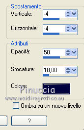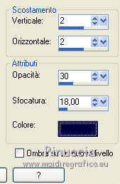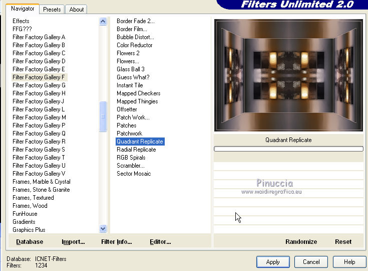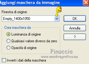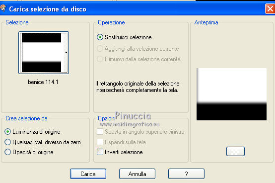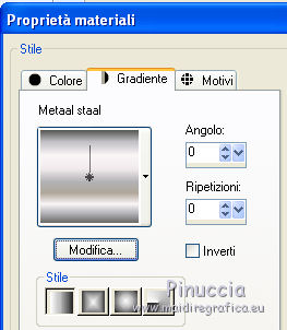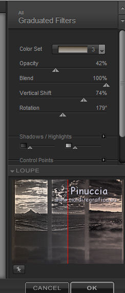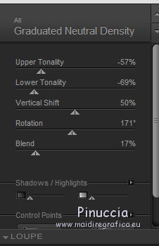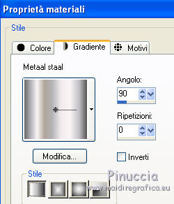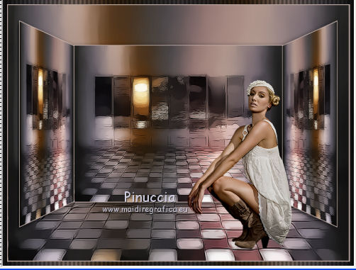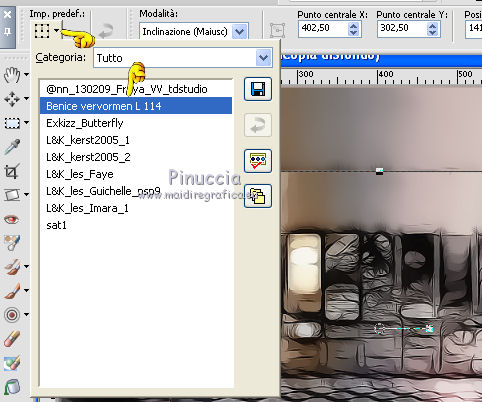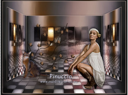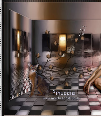 qui puoi trovare qualche risposta ai tuoi dubbi. Se l'argomento che ti interessa non è presente, ti prego di segnalarmelo. Occorrente: Materiale qui I tubes sono di Yoka e Betsie Filtri: consulta, se necessario, la mia sezione filtri qui Filters Unlimited 2.0 qui Filter Factory Gallery F qui Flaming Pear - Glare qui Nik Software - Color Efex Pro qui Redfield Fractalius qui Topaz Clean2 qui Transparency - Eliminate Black qui I filtri Factory Gallery per essere usati devono prima essere convertiti. Come fare vedi qui Si usano importandoli in Filters Unlimited (come fare vedi qui) ma possono funzionare anche da soli. Le factory fornite sono state già convertite. ![]() Metti il gradiente Metaal staal nella cartella Gradienti. Metti il preset "Preset_RasterDeform_Benice" nella cartella Impostazioni predefinite. Metti la selezione nella cartella Selezioni. Apri l'immagine Empty_1400x1050 in PSP e minimizzala: ti servirà come maschera. Passa il colore di primo piano a Gradiente, e seleziona il gradiente Metaal staal con i seguenti settaggi. ![]() 1. Apri una nuova immagine trasparente 800 x 600 pixels, e riempila con il gradiente.Regola>Sfocatura>Sfocatura gaussiana - raggio 15. ![]() 2. Cambia i settaggi del gradiente. ![]() Livelli>Nuovo livello raster. Riempi il livello con il gradiente.Regola>Sfocatura>Sfocatura gaussiana - raggio 15. ![]() Livelli>Nuovo livello maschera>Da immagine. Apri il menu sotto la finestra di origine e vedrai la lista dei files aperti. Seleziona l'immagine Empty_1400x1050, con i seguenti settaggi. ![]() Livelli>Unisci>Unisci gruppo. Effetti>Effetti 3D>Sfalsa ombra. ![]() Regola>Messa a fuoco>Metti a fuoco. 3. Livelli>Nuovo livello raster. Selezione>Carica/Salva selezione>Carica selezione da disco. Cerca e carica la selezione Benice 114.1. ![]() Apri l'immagine The spectrum of the day e vai a Modifica>Copia. Torna al tuo lavoro e vai a Modifica>Incolla nella selezione. Mantieni selezionato. Effetti>Plugins>Transparency - Eliminate Black. Selezione>Deseleziona. Regola>Messa a fuoco>Accentua messa a fuoco. Cambia la modalità di miscelatura di questo livello in Luminanza (esistente). Livelli>Unisci>Unisci visibile. 4. Effetti>Plugins>Nik Software - Color Efex Pro - Graduated Neutral Density. ![]() Effetti>Plugins>Nik Software - Color Efex Pro - Graduated Filters. Seleziona il color set Coffee 3 ![]() con i seguenti settaggi ![]() Effetti>Plugins>Flaming Pear - Glare. ![]() 5. Effetti>Plugins>Redfield - Fractalius. ![]() Effetti>Plugins>Topaz Labs - Topaz Clean 2 a sinistra seleziona FlatStyle, con i settaggi standard. ![]() ![]() Finestra>Duplica (o, sulla tastiera, maiuscola+D) per fare una copia. Minimizza il duplicato che userai più tardi. 6. Torna al tuo lavoro originale. Immagine>Aggiungi bordatura, 2 pixels, simmetriche, con il colore #b3a19b. 7. Livelli>Duplica. Immagine>Ridimensiona, al 65%, tutti i livelli non selezionato. Regola>Messa a fuoco>Metti a fuoco. 8. Livelli>Duplica. Premi il tasto D per attivare lo strumento Deformazione ![]() apri il menu delle impostazioni e seleziona il preset Benice vervormen_L114. ![]() Premi il tasto M per deselezionare lo strumento. Livelli>Duplica. Immagine>Rifletti. Livelli>Unisci>Unisci giù - 2 volte. Effetti>Effetti 3D>Sfalsa ombra. ![]() 9. Immagine>Ridimensiona, al 94%, tutti i livelli non selezionato. Effetti>Effetti di immagine>Scostamento. ![]() Livelli>Unisci>Unisci giù. 10. Immagine>Dimensioni tela. ![]() Attiva lo strumento Bacchetta magica ![]() ![]() Clicca nel bordo bianco per selezionato. Attiva il duplicato del punto 5 e vai a Modifica>Copia. Torna al tuo lavoro e vai a Modifica>Incolla nella selezione. Effetti>Plugins>Filters Unlimited 2.0 - Filter Factory Gallery F - Quadrant Replicate. ![]() Effetti>Effetti di trama>Veneziana. ![]() Selezione>Deseleziona. 11. Apri il tube Betsie 493_26-11-2010 e vai a Modifica>Copia. Torna al tuo lavoro e vai a Modifica>Incolla come nuovo livello. Immagine>Ridimensiona, al 90%, tutti i livelli non selezionato. Regola>Luminosità e contrasto>Luminosità e contrasto. ![]() Regola>Messa a fuoco>Metti a fuoco. Sposta il tube a destra, come nell'esempio.![]() Effetti>Effetti 3D>Sfalsa ombra. ![]() Ripeti l'Effetto Sfalsa ombra, cambiando verticale e orizzontale con -4. ![]() 12. Apri il tube Yoka-Animals-Cats-011010 e vai a Modifica>Copia. Torna al tuo lavoro e vai a Modifica>Incolla come nuovo livello. Immagine>Ridimensiona, al 25%, tutti i livelli non selezionato. Regola>Messa a fuoco>Metti a fuoco. Sposta il tube a sinistra, come nell'esempio.![]() Effetti>Effetti 3D>Sfalsa ombra. ![]() Ripeti l'Effetto Sfalsa ombra, cambiando verticale e orizzontale con -4. ![]() 13. Apri il tube @nn_171006_TubemadebyAnn_Leaves_Td e vai a Modifica>Copia. Torna al tuo lavoro e vai a Modifica>Incolla come nuovo livello. Immagine>Ridimensiona, al 65%, tutti i livelli non selezionato. Regola>Tonalità e saturazione>Tonalità/Saturazione/Luminosità. ![]() Regola>Messa a fuoco>Metti a fuoco. Livelli>Disponi>Sposta giù - 2 volte. Posiziona il tube come nell'esempio.![]() Attiva lo strumento Selezione a mano libera , da punto a punto,e seleziona i rami, come mostrato nell'esempio. ![]() Premi sulla tastiera il tasto CANC. Effetti>Effetti 3D>sfalsa ombra. ![]() 14. Attiva nuovamente lo strumento Selezione a mano libera , da punto a punto,e seleziona una foglia, come nell'esempio. ![]() Modifica>Copia. Selezione>Deseleziona. Modifica>Incolla come nuovo livello. Immagine>Rifletti. Livelli>Duplica. Immagine>Capovolgi. Posiziona le due foglie come nell'esempio.![]() 15. Aggiungi il tuo nome e/o il tuo watermark su un nuovo livello. Livelli>Unisci>Unisci tutto e salva in formato jpg. ![]() Se hai problemi o dubbi, o trovi un link non funzionante, o anche soltanto per un saluto, scrivimi 29 Agosto 2012 |