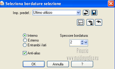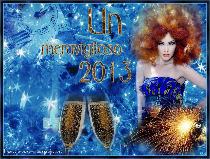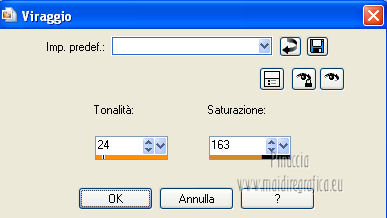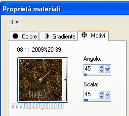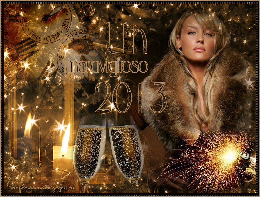 qui puoi trovare qualche risposta ai tuoi dubbi. Se l'argomento che ti interessa non è presente, ti prego di segnalarmelo. Occorrente: Materiale qui ![]() Apri il font e minimizzalo. Lo troverai nella lista dei font disponibili quando ti servirà. 1. Apri l'immagine di sfondo achtergrond 08 -11 -2009% 20 -39. Regola>Tonalità e saturazione>Viraggio. ![]() Modifica>Copia, e minimizza l'immagine perchè ti servirà ancora. 2. Apri una nuova immagine trasparente 800 x 600 pixels. Selezione>Seleziona tutto. Modifica>Incolla nella selezione. Selezione>Deseleziona. 3. Apri il tube MC 2189 e vai a Modifica>Copia. Torna al tuo lavoro e vai a Modifica>Incolla come nuovo livello. Immagine>Ridimensiona, al 70%, tutti i livelli non selezionato. Regola>Tonalità e saturazione>Viraggio, con i settaggi precedenti. ![]() Sposta il tube in alto a sinistra.Cambia la modalità di miscelatura di questo livello in Luce netta, e abbassa l'opacità al 50%. 4. Apri il tube La - misc 21 e vai Modifica>Copia. Torna al tuo lavoro e vai a Modifica>Incolla come nuovo livello. Immagine>Ridimensiona, al 60%, tutti i livelli non selezionato. Sposta il tube in basso al centro.Livelli>Duplica. Livelli>Unisci>Unisci giù. 5. Apri il tube P.G. e vai a Modifica>Copia. Torna al tuo lavoro e vai a Modifica>Incolla come nuovo livello. Livelli>Duplica. Livelli>Unisci>Unisci giù. Spostalo in basso a sinistra.Cambia la modalità di miscelatura di questo livello in Filtra. Nella paletta dei livelli porta questo livello sotto il livello dei bicchieri. ![]() 6. Rimani posizionato su questo livello. Apri il tube LD-woman e vai a Modifica>Copia. Torna al tuo lavoro e vai a Modifica>Incolla come nuovo livello. Immagine>Ridimensiona, al 130%, tutti i livelli non selezionato. Livelli>Duplica - 2 volte. Livelli>Unisci>Unisci giù - 2 volte. 7. Attiva il livello superiore. Apri il tube Champagne 02 e vai a Modifica>Copia. Torna al tuo lavoro e vai a Modifica>Incolla come nuovo livello. Immagine>Rifletti. Spostalo in basso a destra.Livelli>Duplica. Livelli>Unisci>Unisci giù. ![]() 8. Attiva lo strumento Testo ![]() font All Evening Stroll, imposta la dimensione in base alla versione di PSP che stai usando, i miei settaggi. ![]() Scrivi la lettera maiuscola A. Livelli>Converti in livello raster. Diminuisci la dimensione del testo (per il mio esempio 80) e scrivi: wonderful. Livelli>Converti in livello raster. Aumenta nuovamente la dimensione (per il mio esempio 150), e scrivi 2013. Posiziona correttamente le tre righe di testo.Assicurati di essere posizionato sul livello superiore dei tre testi. Livelli>Unisci>Unisci giù - 2 volte. 9. Selezione>Seleziona tutto. Selezione>Mobile. Selezione>Immobilizza. Passa il colore di primo piano a Motivi, cerca e seleziona l'immagine di sfondo che hai minimizzato al punto 1, con i seguenti settaggi. ![]() Riempi la selezione con il motivo.Selezione>Modifica>Espandi - 2 pixels. ![]() Selezione>Modifica>Seleziona bordature selezione. ![]() Imposta il colore di primo piano con #b38c5d. Riempi la selezione con il colore di primo piano.Selezione>Deseleziona. 9. Livelli>Unisci>Unisci tutto. Immagine>Aggiungi bordatura, 2 pixels, simmetriche, con il colore di primo piano. Immagine>Aggiungi bordatura, 10 pixels, simmetriche, con il colore nero. Immagine>Aggiungi bordatura, 2 pixels, simmetriche, con il colore di primo piano. Seleziona il bordo nero con la bacchetta magica ![]() e riempilo con il motivo.Regola>Sfocatura>Sfocatura gaussiana - raggio 5. ![]() Effetti>Effetti di trama>Veneziana - colore nero. ![]() Ripeti l'Effetto Veneziana con gli stessi settaggi, ma deseleziona Orizzontale. ![]() Selezione>Deseleziona. Aggiungi il tuo nome e/o il tuo watermark e salva in formato jpg. ![]() Per questo esempio ho usato un tube di Guismo ![]() ![]() Se hai problemi o dubbi, o trovi un link non funzionante, o anche soltanto per un saluto, scrivimi 2 Novembre 2012 |
