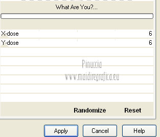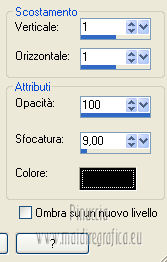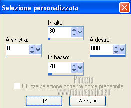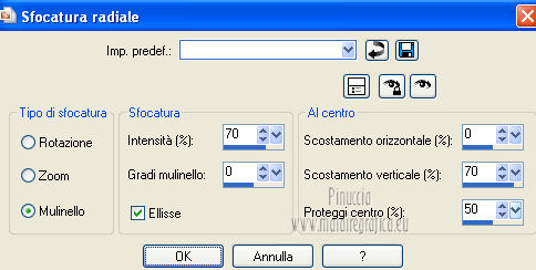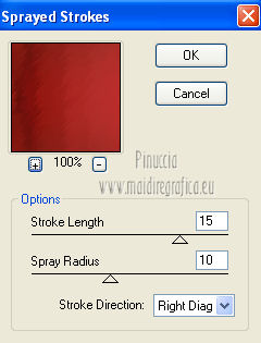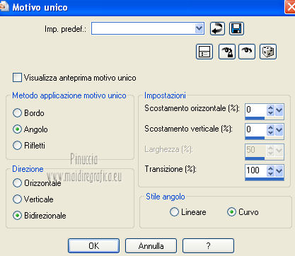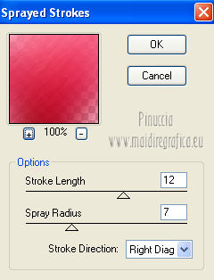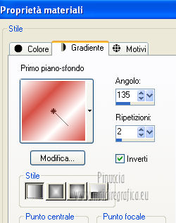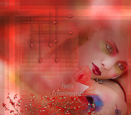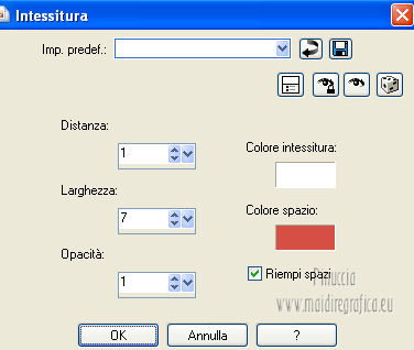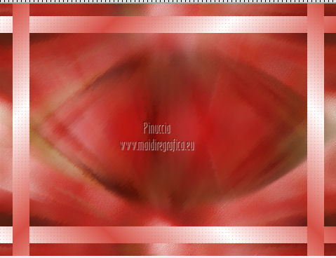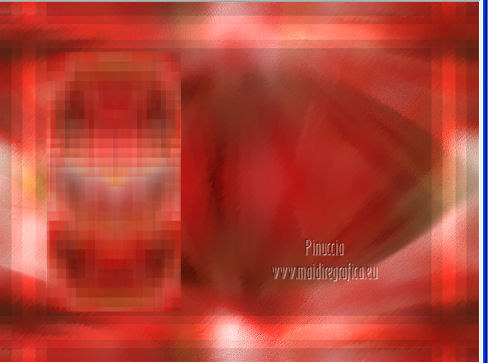 qui puoi trovare qualche risposta ai tuoi dubbi. Se l'argomento che ti interessa non è presente, ti prego di segnalarmelo. Occorrente: Materiale qui Filtri: consulta, se necessario, la mia sezione filtri qui Filters Unlimited 2.0 qui Brush Strokes - Sprayed Strokes qui Toadies - What are you qui FM Tile Tools - Blend Emboss qui I filtri Toadies si possono usare da soli o importati in Filters Unlimited ![]() 1. Imposta il colore di primo piano con #d64f44, e il colore di sfondo con il colore di bianco #ffffff. Passa il colore di primo piano a Gradiente, con i seguenti settaggi. ![]() Apri una nuova immagine trasparente 800 x 600 pixels. Selezione>Seleziona tutto. Apri l'immagine LilyDesigns_SQ_paper2 e vai a Modifica>Copia. Torna al tuo lavoro e vai a Modifica>Incolla nella selezione. Selezione>Deseleziona. 2. Livelli>Nuovo livello raster. Selezione>Seleziona tutto. Apri il tube Simple_Red_by_Ipapun e vai a Modifica>Copia. Torna al tuo lavoro e vai a Modifica>Incolla nella selezione. Selezione>Deseleziona. 3. Effetti>Effetti di immagine>Motivo unico. ![]() Regola>Sfocatura>Sfocatura gaussiana - raggio 20. ![]() Effetti>Plugins>Brush Strokes - Sprayed Strokes. ![]() Cambia la modalità di miscelatura di questo livello in Moltiplica. Livelli>Unisci>Unisci giù. Regola>Tonalità e saturazione>Viraggio. ![]() Effetti>Effetti di bordo>Aumenta. 4. Livelli>Nuovo livello raster. Selezione>Seleziona tutto. Apri il tube JHanna_251 tube e vai a Modifica>Copia. Torna al tuo lavoro e vai a Modifica>Incolla nella selezione. Selezione>Deseleziona. Attiva lo strumento Gomma ![]() e cancella lo stelo del fiore. ![]() Sposta il tube al centro.![]() Effetti>Effetti di immagine>Motivo unico. ![]() Regola>Sfocatura>Sfocatura radiale. ![]() Livelli>Duplica. Immagine>Capovolgi. Abbassa l'opacità di questo livello al 50%. Livelli>Unisci>Unisci giù. Effetti>Plugins>Brush Strokes - Sprayed Strokes. ![]() Livelli>Unisci>Unisci tutto. 5. Livelli>Nuovo livello raster. Attiva lo strumento Selezione ![]() clicca sull'icona Selezione personalizzata ![]() e imposta i seguenti settaggi. ![]() Riempi la selezione con il gradiente.Effetti>Effetti di trama>Intessitura colore intessitura bianco; colore spazio: colore di primo piano. ![]() Selezione>Deseleziona. Livelli>Duplica. Immagine>Capovolgi. Livelli>Duplica. Immagine>Ruota per gradi - 90 gradi a sinistra. ![]() Posiziona correttamente la striscia a sinistra.Livelli>Duplica. Immagine>Rifletti. Livelli>Unisci>Unisci giù - 3 volte. ![]() Effetti>Plugins>Filters Unlimited 2.0 - Toadies - What are you. ![]() Cambia la modalità di miscelatura di questo livello in Indebolisci, e abbassa l'opacità al 30%. 10. Apri il tube Benice L14 e vai a Modifica>Copia. Torna al tuo lavoro e vai a Modifica>Incolla come nuovo livello. Spostalo a sinistra.![]() Effetti>Plugins>FM Tile Tools - Blend Emboss, con i settaggi standard. ![]() Abbassa l'opacità di questo livello al 50%. Livelli>Duplica. Immagine>Rifletti. Livelli>Unisci>Unisci giù. 11. Apri il tube Christin_Face45_2009 e vai a Modifica>Copia. Torna al tuo lavoro e vai a Modifica>Incolla come nuovo livello. Immagine>Ridimensiona, all'80%, tutti i livelli non selezionato. Sposta il tube al centro.Effetti>Plugins>FM Tile Tools - Blend Emboss, con i settaggi standard. Abbassa l'opacità di questo livello al 78%. Livelli>Disponi>Sposta giù. 11. Apri il tube Marif_2007_05Mai_ misted_decor0145 e vai a Modifica>Copia. Torna al tuo lavoro e vai a Modifica>Incolla come nuovo livello. Immagine>Ridimensiona, al 75%, tutti i livelli non selezionato. Immagine>Rifletti. Sposta il tube in alto a destra.Effetti>Plugins>Fm Tile Tools - Blend Emboss, con i settaggi standard. Cambia la modalità di miscelatura di questo livello in Luce netta, e abbassa l'opacità al 66%. 12. Apri il tube Mtm_Bloemen 132-2001 office card - 2 Jan 2006, e vai a Modifica>Copia. Torna al tuo lavoro e vai a Modifica>Incolla come nuovo livello. Immagine>Ridimensiona, al 120%, tutti i livelli non selezionato. Sposta il tube in basso a sinistra.Effetti>Plugins>FM Tile Tools - Blend Emboss, con i settaggi standard. 13. Apri il tube Fleches_grsab e vai a Modifica>Copia. Torna al tuo lavoro e vai a Modifica>Incolla come nuovo livello. Immagine>Ridimensiona, al 120%, tutti i livelli non selezionato. Immagine>Rifletti. Regola>Tonalità e saturazione>Viraggio. ![]() Sposta il tube in alto a sinistra.Effetti>Effetti 3D>Sfalsa ombra. ![]() Livelli>Duplica. Immagine>Ruota per gradi - 90 gradi a destra. ![]() Sposta l'immagine sopra il precedente livello.![]() Livelli>Unisci>Unisci giù. 14. Apri il tube wordartgroot e vai a Modifica>Copia. Torna al tuo lavoro e vai a Modifica>Incolla come nuovo livello. Immagine>Ridimensiona, al 70%, tutti i livelli non selezionato. Sposta il tube in basso a destra.Livelli>Unisci>Unisci tutto. 15. Immagine>Aggiungi bordatura, 30 pixels, simmetriche, con #a8261a. Seleziona questo bordo con la bacchetta magica ![]() Effetti>Effetti 3D>Ritaglio. ![]() Aggiungi il tuo nome e/o il tuo watermark e salva in formato jpg. ![]() Se hai problemi o dubbi, o trovi un link non funzionante, o anche soltanto per un saluto, scrivimi 4 Novembre 2012 |
