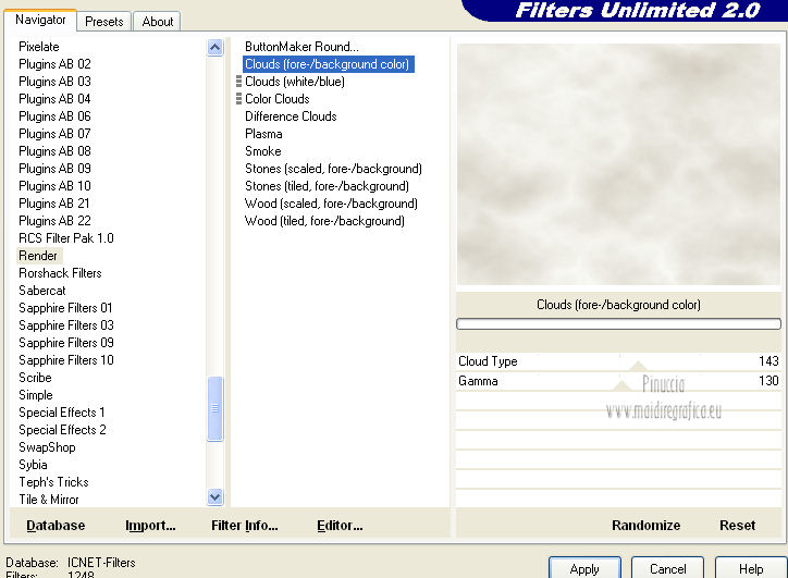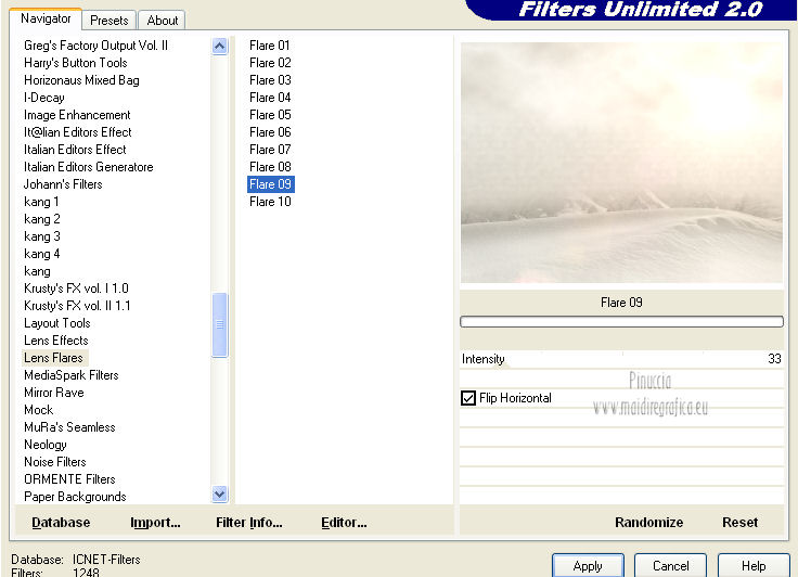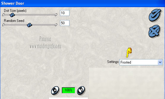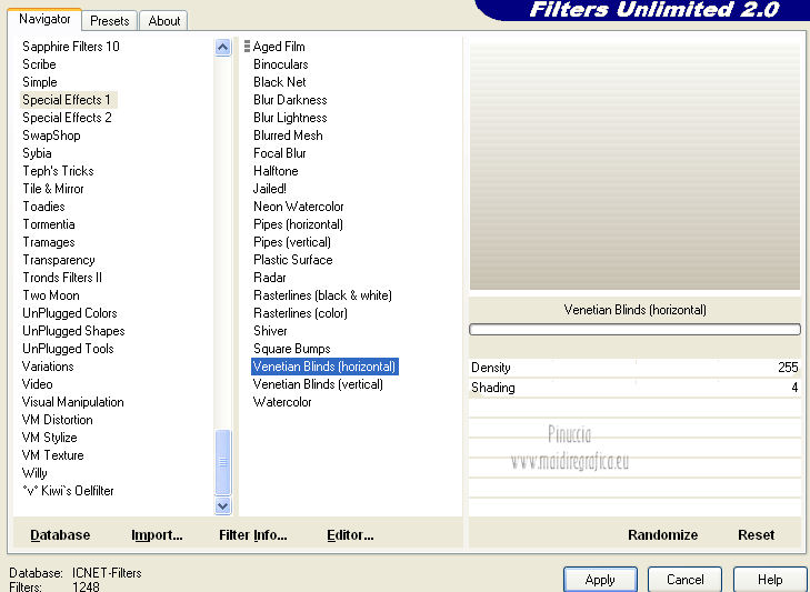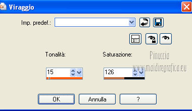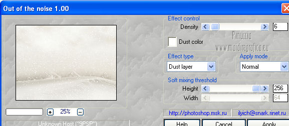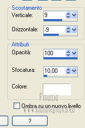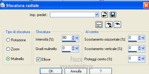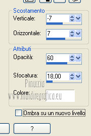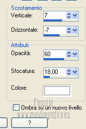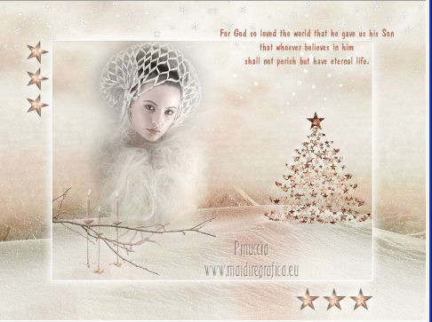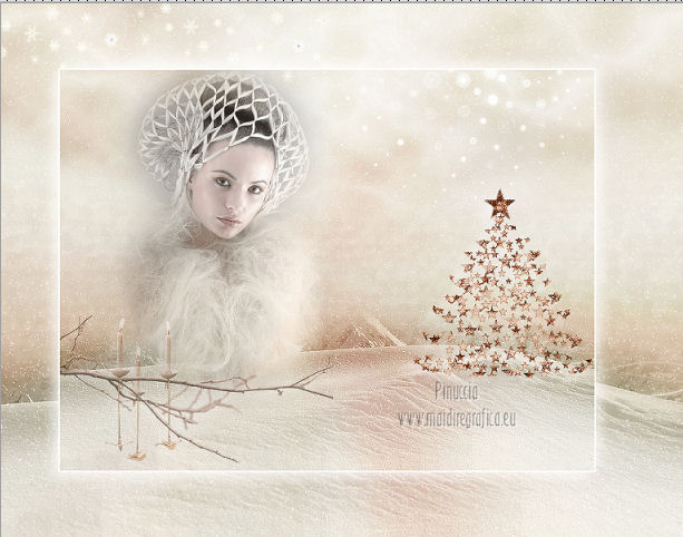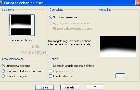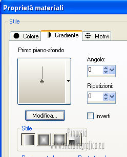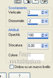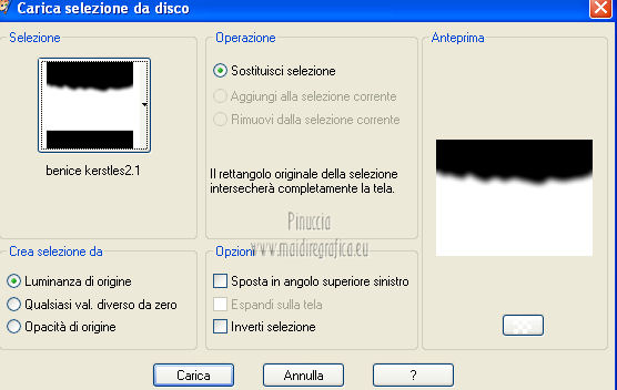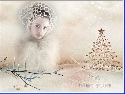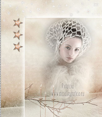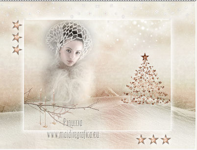 qui puoi trovare qualche risposta ai tuoi dubbi. Se l'argomento che ti interessa non è presente, ti prego di segnalarmelo. Occorrente: Materiale qui Il tube della donna è di Yoka Filtri: consulta, se necessario, la mia sezione filtri qui Filters Unlimited 2.0 qui AmphiSoft qui Xenofex 1.1 qui ![]() Metti le selezioni nella cartella Selezioni. Imposta il colore di primo piano con #ccc5b6, e il colore di sfondo con #fbfcf7. ![]() Passa il colore di primo piano a Gradiente, stile lineare. ![]() 1. Apri una nuova immagine trasparente 800 x 600 pixels, e riempila con il gradiente.Effetti>Plugins>Filters Unlimited 2.0 - Special Effects 1 - Venetian blinds(horizontal). ![]() Effetti>Plugins>Xenofex 1.1 - Shower Door. ![]() 2. Livelli>Nuovo livello raster. Riempi il livello con il gradiente.Effetti>Plugins>Filters Unlimited 2.0 - Render - Clouds/fore-/backgroundcolor). ![]() Selezione>Carica/Salva selezione>Carica selezione da disco. Cerca e carica la selezione Benice kerstles 2.1. ![]() Premi sulla tastiera il tasto CANC. Selezione>Deseleziona. 3. Apri l'immagine Winter_by_W1zzy. Su questa immagine: Selezione>Carica/Salva selezione>Carica selezione da disco. Cerca e carica la selezione Benice kerstles 2.2. ![]() Modifica>Copia. Torna al tuo lavoro e vai a Modifica>Incolla come nuovo livello. Sposta l'immagine contro il bordo inferiore.Immagine>Rifletti. Cambia la modalità di miscelatura di questo livello in Luminanza (esistente). 4. Livelli>Nuovo livello raster. Selezione>Carica/Salva selezione>Carica selezione da disco. Carica nuovamente la selezione Benice kerstles 2.2. ![]() Riempi la selezione con il colore di sfondo.Selezione>Deseleziona. Sposta questo livello contro il bordo inferiore.Immagine>Rifletti. Abbassa l'opacità di questo livello al 68%. Livelli>Unisci>Unisci visibile. 5. Livelli>Duplica. Effetti>Plugins>Filters Unlimited 2.0 - Lens Flares - Flare 09. ![]() Cambia la modalità di miscelatura di questo livello in Luce diffusa. Livelli>Unisci>Unisci giù. Regola>Messa a fuoco>Metti a fuoco. Effetti>Plugins>AmphiSoft - Out of the noise. ![]() 6. Apri l'immagine Bloem e vai a Modifica>Copia. Torna al tuo lavoro e vai a Modifica>Incolla come nuovo livello. Regola>Sfocatura>Sfocatura radiale. ![]() Regola>Sfocatura>Sfocatura gaussiana - raggio 10. ![]() Cambia la modalità di miscelatura di questo livello in Rafforza, e abbassa l'opacità al 69%. Livelli>Unisci>Unisci visibile. Finestra>Duplica (o, sulla tastiera, maiuscola+D) per fare una copia. Minimizza la copia e torna al tuo lavoro originale. 7. Apri il tube Tree-christmas9 e vai a Modifica>Copia. Torna al tuo lavoro e vai a Modifica>Incolla come nuovo livello. Immagine>Ridimensiona, al 60%, tutti i livelli non selezionato. Sposta il tube a destra, sulla neve.Livelli>Duplica. Cambia la modalità di miscelatura di questo livello in Luce diffusa. Effetti>Effetti 3D>Sfalsa ombra. ![]() Modifica>Ripeti Sfalsa ombra. 8. Apri il tube Deco_27 e vai a Modifica>Copia. Torna al tuo lavoro e vai a Modifica>Incolla come nuovo livello. Regola>Tonalità e saturazione>Viraggio. ![]() Immagine>Ruota per gradi - 20 gradi a sinistra. ![]() Sposta il tube nell'angolo in alto a destra.![]() Cambia la modalità di miscelatura di questo livello in Filtra. 9. Apri il tube Yoka-Misted-Faces-20-08-10 e vai a Modifica>Copia. Torna al tuo lavoro e vai a Modifica>Incolla come nuovo livello. Immagine>Ridimensiona, al 65%, tutti i livelli non selezionato. Sposta il tube in alto a sinistra.Cambia la modalità di miscelatura di questo livello in Luminanza (esistente). Livelli>Duplica, e riporta la modalità di miscelatura di questo livello a Normale, e abbassa l'opacità al 50%. 10. Apri il tube Mou_3candles e vai a Modifica>Copia. Torna al tuo lavoro e vai a Modifica>Incolla come nuovo livello. Immagine>Ridimensiona, al 55%, tutti i livelli non selezionato. Sposta il tube nell'angolo in basso a sinistra.![]() Livelli>Duplica, e attiva il livello sottostante dell'originale. Regola>Tonalità e saturazione>Viraggio. ![]() Abbassa l'opacità di questo livello al 50%. Attiva il livello superiore della copia. Abbassa l'opacità di questo livello al 37%. Livelli>Unisci>Unisci giù. Regola>Messa a fuoco>Metti a fuoco. Effetti>Effetti 3D>Sfalsa ombra - colore bianco. ![]() 11. Livelli>Unisci>Unisci tutto. Immagine>Aggiungi bordatura, 2 pixels, simmetriche, con il colore bianco #ffffff. Immagine>Ridimensiona, al 75%, tutti i livelli selezionato. Regola>Messa a fuoco>Metti a fuoco. Modifica>Copia. 12. Attiva il duplicato del punto 6. ![]() Adesso il duplicato sarà la nuova base del tuo lavoro. Modifica>Incolla come nuovo livello. Effetti>Effetti 3D>sfalsa ombra, con i settaggi precedenti. ![]() Ripeti l'Effetto Sfalsa ombra, invertendo i valori verticale e orizzontale. ![]() 13. Apri il tube DBA SNOWFLAKE LINE 2 e vai a Modifica>Copia. Torna al tuo lavoro e vai a Modifica>Incolla come nuovo livello. Immagine>Ridimensiona, al 50%, tutti i livelli non selezionato. Immagine>Ruota per gradi - 90 gradi a sinistra. ![]() Sposta il tube in alto a sinistra,un po' fuori dal bordo superiore. ![]() Livelli>Duplica. Immagine>Rifletti. Livelli>Unisci>Unisci giù. Regola>Tonalità e saturazione>Viraggio. ![]() Regola>Messa a fuoco>Metti a fuoco. 14. Apri il tube Star_Topaz e vai a Modifica>Copia. Torna al tuo lavoro e vai a Modifica>Incolla come nuovo livello. Immagine>Ridimensiona, una volta al 10% e una volta al 55%, tutti i livelli non selezionato. Sposta il tube a sinistra (vedi il mio esempio).Livelli>Duplica - 2 volte, e posiziona le due stelle sotto l'originale.Per allineare perfettamente le stelle, dopo aver attivato lo strumento Spostamento, usa le frecce della tastiera. sull'uso delle frecce abbinato allo strumento Spostamento vedi qui ![]() Assicurati di essere posizionato sul livello superiore. Livelli>Unisci>Unisci giù - 2 volte. Effetti>Effetti 3D>Sfalsa ombra. ![]() Ripeti l'Effetto Sfalsa ombra. ![]() Livelli>Duplica. Immagine>Ruota per gradi - 90 gradi a sinistra