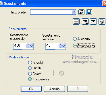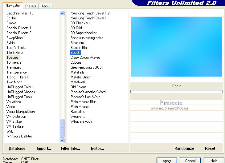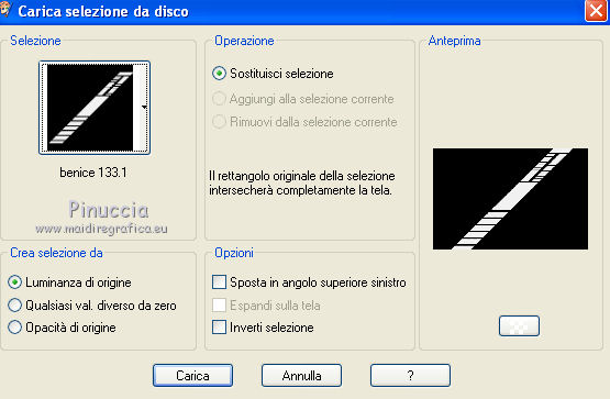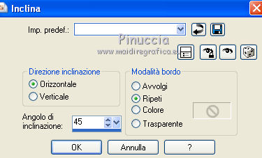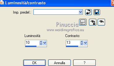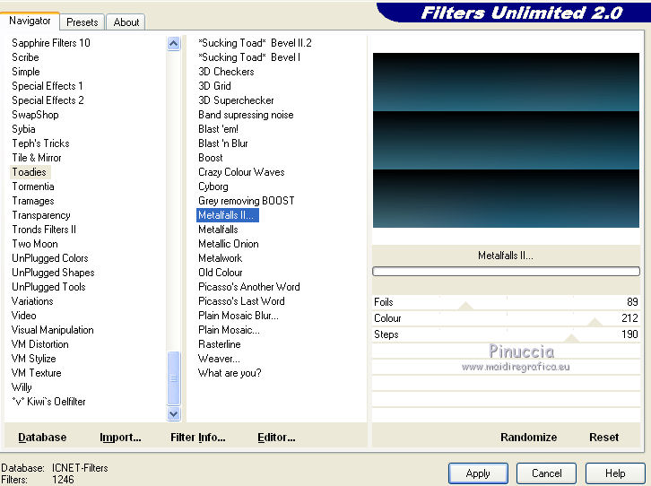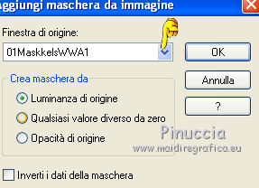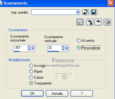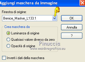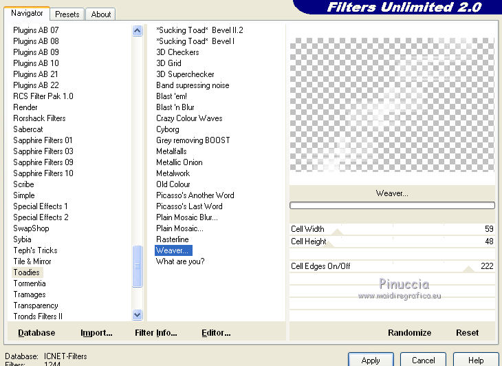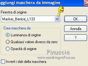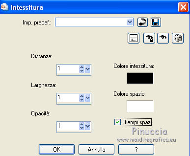 qui puoi trovare qualche risposta ai tuoi dubbi. Se l'argomento che ti interessa non è presente, ti prego di segnalarmelo. Occorrente: Materiale qui Il tube della donna è di DBK. Filtri: consulta, se necessario, la mia sezione filtri qui Filters Unlimited 2.0 qui SapphirePlugins 03 qui Toadies qui I filtri Sapphire e Toadies si possono usare da soli o importati in Unlimited ![]() Metti le selezioni nella cartella Selezioni. Apri le maschere in PSP e minimizzale con il resto del materiale. Imposta il colore di primo piano con #0966fc, e il colore di sfondo con #32b9f1. ![]() 1. Apri una nuova immagine trasparente 900 x 600 pixels. Selezione>Seleziona tutto. Apri l'immagine BGL133 e vai a Modifica>Copia. Torna al tuo lavoro e vai a Modifica>Incolla nella selezione. Selezione>Deseleziona. 2. Livelli>Nuovo livello raster. Riempi il livello con il colore di primo piano.Livelli>Nuovo livello maschera>Da immagine. Apri il menu sotto la finestra di origine e vedrai la lista dei files aperti. Seleziona la maschera Masker BeniceL133, con i seguenti settaggi: ![]() Livelli>Unisci>Unisci gruppo. Livelli>Duplica. Immagine>Rifletti. Livelli>Unisci>Unisci giù. Cambia la modalità di miscelatura di questo livello in Rafforza. Livelli>Unisci>Unisci giù. 3. Livelli>Nuovo livello raster. Riempi il livello con il colore di primo piano.Livelli>Nuovo livello maschera>Da immagine. Apri il menu sotto la finestra di origine e vedrai la lista dei files aperti. Seleziona la maschera 01MaskkelsWWA1, con i seguenti settaggi: ![]() Livelli>Unisci>Unisci gruppo. Effetti>Effetti di bordo>Aumenta. Effetti>Effetti di trama>Intessitura. ![]() Cambia la modalità di miscelatura di questo livello in Indebolisci, e abbassa l'opacità al 40%. 4. Livelli>Nuovo livello raster. Riempi il livello con il colore di sfondo.Livelli>Nuovo livello maschera>Da immagine. Apri il menu sotto la finestra di origine e seleziona la maschera Benice_Masker_L133.1, con i seguenti settaggi: ![]() Livelli>Unisci>Unisci gruppo. Effetti>Effetti di immagine>Motivo unico. ![]() Effetti>Effetti geometrici>Inclina. ![]() Effetti>Effetti di bordo>Aumenta. Abbassa l'opacità di questo livello al 78%. Livelli>Unisci>Unisci visibile. Selezione>Seleziona tutto. Selezione>Modifica>Contrai - 10 pixels. Immagine>Ritaglia la selezione. 5. Livelli>Nuovo livello raster. Selezione>Seleziona tutto. Apri l'immagine WP_102466 e vai a Modifica>Copia. Torna al tuo lavoro e vai a Modifica>Incolla nella selezione. Selezione>Deseleziona. Immagine>Ridimensiona, 110x100%, tutti i livelli e mantieni proporzioni non selezionato. ![]() Effetti>Effetti di immagine>Scostamento. ![]() Cambia la modalità di miscelatura di questo livello in Filtra, e abbassa l'opacità al 76%. 6. Imposta il colore di primo piano con il colore bianco. ![]() Livelli>Nuovo livello raster. Selezione>Carica/Salva selezione>Carica selezione da disco Cerca e carica la selezione Benice 133.1. ![]() Riempi la selezione con il colore di primo piano.Selezione>Deseleziona. Effetti>Plugins>Filters Unlimited 2.0 - Toadies - Weaver. ![]() Immagine>Immagine negativa. se stai usando PSP 9: Regola>Bilanciamento colore>Immagine negativa 7. Selezione>Seleziona tutto. Selezione>Mobile. Selezione>Modifica>Espandi - 2 pixels. Livelli>Nuovo livello raster. Riempi la selezione con il colore di primo piano.Selezione>Deseleziona. Livelli>Unisci>Unisci giù. Regola>Messa a fuoco>Accentua messa a fuoco. Abbassa l'opacità di questo livello al 65%. 8. Livelli>Unisci>Unisci visibile. Finestra>Duplica (o, sulla tastiera, maiuscola+D) per fare una copia. Minimizza il duplicato che userai più tardi. 9. Torna al tuo lavoro originale. Livelli>Nuovo livello raster. 11. Selezione>Carica/Salva selezione>Carica selezione da disco Cerca e carica la selezione Benice 133.2. ![]() Riempi la selezione con il colore di primo piano.Selezione>Deseleziona. Effetti>Effetti 3D>Sfalsa ombra. ![]() 10. Livelli>Nuovo livello raster. Selezione>Carica/Salva selezione>Carica selezione da disco Carica nuovamente la selezione Benice 133.3. ![]() Riempi la selezione con il colore di primo piano.Selezione>Deseleziona. Effetti>Effetti 3D>Sfalsa ombra. ![]() 11. Livelli>Nuovo livello raster. Selezione>Carica/Salva selezione>Carica selezione da disco Carica nuovamente la selezione Benice 133.4. ![]() Riempi la selezione con il colore di primo piano.Selezione>Deseleziona. Effetti>Effetti 3D>Sfalsa ombra. ![]() 12. Apri il tube Benice_hartjes e vai a Modifica>Copia. Torna al tuo lavoro e vai a Modifica>Incolla come nuovo livello. Effetti>Effetti di immagine>Scostamento. ![]() Effetti>Effetti 3D>Sfalsa ombra. ![]() 14. Apri il tube DBK AA Mod-Cel-2760 e vai a Modifica>Copia. Torna al tuo lavoro e vai a Modifica>Incolla come nuovo livello. Immagine>Ridimensiona, al 50%, tutti i livelli non selezionato, non dimenticare di riselezionare Mantieni proporzioni. Regola>Luminosità e contrasto>Luminosità e contrasto. ![]() Regola>Messa a fuoco>Metti a fuoco. Effetti>Effetti di immagine>Scostamento. ![]() Effetti>Effetti 3D>Sfalsa ombra. ![]() 14. Apri il tube Mist_Abstract127_dragonblu0508 e vai a Modifica>Copia. Torna al tuo lavoro e vai a Modifica>Incolla come nuovo livello. Immagine>Ridimensiona, al 50%, tutti i livelli non selezionato. Regola>Messa a fuoco>Metti a fuoco. Effetti>Effetti di immagine>Scostamento. ![]() 15. Livelli>Unisci>Unisci tutto. Immagine>Aggiungi bordatura, 1 pixel, simmetriche, con il colore #ffffff. Immagine>Ridimensiona, all'85%, tutti i livelli selezionato. Regola>Messa a fuoco>Metti a fuoco. Lascia il lavoro in attesa. 16. Attiva il duplicato che hai minimizzato al punto 8. ![]() Regola>Sfocatura>Sfocatura gaussiana - raggio 100. ![]() Effetti>Plugins>Filters Unlimited 2.0 - Toadies - Boost. ![]() 17. Livelli>Duplica. Regola>Sfocatura>Sfocatura gaussiana - raggio 100. Effetti>Plugins>Filters Unlimited 2.0 - Toadies - Metalfalls II. ![]() Effetti>Effetti di bordo>Aumenta di più. Cambia la modalità di miscelatura di questo livello in So