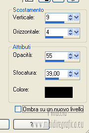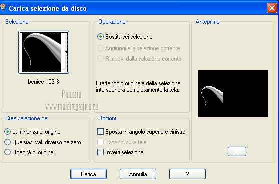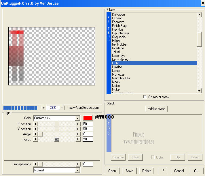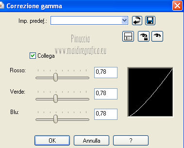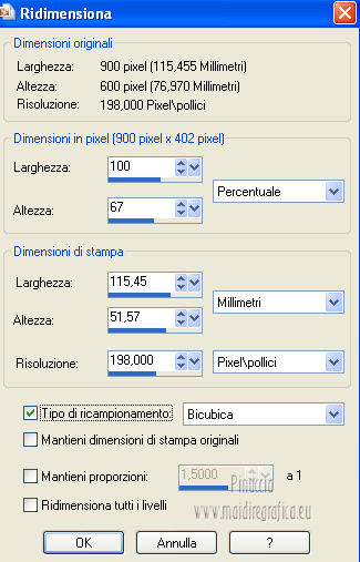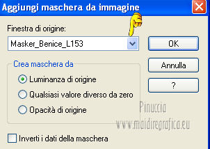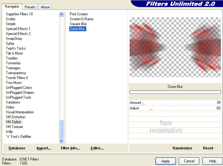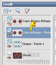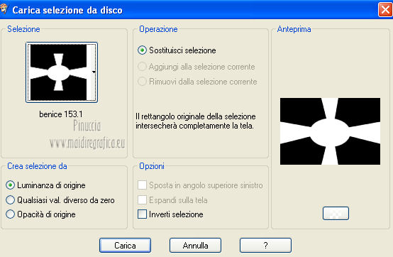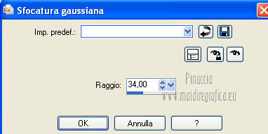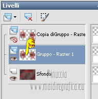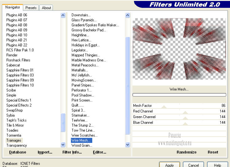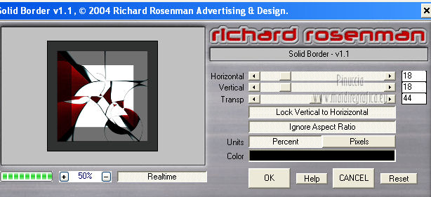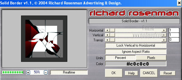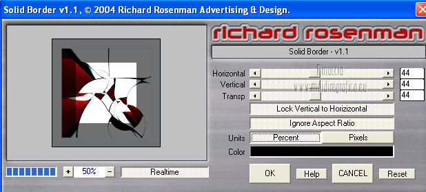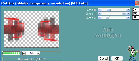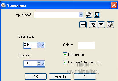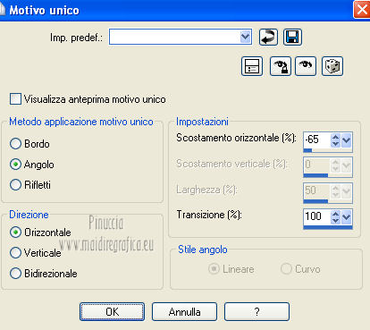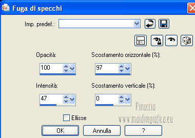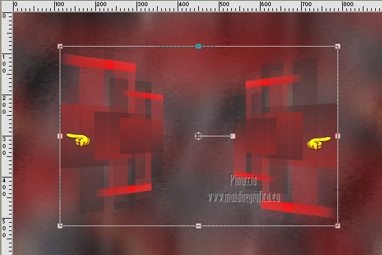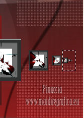 qui puoi trovare qualche risposta ai tuoi dubbi. Se l'argomento che ti interessa non è presente, ti prego di segnalarmelo. Occorrente: Materiale qui Il tube usato per questo tutorial è di Jenny Filtri: consulta, se necessario, la mia sezione filtri qui Filters Unlimited 2.0 qui Tramages - Wire Mesh qui VM Stylize - Zoom blur qui Richard Rosenman - Solid Border qui Carolaine and Sensibility qui VanDerLee - Unplugged-X qui ![]() Metti le selezioni nella cartella Selezioni. Apri la maschera in PSP e minimizzala con il resto del materiale. Imposta il colore di primo piano con #808080, e il colore di sfondo con #000000. ![]() 1. Apri l'immagine BG_Benice_L153. Finestra>Duplica (o, sulla tastiera, maiuscola+D) per fare una copia. Chiudi l'originale. La copia sarà la base del tuo lavoro. 2. Livelli>Nuovo livello raster. Selezione>Seleziona tutto. Apri il tube Jen_vrouw 511_30-09-2011 e vai a Modifica>Copia. non chiudere il tube, perchè ti servirà ancora Torna al tuo lavoro e vai a Modifica>Incolla nella selezione. Selezione>Deseleziona. 3. Effetti>Effetti di immagine>Motivo unico, con i settaggi standard. ![]() Regola>Sfocatura>Sfocatura radiale. ![]() Regola>Sfocatura>Sfocatura gaussiana - raggio 34. ![]() Effetti>Effetti di immagine>Motivo unico. ![]() Cambia la modalità di miscelatura di questo livello in Luce netta, e abbassa l'opacità al 70%. Livelli>Unisci>Unisci giù. Dovresti avere questo. ![]() 4. Livelli>Nuovo livello raster. Riempi il livello con il colore di primo piano.Livelli>Nuovo livello maschera>Da immagine. Apri il menu sotto la finestra di origine e vedrai la lista dei files aperti. Seleziona la maschera Benice_Masker_L153, con i seguenti settaggi: ![]() Livelli>Unisci>Unisci gruppo. Effetti>Plugins>VanDerLee - Unplugged-X - Light - colore #ff0000. ![]() Effetti>Effetti geometrici>Prospettiva orizzontale. ![]() Livelli>Duplica. Immagine>Rifletti. Immagine>Capovolgi. Livelli>Unisci>Unisci giù. 5. Livelli>Duplica. Immagine>Ridimensiona, al 75%, tutti i livelli non selezionato. Immagine>Capovolgi. 6. Livelli>Duplica. Immagine>Ridimensiona, al 75%, tutti i livelli non selezionato. Immagine>Capovolgi. 7. Livelli>Unisci>Unisci giù - 2 volte. Immagine>Ridimensiona, al 75%, tutti i livelli non selezionato. Premi il tasto K per attivare lo strumento Puntatore ![]() se stai usando PSP 9 il tasto D (valido per tutte le versioni) per attivare lo strumento Deformazione ![]() in modalità Scala, usa i nodi laterali a destra e a sinistra ![]() per allargare l'immagine fino ai bordi. ![]() Premi sulla tastiera il tasto M per deselezionare lo strumento. 8. Livelli>Duplica. Chiudi il livello superiore, e attiva il livello sottostante Gruppo Raster 1. ![]() Effetti>Plugins>Filters Unlimited 2.0 - VM Stylize - Zoom blur. ![]() 9. Livelli>Duplica. Immagine>Ruota per gradi - 90 gradi a destra. ![]() Immagine>Ridimensiona, 100x67%, tutti i livelli e mantieni proporzioni non selezionato. ![]() Effetti>Effetti di immagine>Scostamento. ![]() Livelli>Unisci>Unisci giù. 10. Selezione>Carica/Salva selezione>Carica selezione da disco. Cerca e carica la selezione Benice 153.1. ![]() Premi sulla tastiera il tasto CANC. Selezione>Deseleziona. Effetti>Plugins>Filters Unlimited 2.0 - Tramages - Wire Mesh. ![]() Regola>Tonalità e saturazione>Tonalità/Saturazione/Luminosità. ![]() Regola>Messa a fuoco>Accentua messa a fuoco. Cambia la modalità di miscelatura di questo livello in Indebolisci, e abbassa l'opacità al 60%. 11. Apri e attiva il livello superiore. Selezione>Seleziona tutto. Selezione>Mobile. Selezione>Immobilizza. Attiva il livello Gruppo-Raster 1. ![]() Premi tre volte sulla tastiera il tasto CANC. Selezione>Deseleziona. 12. Attiva ancora il livello superiore. Livelli>Duplica. Chiudi questo livello e attiva il livello sottostante copia Gruppo-Raster 1. ![]() Effetti>Effetti di distorsione>Coordinate polari. ![]() Livelli>Duplica. Immagine>Rifletti. Livelli>Unisci>Unisci giù. Effetti>Effetti di trama>Veneziana. ![]() 13. Apri e attiva il livello superiore. Effetti>Plugins>Carolaine and Sensibility - CS_LDots. ![]() 14. Livelli>Unisci>Unisci visibile. Attiva Correzione gamma usando la combinazione di tasti maiuscola+G ![]() Dovresti avere questo. ![]() la schermata ridimensionata è un po' distorta a causa del filtro CS-LDots. 15. Livelli>Nuovo livello raster. Selezione>Carica/Salva selezione>Carica selezione da disco. Cerca e carica la selezione Benice 153.2. ![]() Riempi la selezione con il colore di sfondo (clicca 3 volte).Selezione>Deseleziona. 16. Livelli>Nuovo livello raster. Selezione>Carica/Salva selezione>Carica selezione da disco. Cerca e carica la selezione Benice 153.3. ![]() Riempi la selezione con il colore di sfondo.Selezione>Deseleziona. 17. Apri il tube Benice_L153_vloerdeel e vai a Modifica>Copia. Torna al tuo lavoro e vai a Modifica>Incolla come nuovo livello. Effetti>Effetti di immagine>Scostamento. ![]() 18. Apri l'immagine Plaatje L153. Su questa immagine: Effetti>Plugins>Richard Rosenman - Solid Border. ![]() Effetti>Plugins>Richard Rosenman - Solid Border. ![]() Effetti>Plugins>Richard Rosenman - Solid Border - colore #c0c0c0. ![]() 19. Modifica>Copia. Torna al tuo lavoro e vai a Modifica>Incolla come nuovo livello. Lascia l'immagine come sta. E' già correttamente posizionata. Immagine>Ridimensiona, all'80%, tutti i livelli non selezionato, mantieni proporzioni selezionato. Regola>Messa a fuoco>Maschera di contrasto. ![]() 20. Effetti>Effetti di riflesso>Fuga di specchi. ![]() Attiva lo strumento Selezione , rettangolo,e seleziona l'ultimo pezzetto risultato dall'Effetto fuga di specchi. ![]() Premi sulla tastiera il tasto CANC. Selezione>Deseleziona. Effetti>Effetti 3D>Sfalsa ombra. ![]() 21. Apri il tube Benice_L153_deco e vai a Modifica>Copia. Torna al tuo lavoro e vai a Modifica>Incolla come nuovo livello. Effetti>Effetti di immagine>Scostamento. ![]() 22. Attiva nuovamente il tube Jen_vrouw 511_30-09-2011 e vai a Modifica>Copia. Torna al tuo lavoro e vai a 