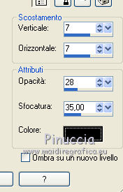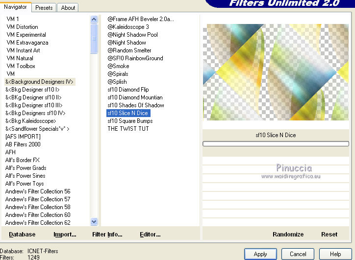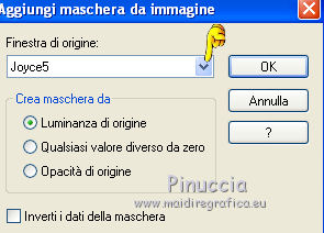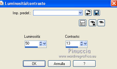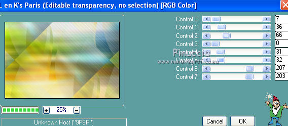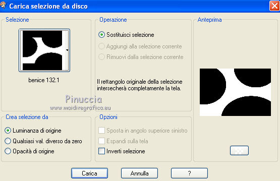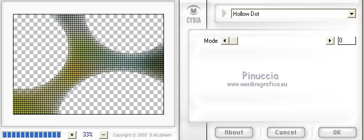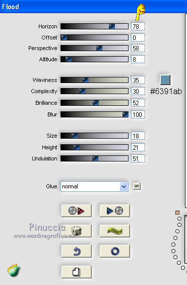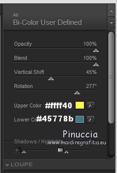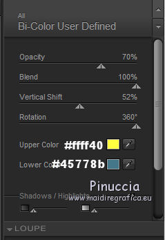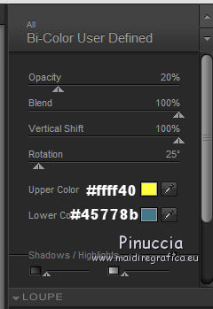 qui puoi trovare qualche risposta ai tuoi dubbi. Se l'argomento che ti interessa non è presente, ti prego di segnalarmelo. Occorrente: Materiale qui I tube usati sono di Betsie, Yoka e Guismo Filtri: consulta, se necessario, la mia sezione filtri qui Filters Unlimited 2.0 qui Filter Factory Gallery A qui &<Background Designers IV> (da importare in Unlimited qui Flaming Pear qui L&K - L&K Paris qui Nik Software - Color Efex Pro qui Screenworks qui I filtri Factory Gallery per essere usati devono prima essere convertiti. Come fare vedi qui Si usano importandoli in Filters Unlimited (come fare vedi qui) ma possono funzionare anche da soli. Le Factory fornite sono state già convertite. ![]() Metti il preset per Flood in una cartella a scelta. Lo importerai da questa cartella, quando ti servirà. Metti le selezioni nella cartella Selezioni. Apri le maschere in PSP e minimizzale con il resto del materiale. Imposta il colore di primo piano con #545c5f, e il colore di sfondo con #ffee41. ![]() 1. Apri una nuova immagine trasparente 900 x 600 pixels. Selezione>Seleziona tutto. Apri l'immagine di sfondo Benice_BG_L132 e vai a Modifica>Copia. Torna al tuo lavoro e vai a Modifica>Incolla nella selezione. Selezione>Deseleziona. Regola>Sfocatura>Sfocatura da movimento. ![]() 2. Livelli>Duplica. Livelli>Nuovo livello maschera>Da immagine. Apri il menu sotto la finestra di origine e vedrai la lista dei files aperti. Seleziona la maschera Masker_Benice_L132, con i seguenti settaggi. ![]() Livelli>Unisci>Unisci gruppo. Ti sembrerà che non sia successo niente, ma non preoccuparti. Puoi vedere il risultato della maschera nella paletta dei livelli. ![]() Effetti>Plugins>Filters Unlimited - &<Background Designers IV> - sf10 Slice N Dice. ![]() Abbassa l'opacità di questo livello al 50%. Livelli>Unisci>Unisci giù. Effetti>Plugins>L&K - L&K Paris. ![]() 3. Selezione>Carica/Salva selezione>Carica selezione da disco. Cerca e carica la selezione Benice 132.1. ![]() Selezione>Innalza selezione a livello. Regola>Sfocatura>Sfocatura gaussiana - raggio 45. ![]() Mantieni selezionato. 4. Livelli>Duplica. Effetti>Plugins>Filters Unlimited 2.0 - Filter Factory Gallery A - Spotlight. ![]() Mantieni ancora selezionato. 5. Livelli>Duplica. Effetti>Plugins>Cybia - Screenworks apri il menu degli effetti, seleziona Hollow Dot e ok. ![]() Selezione>Deseleziona. Cambia la modalità di miscelatura di questo livello in Sovrapponi, e abbassa l'opacità al 33%. Livelli>Unisci>Unisci visibile. 6. Livelli>Nuovo livello raster. Riempi il livello con il colore di primo piano.Livelli>Nuovo livello maschera>Da immagine. Apri il menu sotto la finestra di origine e seleziona la maschera Joyce5. ![]() Livelli>Unisci>Unisci gruppo. Effetti>Effetti di bordo>Aumenta di più. Cambia la modalità di miscelatura di questo livello in Indebolisci, e abbassa l'opacità al 50%. 7. Livelli>Nuovo livello raster. Selezione>Carica/Salva selezione>Carica selezione da disco. Cerca e carica la selezione Benice 132.2. ![]() Riempi la selezione con il colore di sfondo.(clicca tre volte per riempire). Selezione>Deseleziona. Abbassa l'opacità di questo livello al 50%. 8. Livelli>Nuovo livello raster. Riempi il livello con il colore di primo piano.Livelli>Nuovo livello maschera>Da immagine. Apri il menu sotto la finestra di origine e seleziona la maschera Masker_Benice_L132.1. ![]() Livelli>Unisci>Unisci gruppo. Effetti>Effetti di bordo>Aumenta di più. Cambia la modalità di miscelatura di questo livello in Luminanza (Esistente), e abbassa l'opacità al 30%. 9. Livelli>Unisci>Unisci tutto. Effetti>Plugins>Flaming Pear - Flood Clicca sull'icona con la freccia rossa (in alcune versioni del filtro è la prima a destra), e cerca il preset nella cartella in cui lo hai salvato. ![]() Clicca "Apri" e avrai questi settaggi. Se hai problemi con l'importazione del preset, puoi impostare manualmente i settaggi che vedi nella schermata. ![]() 10. Finestra>Duplica (o, sulla tastiera, maiuscola+D), per fare una copia. Minimizza il duplicato. 11. Torna al tuo lavoro originale. Livelli>Nuovo livello raster. Selezione>Carica/Salva selezione>Carica selezione da disco. Cerca e carica la selezione Benice 132.3. ![]() Riempi la selezione con il colore di sfondo.Selezione>Deseleziona. Cambia la modalità di miscelatura di questo livello in Moltiplica. 12. Livelli>Nuovo livello raster. Selezione>Carica/Salva selezione>Carica selezione da disco. Cerca e carica la selezione Benice 132.4. ![]() Riempi la selezione con il colore di sfondo.Selezione>Deseleziona. Cambia la modalità di miscelatura di questo livello in Indebolisci, e abbassa l'opacità al 18%. 13. Apri il tube Calguispoissons. Attiva il livello "poisson 1" e vai a Modifica>Copia. Torna al tuo lavoro e vai a Modifica>Incolla come nuovo livello. Immagine>Ridimensiona, al 25%, tutti i livelli non selezionato. Immagine>Rifletti. Regola>Messa a fuoco>Metti a fuoco. Sposta il tube in basso a destra.14. Attiva nuovamente il tube Calguispoissons. Attiva il livello "poisson 5" e vai a Modifica>Copia. Torna al tuo lavoro e vai a Modifica>Incolla come nuovo livello. Immagine>Ridimensiona, al 25%, tutti i livelli non selezionato. Regola>Messa a fuoco>Metti a fuoco. Sposta anche questo pesce in basso a destra.![]() 15. Livelli>Unisci>Unisci giù e avrai i due pesci in un unico livello. Regola>Luminosità e contrasto>Luminosità e contrasto. ![]() Effetti>Plugins> Nik Software - Color Efex Pro 3.0 Bi-Color User Defined, con i seguenti settaggi. ![]() Abbassa l'opacità di questo livello al 65%. 16. Apri il tube Betsie 654_08-02-2011 e vai a Modifica>Copia. Torna al tuo lavoro e vai a Modifica>Incolla come nuovo livello. Regola>Tonalità e saturazione>Viraggio. ![]() Effetti>Plugins>Nik Software - Color Efex Pro 3.0 Bi-Color User Defined. ![]() Effetti>Effetti di immagine>Scostamento. ![]() Effetti>Effetti 3D>Sfalsa ombra. ![]() Effetti>Plugins> Flaming Pear - Flood, cambia soltanto Horizon con 78 e ok. ![]() 17. Apri il Benice_L132_