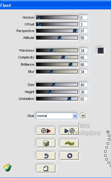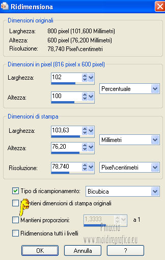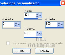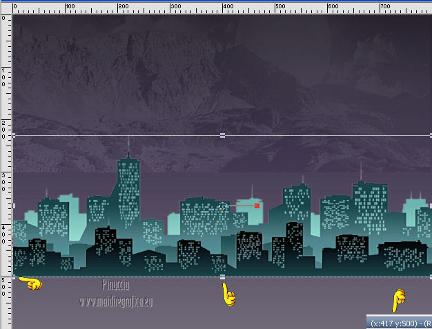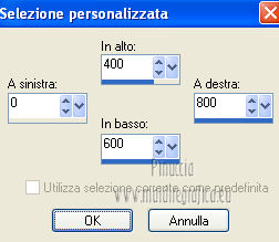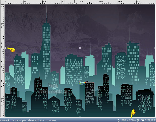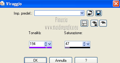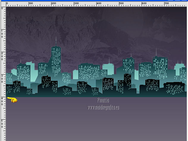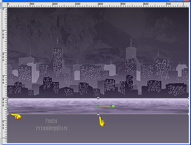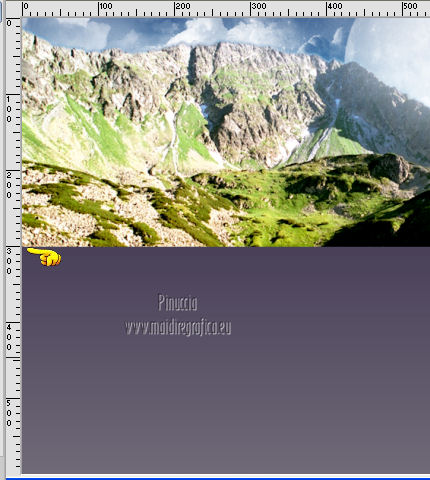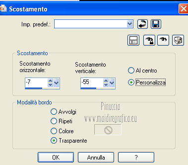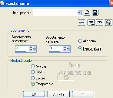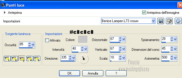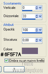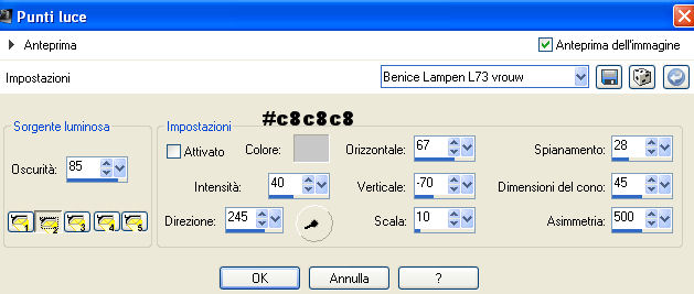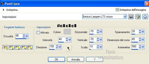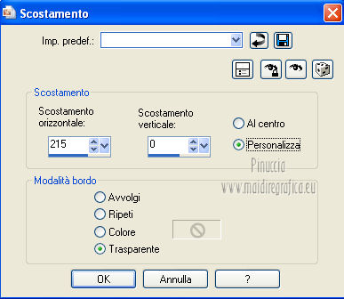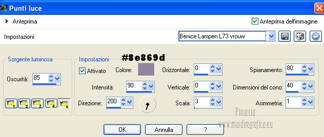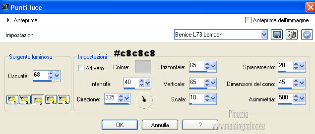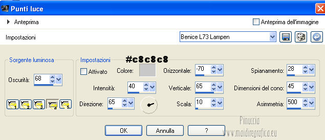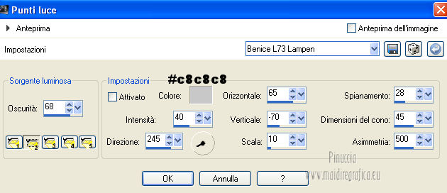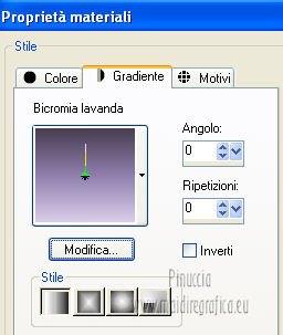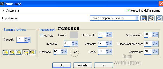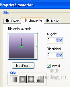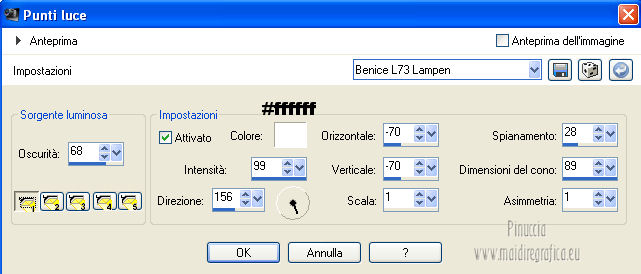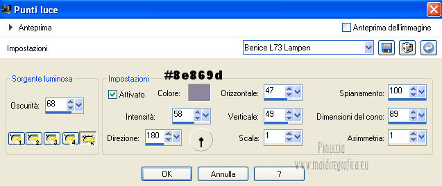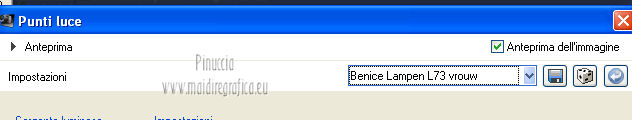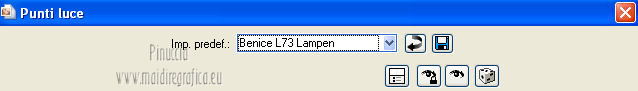 qui puoi trovare qualche risposta ai tuoi dubbi. Se l'argomento che ti interessa non è presente, ti prego di segnalarmelo. Occorrente: Materiale qui Il tube della donna è di Maxyran Filtri: consulta, se necessario, la mia sezione filtri qui FM Tile Tools qui Flaming Pear qui ![]() Metti il pennello nella cartella Pennelli. Attenzione, il pennello è composto da due files che non devono essere separati. Vedi gli appunti sui pennelli qui Il gradiente Corel_06_008 è standard nelle versioni più recenti di PSP, e corrisponde al gradiente standard delle versioni meno recenti Bicromia Lavanda. Se non lo trovi nel tuo PSP, metti quello fornito nella cartella Gradienti. Metti i preset Lights nella cartella Impostazioni predefinite. Se stai usando una versione precedente a PSP 12 e 13, nel corso del tutorial troverai i settaggi usati per creare questi preset. Imposta il colore di primo piano con #6f5f7a. ![]() Passa il colore di primo piano a Gradiente, e seleziona il gradiente Bicromia lavanda o Corel_06_008, con i seguenti settaggi. ![]() 1. Apri una nuova immagine trasparente 800 x 600 pixels e riempila con il gradiente.Livelli>Duplica. Cambia la modalità di miscelatura di questo livello in Differenza, e abbassa l'opacità al 49%. 2. Apri l'immagine Mountain wallpaper - 3 e vai a Modifica>Copia. Torna al tuo lavoro e vai a Modifica>Incolla come nuovo livello. Se non visualizzi i righelli, vai a Visualizza>Righelli. Premi sulla tastiera il tasto D per attivare lo strumento Deformazione ![]() e sposta l'immagine in alto a 300 pixels. ![]() Premi il tasto M per deselezionare lo strumento. Effetti>Plugins>FM Tile Tools > Blend Emboss, con i settaggi standard. ![]() Cambia la modalità di miscelatura di questo livello in Luminanza (esistente), e abbassa l'opacità al 10%. 2. Livelli>Nuovo livello raster. Selezione>Seleziona tutto. Apri il tube Graphsabine_design42 e vai a Modifica>Copia. Torna al tuo lavoro e vai a Modifica>Incolla nella selezione. Selezione>Deseleziona. Premi nuovamente sulla tastiera il tasto D, spingi in basso il nodo superiore centrale, fino a 230 pixels. ![]() spingi in alto il nodo inferiore centrale fino a 500 pixels. ![]() Premi sulla tastiera il tasto M per deselezionare lo strumento. Sposta il tube in alto,all'altezza dei 400 pixels. ![]() Cambia la modalità di miscelatura di questo livello in Luminanza (esistente). Effetti>Effetti di bordo>Aumenta. Effetti>Effetti 3D>Sfalsa ombra, colore #6f5f7a, ombra su nuovo livello selezionato. ![]() Rimani posizionato sul livello dell'ombra. Immagine>Rifletti. Effetti>Effetti di bordo>Aumenta. Cambia la modalità di miscelatura di questo livello in Luminanza (Esistente). Attiva il livello superiore. Livelli>Unisci>Unisci giù. Abbassa l'opacità di questo livello al 60%. 3. Cambia i settaggi del gradiente, selezionando Inverti. ![]() Livelli>Nuovo livello raster. Attiva lo strumento Selezione ,clicca sull'icona Selezione personalizzata ![]() e imposta i seguenti settaggi: ![]() Riempi la selezione con il gradiente.Effetti>Plugins>Flaming Pear - Flood - colore nero. ![]() Selezione>Deseleziona. Premi il tasto D per attivare lo strumento Deformazione ![]() e spingi in alto il nodo inferiore centrale, fino a 470 pixels. ![]() Premi il tasto M per deselezionare lo strumento. Immagine>Ridimensiona, 102x100%, tutti i livelli e mantieni proporzioni non selezionato. ![]() Effetti>Effetti di immagine>Scostamento. ![]() Abbassa l'opacità di questo livello al 50%. Livelli>Duplica. Cambia la modalità di miscelatura di questo livello in Moltiplica, e riporta l'opacità a 100. 4. Livelli>Nuovo livello raster. Selezione personalizzata ![]() ![]() Riempi la selezione con il gradiente.Regola>Aggiungi/Rimuovi disturbo>Aggiungi disturbo. ![]() Selezione>Deseleziona. 5. Imposta nuovamente il colore di primo piano con #6f5f7a. Livelli>Nuovo livello raster. Attiva lo strumento Pennello ![]() cerca e seleziona il pennello Benice_brush_struikjes, con i seguenti settaggi ![]() applicalo come nell'esempio, cliccando con il tasto sinistro del mouse, per usare il colore di primo piano. ![]() Livelli>Duplica. Effetti>Effetti di immagine>Scostamento. ![]() Livelli>Duplica. Immagine>Rifletti. Effetti>Effetti di immagine>Scostamento, con i settaggi precedenti. Livelli>Unisci>Unisci giù - 2 volte. Regola>Messa a fuoco>Metti a fuoco. Cambia la modalità di miscelatura di questo livello in Rafforza, e abbassa l'opacità al 26%. 6. Livelli>Unisci>Unisci tutto. Attiva lo strumento Ritaglio ![]() e traccia un ritaglio fino a 480 pixels. ![]() Clicca sul segno di spunta nella barra superiore degli strumenti per applicare il ritaglio ![]() Premi il tasto M per deselezionare lo strumento. Immagine>Aggiungi bordatura, 1 pixel, simmetriche, con il colore #8e869d. Immagine>Ridimensiona, 80 x 92%, tutti i livelli e mantieni proporzioni non selezionato. ![]() Modifica>Copia. Apri Achtergrond Benice L73 e vai a Modifica>Incolla come nuovo livello. ![]() Regola>Messa a fuoco>Metti a fuoco. Effetti>Effetti di illuminazione>Punti luce Apri il menu delle impostazioni e seleziona il preset Benice L73 Lampen. ![]() Se non puoi usare il preset nella tua versione di PSP puoi impostare manualmente i settaggi dei punti luce: luce 1. ![]() luce 2. ![]() luce 3. ![]() luce 4. ![]() luce 5. ![]() Livelli>Unisci>Unisci giù. 7. Apri il tube Maxyran_12_08_09 Woman150 e vai a Modifica>Copia. Torna al tuo lavoro e vai a Modifica>Incolla come nuovo livello. Lascia il tube come sta. Non spostarlo. Immagine>Ridimensiona, all'85%, tutti i livelli non selezionato, non dimenticare di rimettere la selezione a Mantieni proporzioni. Regola>Messa a fuoco>Metti a fuoco. Effetti>Effetti di immagine>Scostamento. ![]() Effetti>Effetti 3D>Sfalsa ombra. ![]() Effetti>Effetti di illuminazione>Punti luce Seleziona il preset Benice Lampen L73 vrouw e ok. ![]() Per impostare manualmente i settaggi, queste le schermate. luce 1. ![]() luce 2. ![]() luce 3. ![]() luce 4. ![]() luce 5. ![]() 8. Apri il tube Pix