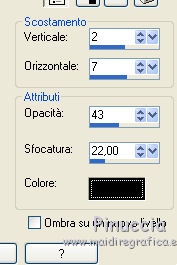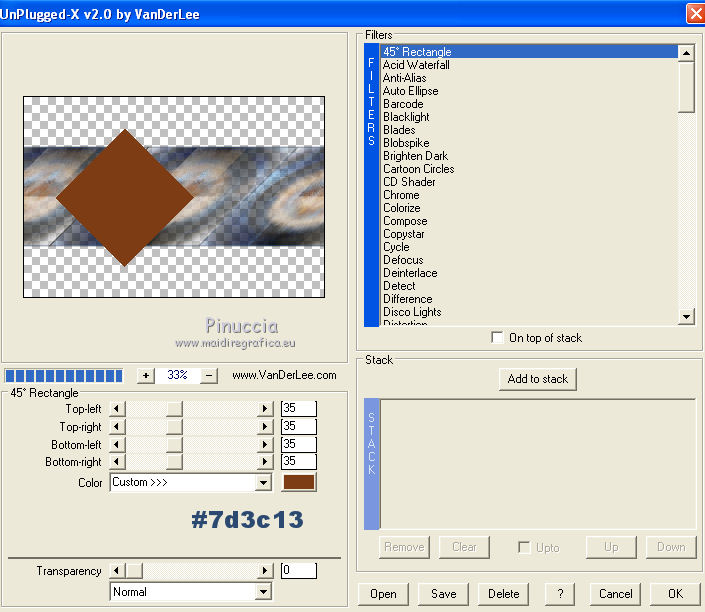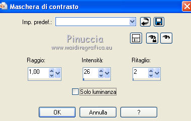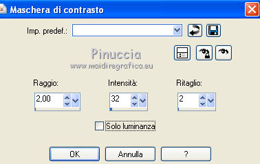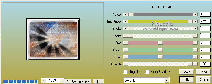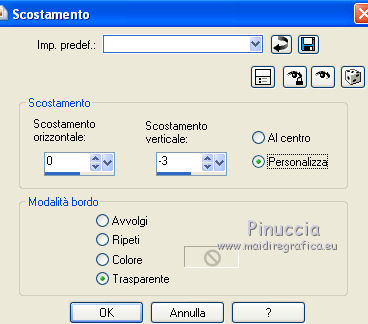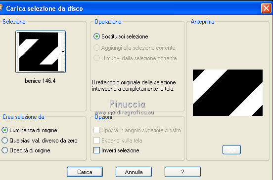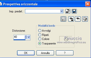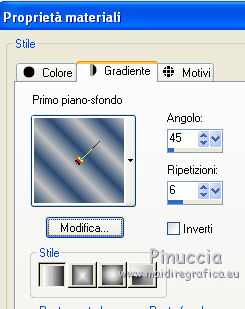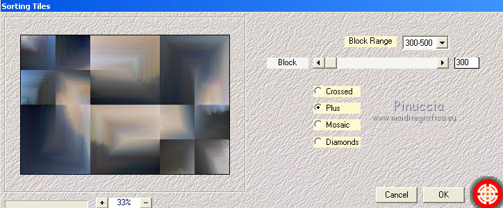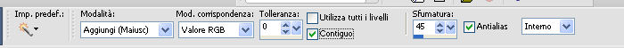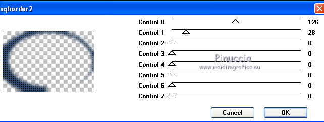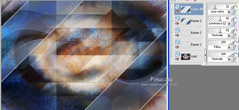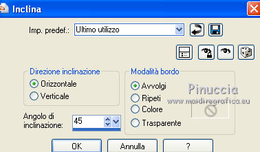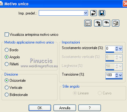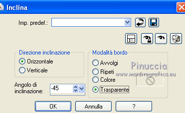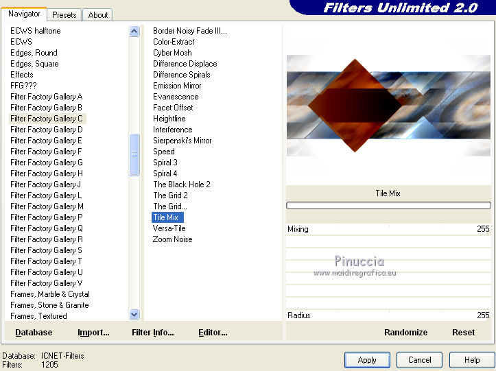 qui puoi trovare qualche risposta ai tuoi dubbi. Se l'argomento che ti interessa non è presente, ti prego di segnalarmelo. Occorrente: Materiale qui Per il tube della donna grazie Annelies Filtri: consulta, se necessario, la mia sezione filtri qui AAA Frames - Foto Frame qui AFS Import - sqborder2 qui Mehdi qui VanDerLee Unplugged-X qui Filters Unlimited 2.0 qui Filter Factory Gallery C qui I filtri Factory Gallery per essere usati devono prima essere convertiti. Come fare vedi qui Si usano importandoli in Filters Unlimited (come fare vedi qui) ma possono funzionare anche da soli. Le Factory fornite sono state già convertite. ![]() Metti i pennelli nella cartella Pennelli. Attenzione, ogni pennello è composto da due files che non devono essere separati. Vedi gli appunti sui pennelli qui Metti le selezioni nella cartella Selezioni. Imposta il colore di primo piano con #2b4971, e il colore di sfondo con #c0c0c0. ![]() 1. Apri una nuova immagine trasparente 900 x 600 pixels. Selezione>Seleziona tutto. Apri l'immagine BG_Benice_L146 e vai a Modifica>Copia. Torna al tuo lavoro e vai a Modifica>Incolla nella selezione. Mantieni selezionato. 2. Livelli>Nuovo livello raster. Apri l'immagine Abstract_XXIX_by_Kaeltyk e vai a Modifica>Copia. Torna al tuo lavoro e vai a Modifica>Incolla nella selezione. Selezione>Deseleziona. Cambia la modalità di miscelatura di questo livello in Colore. Livelli>Duplica. Riporta la modalità di miscelatura del livello a Normale, e abbassa l'opacità al 30%. Livelli>Unisci>Unisci visibile. 3. Livelli>Duplica. Effetti>Plugins>Mehdi - Weaver. ![]() Effetti>Effetti geometrici>Prospettiva orizzontale. ![]() Effetti>Effetti di distorsione>Coordinate polari. ![]() Immagine>Rifletti. Immagine>Capovolgi. 4. Selezione>Carica/Salva selezione>Carica selezione da disco. Cerca e carica la selezione Benice 146.1. ![]() Premi sulla tastiera il tasto CANC. Selezione>Deseleziona. 5. Attiva lo strumento Bacchetta magica , con i seguenti settaggi.![]() clicca nella parte trasparente esterna per selezionarla. ![]() Livelli>Nuovo livello raster. Riempi la selezione con il colore di primo piano.Effetti>Plugins>AFS Import - Sqborder2 ![]() Selezione>Deseleziona. Regola>Messa a fuoco>Accentua messa a fuoco. Cambia la modalità di miscelatura di questo livello in Luce netta, e abbassa l'opacità all'87%. Dovresti avere questo. ![]() 6. Livelli>Unisci>Unisci visibile. Effetti>Plugins>Mehdi - Fur. ![]() 7. Livelli>Duplica. Effetti>Plugins>Mehdi - Sorting Tiles. ![]() Effetti>Effetti di bordo>Aumenta. Cambia la modalità di miscelatura di questo livello in Luce diffusa. Livelli>Unisci>Unisci giù. 8. Livelli>Duplica. Immagine>Ridimensiona, al 50%, tutti i livelli non selezionato. Selezione>Seleziona tutto. Selezione>Mobile. Selezione>Immobilizza. Livelli>Nuovo livello raster. Riempi la selezione con il colore di primo piano.Selezione>Modifica>Contrai - 3 pixels. Premi sulla tastiera il tasto CANC. Selezione>Deseleziona. Effetti>Effetti di bordo>Erodi. Livelli>Unisci>Unisci giù. 9. Effetti>Effetti di immagine>Motivo unico. ![]() Effetti>Effetti geometrici>Inclina. ![]() Regola>Messa a fuoco>Metti a fuoco. Cambia la modalità di miscelatura di questo livello in Sovrapponi. 10. Livelli>Duplica. Riporta la modalità di miscelatura a Normale. Effetti>Plugins>VanDerLee - Unplugged-X - 45° Rectangle. ![]() Effetti>Plugins>Filters Unlimited 2.0 - Filter Factory Gallery C - Tile Mix. ![]() Effetti>Effetti di immagine>Motivo unico. ![]() Abbassa l'opacità di questo livello al 32%. Livelli>Disponi>Sposta giù. Livelli>Unisci>Unisci visibile. Dovresti avere questo. ![]() 11. Livelli>Nuovo livello raster. Selezione>Carica/Salva selezione>Carica selezione da disco. Cerca e carica la selezione Benice 146.2. ![]() Riempi la selezione (le linee) con il colore di sfondo.Selezione>Deseleziona. Cambia la modalità di miscelatura di questo livello in Filtra. 12. Livelli>Nuovo livello raster. Selezione>Carica/Salva selezione>Carica selezione da disco. Cerca e carica la selezione Benice 146.3. ![]() Ingrandisci molto l'immagine per visualizzare meglio lo spazio da riempire. Riempi la selezione con il colore di sfondo.Selezione>Deseleziona. Abbassa l'opacità di questo livello al 55%. 13. Livelli>Nuovo livello raster. Selezione>Carica/Salva selezione>Carica selezione da disco. Cerca e carica la selezione Benice 146.4. ![]() Apri l'immagine Abstract_golf e vai a Modifica>Copia. Torna al tuo lavoro e vai a Modifica>Incolla nella selezione. Selezione>Deseleziona. Cambia la modalità di miscelatura di questo livello in Luminanza (esistente), e abbassa l'opacità al 55%. Livelli>Duplica. Cambia la modalità di miscelatura di questo livello in Luce netta, e abbassa l'opacità al 32%. ![]() 14. Apri il tube Benice_Tekst_L146 e vai a Modifica>Copia. Torna al tuo lavoro e vai a Modifica>Incolla come nuovo livello. Effetti>Effetti di immagine>Scostamento. ![]() Cambia la modalità di miscelatura di questo livello in Sovrapponi, e abbassa l'opacità al 50%. ![]() Livelli>Unisci>Unisci visibile. Dovresti avere questo. ![]() 15. Apri il tube Benice_Bomen_L146 e vai a Modifica>Copia. Torna al tuo lavoro e vai a Modifica>Incolla come nuovo livello. Effetti>Effetti di immagine>Scostamento. ![]() Cambia la modalità di miscelatura di questo livello in Luminanza (esistente). 16. Apri il tube Benice_Overlay e vai a Modifica>Copia. Torna al tuo lavoro e vai a Modifica>Incolla come nuovo livello. Lascialo come sta. E' già correttamente posizionato. Cambia la modalità di miscelatura di questo livello in Luce netta. 17. Apri il Benice_Lijntjes 1 e vai a Modifica>Copia. Torna al tuo lavoro e vai a Modifica>Incolla come nuovo livello. Effetti>Effetti di immagine>Scostamento. ![]() 18. Livelli>Duplica. Attiva il livello sottostante dell'originale (raster 3). Effetti>Effetti geometrici>Inclina. ![]() Livelli>Duplica. Immagine>Rifletti. Immagine>Capovolgi. Livelli>Unisci>Unisci giù. Cambia la modalità di miscelatura di questo livello 