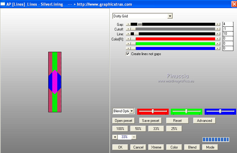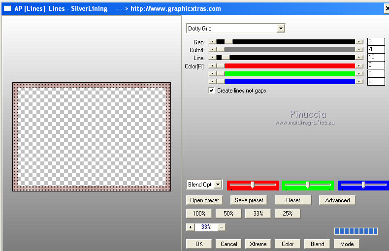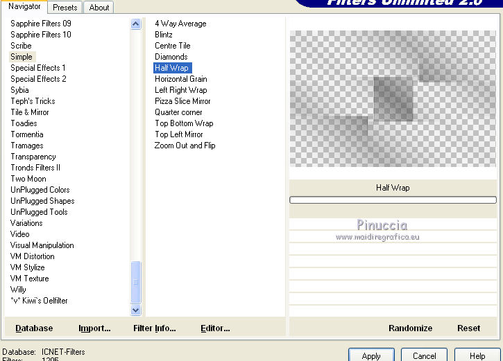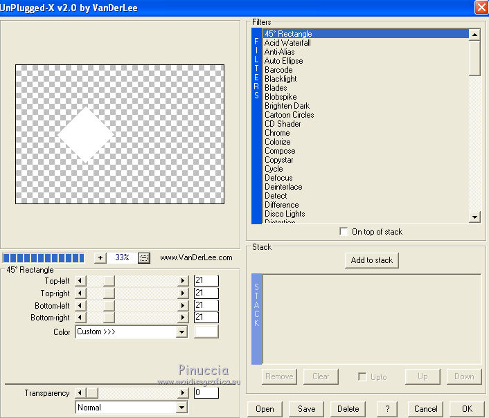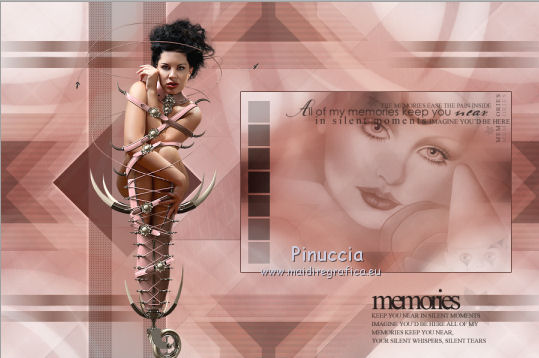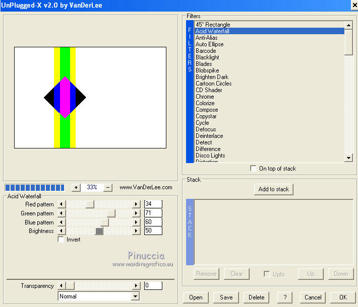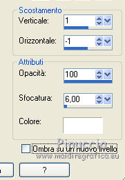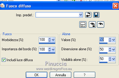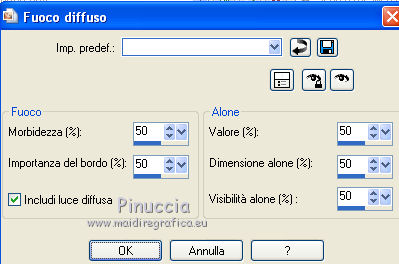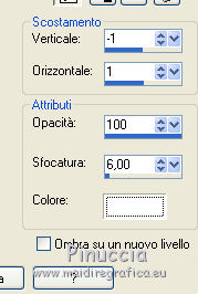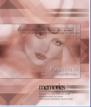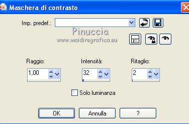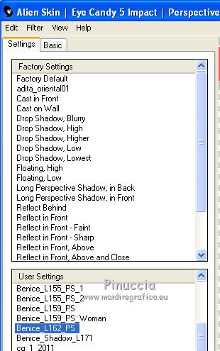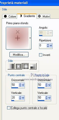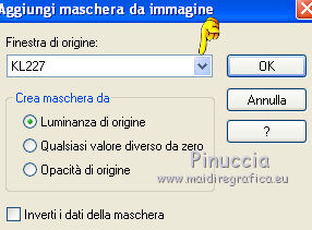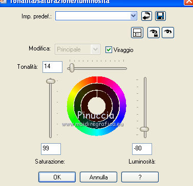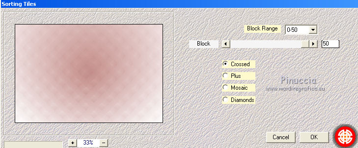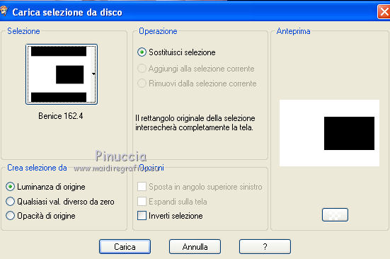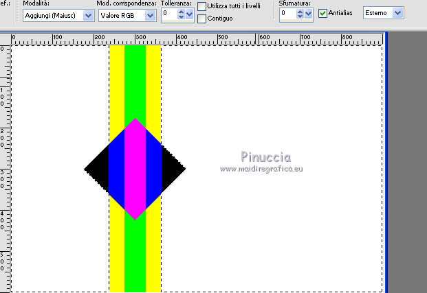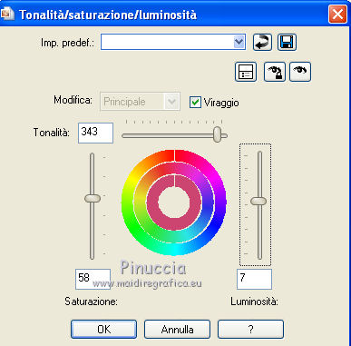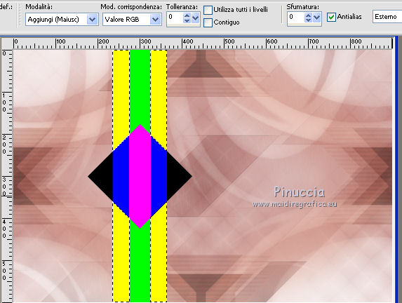 qui puoi trovare qualche risposta ai tuoi dubbi. Se l'argomento che ti interessa non è presente, ti prego di segnalarmelo. Occorrente: Materiale qui Per il tube della donna grazie Betsie Filtri: consulta, se necessario, la mia sezione filtri qui Filters Unlimited 2.0 qui &<Bkg Designer sf10 I> (da importare in Unlimited) qui Alien Skin Eye Candy 5 Impact qui Mehdi qui AP Lines qui Simple qui VanDerLee Unplugged X qui i filtri Simple si possono usare importati in Unlimited, ma possono funzionare anche da soli ![]() Metti il preset nella cartella del filtro Alien Skin Eye Candy 5 Impact>Setting>Shadow. Cliccando sul file, automaticamente il preset si installerà nella cartella corretta. Metti i pennelli nella cartella Pennelli. Attenzione, ogni pennello è composto da due files che non devono essere separati. Vedi gli appunti sui pennelli qui Metti le selezioni nella cartella Selezioni. Apri le maschere in PSP e minimizzale con il resto del materiale. Imposta il colore di primo piano con #c48e8a e il colore di sfondo con #ffffff. ![]() Passa il colore di primo piano a Gradiente, stile Sprazzo di luce, con i seguenti settaggi. ![]() 1. Apri una nuova immagine trasparente 900 x 600 pixels, e riempila con il gradiente.Effetti>Effetti di bordo>Aumenta di più. Effetti>Effetti di bordo>Aumenta. 2. Sullo stesso livello: Effetti>Plugins>Mehdi - Sorting Tiles. ![]() Regola>Morbidezza>Fuoco diffuso. ![]() Effetti>Effetti di immagine>Motivo unico. ![]() 3. Passa il colore di primo piano da Gradiente a Colore, e imposta il colore nero #000000. ![]() 4 Livelli>Nuovo livello raster. Riempi il livello con il colore di primo piano.Livelli>Nuovo livello maschera>Da immagine. Apri il menu sotto la finestra di origine e vedrai la lista dei files aperti. Seleziona la maschera Masker-222, con i seguenti settaggi: ![]() Livelli>Unisci>Unisci gruppo. 5. Sullo stesso livello. Effetti>Plugins>Filters Unlimited 2.0 - Simple - Half Wrap. ![]() Effetti>Effetti di immagine>Motivo unico. ![]() Effetti>Effetti di immagine>Motivo unico. ![]() Effetti>Effetti geometrici>Inclina. ![]() Cambia la modalità di miscelatura di questo livello in Luminanza, e abbassa l'opacità al 50%. Livelli>Unisci>Unisci giù. 6. Dovresti avere questo: ![]() 7. Livelli>Nuovo livello raster. Riempi il livello con il colore di sfondo.Livelli>Nuovo livello maschera>Da immagine. Apri il menu sotto la finestra di origine e seleziona la maschera KL227, con i seguenti settaggi: ![]() Livelli>Unisci>Unisci gruppo. Abbassa l'opacità di questo livello al 70%. 8. Imposta il colore di primo piano con #75422d. ![]() 9. Livelli>Nuovo livello raster. Selezione>Carica/Salva selezione>Carica selezione da disco. Cerca e carica la selezione Benice 162.1. ![]() Riempi la selezione con il colore di primo piano.Selezione>Deseleziona. Regola>Sfocatura>Sfocatura gaussiana - raggio 40. ![]() Cambia la modalità di miscelatura di questo livello in Luce netta, e abbassa l'opacità al 30%. 10. Livelli>Nuovo livello raster. Selezione>Carica/Salva selezione>Carica selezione da disco. Cerca e carica la selezione Benice 162.2. ![]() Riempi la selezione con il colore di primo piano.Selezione>Deseleziona. 11. Sullo stesso livello: Effetti>Plugins>&<Bkg Designer sf10I> - Cruncher. ![]() Effetti>Effetti di trama>Veneziana. ![]() Cambia la modalità di miscelatura di questo livello in Luminanza, e abbassa l'opacità al 60%. 12. Finestra>Duplica (o, sulla tastiera, maiuscola+D) per fare una copia. Minimizza la copia, e torna al tuo lavoro originale. 13. Livelli>Nuovo livello raster. Effetti>Plugins>VanDerLee - Unplugged-X - 45° Rectangle: ![]() Effetti>Plugins>VanDerLee - Unplugged-X - Acid Waterfall. ![]() 14. Sullo stesso livello: Attiva lo strumento Bacchetta magica con i seguenti settaggie seleziona la parte bianca. ![]() Premi sulla tastiera il tasto CANC. Selezione>Deseleziona. 15. Sullo stesso livello: attiva nuovamente lo strumento Bacchetta magica con gli stessi settaggi,e seleziona la parte gialla. ![]() Regola>Tonalità e saturazione>Tonalità/Saturazione/Luminosità. ![]() Mantieni selezionato. Effetti>Plugins>AP lines - Lines SilverLining. ![]() Selezione>Deseleziona. 16. Sullo stesso livello: Effetti>Effetti di immagine>Scostamento. ![]() Effetti>Effetti 3D>Sfalsa ombra, con il colore bianco. ![]() Ripeti l'Effetto Sfalsa ombra, cambiando verticale e orizzontale con -1/1. ![]() Cambia la modalità di miscelatura di questo livello in Luminanza (Esistente), e abbassa l'opacità al 60%. 17. Dovresti avere questo: ![]() 18. Livelli>Nuovo livello raster. Selezione>Carica/Salva selezione>Carica selezione da disco. Cerca e carica la selezione Benice 162.3. ![]() Riempi la selezione con il colore di primo piano.Selezione>Deseleziona. Effetti>Effetti di bordo>Aumenta. 19. Sullo stesso livello: Effetti>Effetti di distorsione>Vento - da destra, intensità 100. ![]() Effetti>Effetti di distorsione>Vento - da sinistra, intensità 100. ![]() Regola>Tonalità e saturazione>Tonalità/Saturazione/Luminosità. ![]() Effetti>Effetti di immagine>Scostamento. ![]() Livelli>Duplica. Immagine>Rifletti. 20. Attiva il duplicato che hai minimizzato al punto 12. Lavora su questa immagine. Livelli>Unisci>Unisci tutto. Immagine>Ridimensiona - al 50%, tutti i livelli selezionato. Regola>Morbidezza>Fuoco diffuso. ![]() Immagine>Aggiungi bordatura - 1 pixel, simmetriche, con il colore #68372f. Modifica>Copia. Torna al tuo lavoro originale e vai a Modifica>Incolla come nuovo livello. Effetti>Effetti di immagine>Scostamento. ![]() 21. Apri il tube Misted_Pierrot_Benice_L162 e vai a Modifica>Copia. Torna al tuo lavoro e vai a Modifica>Incolla come nuovo livello. Sposta il tube come nell'esempio.![]() Abbassa l'opacità di questo livello al 55%. 22. Sullo stesso livello. Selezione>Carica/Salva selezione>Carica selezione da disco. Cerca e carica la selezione Benice 162.2. ![]() Premi sulla tastiera il tasto CANC. Selezione>Deseleziona. Livelli>Unisci>Unisci giù. Livelli>Duplica. Cambia la modalit