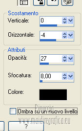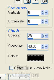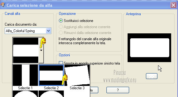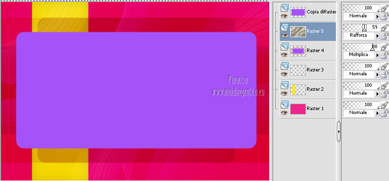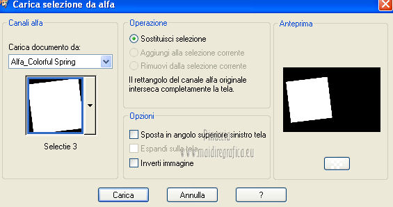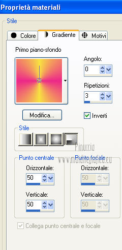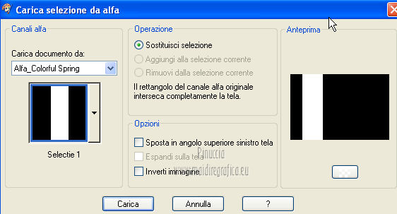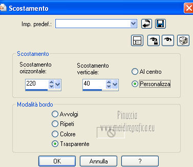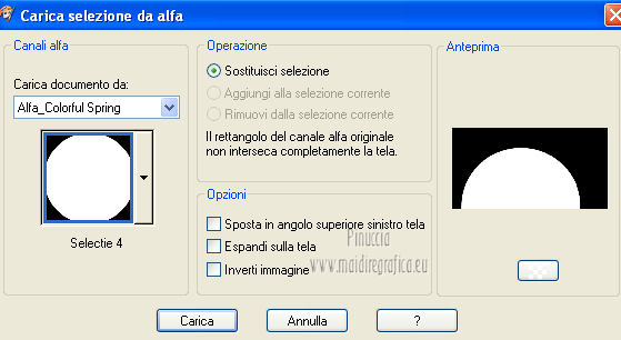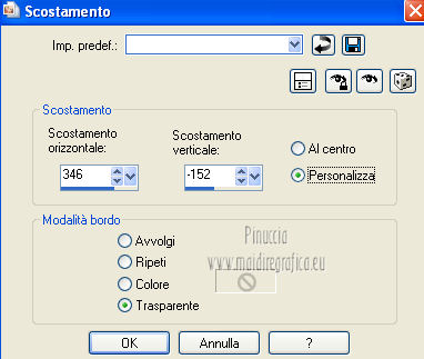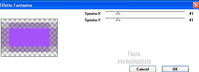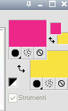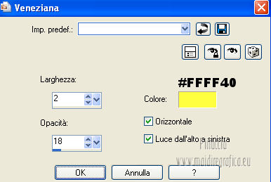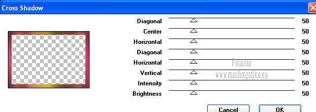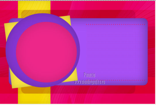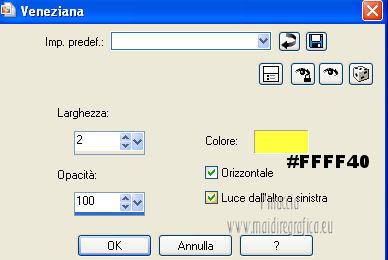 qui puoi trovare qualche risposta ai tuoi dubbi. Se l'argomento che ti interessa non è presente, ti prego di segnalarmelo. Occorrente: Materiale qui Filtri: consulta, se necessario, la mia sezione filtri qui Graphics Plus qui Italian Editors Effect qui ![]() Imposta il colore di primo piano con #ec2889, e il colore di sfondo con #f7e241. ![]() 1. Apri Alfa_Colorful Spring. Finestra>Duplica (o sulla tastiera maiuscola+D) per fare una copia. Chiudi l'originale. La copia, che non è vuota, ma contiene le selezioni salvate sul canale alfa, sarà la base del tuo lavoro. 2. Riempi l'immagine trasparente con il colore di primo piano.3. Livelli>Nuovo livello raster. Selezione>Carica/Salva selezione>Carica selezione da canale alfa. La selezione "Selectie 1" è subito disponibile. Devi soltanto cliccare Carica. ![]() Riempi la selezione con il colore di sfondo.Mantieni selezionato. Livelli>Nuovo livello raster. Effetti>Effetti 3D>Ritaglio. ![]() Effetti>Effetti di trama>Veneziana - colore #ffff40. ![]() Selezione>Deseleziona. 4. Imposta il colore di primo piano con #a552f8. ![]() 5. Livelli>Nuovo livello raster. Selezione>Carica/Salva selezione>Carica selezione da canale alfa. Apri il menu delle selezioni e carica Selectie2. ![]() Riempi la selezione con il colore di primo piano.Selezione>Deseleziona. 6. Livelli>Duplica. Attiva il livello sottostante dell'originale (Raster 4). Effetti>Plugins>Italian Editors Effect - Effetto Fantasma. ![]() Cambia la modalità di miscelatura di questo livello in Moltiplica, e abbassa l'opacità all'80%. 7. Rimani posizionato su questo livello. Apri Benice_Deco_L182 e vai a Modifica>Copia. Torna al tuo lavoro e vai a Modifica>Incolla come nuovo livello. Cambia la modalità di miscelatura di questo livello in Rafforza, e abbassa l'opacità al 59%. ![]() 8. Attiva il livello superiore. Apri il tube Benice_Deco_2_L182 e vai a Modifica>Copia. Torna al tuo lavoro e vai a Modifica>Incolla come nuovo livello. Effetti>Effetti di immagine>Scostamento. ![]() 9. Livelli>Nuovo livello raster. Selezione>Carica/Salva selezione>Carica selezione da canale alfa. Apri il menu delle selezioni e carica nuovamente Selectie2. ![]() Effetti>Effetti 3D>Ritaglio. ![]() Selezione>Deseleziona. 10. Livelli>Nuovo livello raster. Selezione>Carica/Salva selezione>Carica selezione da canale alfa. Apri il menu delle selezioni e carica Selectie3. ![]() Riempi la selezione con il colore di sfondo.Mantieni selezionato. Livelli>Nuovo livello raster. Effetti>Effetti 3D>Ritaglio. ![]() Selezione>Deseleziona. 11. Imposta il colore di primo piano con #8537D3, e il colore di sfondo con #EC2889. ![]() 12. Livelli>Nuovo livello raster. Selezione>Carica/Salva selezione>Carica selezione da canale alfa. Apri il menu delle selezioni e carica Selectie4. ![]() Riempi la selezione con il colore di primo piano.Mantieni selezionato. Livelli>Nuovo livello raster. Effetti>Effetti 3D>Ritaglio. ![]() Selezione>Deseleziona. Abbassa l'opacità di questo livello al 50%. 13. Livelli>Nuovo livello raster. Selezione>Carica/Salva selezione>Carica selezione da canale alfa. Apri il menu delle selezioni e carica Selectie5. ![]() Riempi la selezione con il colore di sfondo.Mantieni selezionato. Livelli>Nuovo livello raster. Effetti>Effetti 3D>Ritaglio. ![]() Selezione>Deseleziona. Abbassa l'opacità di questo livello al 35%. 14. Dovresti avere questo. ![]() 15. Apri il tube Drawn_Model_002 e vai a Modifica>Copia. Torna al tuo lavoro e vai a Modifica>Incolla come nuovo livello. Effetti>Effetti di immagine>Scostamento. ![]() Effetti>Effetti 3D>Sfalsa ombra. ![]() 16. Apri il tube Benice_Tekst_Samengevoegd_L182 e vai a Modifica>Copia. Torna al tuo lavoro e vai a Modifica>Incolla come nuovo livello. Effetti>Effetti di immagine>Scostamento. ![]() Effetti>Effetti 3D>Sfalsa ombra. ![]() il tube contiene i tre testi uniti in un unico livello. Se vuoi usare i testi separatamente, trovi nel materiale il tube Benice_Tekst_Lagen_L182, con ogni testo sul proprio livello. 17. Apri il tube Benice_Birds_L182 e vai a Modifica>Copia. Torna al tuo lavoro e vai a Modifica>Incolla come nuovo livello. Effetti>Effetti di immagine>Scostamento. ![]() Effetti>Effetti 3D>Sfalsa ombra. ![]() 18. Apri il tube Benice_Flowers_L182 e vai a Modifica>Copia. Torna al tuo lavoro e vai a Modifica>Incolla come nuovo livello. Effetti>Effetti di immagine>Scostamento. ![]() Effetti>Effetti 3D>Sfalsa ombra. ![]() 19. Imposta il colore di primo piano con #ec2889, e il colore di sfondo con #f7e241. ![]() Passa il colore di primo piano a Gradiente di primo piano/sfondo, stile Radiale. ![]() 20. Livelli>Unisci>Unisci tutto. Immagine>Aggiungi bordatura, 2 pixels, simmetriche, con il colore #f8e541. Selezione>Seleziona tutto. Immagine>Aggiungi bordatura, 40 pixels, simmetriche, con il colore #a552f8. Selezione>Inverti. 21. Livelli>Nuovo livello raster. Riempi la selezione con il gradiente.Abbassa l'opacità di questo livello al 60%. Livelli>Duplica. Effetti>Effetti di trama>Veneziana. ![]() Effetti>Effetti di bordo>Aumenta. Cambia la modalità di miscelatura di questo livello in Moltiplica. Livelli>Duplica. Effetti>Plugins>Graphics Plus - Cross Shadow. ![]() Cambia la modalità di miscelatura di questo livello in Sovrapponi, e riporta l'opacità a 100. Livelli>Nuovo livello raster. Effetti>Effetti 3D>Ritaglio. ![]() 22. Livelli>Unisci>Unisci tutto. Immagine>Aggiungi bordatura, 1 pixel, simmetriche, con il colore #f8e541. Aggiungi il tuo nome e/o il tuo watermark e salva in formato jpg. ![]() Se hai problemi o dubbi, o trovi un link non funzionante, o anche soltanto per un saluto, scrivimi 27 Marzo 2013 |