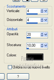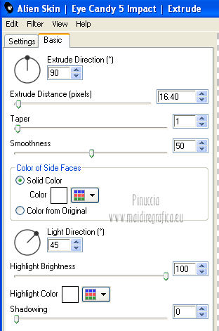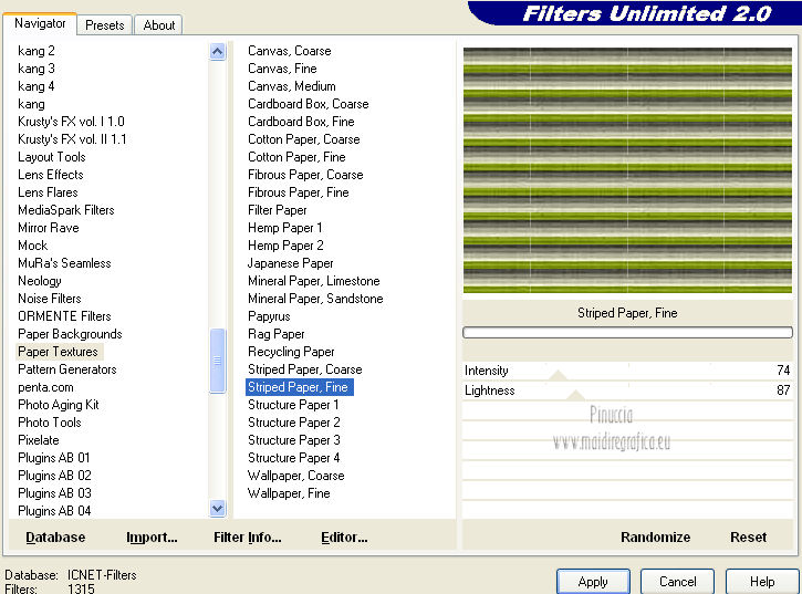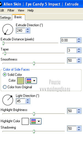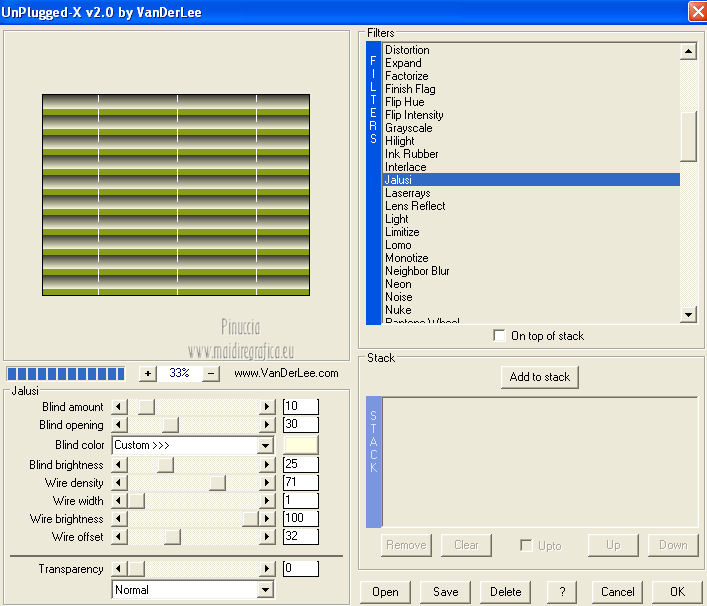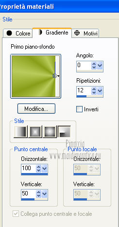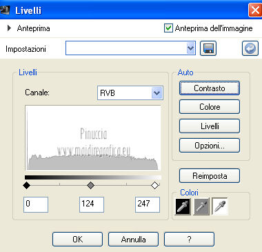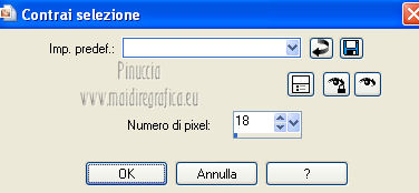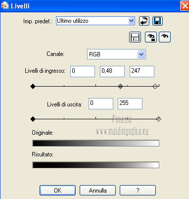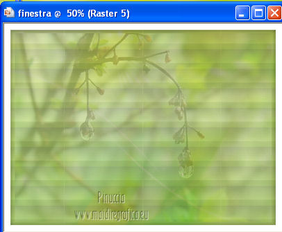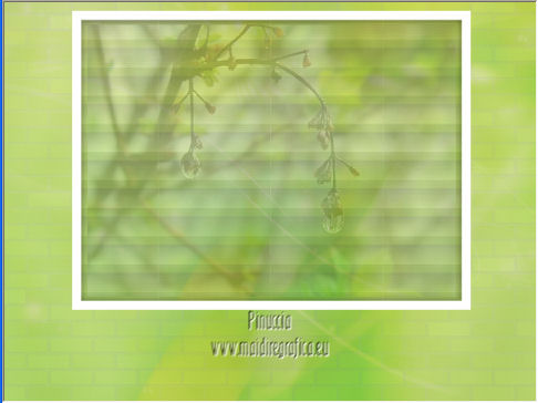qui puoi trovare qualche risposta ai tuoi dubbi. Se l'argomento che ti interessa non è presente, ti prego di segnalarmelo. Occorrente: Materiale qui Filtri: consulta, se necessario, la mia sezione filtri qui VanDerLee Unplugged X qui Filters Unlimited 2.0 qui Alien Skin Eye Candy 5 Impact qui Alien Skin Eye Candy 5 Textures qui ![]() Metti le selezioni nella cartella Selezioni. Imposta il colore di primo piano con #b9cb5b, e il colore di sfondo con #889e19. ![]() Passa il colore di primo piano a Gradiente, stile Radiale. ![]() 1. Apri una nuova immagine trasparente 800 x 600 pixels, e riempila con il gradiente.Regola>Sfocatura>Sfocatura gaussiana - raggio 20. ![]() Livelli>Duplica. Immagine>Rifletti. Abbassa l'opacità di questo livello al 50%. Livelli>Unisci>Unisci giù. Effetti>Effetti di bordo>Aumenta di più. 2. Livelli>Nuovo livello raster. Selezione>Seleziona tutto. Apri l'immagine Abstract_0079_lightbox e vai a Modifica>Copia. Torna al tuo lavoro e vai a Modifica>Incolla nella selezione. Selezione>Deseleziona. Cambia la modalità di miscelatura di questo livello in Luce netta, e abbassa l'opacità al 46%. Finestra>Duplica (o, sulla tastiera, maiuscola+D) per fare una copia. Sul duplicato: Livelli>Unisci>Unisci giù. Salva l'immagine come "Sfondo" e minimizzala. 3. Torna al tuo lavoro originale. Livelli>Nuovo livello raster. Riempi il livello con il colore di sfondo.Effetti>Plugins>VanDerLee - Unplugged X. ![]() Cambia la modalità di miscelatura di questo livello in Moltiplica, e abbassa l'opacità al 26%. Effetti>Plugins>Filters Unlimited 2.0 - Paper Textures - Striped Paper, Fine. ![]() Livelli>Unisci>Unisci tutto. Salva l'immagine con il nome Veneziana e minimizzala. 4. Imposta il colore di primo piano con il colore bianco, e il colore di sfondo con #c0c985. Apri una nuova immagine trasparente 800 x 600 pixels, e riempila con il colore di primo piano.5. Livelli>Nuovo livello raster. Selezione>Seleziona tutto. Apri l'immagine Zeto e vai a Modifica>Copia. Torna al tuo lavoro e vai a Modifica>Incolla nella selezione. Selezione>Deseleziona. Abbassa l'opacità di questo livello al 60%. 6. Livelli>Nuovo livello raster. Selezione>Carica/Salva selezione>Carica selezione da disco. Cerca e carica la selezione Benice 37.1. ![]() Riempi la selezione con il colore bianco.Selezione>Deseleziona. Effetti>Plugins>Alien Skin Eye Candy 5 Impact - Extrude Settings : Centered, Small Taper Basic. ![]() 7. Livelli>Nuovo livello raster. Selezione>Seleziona tutto. Selezione>Modifica>Contrai - 18 pixels. ![]() Attiva l'immagine Veneziana. ![]() Modifica>Copia. Torna al tuo lavoro e vai a Modifica>Incolla nella selezione. Mantieni selezionato. Livelli>Nuovo livello raster. Effetti>Effetti 3D>Ritaglio. ![]() Livelli>Nuovo livello raster. Effetti>Effetti 3D>Ritaglio. ![]() Selezione>Deseleziona. Abbassa l'opacità del livello Raster 3 al 66%. ![]() Livelli>Unisci>Unisci tutto. Immagine>Ridimensiona, al 75%, tutti i livelli selezionato. Salva l'immagine con il nome Finestra e minimizzala. 8. Apri una nuova immagine trasparente 800 x 600 pixels, e riempila con il colore bianco.Imposta il colore di primo piano con #999589, e il colore di sfondo con #a4b743. Attiva l'immagine "Sfondo" del punto 2. ![]() Modifica>Copia. Torna al tuo lavoro e vai a Modifica>Incolla come nuovo livello. Abbassa l'opacità di questo livello all'84%. 9. Livelli>Nuovo livello raster. Effetti>Plugins>Alien Skin Eye Candy 5 Textures - Brick Wall. Settings: Dark Red. Basic ![]() Abbassa l'opacità di questo livello al 13%. Livelli>Unisci>Unisci tutto. 10. Continuerai a lavorare su questa immagine. Attiva l'immagine Finestra del punto 7. ![]() Modifica>Copia. Torna al tuo lavoro e vai a Modifica>Incolla come nuovo livello. Sposta la finestra un po' più in alto,vedi il mio esempio. ![]() Regola>Messa a fuoco>Metti a fuoco. 11. Livelli>Nuovo livello raster. Selezione>Carica/Salva selezione>Carica selezione da disco. Cerca e carica la selezione Benice 37.2. ![]() Riempi la selezione con il colore bianco.Selezione>Deseleziona. Effetti>Plugins>Alien Skin Eye Candy 5 Impact - Extrude. Settings: Small Offset - Solid Color Basic ![]() Livelli>Disponi>Sposta giù. Sposta la striscia sotto la finestra.![]() Attiva il livello superiore della finestra. Livelli>Unisci>Unisci giù. Effetti>Effetti 3D>Sfalsa ombra, con il colore nero ![]() Ripeti l'Effetto Sfalsa ombra, cambiando verticale e orizzontale con -4. 12. Apri il tube La_ball_variante e vai a Modifica>Copia. torna al tuo lavoro e vai a Modifica>Incolla come nuovo livello. Immagine>Ridimensiona, al 70%, tutti i livelli non selezionato. Sposta a sinistra, vicino al bordo.Regola>Messa a fuoco>Metti a fuoco. Effetti>Effetti 3D>Sfalsa ombra, con il colore nero. ![]() 13. Apri il tube Kussens e vai a Modifica>Copia. Torna al tuo lavoro e vai a Modifica>Incolla come nuovo livello. Spostalo a destra sul banco della finestra.Regola>Messa a fuoco>Metti a fuoco. Effetti>Effetti 3D>Sfalsa ombra, come al punto 12. 14. Apri il tube Mtfp_flowery_dress_girl e vai a Modifica>Copia. Torna al tuo lavoro e vai a Modifica>Incolla come nuovo livello. Immagine>Ridimensiona, al 70%, tutti i livelli non selezionato. Spostalo a sinistra, sul bordo inferiore.Regola>Messa a fuoco>Metti a fuoco. Effetti>Effetti 3D>Sfalsa ombra, con i settaggi precedenti. 15. Apri il tube Marif_2007_02Fevrier_main02 e vai a Modifica>Copia. Torna al tuo lavoro e vai a Modifica>Incolla come nuovo livello. Immagine>Ridimensiona, al 50%, tutti i livelli non selezionato. Regola>Messa a fuoco>Metti a fuoco. Sposta il tube in alto a destra.Effetti>Effetti 3D>Sfalsa ombra, con i settaggi precedenti. 16. Apri il tube Mou-stoneage e vai a Modifica>Copia. Torna al tuo lavoro e vai a Modifica>Incolla come nuovo livello. Immagine>Ridimensiona, al 20 %, tutti i livelli non selezionato. Regola>Luminosità e contrasto>Livelli. Clicca su Contrasto e imposta i seguenti settaggi. ![]() Se stai usando versioni meno recenti di PSP, avrai una finestra divers