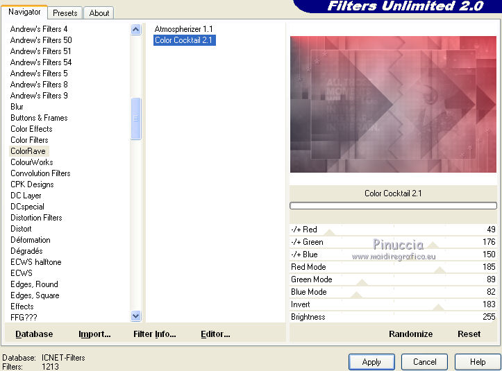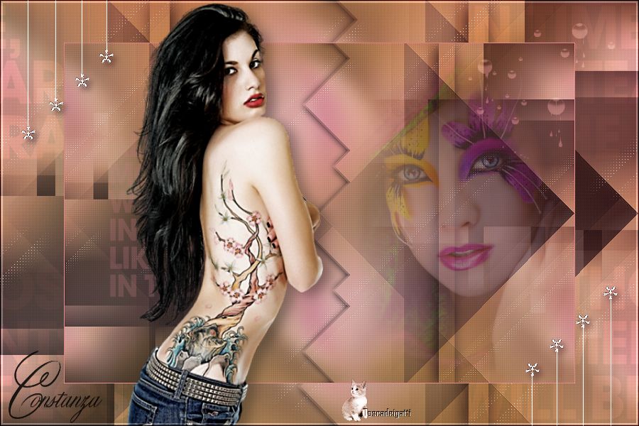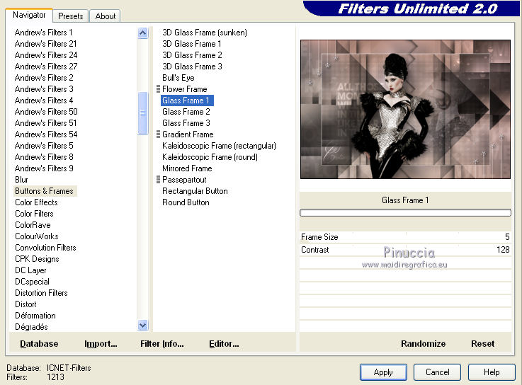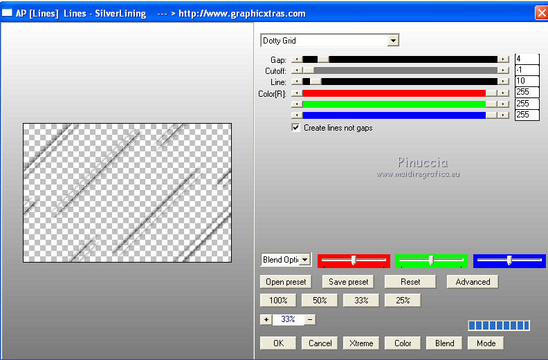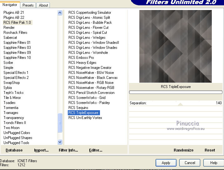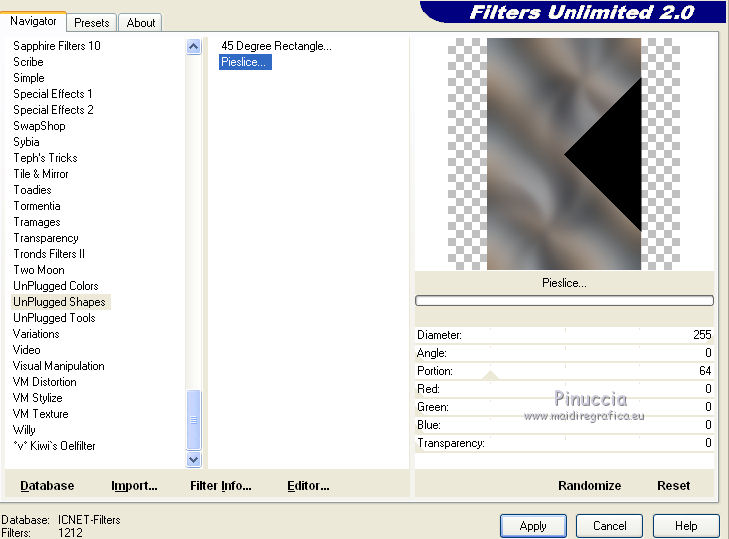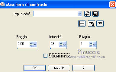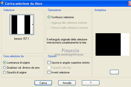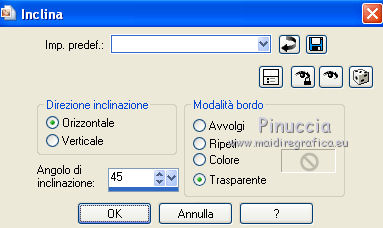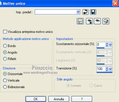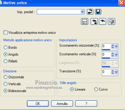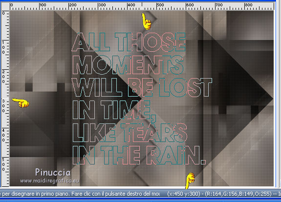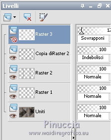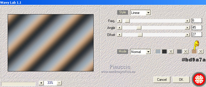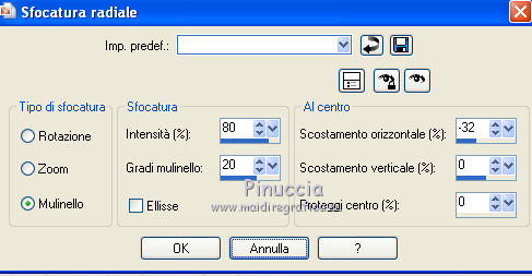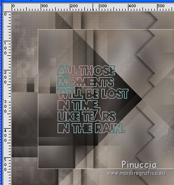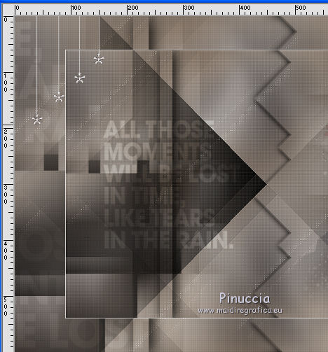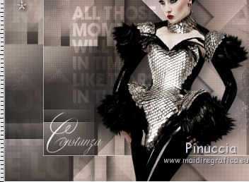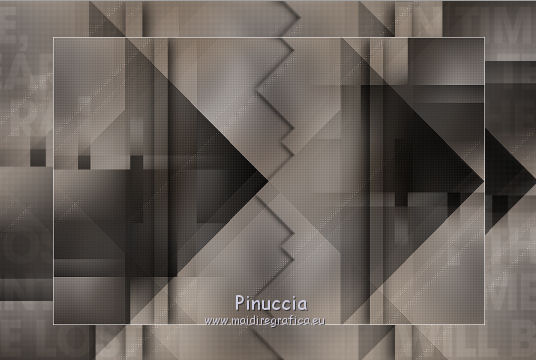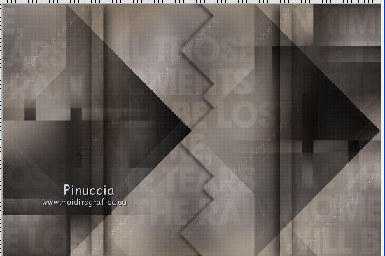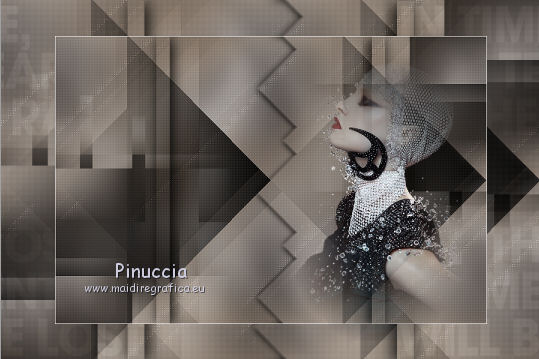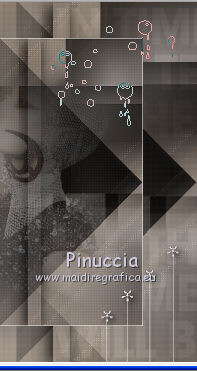 qui puoi trovare qualche risposta ai tuoi dubbi. Se l'argomento che ti interessa non è presente, ti prego di segnalarmelo. Occorrente: Materiale qui Il tube della donna è di Annie Il misted della donna è di Benice, e non può essere usato per altri tutorial. Filtri: consulta, se necessario, la mia sezione filtri qui Filters Unlimited 2.0 qui Ap Lines - Lines SilverLining qui ColorRave qui Mehdi qui Penta.com - Color dot qui RCS Filterpak 1.0 qui Toadies qui Unplugged Shapes qui Tutti i filtri - tranne Ap Lines e Mehdi si possono usare da soli o importati in Unlimited. ![]() Metti i pennelli nella cartella Pennelli. Attenzione, ogni pennello è composto da due files che non devono essere separati. Vedi gli appunti sui pennelli qui Metti la selezione nella cartella Selezioni. Metti la maschera 20-20 nella cartella Maschere. Imposta il colore di primo piano con #333333, e il colore di sfondo con #a7b0b7. ![]() 1. Apri una nuova immagine trasparente 900 x 600 pixels. Effetti>Plugins>Mehdi - Wavy Lab. il filtro di default usa i colori impostati nella paletta dei materiali, imposta il terzo colore con #bd9a7a. ![]() Regola>Sfocatura>Sfocatura gaussiana - raggio 60. ![]() 2. Apri il tube Benice_misted_woman_L157 e vai a Modifica>Copia. non chiuderlo perchè ti servirà ancora Torna al tuo lavoro e vai a Modifica>Incolla come nuovo livello. Effetti>Effetti di immagine>Motivo unico. ![]() Regola>Sfocatura>Sfocatura radiale. ![]() Regola>Sfocatura>Sfocatura gaussiana - raggio 14. ![]() 3. Sullo stesso livello (questo passaggio è obbligatorio). Attiva lo strumento Ritaglio ![]() e clicca sull'icona Ritaglio unito opaco ![]() e poi clicca sul segno di spunta verde. ![]() Selezione>Carica/Salva selezione>Carica selezione da disco. Cerca e carica la selezione Benice 157.1. ![]() Premi sulla tastiera il tasto CANC. Selezione>Deseleziona. Effetti>Effetti di immagine>Scostamento. ![]() 4. Sullo stesso livello. Livelli>Carica/Salva maschera>Carica maschera da disco. Cerca e carica la maschera 20-20. ![]() Livelli>Unisci>Unisci gruppo. Effetti>Effetti di immagine>Scostamento. ![]() Livelli>Duplica. Immagine>Rifletti. Immagine>Capovolgi. 5. Livelli>Unisci>Unisci visibile. Dovresti avere questo. ![]() 6. Livelli>Duplica. Immagine>Ruota per gradi - 90 gradi a destra. ![]() Effetti>Plugins>Filters Unlimited 2.0 - Unplugged Shapes - Pieslice ![]() Effetti>Effetti di immagine>Motivo unico. ![]() Livelli>Duplica. Immagine>Rifletti. Livelli>Unisci>Unisci giù. 7. Livelli>Duplica. Effetti>Effetti di immagine>Motivo unico. ![]() Effetti>Plugins>Filters Unlimited 2.0 - RCS Filter Pak 1.0 - RCS TripleExposure ![]() Effetti>Effetti di bordo>Aumenta. Effetti>Plugins>Penta.com - Color dot. ![]() Abbassa l'opacità di questo livello al 30%. 8. Imposta il colore di primo piano con #ffffff, e il colore di sfondo con #000000. ![]() 9. Livelli>Nuovo livello raster. Riempi il livello con il colore di primo piano.Effetti>Plugins>Filters Unlimited 2.0 - Unplugged Shapes - Pieslice ![]() Attiva lo strumento Bacchetta magica ![]() ![]() Clicca nello spazio bianco per selezionarlo. Premi sulla tastiera il tasto CANC. Selezione>Deseleziona. Effetti>Plugins>Filters Unlimited 2.0 - Toadies - Weaver ![]() Effetti>Effetti di immagine>Scostamento. ![]() Livelli>Duplica. Immagine>Rifletti. Immagine>Capovolgi. Livelli>Unisci>Unisci giù. Cambia la modalità di miscelatura di questo livello in Luce netta, e abbassa l'opacità al 60%. 10. Livelli>Unisci>Unisci visibile. Dovresti avere questo. ![]() 11. Apri il tube Benice_L157_element_1 e vai a Modifica>Copia. Torna al tuo lavoro e vai a Modifica>Incolla come nuovo livello. Effetti>Effetti di immagine>Scostamento. ![]() 12. Apri il tube Benice_L157_element_2 e vai a Modifica>Copia. Torna al tuo lavoro e vai a Modifica>Incolla come nuovo livello. E' già correttamente posizionato. Non spostarlo. 13. Livelli>Duplica. Effetti>Effetti geometrici>Inclina. ![]() Effetti>Effetti di immagine>Motivo unico. ![]() Effetti>Plugins>AP Lines - Lines SilverLining. ![]() Cambia la modalità di miscelatura di questo livello in Indebolisci. 14. Livelli>Nuovo livello raster. Se non visualizzi i righelli, vai a Visualizza>Righelli. Attiva lo strumento Pennello ![]() cerca e seleziona il pennello Benice_L157_tekst, ![]() e applicalo al centro dell'immagine cliccando con il tasto sinistro del mouse per usare il colore di primo piano: posiziona il mouse al centro delle coordinate orizzontale x:450 e verticale y:300, oltre che sui righelli, puoi controllare la posizione anche nella barra inferiore. ![]() Effetti>Effetti di immagine>Motivo unico. ![]() Cambia la modalità di miscelatura di questo livello in Sovrapponi, e abbassa l'opacità al 12%. Dovresti avere questo. ![]() 15. Chiudi il livello superiore (raster 3) e rimani posizionato su questo livello. ![]() Modifica>Copia Unione. Modifica>Incolla come nuovo livello. Immagine>Ridimensiona, all'80%, tutti i livelli non selezionato. Riapri il livello Raster 3. 15. Rimani posizionato sul livello superiore. Selezione>Seleziona tutto. Selezione>Mobile. Selezione>Immobilizza. Livelli>Nuovo livello raster. Riempi il livello con il colore di primo piano.Selezione>Modifica>Contrai - 1 pixel. Premi sulla tastiera il tasto CANC. Selezione>Deseleziona. Livelli>Unisci>Unisci giù. Regola>Messa a fuoco>Metti a fuoco. Dovresti avere questo. ![]() 16. Attiva nuovamente il tube Benice_misted_woman_L157 e vai a Modifica>Copia. Torna al tuo lavoro e vai a Modifica>Incolla come nuovo livello. Immagine>Ridimensiona, al 65%, tutti i livelli non selezionato. Regola>Messa a fuoco>Metti a fuoco. Sposta il tube a destra.![]() Abbassa l'opacità di questo livello al 28%. 17. Livelli>Nuovo livello raster. Attiva nuovamente lo strumento Pennello ![]() e il pennello Benice_L157_tekst con dimensione 255 ![]() Applicalo a sinistra, con il colore di primo piano. ![]() Cambia la modalità di miscelatura di questo livello in Sovrapponi, e abbassa l'opacità al 30%. 18. Apri il tube Benice_L1