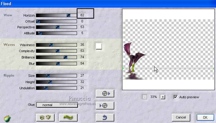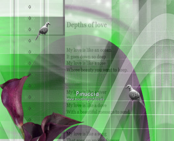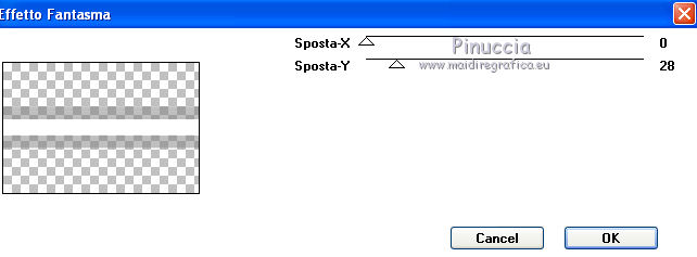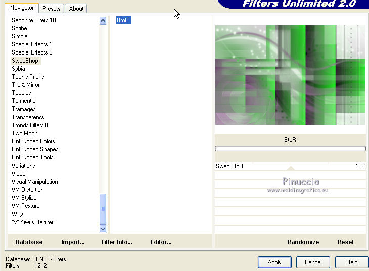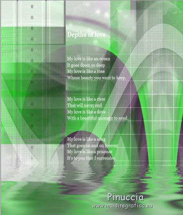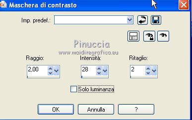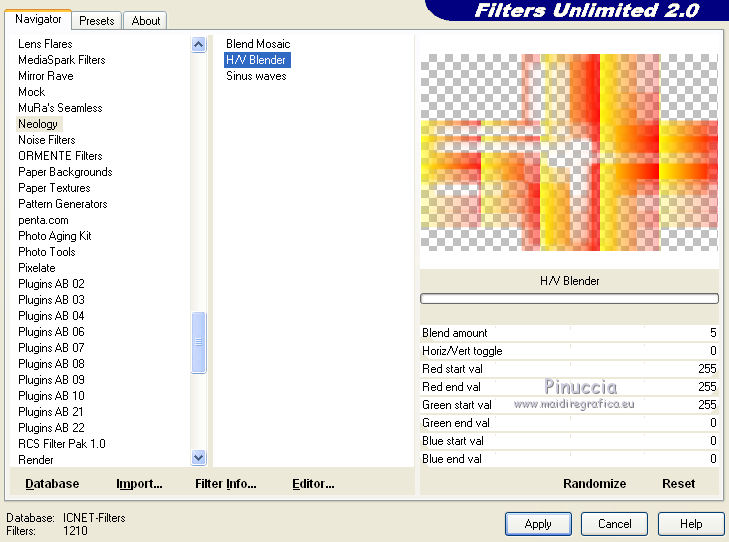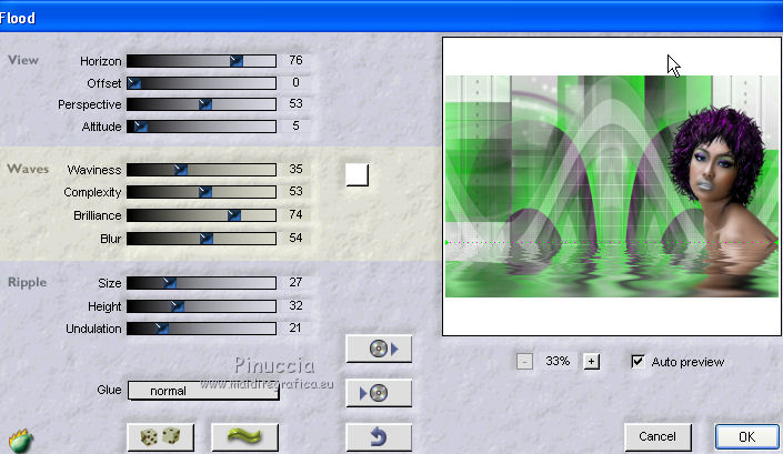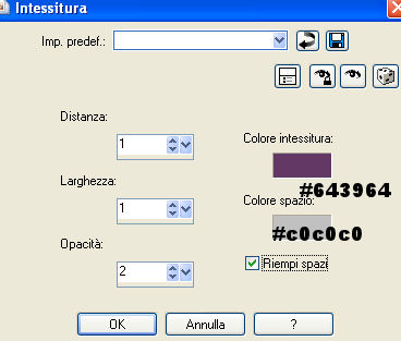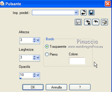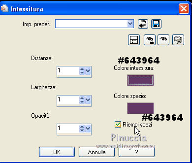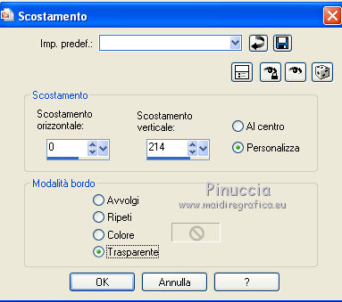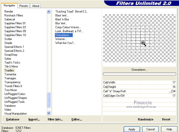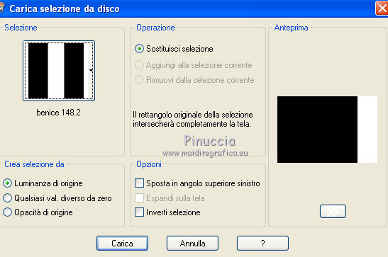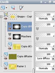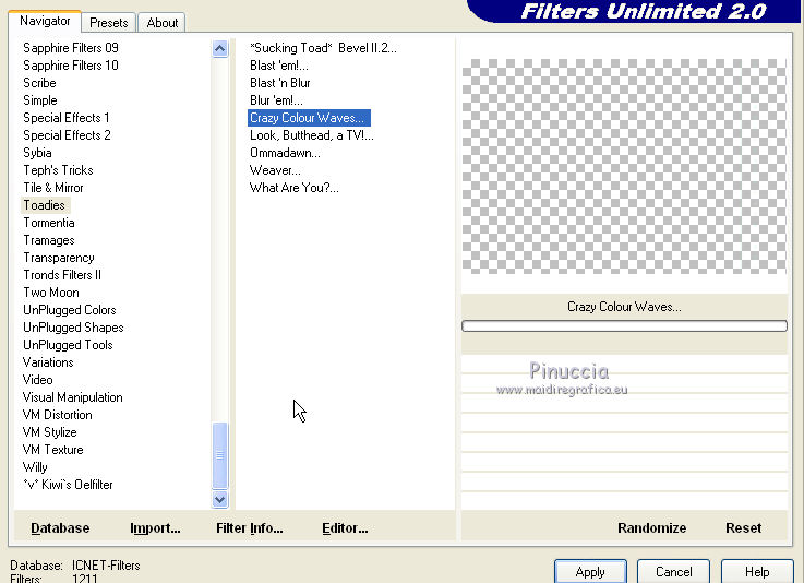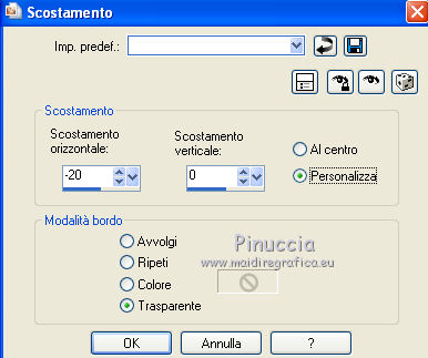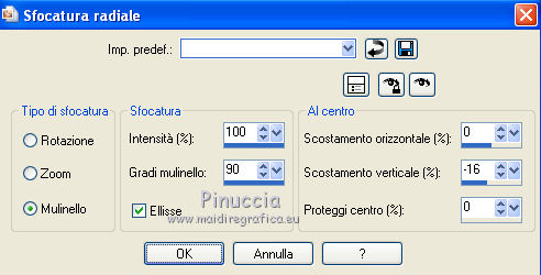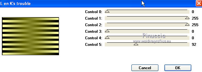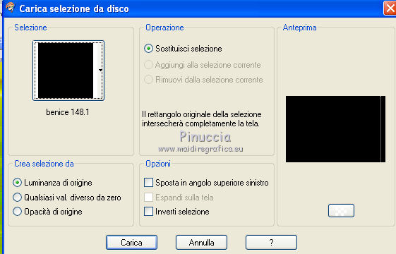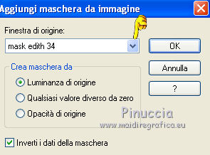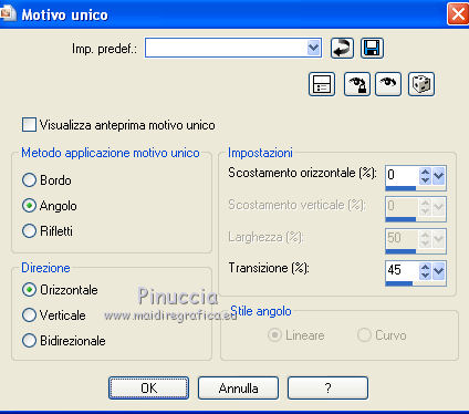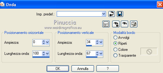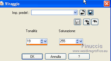 qui puoi trovare qualche risposta ai tuoi dubbi. Se l'argomento che ti interessa non è presente, ti prego di segnalarmelo. Occorrente: Materiale qui Il tube della donna è di Paulina Il tube dei fiori è di Annelies Filtri: consulta, se necessario, la mia sezione filtri qui Filters Unlimited 2.0 qui Italian Editors Effect qui L&K - L&K Trouble qui L&K - L&K Antonio qui Flaming Pear - Flood qui Muras Seamless qui Toadies qui SwapShop (da importare in Unlimited) qui Neology qui I filtri Italian Editors, Mura's Seamless, Toadies e Neology si possono usare da soli o importati in Unlimited. ![]() Metti il pennello nella cartella Pennelli. Attenzione, il pennello è composto da due files che non devono essere separati. Vedi gli appunti sui pennelli qui Metti le selezioni nella cartella Selezioni. Metti la maschera 20-20 nella cartella Maschere. Apri la maschera Edith_34 in PSP e minimizzala con il resto del materiale. Attenzione. Questo tutorial inizia con colori molto diversi rispetto al risultato finale. Al punto 9, puoi colorare a tuo piacimento. Per l'esempio è stato usato il filtro Swap Shop. Se vuoi, puoi usare altri filtri. Imposta il colore di primo piano con #241611, e il colore di sfondo con #ffffff. ![]() 1. Apri una nuova immagine trasparente 900 x 600 pixels. Selezione>Seleziona tutto. Apri l'immagine Benice_BG_L148 e vai a Modifica>Copia. Torna al tuo lavoro e vai a Modifica>Incolla nella selezione. Selezione>Deseleziona. 2. Livelli>Duplica - 2 volte. Chiudi il livello superiore e attiva il livello centrale. Effetti>Plugins>L&K - L&K Trouble. ![]() Effetti>Effetti di immagine>Motivo unico. ![]() Effetti>Effetti di bordo>Aumenta. Cambia la modalità di miscelatura di questo livello in Luce diffusa. 4. Apri e attiva il livello superiore. ![]() Effetti>Plugins>L&K - L&K Antonio. ![]() Livelli>Carica/Salva maschera>Carica maschera da disco. Cerca e carica la maschera 20-20. ![]() Livelli>Duplica (questo serve per schiarire il risultato) e la tua paletta apparirà così. ![]() Livelli>Unisci>Unisci gruppo. Effetti>Effetti di immagine>Scostamento. ![]() Livelli>Duplica. Immagine>Rifletti. Immagine>Capovolgi. Livelli>Unisci>Unisci giù. Effetti>Effetti di bordo>Aumenta di più. Cambia la modalità di miscelatura di questo livello in Colore. Livelli>Unisci>Unisci visibile. 4. Livelli>Nuovo livello raster. Selezione>Seleziona tutto. Apri l'immagine Abstract_Wallpapers_1 e vai a Modifica>Copia. Torna al tuo lavoro e vai a Modifica>Incolla nella selezione. Selezione>Deseleziona. Immagine>Rifletti. Regola>Sfocatura>Sfocatura gaussiana - raggio 3. ![]() Cambia la modalità di miscelatura di questo livello in Sovrapponi. Livelli>Duplica. Cambia la modalità di miscelatura di questo livello in Moltiplica, e abbassa l'opacità al 23%. Di nuovo Livelli>Duplica. ![]() Cambia la modalità di miscelatura di questo livello in Rafforza, e abbassa l'opacità al 75%. Livelli>Unisci>Unisci visibile. Dovresti avere questo. ![]() 5. Livelli>Nuovo livello raster. Riempi il livello con il colore di primo piano.Livelli>Nuovo livello maschera>Da immagine. Apri il menu sotto la finestra di origine e vedrai la lista dei files aperti. Seleziona la maschera mask_edith34, con i seguenti settaggi: ![]() Livelli>Unisci>Unisci gruppo. 6. Livelli>Duplica. Effetti>Plugins> Effetti>Plugins>Filters Unlimited 2.0 - MuRa's Seamless - Mirror Diagonal: ![]() Livelli>Unisci>Unisci giù. Effetti>Plugins>Filters Unlimited 2.0 - MuRa's Seamless - Shift: ![]() Effetti>Plugins>Filters Unlimited 2.0 - Neology - H/V Blender: ![]() Cambia la modalità di miscelatura di questo livello in Esclusione. Livelli>Unisci>Unisci giù. Dovresti avere questo. ![]() 7. Imposta il colore di primo piano con #000000. ![]() Livelli>Nuovo livello raster. Selezione>Carica/Salva selezione>Carica selezione da disco. Cerca e carica la selezione Benice 148.1. ![]() Usa la rotellina del mouse per ingrandire l'immagine e visualizzare bene lo spazio da riempire. Riempi la selezione con il colore di primo piano.Attenzione: per riempire clicca tre volte. Selezione>Deseleziona. 8. Livelli>Duplica. Effetti>Plugins>Plugins>Toadies - Crazy Colour Waves: ![]() Livelli>Unisci>Unisci giù. Livelli>Duplica. Effetti>Effetti di immagine>Scostamento. ![]() Livelli>Duplica. Effetti>Effetti di immagine>Scostamento. ![]() Livelli>Unisci>Unisci giù. Cambia la modalità di miscelatura di questo livello in Indebolisci. Livelli>Unisci>Unisci visibile. 9. Questo è il momento di dare il colore al lavoro. Effetti>Plugins>Filters Unlimited 2.0 - Swap Shop - BtoR: ![]() Risultato. ![]() 10. Livelli>Duplica. Chiudi questo livello e attiva il livello inferiore. Selezione>Carica/Salva selezione>Carica selezione da disco. Cerca e carica la selezione Benice 148.2. ![]() Selezione>Innalza selezione a livello. Selezione>Deseleziona. Immagine>Rifletti. Immagine>Capovolgi. Livelli>Unisci>Unisci giù. 11. Apri e attiva il livello superiore. Effetti>Effetti di distorsione>Coordinate polari. ![]() Selezione>Carica/Salva selezione>Carica selezione da disco. Cerca e carica la selezione Benice 148.3. ![]() Premi sulla tastiera il tasto CANC. Selezione>Deseleziona. Livelli>Duplica (è rimasto metà del livello). Immagine>Rifletti. Livelli>Unisci>Unisci giù. 12. Livelli>Carica/Salva maschera>Carica maschera da disco. Carica nuovamente la maschera 20-20. ![]() Livelli>Duplica. Livelli>Unisci>Unisci gruppo. 13. Selezione>Seleziona tutto. Selezione>Mobile. Selezione>Immobilizza. Livelli>Nuovo livello raster. Riempi la selezione con il colore di sfondo.Regola>Sfocatura>Sfocatura gaussiana - raggio 100. ![]() Effetti>Plugins>Filters Unlimited 2.0 - Toadies - Ommadawn: ![]() Selezione>Deseleziona. Immagine>Immagine negativa. se stai usando PSP 9: Regola>Bilanciamento colore>Immagine negativa Effetti>Effetti di bordo>Aumenta. Cambia la modalità di miscelatura di questo livello in Indebolisci, e abbassa l'opacità al 75%. Dovresti avere questo. ![]() 14. Livelli>Nuovo livello raster. Selezione>Carica/S
