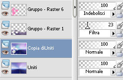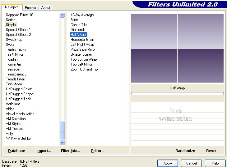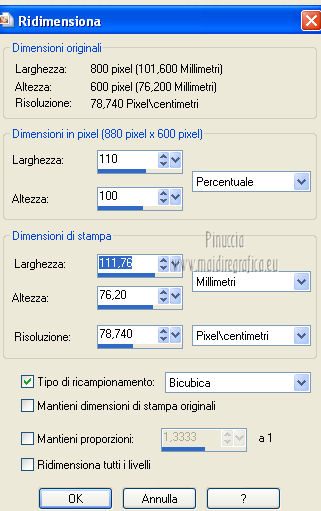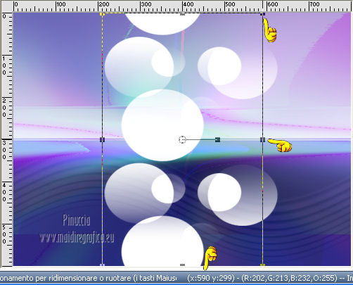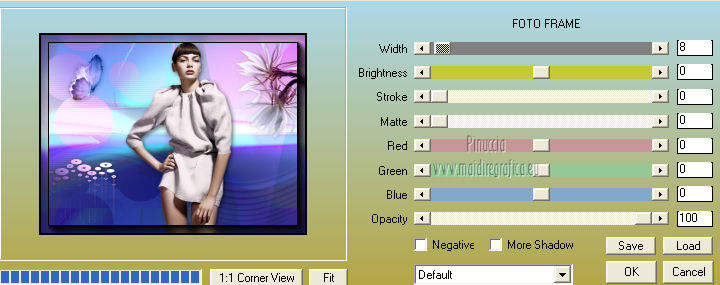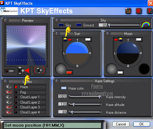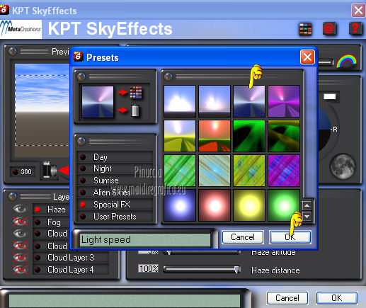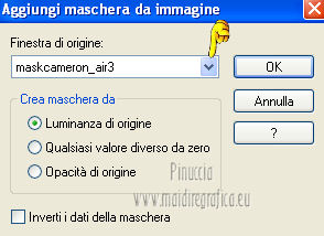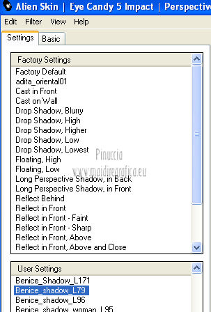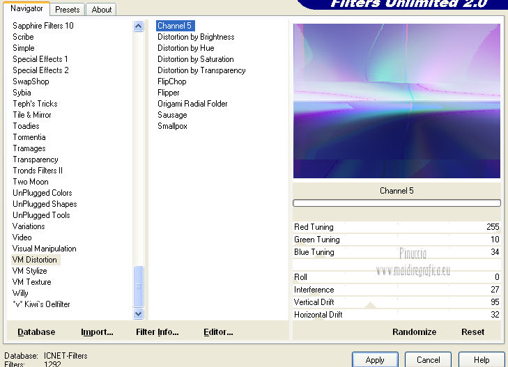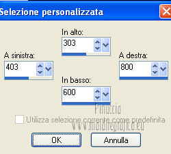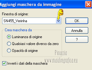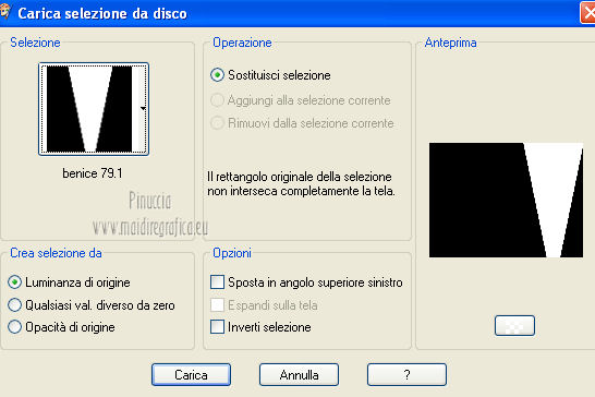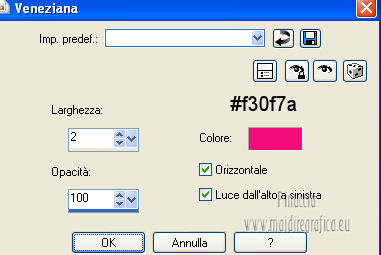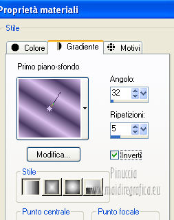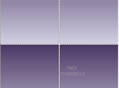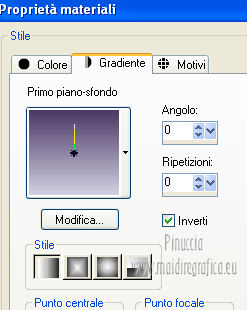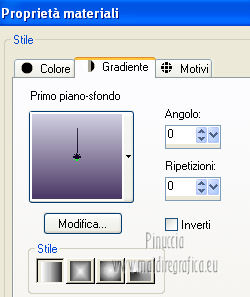qui puoi trovare qualche risposta ai tuoi dubbi. Se l'argomento che ti interessa non è presente, ti prego di segnalarmelo. Occorrente: Materiale qui Filtri: consulta, se necessario, la mia sezione filtri qui Filters Unlimited 2.0 qui Simple qui KPT 6 qui VM Distortion (da importare in Unlimited) qui AAA Frames qui I filtri Simple si possono usare da soli, o importati in Filters Unlimited. Come importare un filtro in Unlimited qui ![]() Metti il preset nella cartella del filtro Alien Skin Eye Candy 5 Impact>Settings>Shadow. Cliccando sul file una o due volte (a seconda delle tue impostazioni), automaticamente il preset si installerà nella cartella corretta. Metti il pennello nella cartella Pennelli. Attenzione, il pennello è composto da due files che non devono essere separati. Vedi gli appunti sui pennelli qui Metti la selezione nella cartella Selezioni. Apri le maschere in PSP e minimizzale con il resto del materiale. Imposta il colore di primo piano con il colore bianco #ffffff. 1. Apri una nuova immagine trasparente 800 x 600 pixels, e riempila con il colore di primo piano.Imosta il colore di primo piano con #4a3864, e il colore di sfondo con #d1cfe1. Passa il colore di primo piano a Gradiente, stile Lineare. ![]() Selezione>Seleziona tutto. Selezione>Modifica>Contrai - 3 pixels. Livelli>Nuovo livello raster. Riempi la selezione con il gradiente.Selezione>Deseleziona. Effetti>Plugins>Filters Unlimited 2.0 - Simple - Half Wrap. ![]() Attiva lo strumento Bacchetta magica ![]() e clicca sulla parte bianca per selezionarla. ![]() Premi sulla tastiera il tasto CANC. 2. Cambia i settaggi del Gradiente, togliendo la selezione a Inverti. ![]() Livelli>Nuovo livello raster. Riempi il livello con il gradiente.Livelli>Disponi>Sposta giù. Livelli>Unisci>Unisci visibile. Regola>Messa a fuoco>Accentua messa a fuoco. 3. Livelli>Duplica. Effetti>Plugins>KTP 6 - Sky Effects. Clicca sul bottone in alto a destra (1), e nella nuova finestra, seleziona Special FX. ![]() clicca sulla terza opzione in alto, e ok. ![]() Sulla finestra principale, seleziona Haze e sotto Sun, clicca sul pallino accanto alla freccia, per volgerla a sinistra. ![]() Ok per applicare il filtro. Cambia la modalità di miscelatura di questo livello in Luce netta. Livelli>Unisci>Unisci visibile. Attiva lo strumento Selezione ,clicca sull'icona Selezione personalizzata ![]() e imposta i seguenti settaggi: ![]() Regola>Sfocatura>Sfocatura gaussiana - raggio 15. ![]() Selezione>Deseleziona. 4. Livelli>Duplica. Effetti>Plugins>Filters Unlimited 2.0 - VM Distortion - Channel 5. ![]() Immagine>Ridimensiona, 110x100%, tutti i livelli e mantieni proporzioni non selezionato. ![]() Effetti>Effetti di immagine>Scostamento. ![]() 5. Imposta il colore di primo piano con #4f3e69. ![]() Livelli>Nuovo livello raster. Riempi il livello con il colore di primo piano.Livelli>Nuovo livello maschera>Da immagine. Apri il menu sotto la finestra di origine e vedrai la lista dei files aperti. Seleziona la maschera SN455_Verinha, con i seguenti settaggi: ![]() Livelli>Unisci>Unisci gruppo. Cambia la modalità di miscelatura di questo livello in Filtra, e abbassa l'opacità al 23%. 6. Imposta il colore di primo piano con il colore bianco #ffffff. Livelli>Nuovo livello raster. Riempi il livello con il colore di primo piano.Livelli>Nuovo livello maschera>Da immagine. Apri il menu sotto la finestra di origine e seleziona la maschera Maskcameron_air3, con i seguenti settaggi: ![]() Livelli>Unisci>Unisci gruppo. Se non visualizzi i Righelli, vai a Visualizza>Righelli. Premi il tasto D per attivare lo strumento Deformazione ![]() e spingi il nodo centrale a destra all'interno fino a 590 pixels. ![]() Premi sulla tastiera il tasto M per deselezionare lo strumento. Sposta l'immagine a sinistra,a 50 pixels dal bordo. ![]() Effetti>Effetti di trama>Veneziana - colore #f30f7a. ![]() Cambia la modalità di miscelatura di questo livello in Indebolisci, e abbassa l'opacità al 27%. Selezione>Seleziona tutto. Selezione>Mobile. Selezione>Immobilizza. Attiva il livello sottostante, e clicca 4 o 5 volte sulla tastiera il tasto CANC. Attiva il livello immediatamente sotto. Premi sulla tastiera il tasto CANC. Selezione>Deseleziona. Questa dovrebbe essere la tua paletta dei livelli. ![]() Attiva nuovamente il livello superiore. Effetti>Plugins>Alien skin Eye Candy 5 Impact - Perspective Shadow. Seleziona il preset Benice_Shadow-L79 e ok. ![]() 7. Livelli>Nuovo livello raster. Imposta il colore di primo piano con #4a3964. ![]() Livelli>Nuovo livello raster. Selezione>Carica/Salva selezione>Carica selezione da disco. Cerca e carica la selezione Benice 79.1. ![]() Riempi la selezione con il colore di primo piano.Selezione>Deseleziona. Cambia la modalità di miscelatura di questo livello in Indebolisci, e abbassa l'opacità al 28%. Effetti>Effetti di trama>Veneziana, con i settaggi precedenti. ![]() 8. Mantieni il colore di primo piano e cambia il colore di sfondo con #dbc1ed. ![]() Passa il colore di primo piano a Gradiente, stile Lineare. ![]() Livelli>Nuovo livello raster. Attiva lo strumento Pennello ![]() cerca e seleziona il pennello bloemen 003, con i seguenti settaggi. ![]() Applica il pennello come nell'esempio, cliccando con il tasto sinistro del mouse per usare il colore di primo piano. Livelli>Duplica. Cambia la modalità di miscelatura di questo livello in Indebolisci, e abbassa l'opacità al 72%. Livelli>Unisci>Unisci giù. Effetti>Effetti 3D>Sfalsa ombra. ![]() 9. Apri il tube Femme 719 e vai a Modifica>Copia. Torna al tuo lavoro e vai a Modifica>Incolla come nuovo livello. Spostalo in basso - vedi il mio esempio.Effetti>Effetti 3D>Sfalsa ombra. ![]() 10. Apri il tube 2YuChengHong_Franz 1. Attiva lo strumento Selezione , rettangolo,e seleziona la farfalla a destra. Modifica>Copia. Torna al tuo lavoro e vai a Modifica>Incolla come nuovo livello. Immagine>Ridimensiona, al 70%, tutti i livelli non selezionato, e non dimenticare di selezionare Mantieni proporzioni. Spost