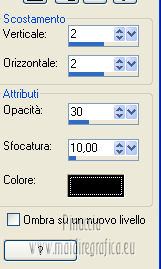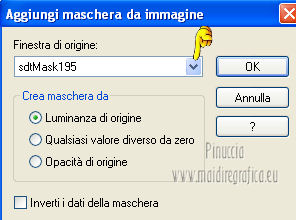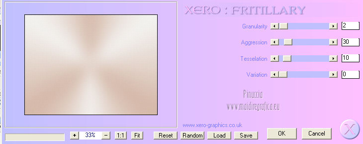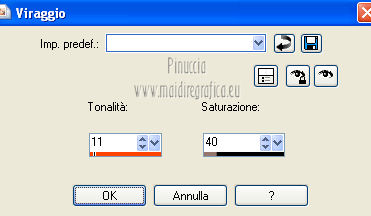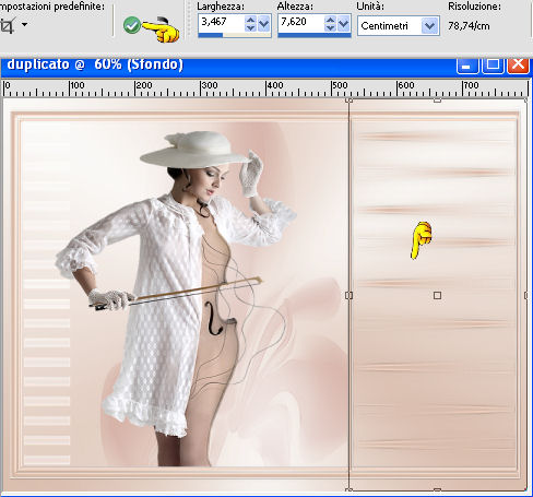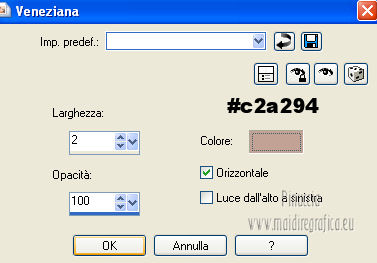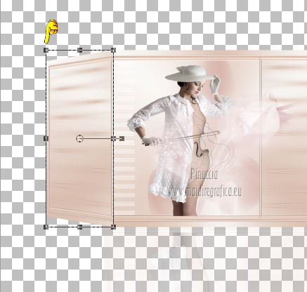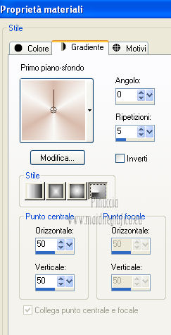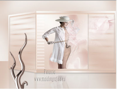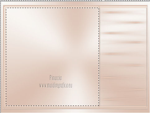 qui puoi trovare qualche risposta ai tuoi dubbi. Se l'argomento che ti interessa non è presente, ti prego di segnalarmelo. Occorrente: Materiale qui Filtri: consulta, se necessario, la mia sezione filtri qui Xero - Fritillary qui Teph's Tricks - Offset Wrap qui ![]() Metti la selezione nella cartella Selezioni. Apri la maschera Sdt Mask 195 in PSP e minimizzala con il resto del materiale. Imposta il colore di primo piano con #d8bbab, e il colore di sfondo con #f8f8f6. Passa il colore di primo piano a Gradiente. ![]() 1. Apri una nuova immagine trasparente 800 x 600 pixels, e riempila con il gradiente.Regola>Sfocatura>Sfocatura gaussiana - raggio 40. ![]() 2. Livelli>Nuovo livello raster. Riempi il livello con il colore di primo piano.Livelli>Nuovo livello maschera>Da immagine. Apri il menu sotto la finestra di origine e vedrai la lista dei files aperti. Seleziona la maschera Sdt Mask 195, con i seguenti settaggi: ![]() Livelli>Unisci>Unisci gruppo. Effetti>Effetti di bordo>Aumenta. 3. Livelli>Nuovo livello raster. Attiva lo strumento Selezione , rettangolo,e seleziona il riquadro centrale. ![]() Apri l'immagine Abstract_389 e vai a Modifica>Copia. Torna al tuo lavoro e vai a Modifica>Incolla nella selezione. Regola>Tonalità e saturazione>Tonalità/Saturazione>Luminosità. ![]() Immagine>Rifletti. Selezione>Deseleziona. Effetti>Effetti di bordo>Aumenta di più. Abbassa l'opacità di questo livelo al 24%. 4. Imposta il colore di primo piano con #c2a494. Livelli>Nuovo livello raster. Selezione>Carica/Salva selezione>Carica selezione da disco. Cerca e carica la selezione benice 27.1. ![]() Riempi la selezione con il colore di primo piano.Selezione>Deseleziona. Effetti>Effetti di trama>Veneziana. ![]() Livelli>Duplica - 3 volte. Livelli>Unisci>Unisci giù - 3 volte. Cambia la modalità di miscelatura di questo livello in Filtra. Effetti>Effetti di bordo>Aumenta di più. 5. Apri il tube Calguisfuturiste1829 e vai a Modifica>Copia. Torna al tuo lavoro e vai a Modifica>Incolla come nuovo livello. Immagine>Ridimensiona, all'80%, tutti i livelli non selezionato. Sposta il tube nella sezione più grande dell'immagine.![]() 6. Apri il tube Rose_perles e vai a Modifica>Copia. Torna al tuo lavoro e vai a Modifica>Incolla come nuovo livello. Sposta il tube nell'angolo in alto a destra.Regola>Tonalità e saturazione>Tonalità/Saturazione>Luminosità. ![]() 7. Finestra>Duplica (o, sulla tastiera maiuscola+D) per fare una copia. Rimani sulla copia. Elimina il livello del fiore. Livelli>Unisci>Unisci tutto. Attiva lo strumento Ritaglio ![]() e ritaglia la parte a destra, come nell'esempio. Clicca sul segno di spunta per applicare il ritaglio. ![]() Immagine>Rifletti. Immagine>Ridimensiona, al 70%, tutti i livelli selezionato. Minimizza l'immagine che ti servirà più tardi. 8. Imposta nuovamente il colore di primo piano con #d8bbab, e passa il colore di primo piano al Gradiente iniziale. ![]() Apri una nuova immagine trasparente 800 x 600 pixels, e riempila con il gradiente.Regola>Sfocatura>Sfocatura gaussiana - raggio 40. ![]() 9. Attiva il lavoro iniziale che hai lasciato in attesa al punto 7. ![]() Livelli>Unisci>Unisci tutto. Immagine>Ridimensiona, al 70%, tutti i livelli non selezionato. Modifica>Copia. Torna alla nuova immagine 800 x 600 e vai a Modifica>Incolla come nuovo livello. Spostala in alto a destra.![]() (più tardi, se necessario, potrai posizionarla meglio). Livelli>Duplica. Immagine>Capovolgi. Sposta il duplicato in basso,contro l'immagine originale. Abbassa l'opacità di questo livello al 18%. ![]() Livelli>Unisci>Unisci giù. 10. Attiva l'immagine ritagliata e vai a Modifica>Copia. Torna al tuo lavoro e vai a Modifica>Incolla come nuovo livello. Sposta l'immagine a sinistra,contro l'immagine più grande. ![]() 11. Chiudi il livello inferiore e rimani posizionato sul livello superiore. Premi il tasto K per attivare lo strumento Puntatore ![]() se stai usando PSP 9 il tasto D (valido per tutte le versioni) per attivare lo strumento Deformazione ![]() In modalità Prospettiva, spingi il nodo in alto a sinistra (o a destra), (il nodo opposto si sposterà simmetricamente) ![]() Premi il tasto M per deselezionare lo strumento. 12. Riapri il livello inferiore. Attiva il livello dell'immagine - Raster 2. Se necessario, seleziona le piccole partieventualmente rimaste visibili negli angoli. Premi sulla tastiera il tasto CANC. Selezione>Deseleziona. 13. Attiva il livello superiore. Livelli>Duplica. Immagine>Capovolgi. Posiziona l'immagine in basso,contro l'originale. Di nuovo premi il tasto K/D per attivare lo strumento Puntatore /Deformazione ![]() e spingi il nodo esterno in alto, come nell'esempio. ![]() Premi il tasto M per deselezionare lo strumento. Abbassa l'opacità di questo livello al 18%. Chiudi il livello di sfondo e rimani posizionato sul livello superiore. Livelli>Unisci>Unisci visibile. Effetti>Effetti 3D>Sfalsa ombra, con il colore nero. ![]() Adesso, se necessario, puoi posizionare meglio l'immagine.14. Riapri e attiva il livello inferiore. Effetti>Plugins>Xero - Fritillary ![]() Effetti>Plugins>Teph's Tricks - Offset Wrap. ![]() 15. Attiva nuovamente il livello superiore. Apri il tube Chroom 02 e vai a Modifica>Copia. Torna al tuo lavoro e vai a Modifica>Incolla come nuovo livello. Immagine>Ridimensiona, all'85%, tutti i livelli non selezionato. Regola>Tonalità e saturazione>Viraggio. ![]() Immagine>Ruota per gradi - 90 gradi a sinistra. ![]() Sposta il tube in basso a sinistra.![]() Effetti>Effetti 3D>Sfalsa ombra, con il colore nero. ![]() 16. Apri il tube KaraX-traParfume2-1 e vai a Modifica>Copia. Torna al tuo lavoro e vai a Modifica>Incolla come nuovo livello. Immagine>Ridimensiona, al 30%, tutti i livelli non selezionato. Posiziona il tube a destra,come nel mio esempio. Effetti>Effetti 3D>Sfalsa ombra, con il colore nero. ![]() 17. Apri il tube Wordartessencelove e vai a Modifica>Copia. Torna al tuo lavoro e vai a Modifica>Incolla come nuovo livello. Sposta il testo in a