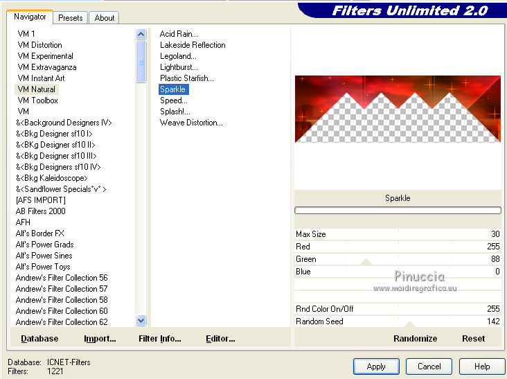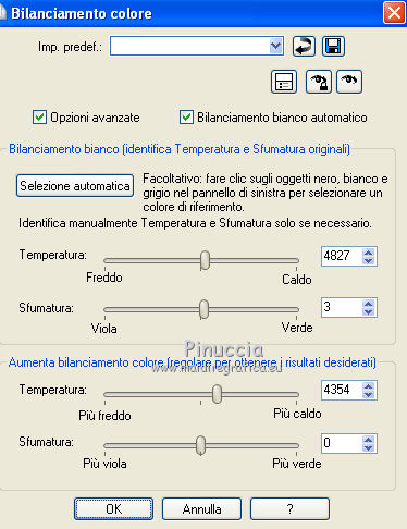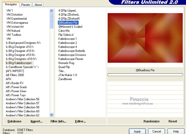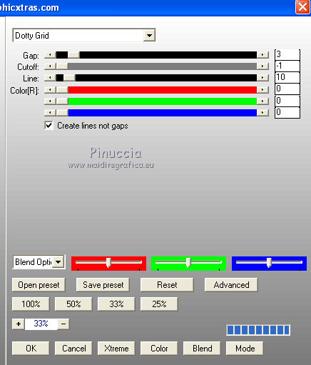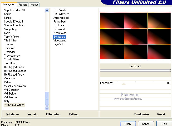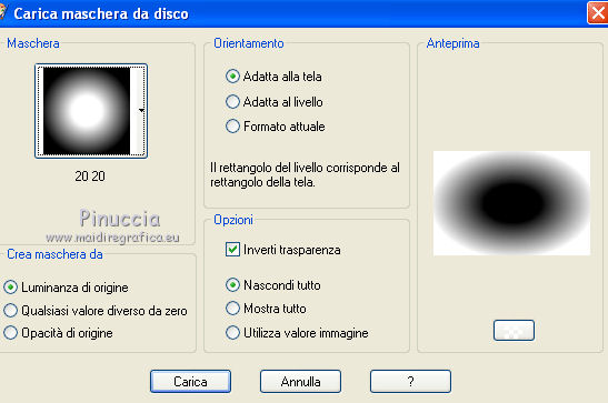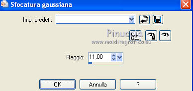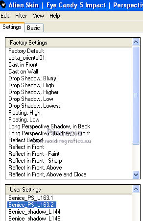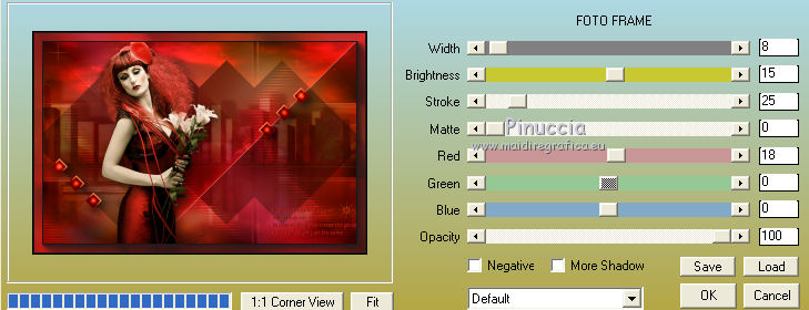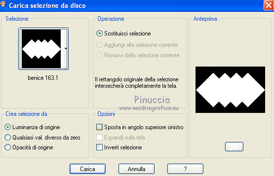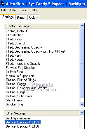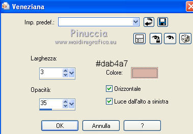 qui puoi trovare qualche risposta ai tuoi dubbi. Se l'argomento che ti interessa non è presente, ti prego di segnalarmelo. Occorrente: Materiale qui Il tube della donna è di Benice e non può essere usato per altri tutorial. Filtri: consulta, se necessario, la mia sezione filtri qui Filters Unlimited 2.0 qui &<Bkg Kaleidoscope> (da importare in Unlimited) qui Alien Skin Eye Candy 5 Impact qui °v°Kiwi's Oelfilter qui Mura's Meister - Cloud qui Tramages qui VM Natural qui AP Lines - Lines SilverLining qui I filtri Kiwi, Tramages e VM Natural si possono usare da soli o importati in Filters Unlimited ![]() Metti i preset (cartella VoorinstellingenEC) nella cartella del filtro Alien Skin Eye Candy 5 Impact>Settings>Backlight/Shadow. Cliccando sul file automaticamente il preset sarà installato nella cartella corretta. Metti la maschera 20-20 nella cartella Maschere. Metti le selezioni nella cartella Selezioni. Imposta il colore di primo piano con #69001c, e il colore di sfondo con #8b5f42. ![]() Passa il colore di primo piano a Gradiente, stile Lineare. ![]() 1. Apri l'immagine Benice_BG_L163. Finestra>Duplica (o, sulla tastiera, maiuscola+D) per fare una copia. Chiudi l'originale. La copia sarà la base del tuo lavoro. 2. Livelli>Duplica. Immagine>Rifletti. Immagine>Capovolgi. Cambia la modalità di miscelatura di questo livello in Luminanza. 3. Livelli>Nuovo livello raster. Riempi il livello con il gradiente.Effetti>Plugins> Tramages - Tow The Line. ![]() Regola>Sfocatura>Sfocatura gaussiana - raggio 11. ![]() Livelli>Duplica. Cambia la modalità di miscelatura di questo livello in Luce diffusa. Livelli>Unisci>Unisci giù. 4. Sullo stesso livello: Immagine>Ridimensiona, al 110%, tutti i livelli non selezionato. Regola>Morbidezza>Fuoco diffuso. ![]() Livelli>Unisci>Unisci visibile. 5. Dovresti avere questo: ![]() 6. Apri l'immagine Plaatje_Benice_L163 e vai a Modifica>Copia. Torna al tuo lavoro e vai a Modifica>Incolla come nuovo livello. Cambia la modalità di miscelatura di questo livello in Luce diffusa. Livelli>Unisci>Unisci giù. 7. Livelli>Duplica. Effetti>Plugins>Filters Unlimited 2.0 &<Bkg Kaleidoscope> - @BlueBerry Pie. ![]() Effetti>Effetti di bordo>Aumenta. Livelli>Duplica. Immagine>Rifletti. Abbassa l'opacità di questo livello al 50%. Livelli>Unisci>Unisci giù. Cambia la modalità di miscelatura di questo livello in Luminanza (esistente). Livelli>Unisci>Unisci visibile. 8. Dovresti avere questo: ![]() 9. Livelli>Duplica. Effetti>Plugins>Filters Unlimited 2.0 - °v° Kiwi's Oelfilter - Setzboard. ![]() Livelli>Duplica. Immagine>Rifletti. Immagine>Capovolgi. Abbassa l'opacità di questo livello al 50%. Livelli>Unisci>Unisci giù. 10. Sullo stesso livello. Livelli>Carica/Salva maschera>Carica maschera da disco. Cerca e carica la maschera 20-20 Inverti trasparenza selezionato. ![]() Livelli>Duplica - 2 volte (questo serve per attenuare i colori). Questa dovrebbe essere la tua paletta dei livelli. ![]() Livelli>Unisci>Unisci gruppo. Cambia la modalità di miscelatura di questo livello in Luminanza (esistente) e abbassa l'opacità al 65%. 11. Livelli>Duplica. Effetti>Effetti di trama>Veneziana, con il colore #dab4a7. ![]() Effetti>Effetti di bordo>Aumenta. Cambia la modalità di miscelatura di questo livello in Luce diffusa, e abbassa l'opacità al 50%. Livelli>Unisci>Unisci visibile. 12. Dovresti avere questo: ![]() 13. Apri il tube City_Benice_L163 e vai a Modifica>Copia. Torna al tuo lavoro e vai a Modifica>Incolla come nuovo livello. Il tube è già correttamente posizionato. Lascialo come sta. Effetti>Effetti 3D>Sfalsa ombra. ![]() Cambia la modalità di miscelatura di questo livello in Luce diffusa. 14. Imposta il colore di primo piano con #000000. 15. Livelli>Nuovo livello raster. Selezione>Carica/Salva selezione>Carica selezione da disco. Cerca e carica la selezione Benice 163.1. ![]() Riempi la selezione con il colore di primo piano.Selezione>Deseleziona. Abbassa l'opacità di questo livello al 30%. Livelli>Unisci>Unisci visibile. 16. Selezione>Carica/Salva selezione>Carica selezione da disco. Cerca e carica la selezione Benice 163.2. ![]() Selezione>Innalza selezione a livello. Mantieni selezionato. Effetti>Plugins> Mura's Meister - Cloud, seleziona "Nebula" e ok. Ricorda che il risultato di questo filtro è sempre casuale, per questo l'aspetto delle nuvole potrebbe essere diverso dal mio. ![]() Selezione>Deseleziona. Cambia la modalità di miscelatura di questo livello in Indebolisci, e abbassa l'opacità al 50%. Livelli>Unisci>Unisci visibile. 17. Dovresti avere questo. ![]() 18. Imposta il colore di sfondo con #cba595. ![]() 19. Livelli>Nuovo livello raster. Selezione>Carica/Salva selezione>Carica selezione da disco. Cerca e carica la selezione Benice 163.3. ![]() Riempi la selezione con il colore di sfondo.Selezione>Deseleziona. 20. Livelli>Duplica. Effetti>Plugins>Alien Skin Eye Candy 5 Impact - Backlight. Seleziona il preset Benice_Backlight_L163 e ok. ![]() Effetti>Plugins>AP Lines - SilverLining. ![]() Cambia la modalità di miscelatura di questo livello in Indebolisci, e abbassa l'opacità all'85%. Livelli>Disponi>Sposta giù. 21. Attiva il livello superiore. Livelli>Nuovo livello raster. Selezione>Carica/Salva selezione>Carica selezione da disco. Cerca e carica la selezione Benice 163.4. ![]() Ingrandisci l'immagine per visualizzare meglio la selezione, e riempi la selezione con il colore di sfondo.Clicca tre volte per riempire. Selezione>Deseleziona. Cambia la modalità di miscelatura di questo livello in Indebolisci. Livelli>Unisci>Unisci visibile. 22. Selezione>Carica/Salva selezione>Carica selezione da disco. Carica nuovamente la selezione Benice 163.2. ![]() Selezione>Innalza selezione a livello. Effetti>Plugins>Filters Unlimited 2.0 - VM Natural - Sparkle. ![]() Selezione>Modifica selezione. L'area della selezione diventerà rossa. Effetti>Effetti di immagine>Scostamento. ![]() Selezione>Modifica Selezione, e la selezione tornerà normale. Selezione>Inve