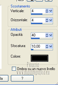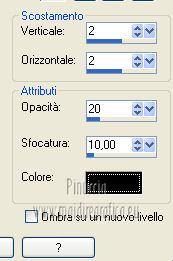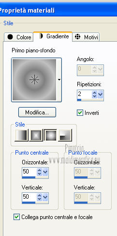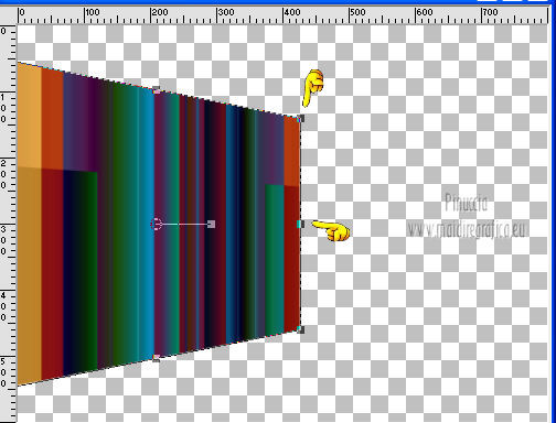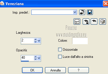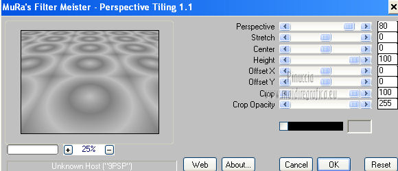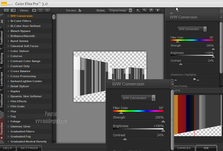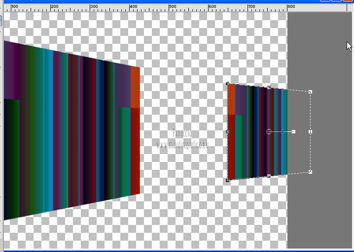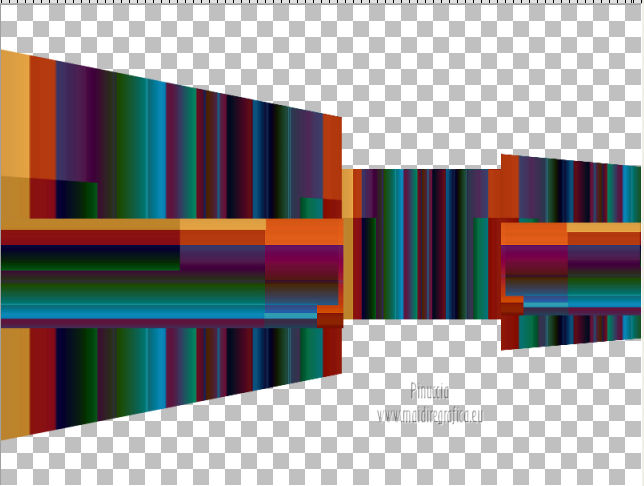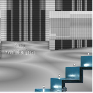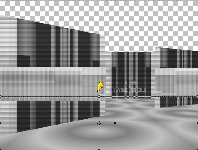 qui puoi trovare qualche risposta ai tuoi dubbi. Se l'argomento che ti interessa non è presente, ti prego di segnalarmelo. Occorrente: Materiale qui Filtri: consulta, se necessario, la mia sezione filtri qui Mura's Meister - Perspective Tiling qui Nik Software - Color Efex Pro qui ![]() 1. Apri l'immagine Win_C_(449). Attiva lo strumento Selezione , rettangolo,e traccia una selezione come nell'esempio. ![]() Modifica>Copia, e minimizza l'immagine che userai ancora. Apri una nuova immagine trasparente 800 x 600 pixels. Livelli>Nuovo livello raster. Selezione>Seleziona tutto. Modifica>Incolla nella selezione. Attiva lo strumento Puntatore ![]() Deformazione se stai usando PSP 9,sposta l'immagine a sinistra, e - se necessario - e spingi il nodo centrale a destra verso l'interno ![]() Controlla che in alto e in basso ci sia la stessa distanza dai bordi. Livelli>Duplica. Immagine>Rifletti. Chiudi questo livello. 2. Attiva nuovamente il livello Raster 2. Strumento Puntatore /Deformazione ![]() in modalità Prospettiva, spingi uno dei due nodi a destra (il nodo opposto si sposterà simmetricamente) di circa cinque quadretti verso l'interno. Se necessario, in modalità Scala, usa il nodo centrale a destra per correggere la larghezza della striscia. ![]() Premi il tasto M per deselezionare lo strumento. 3. Apri e attiva il livello superiore. Immagine>Ridimensiona, al 50%, tutti i livelli non selezionato. Sposta l'immagine a destra,Usa lo strumento Puntatore /Deformazione ![]() in modalità Prospettiva per abbassare il lato a destra, e in modalità Scala per ridurre la larghezza e posizionarla correttamente. ![]() Premi il tasto M per deselezionare lo strumento. 4. Attiva nuovamente l'immagine Win_C_(449), che ha ancora la selezione attiva. Modifica>Copia e minimizzala. Torna al tuo lavoro e vai a Modifica>Incolla come nuovo livello. Immagine>Ridimensiona, al 40%, tutti i livelli non selezionato. Sposta l'immagine al centro![]() Livelli>Disponi>Sposta giù - 2 volte. 5. Attiva ancora l'immagine Win_C_(449). Selezione>Deseleziona. Attiva lo strumento Selezione , rettangolo,e traccia una selezione come nell'esempio. ![]() Modifica>Copia. Torna al tuo lavoro e vai a Modifica>Incolla come nuovo livello. Immagine>Ridimensiona, al 70%, tutti i livelli non selezionato. Immagine>Ruota per gradi - 90 gradi a destra. ![]() Sposta la selezione a sinistra, come nell'esempio.![]() Livelli>Duplica. Immagine>Rifletti. Immagine>Ridimensiona, all'85%, tutti i livelli non selezionato. Sposta l'immagine a destra, come nell'esempio.![]() Chiudi i due livelli superiori e attiva il terzo livello dall'alto. Livelli>Unisci>Unisci giù. Effetti>Plugins>Nik Software - Color Efex Pro - B/W Conversion. ![]() Effetti>Effetti di trama>Veneziana - colore nero. ![]() 6. Apri i due livelli chiusi e attiva il livello superiore. Livelli>Unisci>Unisci giù. Effetti>Plugins>Nik Software - Color Efex Pro - B/W Conversion. ![]() Effetti>Effetti di trama>Veneziana - colore bianco. ![]() Chiudi il livello Raster 1 e rimani posizionato sul livello superiore. Livelli>Unisci>Unisci visibile. Effetti>Effetti 3D>Sfalsa ombra, con il colore nero. ![]() Ripeti l'Effetto Sfalsa ombra, cambiando verticale e orizzontale con -4. 7. Imposta il colore di primo piano con #808080, e il colore di sfondo con #c0c0c0. Passa il colore di primo piano a Gradiente. ![]() Attiva il livello Raster 1 e riempilo con il gradiente.Effetti>Plugins>Mura's Meister - Perspective Tiling. ![]() Strumento Puntatore /Deformazione ![]() in modalità Scala, spingi il nodo centrale in alto verso l'interno, come nell'esempio. ![]() Livelli>Nuovo livello raster. Riempi con il gradiente.Livelli>Disponi>Porta sotto. 8. Apri il tube Friem-lady56 - 16 sept 2009 e vai a Modifica>Copia. Torna al tuo lavoro e vai a Modifica>Incolla come nuovo livello. Sposta il tube a sinistra.Livelli>Duplica. Attiva il livello sottostante dell'originale. Effetti>Effetti di distorsione>Vento - da destra, intensità 50. ![]() Ripeti l'Effetto Vento, questa volta da sinistra. ![]() Regola>Sfocatura>Sfocatura gaussiana - raggio 10. ![]() Attiva il livello superiore. Regola>Messa a fuoco>Metti a fuoco. 9. Apri il tube Ninaisu_Stairs_ 28-10-2007 e vai a Modifica>Copia. Torna al tuo lavoro e vai a Modifica>Incolla come nuovo livello. Immagine>Ridimensiona, al 70%, tutti i livelli non selezionato. Sposta il tube a destra.![]() Effetti>Effetti 3D>Sfalsa ombra. ![]() Cambia la modalità di miscelatura di questo livello in Luminanza (esistente), e abbassa l'opacità all'80%. 10. Apri il tube LexHa_ModernArt_September2009 e vai a Modifica>Copia. Torna al tuo lavoro e vai a Modifica>Incolla come nuovo livello. Immagine>Ridimensiona, al 35%, tutti i livelli non selezionato. Sposta il tube sulla scala.![]() Effetti>Effetti 3D>Sfalsa ombra, con i settaggi precedenti. Cambia la modalità di miscelatura di questo livello in Luminanza (esistente). 11. Apri il tube PHtube_clock376018 e vai a Modifica>Copia. Torna al tuo lavoro e vai a Modifica>Incolla come nuovo livello. Immagine>Ridimensiona, al 50%, tutti i livelli non selezionato. Sposta il tube in alto.Cambia la modalità di miscelatura di questo livello in Luminanza (esistente). Effetti>Effetti 3D>Sfalsa ombra. ![]() 12. Immagine>Aggiungi bordatura, 2 pixels, simmetriche, con #202020. Immagine>Aggiungi bordatura, 2 pixels, simmetriche, con #c0c0c0. Immagine>Aggiungi bordatura, 2 pixels, simmetriche, con #202020. Aggiungi il tuo nome e/o il tuo watermark e salva in formato jpg. ![]() Se hai problemi o dubbi, o trovi un link non funzionante, o anche soltanto per un saluto, scrivimi 4 Novembre 2012 |