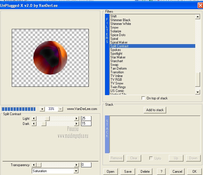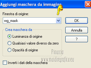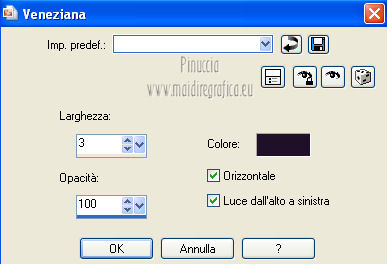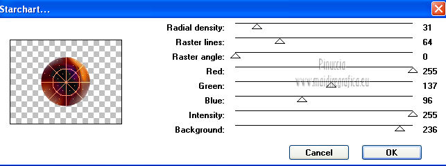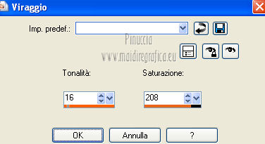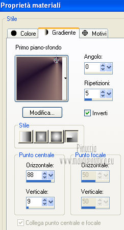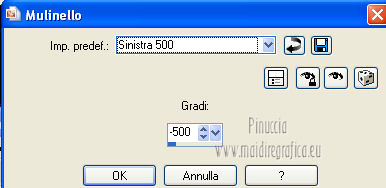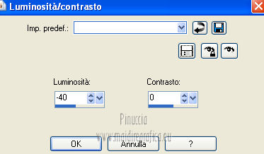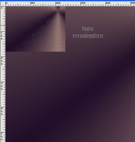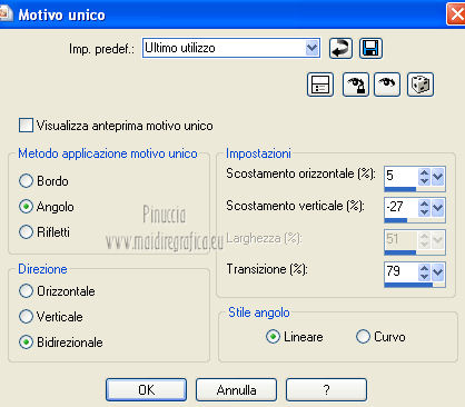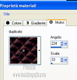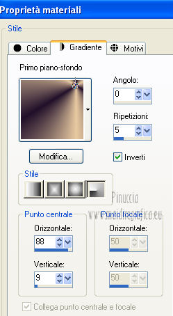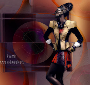 qui puoi trovare qualche risposta ai tuoi dubbi. Se l'argomento che ti interessa non è presente, ti prego di segnalarmelo. Occorrente: Materiale qui Filtri: consulta, se necessario, la mia sezione filtri qui VanDerLee - Unplugged X qui Unplugged Tools - Starchart qui ![]() Apri la maschera WG_Mask in PSP e minimizzala con il resto del materiale. Imposta il colore di primo piano con #987a74, e il colore di sfondo con #21102a. ![]() Passa il colore di primo piano a Gradiente, stile Radiale. ![]() 1. Apri una nuova immagine trasparente 800 x 600 pixels, e riempila con il gradiente.Regola>Sfocatura>Sfocatura gaussiana - raggio 15. ![]() Effetti>Effetti di bordo>Aumenta di più. Effetti>Effetti di bordo>Aumenta. Livelli>Duplica. Immagine>Ridimensiona, al 30%, tutti i livelli non selezionato. Sposta l'immagine nell'angolo in alto a sinistra.![]() Effetti>Effetti di immagine>Mulinello. ![]() Modifica>Ripeti Mulinello. Regola>Messa a fuoco>Metti a fuoco. Sposta la spirale come nell'esempio.è probabile che dopo i prossimi passaggi il risultato non sia completamente uguale al mio, perchè sono sufficienti due-tre pixels di differenza nella posizione per cambiare appunto il risultato degli effetti Livelli>Duplica. Immagine>Capovolgi. Immagine>Rifletti. Livelli>Unisci>Unisci giù. Effetti>Effetti di immagine>Motivo unico. ![]() Regola>Tonalità e saturazione>Viraggio. ![]() Cambia la modalità di miscelatura di questo livello in Sovrapponi. Livelli>Unisci>Unisci giù. Finestra>Duplica (o, sulla tastiera, maiuscola+D) per fare una copia. Minimizza il duplicato che ti servirà più tardi. 2. Torna al tuo lavoro originale. Cambia il colore di primo piano con #e8caa1. Mantieni impostato il Gradiente che cambierà tonalità. ![]() Livelli>Nuovo livello raster. Riempi il livello con il gradiente.Regola>Sfocatura>Sfocatura gaussian - raggio 15. ![]() Livelli>Nuovo livello maschera>Da immagine. Apri il menu sotto la finestra di origine e vedrai la lista dei files aperti. Seleziona la maschera con WG_mask, con i seguenti settaggi: ![]() Livelli>Unisci>Unisci gruppo. Regola>Messa a fuoco>Metti a fuoco. Cambia la modalità di miscelatura di questo livello in Luce netta. Livelli>Duplica. Immagine>Capovolgi Immagine>Rifletti. Livelli>Unisci>Unisci visibile. 3. Livelli>Duplica. Effetti>Effetti geometrici>Cerchio. ![]() Immagine>Ridimensiona, al 60%, tutti i livelli non selezionato. Selezione>Seleziona tutto. Selezione>Mobile. Selezione>Immobilizza. Selezione>Modifica>Contrai - 2 pixels. ![]() Selezione>Inverti. Premi sulla tastiera il tasto CANC. Selezione>Inverti. Regola>Sfocatura>Sfocatura radiale. ![]() Selezione>Deseleziona. Effetti>Plugins>VanDerLee - Unplugged X. ![]() Livelli>Duplica. Effetti>Plugins>Unplugged Tools - Starchart. ![]() Abbassa l'opacità di questo livello al 70%. Livelli>Unisci>Unisci giù. Immagine>Ridimensiona, all'85%, tutti i livelli non selezionato. Abbassa l'opacità di questo livello al 50%. 4. Apri il tube Benice L34 e vai a Modifica>Copia. Torna al tuo lavoro e vai a Modifica>Incolla come nuovo livello. Sposta il tube nell'angolo in alto a sinistra.Livelli>Duplica. Immagine>Rifletti. Livelli>Duplica. Immagine>Capovolgi. Livelli>Duplica. Immagine>Rifletti. Livelli>Unisci>Unisci giù - 3 volte. Cambia la modalità di miscelatura di questo livello in Luce diffusa, e abbassa l'opacità al 50%. 5. Apri il tube MR_ Aminata e vai a Modifica>Copia. Torna al tuo lavoro e vai a Modifica>Incolla come nuovo livello. Immagine>Ridimensiona, al 75%%, tutti i livelli non selezionato. Sposta il tube a destra.![]() Regola>Messa a fuoco>Metti a fuoco. Regola>Rimozione disturbo in un passaggio. Regola>Messa a fuoco>Metti a fuoco. Effetti>Effetti 3D>Sfalsa ombra, con il colore nero. ![]() 6. Apri il tube Calguisfleurarum5110 e vai a Modifica>Copia. Torna al tuo lavoro e vai a Modifica>Incolla come nuovo livello. Immagine>Ridimensiona, al 45%%, tutti i livelli non selezionato. Sposta il tube in basso a sinistra.Regola>Messa a fuoco>Metti a fuoco. Livelli>Duplica. Immagine>Rifletti. Immagine>Ridimensiona, al 70%, tutti i livelli non selezionato. Sposta questo tube accanto al precedente.Livelli>Unisci>Unisci giù. Effetti>Effetti 3D>Sfalsa ombra, con i settaggi precedenti. ![]() 7. Apri il tube tekst e vai a Modifica>Copia. Torna al tuo lavoro e vai a Modifica>Incolla come nuovo livello. Sposta il testo in alto a sinistra.Cambia la modalità di miscelatura di questo livello in Luminanza (Esistente). 8. Immagine>Aggiungi bordatura, 2 pixels, simmetriche, con il colore #404040. Immagine>Aggiungi bordatura, 20 pixels, simmetriche, con il colore #ff6528. Seleziona il bordo da 20 pixels con la bacchetta magica ![]() Livelli>Nuovo livello raster. 9. Attiva il duplicato che hai minimizzato al punto 1. Su questo duplicato: Regola>Luminosità e contrasto>Luminosità e contrasto. ![]() Passa il colore di primo piano a Motivi, e cerca il duplicato nella lista dei motivi, Categoria Immagini aperte. ![]() Torna al tuo lavoro originale, e riempi la selezione con il motivo.Selezione>Deseleziona. Regola>Sfocatura>Sfocatura gaussiana - raggio 20. ![]() Effetti>Effetti di trama>Veneziana. ![]() Livelli>Unisci>Unisci tutto. Aggiungi il tuo nome e/o il tuo watermark e salva in formato jpg. ![]() Se hai problemi o dubbi, o trovi un link non funzionante, o anche soltanto per un saluto, scrivimi 1 Novembre 2012 |