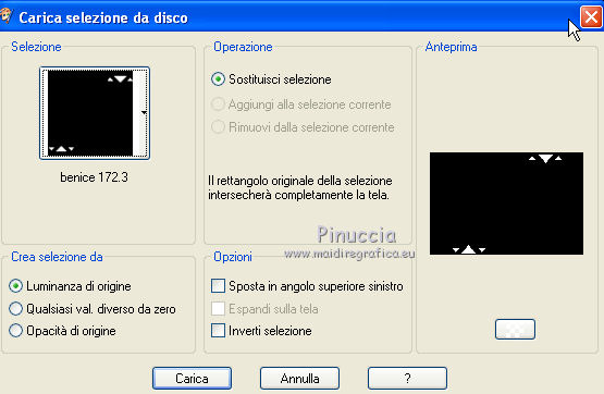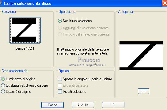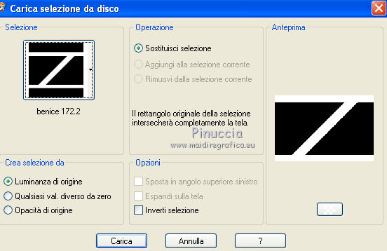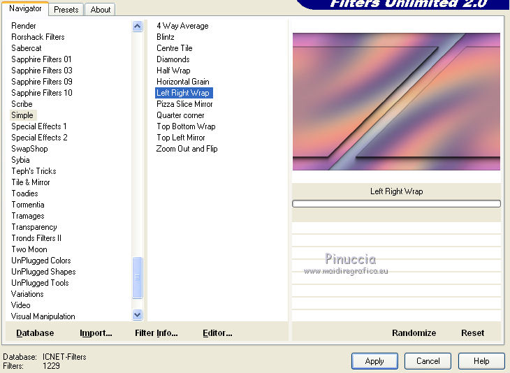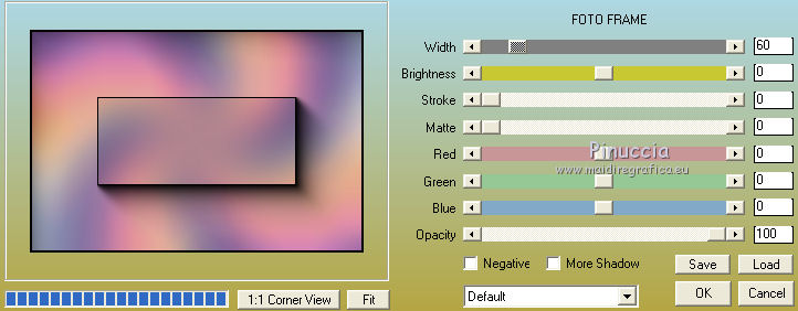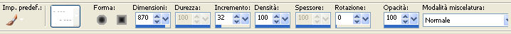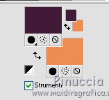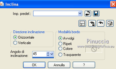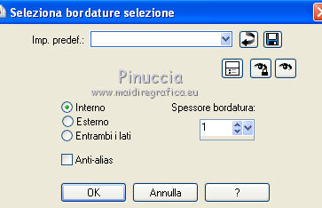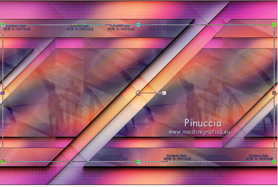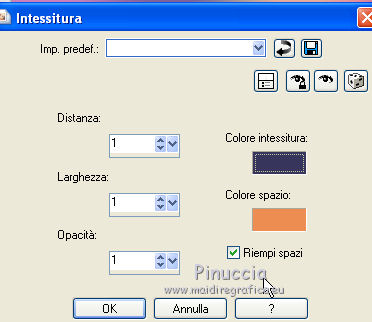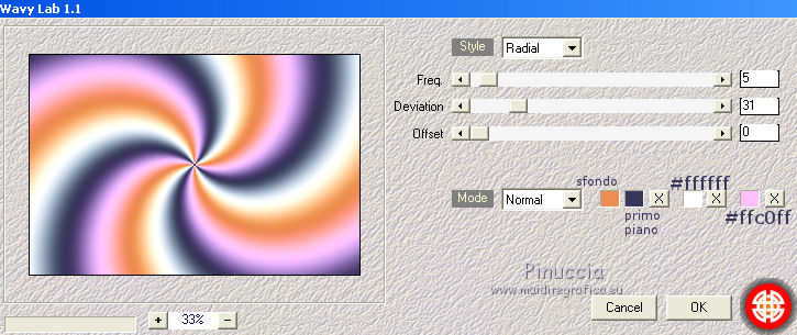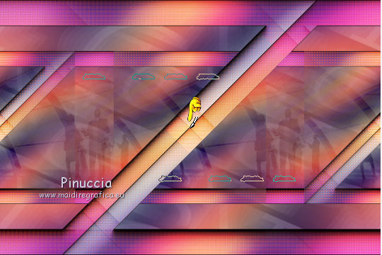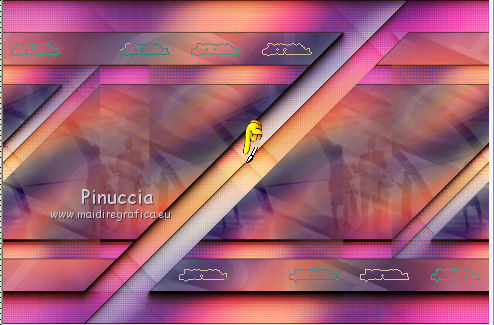 qui puoi trovare qualche risposta ai tuoi dubbi. Se l'argomento che ti interessa non è presente, ti prego di segnalarmelo. Occorrente: Materiale qui Il tube della donna è di Benice e non può essere usato diffuso nei gruppi di share, né può essere usato per creare altri tutorial. Filtri: consulta, se necessario, la mia sezione filtri qui Filters Unlimited 2.0 qui AAA Frames - Foto Frame qui Mehdi - Wavy Lab 1.1 qui Simple - Left Right Wrap (bonus) qui I filtri Simple si possono usare da soli o importati in Filters Unlimited. Come importare un filtro in Unlimited, vedi qui ![]() Metti il pennelll nella cartella Pennelli. Attenzione, il pennello è composto da due files che non devono essere separati. Vedi gli appunti sui pennelli qui Metti le selezioni nella cartella Selezioni. Imposta il colore di primo piano con #38365b, e il colore di sfondo con #ff8d51. ![]() 1. Apri una nuova immagine trasparente 900 x 600 pixels. Effetti>Plugins>Mehdi - Wavy Lab 1.1. Il filtro lavora con i colori impostati nella paletta dei materiali. I primi due colori sono sempre il colore di sfondo e il colore di primo piano. Imposta il terzo colore con #ffffff e il quarto colore con #ffc0ff. ![]() Regola>Sfocatura>Sfocatura gaussiana - raggio 70. ![]() 2. Livelli>Duplica. Cambia la modalità di miscelatura di questo livello in Moltiplica, e abbassa l'opacità al 50%. Livelli>Unisci>Unisci giù. 3. Effetti>Plugins>AAA Frames - Foto Frame. ![]() Effetti>Effetti geometrici>Inclina. ![]() Effetti>Plugins>Filters Unlimited 2.0 - Simple - Left Right Wrap. ![]() 4. Dovresti avere questo. ![]() 5. Livelli>Nuovo livello raster. Selezione>Carica/Salva selezione>Carica selezione da disco. Cerca e carica la selezione Benice 172.1. ![]() Apri l'immagine Image_Benice_L172 e vai a Modifica>Copia. Torna al tuo lavoro e vai a Modifica>Incolla nella selezione. Cambia la modalità di miscelatura di questo livello in Luce diffusa. Mantieni selezionato. Livelli>Unisci>Unisci giù. 6. Selezione>Inverti. Selezione>Innalza selezione a livello. Selezione>Deseleziona. Effetti>Effetti di trama>Intessitura. Colore intessitura: colore di primo piano - colore spazio: colore di sfondo. ![]() Cambia la modalità di miscelatura di questo livello in Sovrapponi. 7. Livelli>Duplica. Immagine>Rifletti. Effetti>Effetti di immagine>Motivo unico. ![]() Selezione>Carica/Salva selezione>Carica selezione da disco. Carica nuovamente la selezione Benice 172.1. ![]() Premi sulla tastiera il tasto CANC. Selezione>Deseleziona. Livelli>Unisci>Unisci visibile. 8. Dovresti avere questo. ![]() 9. Finestra>Duplica (o, sulla tastiera, maiuscola+D) per fare una copia. Minimizza la copia, e torna al tuo lavoro originale. 10. Apri l'immagine Making_Deals_JDC03 e vai a Modifica>Copia. Torna al tuo lavoro e vai a Modifica>Incolla come nuovo livello. Selezione>Carica/Salva selezione>Carica selezione da disco. Cerca e carica la selezione Benice 172.2. ![]() Premi sulla tastiera il tasto CANC. Selezione>Deseleziona. Cambia la modalità di miscelatura di questo livello in Rafforza, e abbassa l'opacità al 20%. 11. Livelli>Unisci>Unisci tutto. Immagine>Ridimensiona, al 60%, tutti i livelli selezionato. Modifica>Copia. Attiva il duplicato che hai minimizzato al punto 9 ![]() Modifica>Incolla come nuovo livello. Effetti>Effetti di immagine>Motivo unico. ![]() Selezione>Carica/Salva selezione>Carica selezione da disco. Carica nuovamente la selezione Benice 172.2. ![]() Premi sulla tastiera il tasto CANC. Selezione>Deseleziona. 12. Dovresti avere questo. ![]() 13. Livelli>Nuovo livello raster. Attiva lo strumento Pennello ![]() cerca e seleziona il pennello Benice_L172.1, con i seguenti settaggi. ![]() Per applicare il pennello, clicca al centro dell'immagine, con il tasto sinistro del mouse per usare il colore di primo piano. ![]() se il tuo PSP non supporta pennelli superiori a 500 pixels, imposta il pennello con la dimensione massima. Applicalo cliccando al centro dell'immagine ![]() Immagine>Ridimensiona, al 175%, tutti i livelli non selezionato. E dovresti avere il pennello pressappoco dove si troverebbe con la versione superiore di PSP. ![]() Cambia la modalità di miscelatura di questo livello in Sovrapponi, e abbassa l'opacità al 60%. 14. Apri il tube Benice_L172_Tekst e vai a Modifica>Copia. Torna al tuo lavoro e vai a Modifica>Incolla come nuovo livello. Effetti>Effetti di immagine>Scostamento. ![]() 15. Livelli>Nuovo livello raster. Selezione>Carica/Salva selezione>Carica selezione da disco. Cerca e carica la selezione Benice 172.3. ![]() Riempi la selezione con il colore di primo piano.Selezione>Deseleziona. Cambia la modalità di miscelatura di questo livello in Moltiplica, e abbassa l'opacità al 60%. 16. Apri il tube Deco_Benice_L172_Deco e vai a Modifica>Copia. Torna al tuo lavoro e vai a Modifica>Incolla come nuovo livello. Effetti>Effetti di immagine>Scostamento. ![]() 17. Livelli>Unisci>Unisci tutto. Modifica>Copia. Immagine>Aggiungi bordatura, 10 pixels, simmetriche, con il colore di primo piano #38365b. Attiva lo strumento Bacchetta magica ![]() ![]() Clicca nel bordo per selezionarlo. Livelli>Nuovo livello raster. Modifica>Incolla nella selezione. Regola>Sfocatura>Sfocatura gaussiana - raggio 10. ![]() Selezione>Deseleziona. 18. Imposta il colore di primo piano con #411c38. ![]() 19. Selezione>Seleziona tutto. Selezione>Modifica>Contrai - 10 pixels. ![]() Selezione>Modifica>Seleziona bordature selezione. ![]() Ingrandisci molto l'immagine,per visualizzare meglio il ristretto spazio da riempire. Riempi la selezione con il colore di primo piano.Selezione>Deseleziona. 20. Apri il tube Benice_Woman_L172 e vai a Modifica>Copia. Torna al tuo lavoro e vai a Modifica>Incolla come nuovo livello. Sposta il tube un po' più a sinistra e in basso.![]() Livelli>Duplica, e attiva il livello sottostante dell'originale. Regola>Sfocatura>Sfocatura gaussiana - raggio 20. ![]() Cambia la modalità di miscelatura di questo livello in Luce diffusa. Livelli>Duplica. 21. Liv