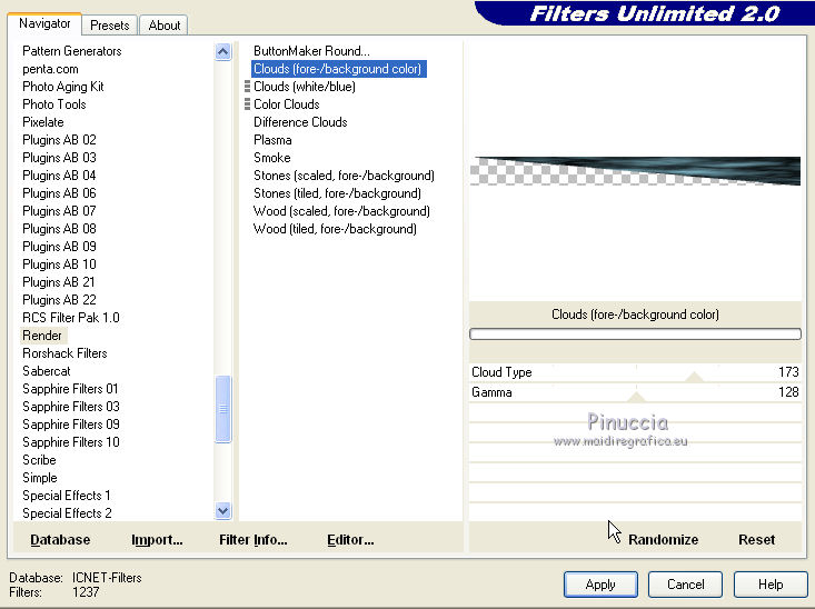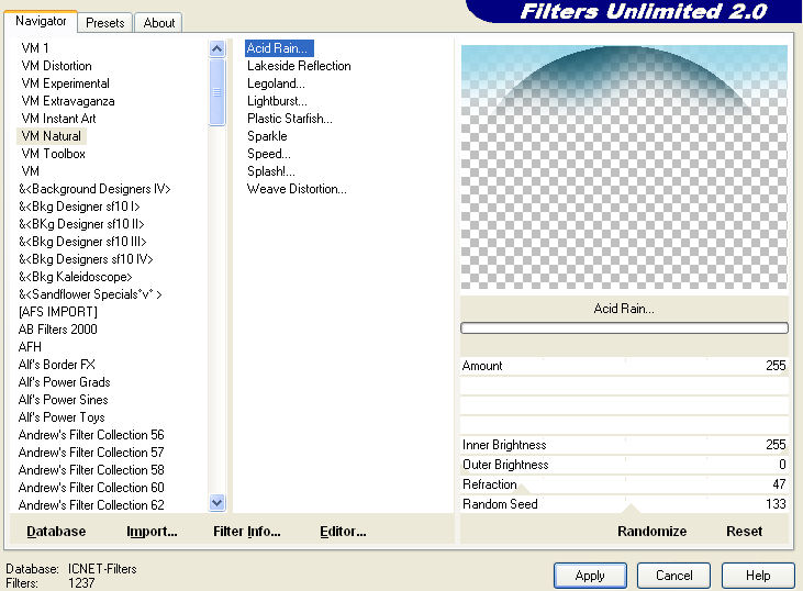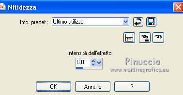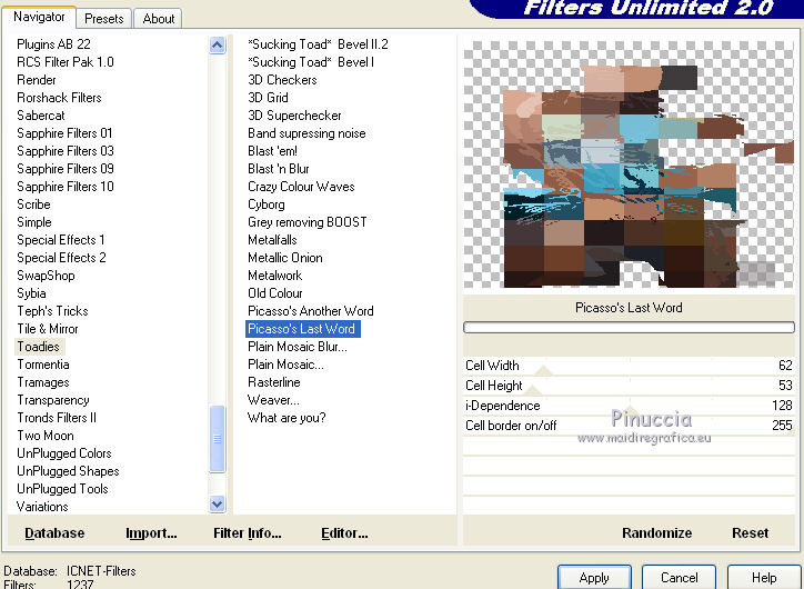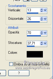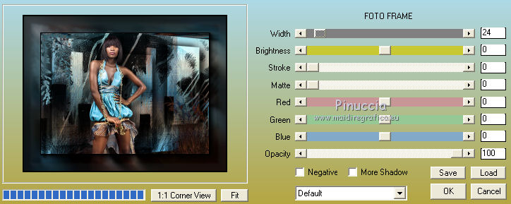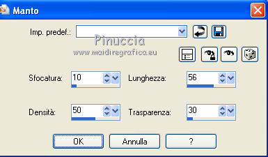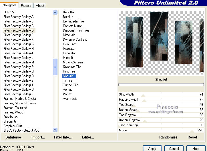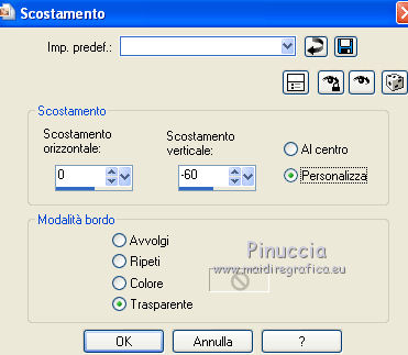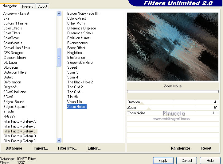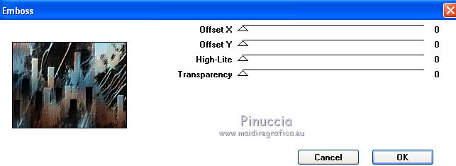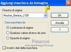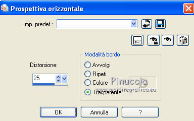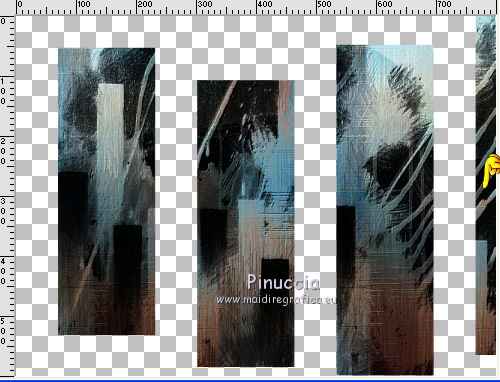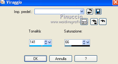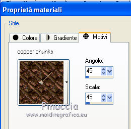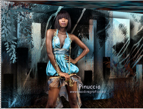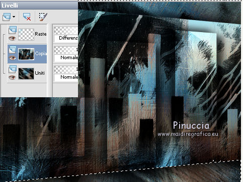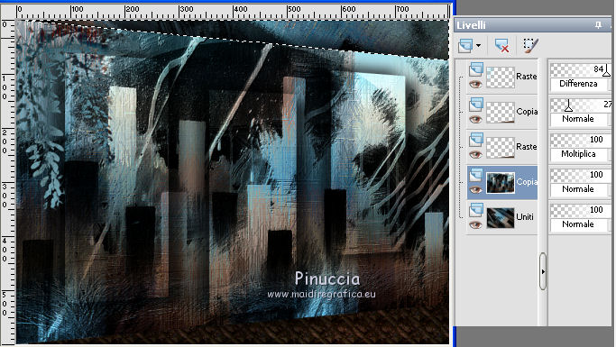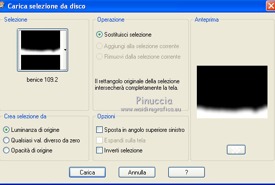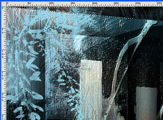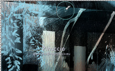qui puoi trovare qualche risposta ai tuoi dubbi. Se l'argomento che ti interessa non è presente, ti prego di segnalarmelo. Occorrente: Materiale qui Il tube della donna è di Lut Filtri: consulta, se necessario, la mia sezione filtri qui Filters Unlimited 2.0 qui AAA Frames qui Filter Factory Gallery D qui Filter Factory Gallery C qui Graphics Plus qui Toadies qui VM Natural qui I filtri Factory Gallery per essere usati devono prima essere convertiti. Come fare vedi qui Si usano importandoli in Filters Unlimited (come fare vedi qui) ma possono funzionare anche da soli. Le Factory fornite sono state già convertite. Anche i filtri Toadies e VM Natural si possono usare da soli o importati in Filters Unlimited ![]() Metti il pennello nella cartella Pennelli. Attenzione, il pennello è composto da due files che non possono essere separati. Vedi gli appunti sui Pennelli qui Metti il motivo copper_chunks nella cartella Motivi. Se non vuoi appesantire la cartella, aprilo in PSP e minimizzalo. Lo troverai nella lista dei motivi disponibili quando ti servirà. Metti le selezioni nella cartella Selezioni. Apri la maschera in PSP e minimizzala con il resto del materiale. Imposta il colore di primo piano con #95d5e9, e il colore di sfondo con #000000. ![]() 1. Apri una nuova immagine trasparente 800 x 600 pixels, e riempila con il colore di primo piano.2. Livelli>Nuovo livello raster. Selezione>Seleziona tutto. Apri il tube Lut_tube_88_2212010 e vai a Modifica>Copia. non chiuderlo perchè ti servirà ancora Torna al tuo lavoro e vai a Modifica>Incolla nella selezione. Selezione>Deseleziona. Effetti>Plugins>Toadies - Picasso's Last Word. ![]() 3. Immagine>Ruota a sinistra. se stai usando PSP 9: Immagine>Ruota - 90 gradi in senso antiorario. Effetti>Effetti di distorsione>Vento - da sinistra, intensità 100. ![]() Di nuovo Effetti>Effetti di distorsione>Vento, questa volta da destra. ![]() Immagine>Ruota a destra. se stai usando PSP 9: Immagine>Ruota - 90 gradi in senso orario. Immagine>Ridimensiona, al 130%, tutti i livelli non selezionato. Effetti>Effetti di immagine>Scostamento. ![]() 4. Effetti>Effetti di trama>Manto. ![]() Effetti>Effetti di immagine>Motivo unico. ![]() 5. Livelli>Nuovo livello raster. Riempi il livello con il colore di sfondo.Livelli>Nuovo livello maschera>Da immagine. Apri il menu sotto la finestra di origine e vedrai la lista dei files aperti. Seleziona la maschera Masker_Benice_L109, con i seguenti settaggi. ![]() Livelli>Unisci>Unisci gruppo. Livelli>Unisci>Unisci visibile. Effetti>Plugins>Graphics Plus - Emboss. ![]() 6. Livelli>Nuovo livello raster. Selezione>Carica/Salva selezione>Carica selezione da disco. Cerca e carica la selezione Benice 109.1. ![]() Riempi con il colore di primo piano.Selezione>Deseleziona. Regola>Sfocatura>Sfocatura gaussiana - raggio 50. ![]() Cambia la modalità di miscelatura di questo livello in Luce diffusa. Effetti>Plugins>Filters Unlimited 2.0 - VM Natural - Acid Rain. ![]() Livelli>Unisci>Unisci giù. 7. Livelli>Duplica. Effetti>Plugins>Filters Unlimited 2.0 - Filter Factory Gallery D > Shoutin'! ![]() Chiudi il livello inferiore e rimani posizionato sul livello superiore. Attiva lo strumento Gomma , dimensione 50,e cancella la striscia a destra ![]() 8. Riapri il livello inferiore e rimani sempre posizionato sul livello superiore. Effetti>Effetti 3D>Sfalsa ombra. ![]() Ripeti l'Effetto Sfalsa ombra, cambiando verticale e orizzontale con -13/-26. ![]() Livelli>Duplica. Cambia la modalità di miscelatura di questo livello in Indebolisci, e abbassa l'opacità al 16%. Livelli>Unisci>Unisci visibile. 9. Livelli>Nuovo livello raster. Selezione>Carica/Salva selezione>Carica selezione da disco. Cerca e carica la selezione Benice 109.2. ![]() Apri l'immagine Highland1, mantieni la selezione attiva e vai a Modifica>Copia. Torna al tuo lavoro e vai a Modifica>Incolla nella selezione. Selezione>Deseleziona. Regola>Tonalità e saturazione>Viraggio. ![]() Effetti>Effetti di bordo>Aumenta di più. Cambia la modalità di questo livello in Luce diffusa. Livelli>Duplica. Cambia la modalità di miscelatura di questo livello in Indebolisci, e abbassa l'opacità al 65%. Effetti>Effetti di immagine>Scostamento. ![]() Livelli>Unisci>Unisci visibile. 10. Livelli>Duplica. Effetti>Effetti geometrici>Prospettiva orizzontale. ![]() Effetti>Effetti 3D>Sfalsa ombra. ![]() Ripeti l'Effetto Sfalsa ombra, con i valori negativi. ![]() 11. Attiva il livello inferiore. Effetti>Plugins>Filters Unlimited 2.0 - Filter Factory Gallery C > Zoom Noise. ![]() 11. Attiva nuovamente il livello superiore. Livelli>Nuovo livello raster. Attiva lo strumento Pennello ![]() cerca e seleziona il pennello BBs Brushes Wisteria 1 ![]() Clicca 4 volte con il tasto sinistro del mouse per usare il colore di primo piano al centro del livello. Sposta il pennello nell'angolo in basso a sinistra(vedi la schermata sotto). Regola>Messa a fuoco>Metti a fuoco. 12. Attiva lo strumento Gomma ![]() e cancella un piccolo pezzo del pennello, pressapoco dove si vede il cerchio. ![]() Attiva lo strumento Selezione a mano libera , da punto a punto,e seleziona la parte mostrata sotto. ![]() Premi sulla tastiera il tasto CANC. Selezione>Deseleziona. Cambia la modalità di miscelatura di questo livello in Differenza, e abbassa l'opacità all'84%. 13. Passa il colore di primo piano a Motivi e seleziona il motivo Copper Chunks, con i seguenti settaggi. ![]() Attiva il livello "copia di sfondo". Attiva lo strumento Bacchetta magica ![]() e clicca nella parte trasparente in basso, dovrai cliccare due-tre volte per selezionare tutta l'area. ![]() Livelli>Nuovo livello raster. Riempi il livello con il motivo.Selezione>Deseleziona. Cambia la modalità di miscelatura di questo livello in Moltiplica. Livelli>Duplica. Riporta la modalità di miscelatura di questo livello a Normale, e abbassa l'opacità al 27%. 14. Imposta nuovamente il colore di primo piano con #95d5e9. Attiva nuovamente il livello "copia di Sfondo". Selezio
