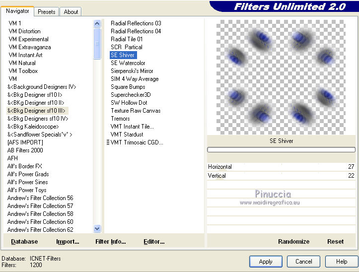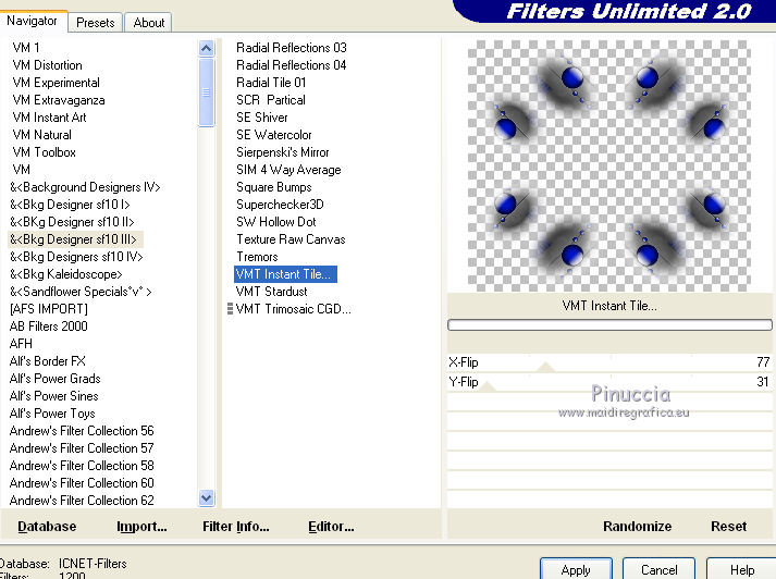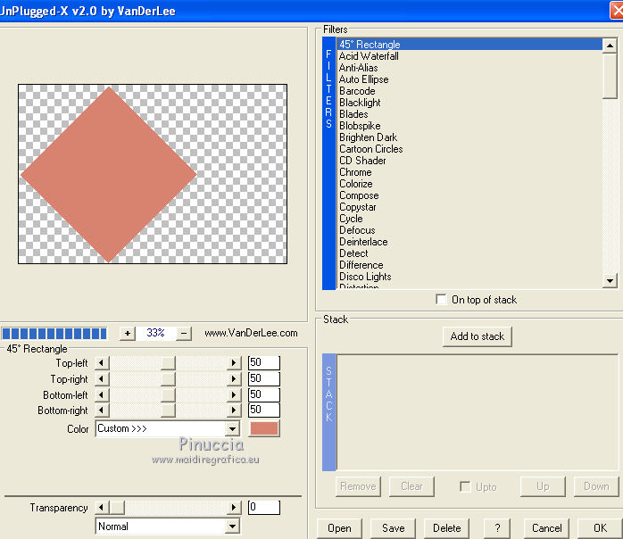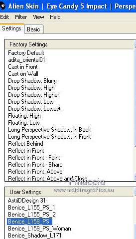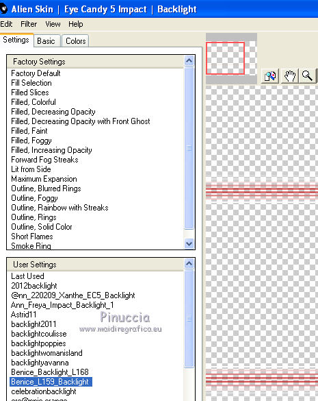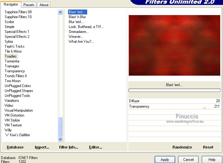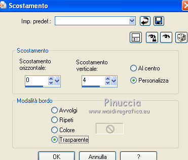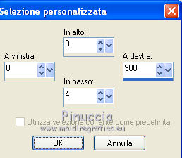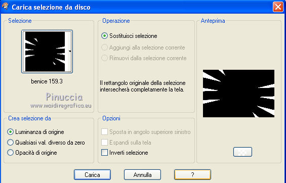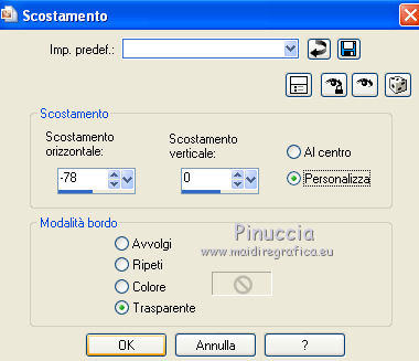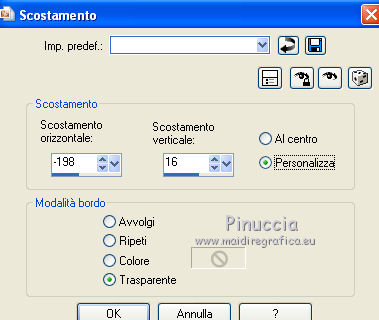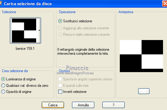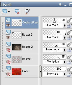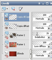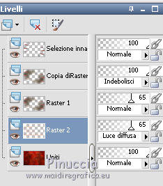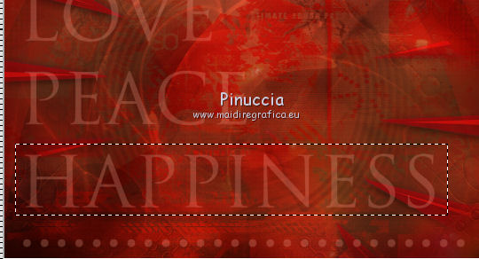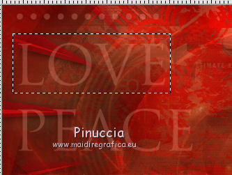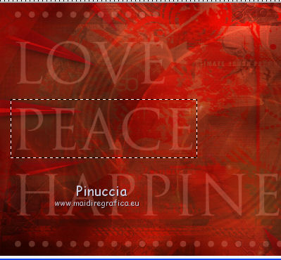 qui puoi trovare qualche risposta ai tuoi dubbi. Se l'argomento che ti interessa non è presente, ti prego di segnalarmelo. Occorrente: Materiale qui Il tube della donna è di Maxyran. Filtri: consulta, se necessario, la mia sezione filtri qui Filters Unlimited 2.0 qui &<Bkg Designer sf10III> (da importare in Unlimited) qui Simple qui Simple bonus qui Toadies qui VanDerLee - Unplugged-X qui i filtri Toadies e Simple si possono usare importandoli in Filters Unlimited ma possono funzionare anche da soli ![]() Metti i preset nelle rispettive cartelle del filtro. Cliccando sul file, il preset si installerà automaticamente nella cartella corretta. Metti i pennelli nella cartella Pennelli. Attenzione, ogni pennello è composto da due files che non devono essere separati. Vedi gli appunti sui pennelli qui Metti le selezioni nella cartella Selezioni. Imposta il colore di primo piano con #f3f2ee, e il colore di sfondo con #c5150c. ![]() 1. Apri l'immagine BG_Benice_L159. Finestra>Duplica (o sulla tastiera la combinazione di tasti maiuscola+D) per fare una copia. Chiudi l'originale. La copia sarà la base del tuo lavoro. 2. Livelli>Nuovo livello raster. Selezione>Seleziona tutto. Apri Textuur_Benice_L159 e vai a Modifica>Copia. Torna al tuo lavoro e vai a Modifica>Incolla nella selezione. Selezione>Deseleziona. Cambia la modalità di miscelatura di questo livello in Luce diffusa. 3. Apri il tube Element_1_Benice_L159 e vai a Modifica>Copia. Torna al tuo lavoro e vai a Modifica>Incolla come nuovo livello. Lascialo come sta. E' già correttamente posizionato. 5. Livelli>Duplica. Chiudi questo livello e attiva il livello sottostante Raster 2. Regola>Tonalità e saturazione>Viraggio. ![]() Effetti>Effetti di bordo>Aumenta. Cambia la modalità di miscelatura di questo livello in Indebolisci, e abbassa l'opacità al 26%. 5. Apri e attiva il livello superiore. Effetti>Plugins>Filters Unlimited 2.0 - &<Bkg Designer sf10III> - VMT Instant Tile. ![]() Effetti>Plugins>Filters Unlimited 2.0 - &<Bkg Designer sf10III> - SE Shiver. ![]() Selezione>Carica/Salva selezione>Carica selezione da disco. Cerca e carica la selezione Benice159.1. ![]() Premi sulla tastiera il tasto CANC. Selezione>Deseleziona. Livelli>Duplica. Immagine>Rifletti. Chiudi i tre livelli inferiori, e rimani posizionato sul livello superiore. ![]() Livelli>Unisci>Unisci visibile. 6. Livelli>Visualizza>Tutto, e rimani posizionato sul livello superiore. Effetti>Effetti di bordo>Aumenta di più. Cambia la modalità di miscelatura di questo livello in Indebolisci, e abbassa l'opacità al 60%. 7. Livelli>Unisci>Unisci visibile. Dovresti avere questo. ![]() 8. Apri il tube Overlay_1_Benice_L159 e vai a Modifica>Copia. Torna al tuo lavoro e vai a Modifica>Incolla come nuovo livello. Lascialo come sta. E' già correttamente posizionato. E' già correttamente impostata la modalità di miscelatura di questo livello in Moltiplica, e l'opacità al 65%. 9. Livelli>Nuovo livello raster. Selezione>Seleziona tutto. Apri l'immagine Image_Benice_L159 e vai a Modifica>Copia. Torna al tuo lavoro e vai a Modifica>Incolla nella selezione. Selezione>Deseleziona. Cambia la modalità di miscelatura di questo livello in Luce netta, e abbassa l'opacità al 60%. 10. Dovresti avere questo. ![]() 11. Livelli>Nuovo livello raster. Attiva lo strumento Selezione ,clicca sull'icona Selezione personalizzata ![]() e imposta i seguenti settaggi: ![]() Riempi la selezione con il colore chiaro di primo piano.Selezione>Deseleziona. Effetti>Plugins>Alien Skin Eye Candy 5 Impact - Motion Trail. Seleziona il preset Benice_L159_Motion Trail e ok. ![]() Effetti>Effetti di immagine>Scostamento. ![]() Effetti>Effetti di immagine>Motivo unico. ![]() Effetti>Plugins>Simple - Quarter Corner. ![]() 12. Livelli>Duplica. Immagine>Rifletti. Abbassa l'opacità di questo livello al 50%. Chiudi i tre livelli inferiori e rimani posizionato sul livello superiore. ![]() Livelli>Unisci>Unisci visibile. Cambia la modalità di miscelatura di questo livello in Sovrapponi. Livelli>Visualizza>Tutto. 13. Rimani posizionato sul livello superiore. Livelli>Nuovo livello raster. Selezione>Carica/Salva selezione>Carica selezione da disco. Cerca e carica la selezione Benice159.2. ![]() Riempi la selezione con il colore di sfondo.Regola>Sfocatura>Sfocatura gaussiana - raggio 100. ![]() Selezione>Deseleziona. Livelli>Duplica. Immagine>Rifletti. Livelli>Unisci>Unisci giù. Abbassa l'opacità di questo livello al 59%. 14. Apri il tube Element_2_Benice_L159 e vai a Modifica>Copia. Torna al tuo lavoro e vai a Modifica>Incolla come nuovo livello. Effetti>Effetti di immagine>Scostamento. ![]() Cambia la modalità di miscelatura di questo livello in Scurisci. 15. Livelli>Unisci>Unisci visibile. Dovresti avere questo. ![]() 16. Apri il tube Overlay_2_Benice_L159 e vai a Modifica>Copia. Torna al tuo lavoro e vai a Modifica>Incolla come nuovo livello. Lascialo come sta. E' già correttamente posizionato. Abbassa l'opacità di questo livello al 65%. Livelli>Duplica. Cambia la modalità di miscelatura di questo livello in Indebolisci, e riporta l'opacità a 100. 17. Selezione>Carica/Salva selezione>Carica selezione da disco. Cerca e carica la selezione Benice159.3. ![]() Innalza selezione a livello. Selezione>Deseleziona. Effetti>Effetti 3D>Sfalsa ombra. ![]() 18. Dovresti avere questo. ![]() Finestra>Duplica (o maiuscola+D) per fare una copia. Minimizza il risultato che ti servirà più tardi. Continua sull'originale. 19. Apri il Tekst_1_Benice_L159 e vai a Modifica>Copia. Torna al tuo lavoro e vai a Modifica>Incolla come nuovo livello. Lascialo come sta. E' già correttamente posizionato. Abbassa l'opacità di questo livello al 25%. 20. Adesso dovremo creare tre piccole immagini. Attiva lo strumento Selezione , rettangolo.e seleziona la parola "love". ![]() Selezione>Innalza selezione a livello. Selezione>Deseleziona. Modifica>Copia Unione. Modifica>Incolla come nuova immagine. Continua su questa immagine. Immagine>Ridimension