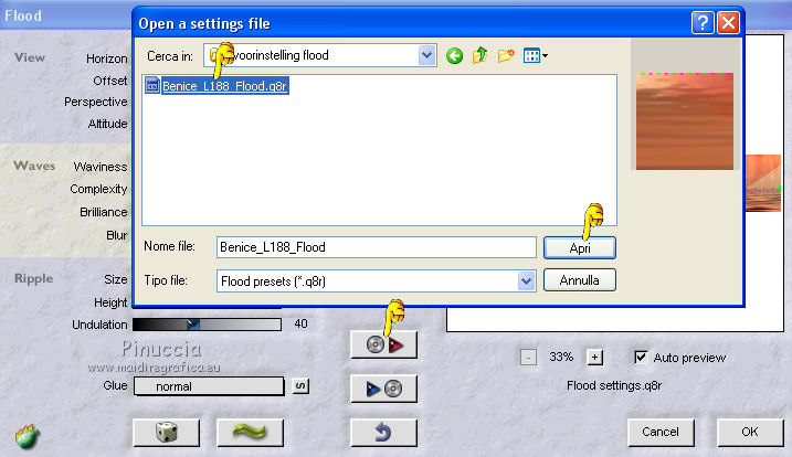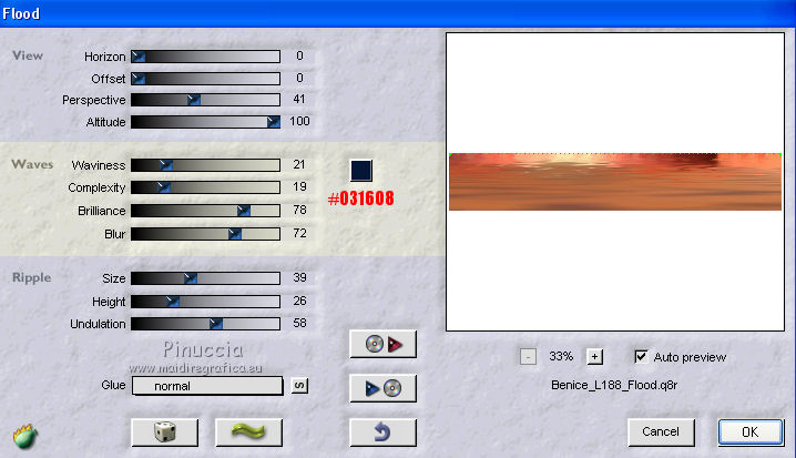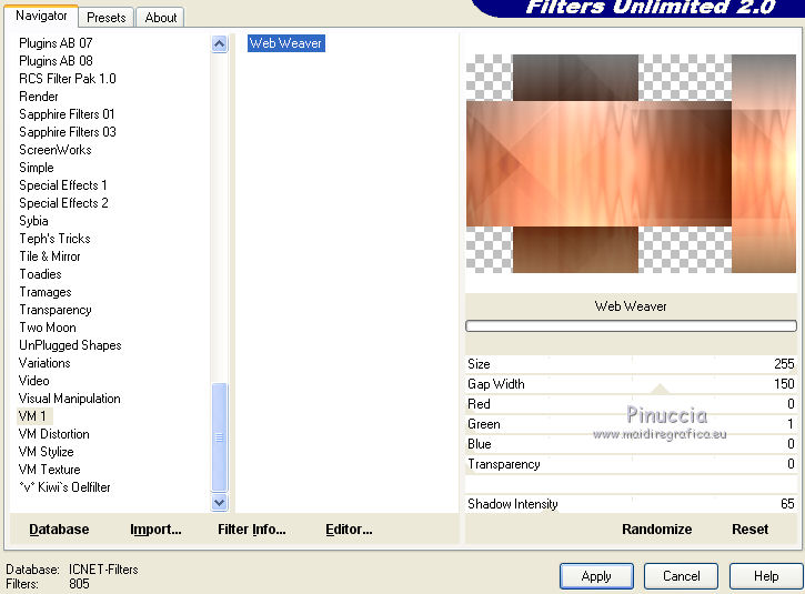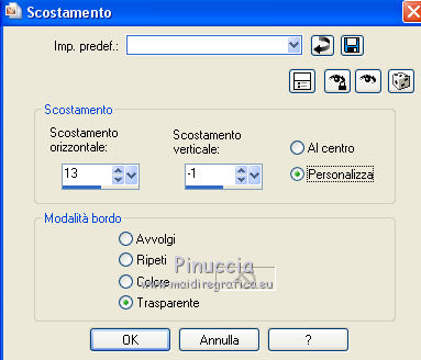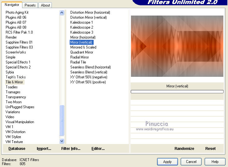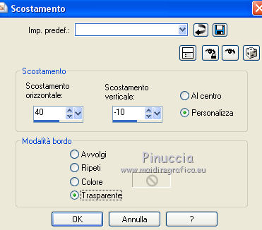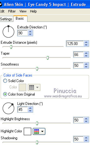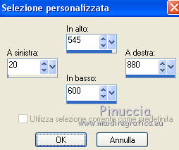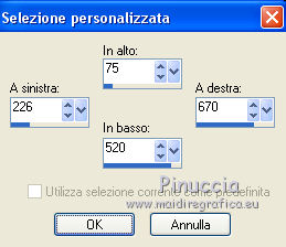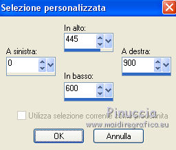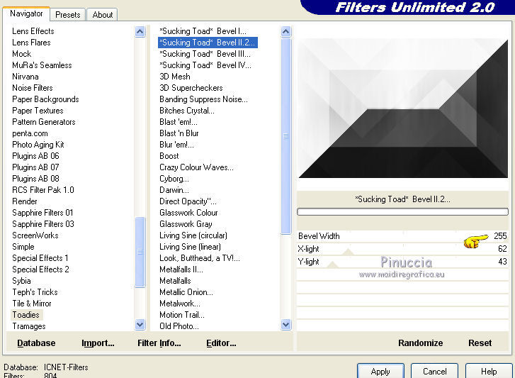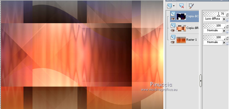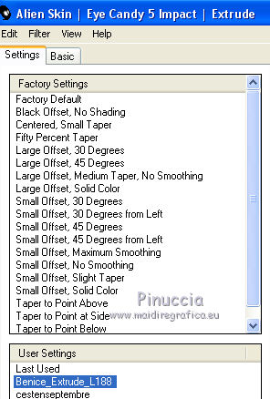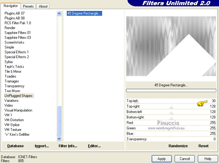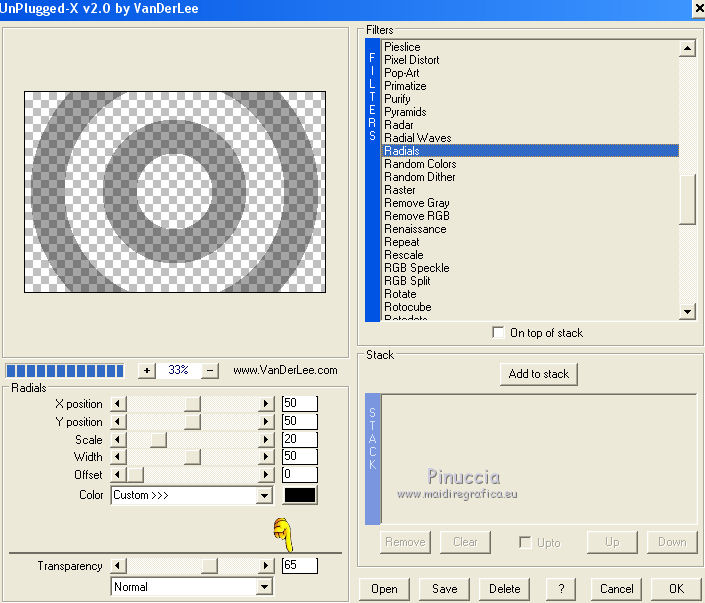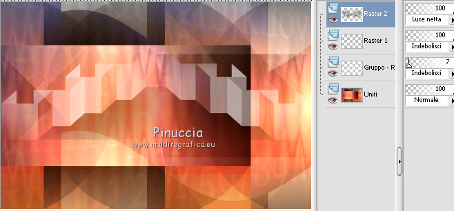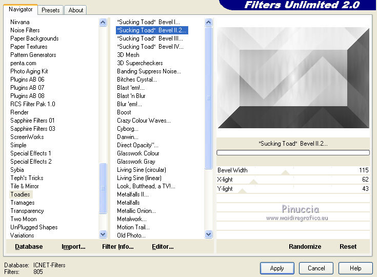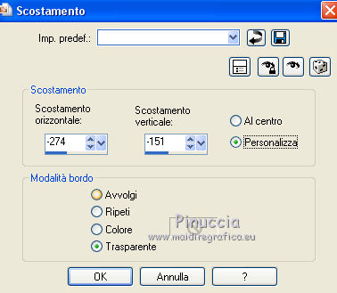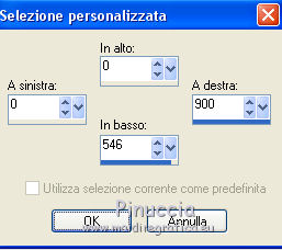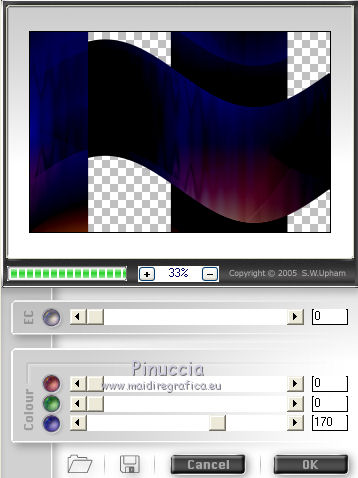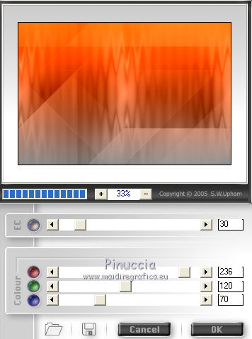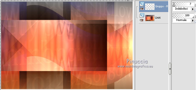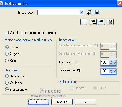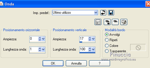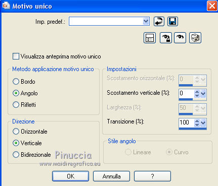 qui puoi trovare qualche risposta ai tuoi dubbi. Se l'argomento che ti interessa non è presente, ti prego di segnalarmelo. Occorrente: Materiale qui Il tube è di Annelies Filtri: consulta, se necessario, la mia sezione filtri qui Filters Unlimited 2.0 qui &<Bkg Kaleidoscope> (da importare in Unlimited) qui AAA Frames - Foto Frame qui Alien Skin Eye Candy 5 Impact - Extrude qui AP Lines - Lines SilverLining qui Toadies - Sucking Bevel Toad II.2 qui VanDerLee - Unplugged-X qui VM 1 - Web Weaver qui Flaming Pear - Flood 120 qui Fotomatic - Skygrad qui Unplugged Shapes qui I filtri Implugged e Toadies si possono usare da soli o importati in Filters Unlimited (come fare vedi qui) Se un filtro fornito appare con questa icona ![]() Metti il preset Cliccando sul file una o due volte (a seconda delle tue impostazioni), automaticamente il preset si installerà nella cartella corretta. perchè uno o due clic vedi qui Metti il preset Benice_L188_Flood nella cartella del Filtro. Se preferisci, puoi importarlo direttamente dalla cartella in cui hai salvato il materiale, quando ti servirà. Metti il preset Preset_RasterDeform_Benice_Vervormen L188 nella cartella Impostazioni predefinite. Apri la maschera in PSP e minimizzala con il resto del materiale. Imposta il colore di primo piano con #808080, e il colore di sfondo con #ffffff. ![]() Passa il colore di primo piano a Gradiente di primo piano/sfondo, stile Radiale. ![]() 1. Apri una nuova immagine trasparente 900 x 600 pixels, e riempila con il gradiente.Effetti>Effetti di immagine>Motivo unico. ![]() Regola>Sfocatura>Sfocatura gaussiana - raggio 5. ![]() Effetti>Plugins>VanDerLee - Unplugged-X - Wavemaker. ![]() Livelli>Duplica. Immagine>Capovolgi. Abbassa l'opacità di questo livello al 50%. Livelli>Unisci>Unisci giù. 2. Livelli>Duplica. Effetti>Plugins>Filters Unlimited 2.0 - Unplugged Shapes - 45 Degree Rectangle. ![]() Livelli>Duplica. Immagine>Rifletti. Immagine>Capovolgi. Abbassa l'opacità di questo livello al 50%. Livelli>Unisci>Unisci giù. Effetti>Effetti di immagine>Motivo unico. ![]() 3. Sullo stesso livello. Effetti>Plugins>Filters Unlimited 2.0 - Toadies - Sucking Toad Bevel II.2, con i settaggi standard. ![]() 4. Livelli>Duplica. Effetti>Plugins>Filters Unlimited 2.0 - Toadies - Sucking Toad Bevel II.2. ![]() Immagine>Rifletti. Immagine>Capovolgi. Abbassa l'opacità di questo livello al 50%. Livelli>Unisci>Unisci giù. Effetti>Effetti di immagine>Motivo unico. ![]() Cambia la modalità di miscelatura di questo livello in Sovrapponi. Livelli>Unisci>Unisci giù. 5. Dovresti avere questo. ![]() 6. Per colorizzare l'immagine: Effetti>Plugins>Fotomatic - Skygrad. ![]() Immagine>Capovolgi. 7. Livelli>Duplica. Effetti>Plugins>Filters Unlimited 2 - Tile & Mirror - Mirror (vertical): ![]() Abbassa l'opacità di questo livello al 50%. Livelli>Unisci>Unisci giù. 8. Livelli>Duplica. Effetti>Plugins>Filters Unlimited 2.0 - VM 1 - Web Weaver ![]() 9. Livelli>Duplica. Effetti>Effetti di distorsione>Onda. ![]() Immagine>Rifletti. Immagine>Capovolgi. Effetti>Plugins>Fotomatic - Skygrad. ![]() Cambia la modalità di miscelatura di questo livello in Luce diffusa, e abbassa l'opacità al 70%. ![]() Livelli>Unisci>Unisci visibile. 10. Livelli>Nuovo livello raster. Riempi con il colore bianco di sfondo.Livelli>Nuovo livello maschera>Da immagine. Apri il menu sotto la finestra di origine e vedrai la lista dei files aperti. Seleziona la maschera Benice_Masker_L188, con i seguenti settaggi. ![]() Livelli>Unisci>Unisci gruppo. Cambia la modalità di miscelatura di questo livello in Indebolisci, e abbassa l'opacità al 7%. ![]() 11. Livelli>Nuovo livello raster. Effetti>Plugins>VanDerLee - Unplugged-X - Radials. ![]() Attiva lo strumento Selezione ![]() clicca sull'icona Selezione personalizzata ![]() e imposta i seguenti settaggi. ![]() Premi sulla tastiera il tasto CANC ![]() Selezione>Deseleziona. Immagine>Immagine negativa. se stai usando PSP 9: Regola>Bilanciamento Colore>Immagine negativa Effetti>Effetti di immagine>Motivo unico. ![]() Effetti>Plugins>AP Lines - Silverlining. ![]() Cambia la modalità di miscelatura di questo livello in Indebolisci. 12. Apri il tube Benice_Boxes_L188 e vai a Modifica>Copia. Torna al tuo lavoro e vai a Modifica>Incolla come nuovo livello. Effetti>Effetti di immagine>Scostamento. ![]() Cambia la modalità di miscelatura di questo livello in Luce netta. ![]() 13. Livelli>Unisci>Unisci visibile. Selezione personalizzata ![]() ![]() Selezione>Innalza selezione a livello. Regola>Sfocatura>Sfocatura gaussiana - raggio 20. ![]() Mantieni selezionato. Livelli>Nuovo livello raster. Effetti>Effetti 3D>Ritaglio. ![]() Selezione>Deseleziona. 14. Attiva il livello della selezione innalzata. ![]() Effetti>Plugins>Alien Skin Eye Candy 5 Impact - Extrude. Seleziona il preset Benice_Extrude_L188 e ok. ![]() Questi i settaggi che, in caso di problemi con il preset, puoi impostare manualmente. ![]() 15. Selezione personalizzata ![]() ![]() Selezione>Innalza selezione a livello. Selezione>Deseleziona. Effetti>Effetti 3D>Ritaglio, con i settaggi precedenti. ![]() 16. Chiudi il livello Uniti. ![]() Livelli>Unisci>Unisci visibile. Premi il tasto D - valido per tutte le versioni fino alla X14 - per attivare lo strumento Deformazione ![]() Seleziona il preset Benice_Vervomen_L188 ![]() Nelle nuove versioni di PSP il tasto D non attiva più lo strumento Deformazione. Dovrai impostare manualmente i settaggi che vedi nella barra degli strumenti. ![]() Livelli>Duplica. Immagine>Rifletti. Abbassa l'opacità di questo livello al 50%. Livelli>Unisci>Unisci giù. 17. Sullo stesso livello. Selezione personalizzata ![]() ![]() Effetti>Plugins>Fotomatic - Skygrad. ![]() Selezione>Deseleziona. Effetti>Effetti 3D>Sfalsa ombra. ![]() 18. Riapri il livello Uniti. Dovresti avere questo. ![]() 19. Chiudi questo livello, e attiva il livello inferiore. ![]() Selezione personalizzata ![]() ![]() Selezione>Innalza selezione a livello. Effetti>Plugins>Flaming Pear 
