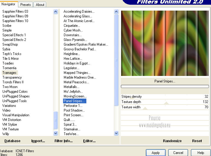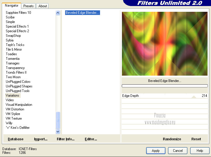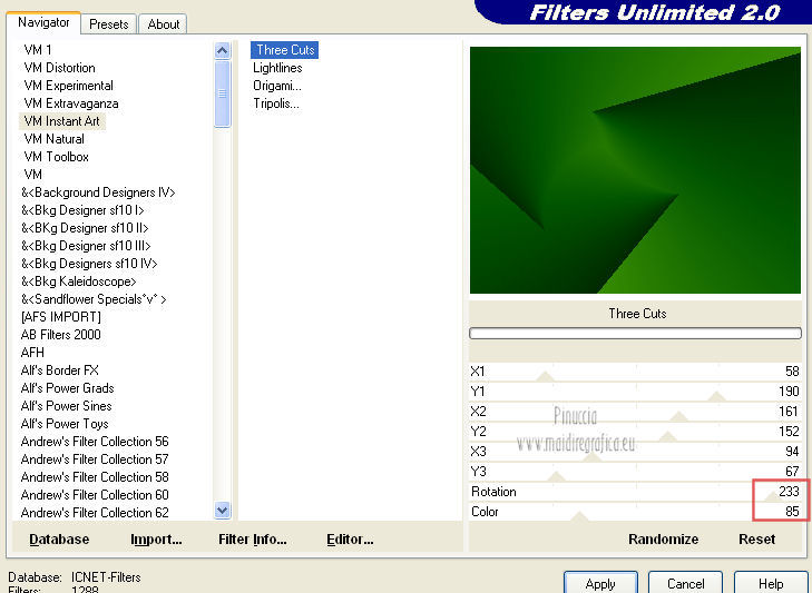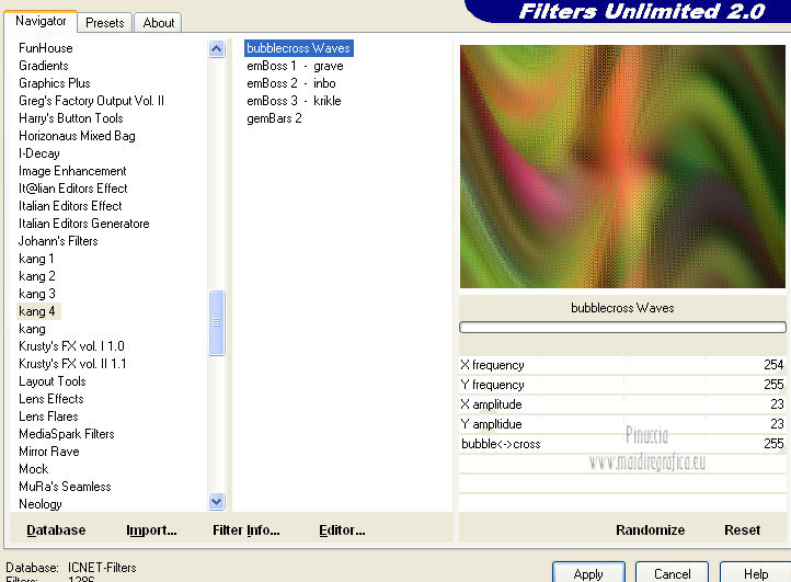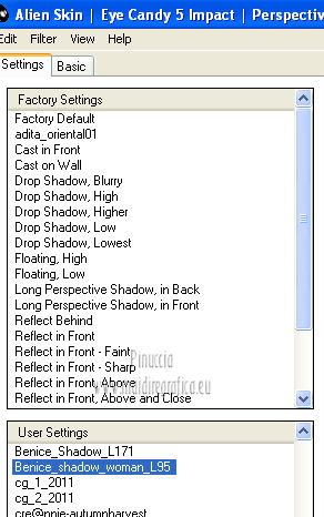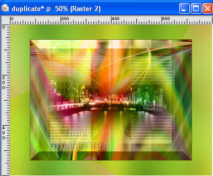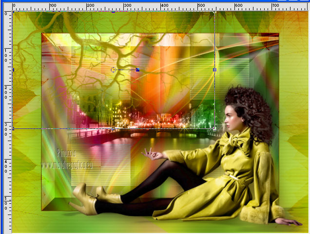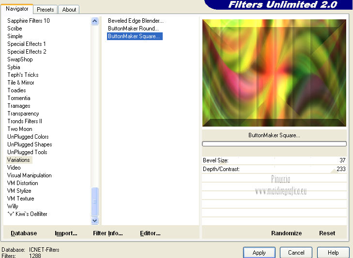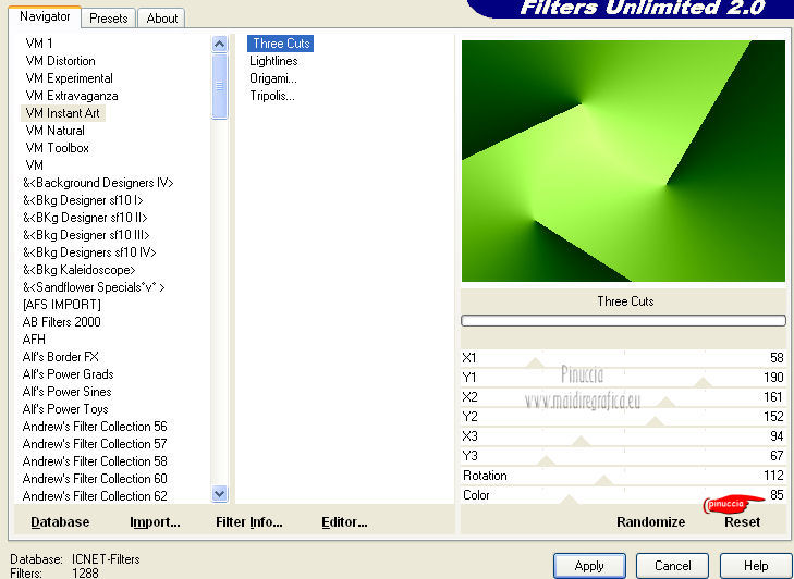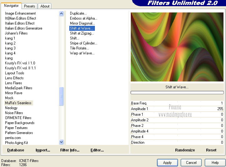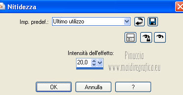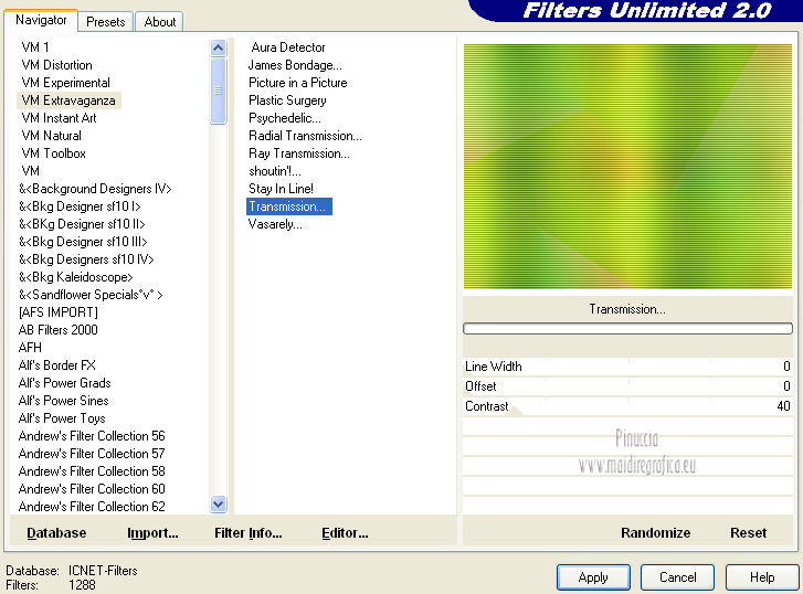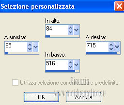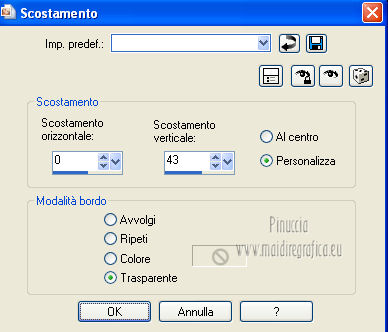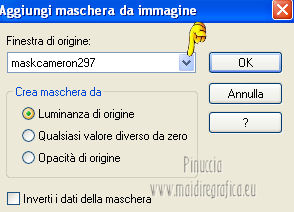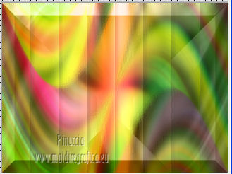 qui puoi trovare qualche risposta ai tuoi dubbi. Se l'argomento che ti interessa non è presente, ti prego di segnalarmelo. Occorrente: Materiale qui Filtri: consulta, se necessario, la mia sezione filtri qui Filters Unlimited 2.0 qui Tramages qui Kang 4 (da importare in Unlimited) qui Mura's Seamless qui Variations (da importare in Unlimited) qui VM Instant Art qui VM Extravaganza qui Alien Skin Eye Candy 5 Impact qui I filtri Tramages, Mura's e i filtri della serie Visman (VM Extravaganza, VM Instant Art) si possono usare da soli o importati in Filters Unlimited (come fare vedi qui) ma possono funzionare anche da soli ![]() Metti il preset nelle rispettive cartelle del filtro Alien Skin Eye Candy 5 Impact>Settings>Shadow Cliccando sul file una o due volte (a seconda delle tue impostazioni), automaticamente il preset si installerà nella cartella corretta. Metti il pennello nella cartella Pennelli. Attenzione, il pennello è composto da due files che non devono essere separati. Vedi gli appunti sui pennelli qui Apri la maschera in PSP e minimizzala con il resto del materiale. Imposta il colore di primo piano con #9a8500, e il colore di sfondo con #ffffff (bianco) (il bianco non sarà usato nel corso del tutorial, ma può influenzare i filtri). ![]() 1. Apri una nuova immagine trasparente 800 x 600 pixels. Selezione>Seleziona tutto. Apri l'immagine Benice_achtergrond_L95 e vai a Modifica>Copia. Torna al tuo lavoro e vai a Modifica>Incolla nella selezione. Selezione>Deseleziona. Effetti>Plugins>Filters Unlimited 2.0 - MuRa's Seamless - Shift at Wave. ![]() Effetti>Plugins>Filters Unlimited 2.0 - Kang 4 - Bubble Cross Waves. ![]() 2. Livelli>Duplica. Effetti>Plugins>Filters Unlimited 2.0 - Tramages - Panel Stripes. ![]() Cambia la modalità di miscelatura di questo livello in Indebolisci, e abbassa l'opacità al 43%. Livelli>Unisci>Unisci giù. 3. Livelli>Duplica. Effetti>Plugins>Filters Unlimited 2.0 - Variations - Beveled Edge Blender. ![]() Effetti>Plugins>Filters Unlimited 2.0 - Variations - Button Maker Square. ![]() Cambia la modalità di miscelatura di questo livello in Luminanza (esistente). Livelli>Unisci>Unisci giù. Livelli>Duplica. Cambia la modalità di miscelatura di questo livello in Filtra, e abbassa l'opacità al 50%. Livelli>Unisci>Unisci giù. Finestra>Duplica (o, sulla tastiera, maiuscola+D) per fare una copia. Minimizza il duplicato, e torna al tuo lavoro originale. 4. Attiva lo strumento Selezione ,clicca sull'icona Selezione personalizzata ![]() e imposta i seguenti settaggi: ![]() Selezione>Innalza selezione a livello. Regola>Sfocatura>Sfocatura gaussiana - raggio 20. ![]() Livelli>Nuovo livello maschera>Da immagine. Apri il menu sotto la finestra di origine e vedrai la lista dei files aperti. Seleziona la maschera maskcameron297, con i seguenti settaggi: ![]() Livelli>Unisci>Unisci gruppo. Selezione>Deseleziona. Effetti>Effetti di bordo>Aumenta di più. Cambia la modalità di miscelatura di questo livello in Schiarisci. 5. Livelli>Nuovo livello raster. Selezione>Seleziona tutto. Apri il tube Deco 1-04-10-verocreation. Sul tube: Immagine>Ruota a destra. se stai usando PSP 9: Immagine>Ruota>90 gradi in senso orario Modifica>Copia. Torna al tuo lavoro e vai a Modifica>Incolla nella selezione. Selezione>Deseleziona. Immagine>Ridimensiona, 100 x 120%, tutti i livelli e mantieni proporzioni non selezionato. ![]() Effetti>Effetti di immagine>Scostamento. ![]() Cambia la modalità di miscelatura di questo livello in Schiarisci. Livelli>Disponi>Sposta giù. Livelli>Duplica. Cambia la modalità di miscelatura di questo livello in Rafforza, e abbassa l'opacità al 33%. 6. Attiva nuovamente il livello superiore. Livelli>Nuovo livello raster. Selezione personalizzata ![]() ![]() Apri il tube Images_paysages_1228382476_paysages e vai a Modifica>Copia. Torna al tuo lavoro e vai a Modifica>Incolla nella selezione. Selezione>Deseleziona. Cambia la modalità di miscelatura di questo livello in Luminanza (esistente). 7. Immagine>Aggiungi bordatura, 2 pixels, simmetriche, con il colore #646000. Immagine>Ridimensiona, all'80%, tutti i livelli non selezionato, Mantieni proporzioni selezionato. Regola>Messa a fuoco>Metti a fuoco. Lascia l'immagine in attesa. 8. Apri il duplicato minimizzato al punto 3. ![]() Livelli>Duplica. Immagine>Capovolgi. Abbassa l'opacità di questo livello al 50%. Livelli>Unisci>Unisci giù. Regola>Sfocatura>Sfocatura gaussiana - raggio 50. ![]() Effetti>Effetti di immagine>Motivo unico. ![]() Effetti>Effetti di immagine>Motivo unico. ![]() 9. Livelli>Duplica. Effetti>Plugins>Filters Unlimited 2.0 - VM Instant Art - Three Cuts. ![]() Cambia la modalità di miscelatura di questo livello in Colore (esistente), e abbassa l'opacità al 55%. Livelli>Unisci>Unisci giù. 10. Livelli>Duplica. Effetti>Plugins>VM Instant Art - Three Cuts. ![]() Cambia la modalità di miscelatura di questo livello in Saturazione, e abbassa l'opacità al 28%. Livelli>Unisci>Unisci giù. Effetti>Plugins>Filters Unlimited 2.0 - VM Extravaganza - Transmission. ![]() 11. Attiva il lavoro originale che hai lasciato in attesa al punto 7. Modifica>Copia. Torna al duplicato e vai a Modifica>Incolla come nuovo livello. ![]() 12. Apri il tube Overlay Benice L95 e vai a Modifica>Copia. Torna al tuo lavoro e vai a Modifica>Incolla come nuovo livello. Cambia la modalità di miscelatura di questo livello in Rafforza, e abbassa l'opacità al 63%. 13. Apri il tube Jet-woman13 e vai a Modifica>Copia. Torna al tuo lavoro e vai a Modifica>Incolla come nuovo livello. Immagine>Ridimensiona, all'85%, tutti i livelli non selezionato. Regola>Luminosità e contrasto>Nitidezza. ![]() Sposta il tube in basso a destra.Livelli>Duplica. Regola>Sfocatura>Sfocatura gaussiana - raggio 20. ![]() Livelli>Disponi>Sposta giù. Attiva il livello superiore dell'originale. Effetti>Plugins>Alien Skin Eye Candy 5 Impact - Perspective Shadow. Seleziona il preset Benice_shadow_woman_L95 e ok. ![]() 14. Livelli>Nuovo livello raster. At