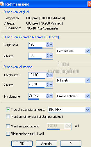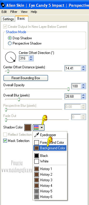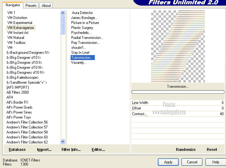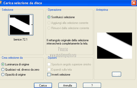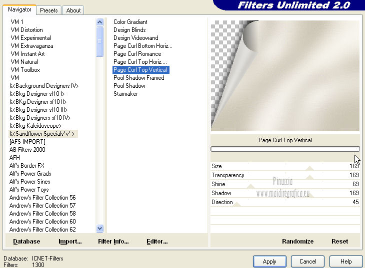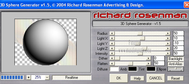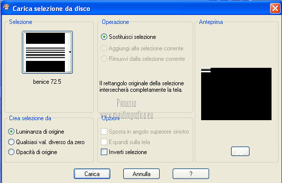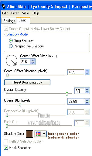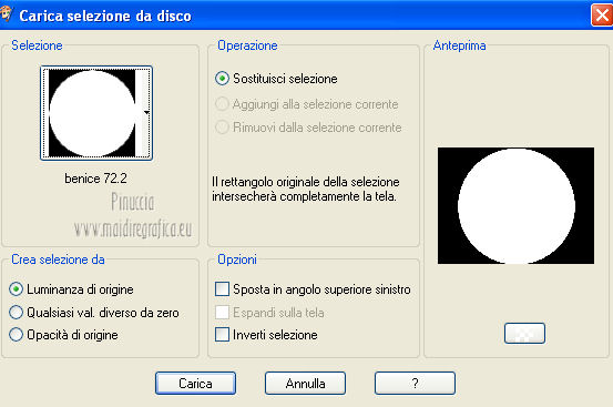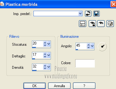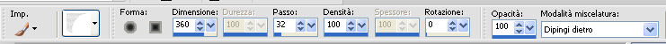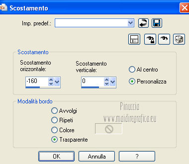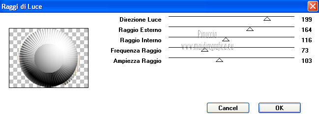qui puoi trovare qualche risposta ai tuoi dubbi. Se l'argomento che ti interessa non è presente, ti prego di segnalarmelo. Occorrente: Materiale qui Filtri: consulta, se necessario, la mia sezione filtri qui Filters Unlimited 2.0 qui Sandflower Specials (da importare in Unlimited) qui VM Extravaganza qui Richard Rosenamn - 3D Sphere Generator qui Italian Editors Effect qui Alien Skin Eye Candy 5 Impact qui I filtri VM Extravaganza e Italian Editors si possono usare da soli, o importati in Filters Unlimited. Come importare un filtro in Unlimited qui ![]() Importa il pennello in PSP. Vedi gli appunti sui pennelli qui Metti le selezioni nella cartella Selezioni. Imposta il colore di primo piano con #faf7f2, e il colore di sfondo con #644028. ![]() 1. Apri una nuova immagine trasparente 800 x 600 pixels. Selezione>Seleziona tutto. Apri l'immagine Achtergrond les 72, e vai a Modifica>Copia. Torna al tuo lavoro e vai a Modifica>Incolla nella selezione. Selezione>Deseleziona. Effetti>Effetti di bordo>Aumenta di più. Livelli>Duplica. Livelli>Duplica. Effetti>Effetti di bordo>Aumenta. Cambia la modalità di miscelatura di questo livello in Filtra. Livelli>Unisci>Unisci visibile. 2. Livelli>Duplica. Effetti>Plugins>Filters Unlimited 2.0 - Sandflower Specials - Page Curl Top Vertical. ![]() Immagine>Ridimensiona - 120 x 100%, tutti i livelli e mantieni proporzioni non selezionato. ![]() Effetti>Effetti di immagine>Scostamento. ![]() Livelli>Duplica. Immagine>Rifletti. Immagine>Capovolgi. Abbassa l'opacità di questo livello al 50%. Livelli>Unisci>Unisci giù. Immagine>Rifletti. Abbassa l'opacità di questo livello al 20%. 3. Livelli>Duplica. Effetti>Effetti di trama>Plastica morbida. ![]() Cambia la modalità di miscelatura di questo livello in Colore, e lascia l'opacità a 20. 4. Selezione>Carica/Salva selezione>Carica selezione da disco. Cerca e carica la selezione Benice 72.1. ![]() Selezione>Innalza selezione a livello. Cambia la modalità di miscelatura di questo livello in Luce diffusa. Immagine>Ruota a sinistra. se stai usando PSP 9: Immagine>Ruota - 90 gradi in senso antiorario Effetti>Plugins>Filters Unlimited 2.0 - VM Extravaganza - Transmission. ![]() Immagine>Ruota a destra. se stai usando Psp 9: Immagine>Ruota - 90 gradi in senso orario Abbassa l'opacità di questo livello al 40%. Selezione>Deseleziona. Effetti>Plugins>Richard Rosenman - 3D Sphere Generator. ![]() 5. Livelli>Duplica. Effetti>Plugins>Italian Editors Effect - Raggi di Luce. ![]() Livelli>Duplica. Immagine>Rifletti. Immagine>Capovolgi. Livelli>Unisci>Unisci giù. Effetti>Effetti di bordo>Aumenta di più. 6. Selezione>Carica/Salva selezione>Carica selezione da disco. Cerca e carica la selezione Benice 72.2. ![]() Selezione>Inverti. Premi sulla tastiera il tasto CANC. Selezione>Deseleziona. 7. Selezione>Carica/Salva selezione>Carica selezione da disco. Cerca e carica la selezione Benice 72.3. ![]() Premi sulla tastiera il tasto CANC. Attiva il livello sottostante Selezione innalzata. Premi sulla tastiera il tasto CANC. Selezione>Deseleziona. 8. Attiva nuovamente il livello superiore. Apri il tube Benice Overlay e vai a Modifica>Copia. Torna al tuo lavoro e vai a Modifica>Incolla come nuovo livello. Regola>Messa a fuoco>Accentua messa a fuoco. Cambia la modalità di miscelatura di questo livello in Luce diffusa. Effetti>Plugins>Alien Skin Eye Candy 5 Impact - Perspective Shadow. Settings: Drop Shadow Blurry. Basic. ![]() 9. Livelli>Nuovo livello raster. Selezione>Carica/Salva selezione>Carica selezione da disco. Cerca e carica la selezione Benice 72.4. ![]() Riempi la selezione con il colore di primo piano.Selezione>Deseleziona. Effetti>Effetti 3D>Sfalsa ombra, colore #faf7f2. ![]() Modifica>Ripeti Sfalsa ombra. Regola>Messa a fuoco>Metti a fuoco. Effetti>Effetti geometrici>Cerchio. ![]() Effetti>Effetti di immagine>Scostamento. ![]() Livelli>Duplica. Immagine>Rifletti. Immagine>Capovolgi. Livelli>Unisci>Unisci giù. Effetti>Plugins>Alien Skin Eye Candy 5 Impact - Perspective Shadow Settings: Drop Shadow Blurry. Basic. ![]() 10. Livelli>Nuovo livello raster. Selezione>Carica/Salva selezione>Carica selezione da disco. Cerca e carica la selezione Benice 72.5. ![]() Riempi la selezione con il colore di primo piano.Selezione>Deseleziona. Effetti>Effetti di distorsione>Vento, da sinistra, intensità 100. ![]() Modifica>Ripeti Vento. Effetti>Effetti geometrici>Cerchio. ![]() Livelli>Duplica. Immagine>Rifletti. Immagine>Capovolgi. Effetti>Effetti di immagine>Scostamento. ![]() Livelli>Unisci>Unisci giù. Effetti>Plugins>Alien Skin Eye Candy 5 Impact - Perspective Shadow. Settings: Drop Shadow Lowest. Basic. ![]() 11. Livelli>Nuovo livello raster. Attiva lo strumento Pennello ![]() Cerca e seleziona il pennello Benice_brush_cirkels_001, con i seguenti settaggi. ![]() Applica il pennello in alto a destra, cliccando con il tasto sinistro del mouse, per usare il colore di primo piano. ![]() Livelli>Duplica. Immagine>Rifletti. Immagine>Capovolgi. Livelli>Unisci>Unisci giù. Regola>Messa a fuoco>Metti a fuoco. 12. Livelli>Nuovo livello raster. Selezione>Carica/Salva selezione>Carica selezione da disco. Cerca e carica la selezione Benice 72.6. ![]() Riempi la selezione con il colore di primo piano.Selezione>Modifica>Contrai - 3 pixels. Premi sulla tastiera il tasto CANC. Livelli>Nuovo livello raster. Apri il tube 1220640144_fleurs e vai a Modifica>Copia. Torna al tuo lavoro e vai a Modifica>Incolla nella selezione. Selezione>Deseleziona. Cambia la modalità di miscelatura di questo livello in Filtra. Livelli>Duplica. Riporta la modalità di miscelatura di questo livello a Normale, e abbassa l'opacità al 36%. Effetti>Effetti di bordo>Aumenta. 13. Livelli>Nuovo livello raster. Attiva nuovamente lo strumento Pennello ![]() Cerca e seleziona il pennello Benice_brush_tekst_005, con i seguenti settaggi. ![]() Applica il pennello nell'angolo in alto a sinistra, cliccando con il tasto sinistro del mouse, per usare il colore di primo piano. ![]