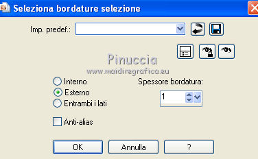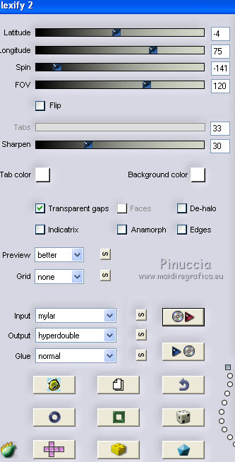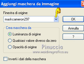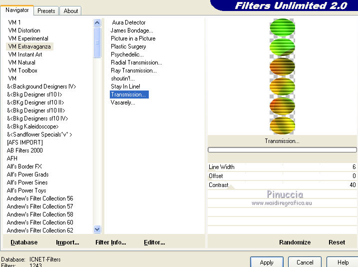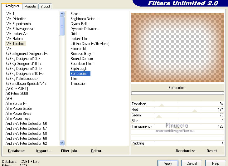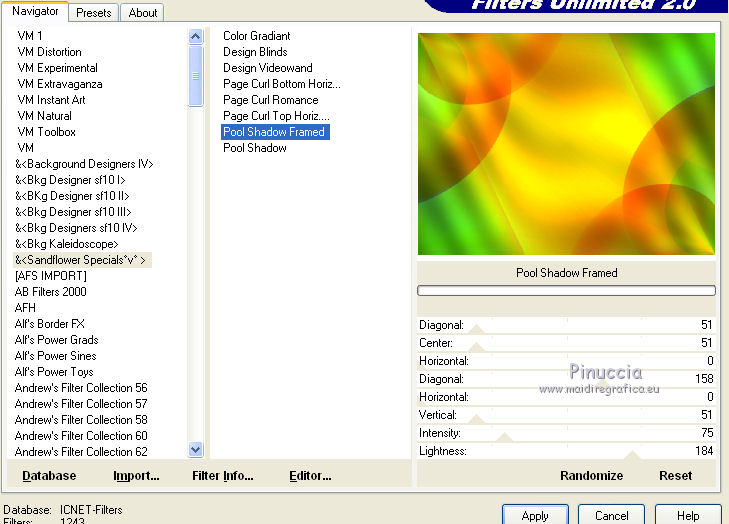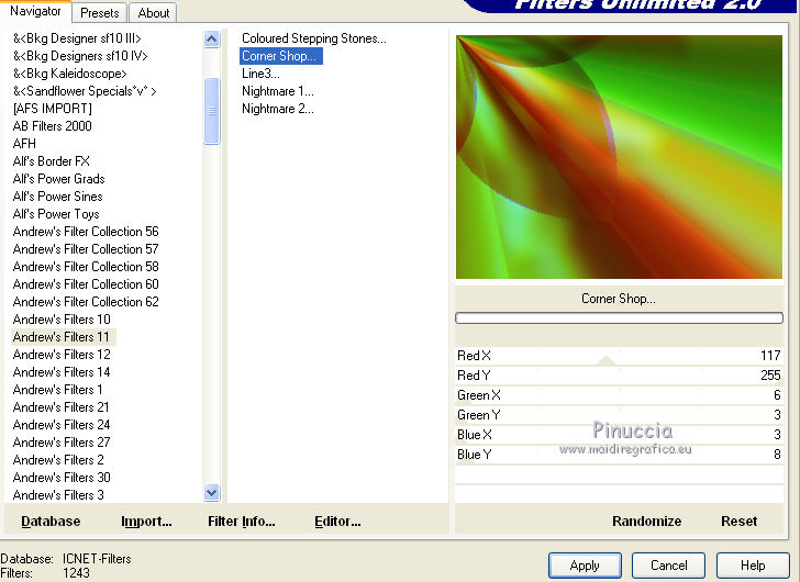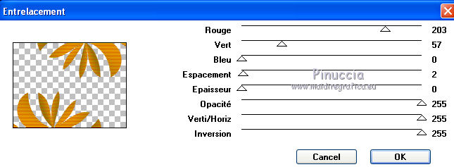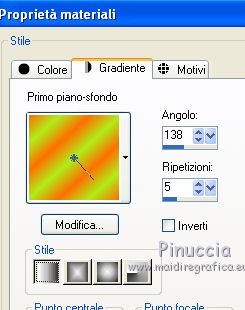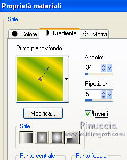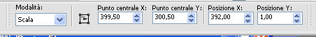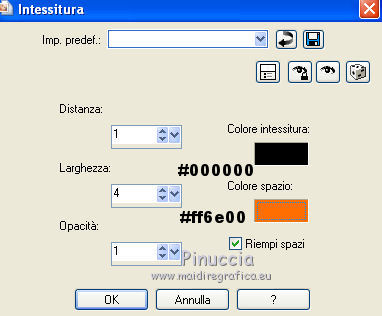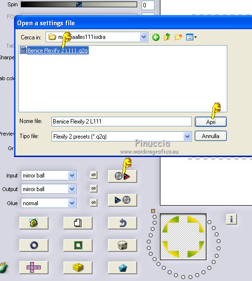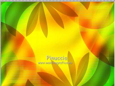 qui puoi trovare qualche risposta ai tuoi dubbi. Se l'argomento che ti interessa non è presente, ti prego di segnalarmelo. Occorrente: Materiale qui Il tube è di EricaWilma Filtri: consulta, se necessario, la mia sezione filtri qui Filters Unlimited 2.0 qui Andrew's Filter 1 qui Andrew's Filter 11 qui Andrew's Filter 30 qui Sandflower Specials (da importare in Unlimited) qui VM Toolbox qui VM Extravaganza qui Flaming Pear - Flexify 2 qui Entrelacement - Jeux de lignes qui I filtri Andrew's per essere usati devono prima essere convertiti. Come fare vedi qui Si usano importandoli in Filters Unlimited (come fare vedi qui) ma possono funzionare anche da soli. I filtri forniti sono stati già convertiti. Anche i filtri della serie Visman (VM Extravaganza, VM Toolbox) si possono usare da soli o importati in Unlimited. ![]() Metti il preset per Flexify2 nella cartella del materiale. Lo importerai da questa cartella, quando ti servirà. Metti il pennello nella cartella Pennelli. Attenzione, il pennello è composto da due files che non devono essere separati. Vedi gli appunti sui pennelli qui Ti servirà anche la maschera 20-20. Se non hai questa maschera prendila qui Metti la maschera nella cartella Maschere. Metti le selezioni nella cartella Selezioni. Apri la maschera di Cameron in PSP e minimizzala con il resto del materiale. Imposta il colore di primo piano con #fede01, e il colore di sfondo con #6aa208. ![]() Passa il colore di primo piano a Gradiente, stile Lineare. ![]() 1. Apri una nuova immagine trasparente 800 x 600 pixels. Selezione>Seleziona tutto. Apri l'immagine Achtergrond L111, e vai a Modifica>Copia. Torna al tuo lavoro e vai a Modifica>Incolla nella selezione. Selezione>Deseleziona. 2. Effetti>Plugins>Filters Unlimited 2.0 - Andrew's Filter 1 - Blur up. ![]() Livelli>Duplica. Immagine>Rifletti. Abbassa l'opacità di questo livello al 50%. Livelli>Unisci>Unisci giù. 3. Effetti>Effetti geometrici>Inclina. ![]() Livelli>Duplica. Immagine>Rifletti. Abbassa l'opacità di questo livello al 50%. Livelli>Unisci>Unisci giù. 4. Livelli>Duplica. Effetti>Plugins>Filters Unlimited 2.0 - Andrew's Filter 30 - Pleased To Take Home. ![]() Cambia la modalità di miscelatura di questo livello in Luce diffusa. Livelli>Unisci>Unisci giù. 5. Effetti>Plugins>Filters Unlimited 2.0 - Andrew's Filter 11 - Corner Shop. ![]() Livelli>Duplica. Immagine>Rifletti. Immagine>Capovolgi. Abbassa l'opacità di questo livello al 50%. Livelli>Unisci>Unisci giù. Livelli>Duplica. Cambia la modalità di miscelatura di questo livello in Luce netta. Livelli>Unisci>Unisci giù. Effetti>Plugins>Filters Unlimited 2.0 - &<Sandflower Specials> - Pool Shadow Framed. ![]() 6. Livelli>Nuovo livello raster. Selezione>Carica/Salva selezione>Carica selezione da disco. Cerca e carica la selezione Benice 111.1. ![]() Riempi la selezione con il gradiente.Selezione>Deseleziona. Effetti>Plugins>Flaming - Flexify 2. Clicca sull'icona indicata nella schermata, seleziona il preset Benice Flexify 2 L111. Clicca Apri. ![]() e avrai questo ricorda che i preset sono settaggi salvati per usarli in futuro senza doverli reimpostare. Se hai problemi con i preset, puoi impostare manualmente i settaggi che vedi nella schermata ![]() Effetti>Plugins>Jeux de lignes - Entrelacement. ![]() Cambia la modalità di miscelatura di questo livello in Moltiplica, e abbassa l'opacità al 50%. Finestra>Duplica (o, sulla tastiera, maiuscola+D) per fare una copia. Minimizza il duplicato che userai più tardi. 7. Torna al tuo lavoro originale. Attiva il livello inferiore. Selezione>Carica/Salva selezione>Carica selezione da disco. Cerca e carica la selezione Benice 111.2. ![]() Selezione>Innalza selezione a livello. Selezione>Deseleziona. Livelli>Disponi>Porta in alto. Effetti>Plugins>Filters Unlimited 2.0 - VM Extravaganza - Transmission. ![]() Effetti>Effetti di bordo>Aumenta. Effetti>Effetti di distorsione>Vento - da destra, intensità 100. ![]() Immagine>Rifletti. Effetti>Effetti di immagine>Scostamento. ![]() 8. Apri il tube EWvector 04. Su questo tube: Livelli>Carica/Salva maschera>Carica maschera da disco. Cerca e carica la maschera 20-20. ![]() Livelli>Unisci>Unisci gruppo. Ripeti: Livelli>Carica/Salva maschera>Carica maschera da disco. Carica nuovamente la maschera 20-20. ![]() Livelli>Unisci>Unisci gruppo. Modifica>Copia. Torna al tuo lavoro e vai a Modifica>Incolla come nuovo livello. Premi il tasto D per attivare lo strumento Deformazione ![]() e imposta manualmente i settaggi per la posizione. ![]() Premi sulla tastiera il tasto M per liberarti della griglia dello strumento. (chiudi il tube senza salvare le modifiche). 9. Livelli>Nuovo livello raster. Effetti>Plugins>Filters Unlimited 2.0 - VM Toolbox - Softborder. ![]() 10. Livelli>Unisci>Unisci tutto. Immagine>Aggiungi bordatura, 3 pixels, simmetriche, con il colore #f6ac20. Immagine>Ridimensiona, al 65%, tutti i livelli selezionato. Regola>Messa a fuoco>Metti a fuoco. Minimizza l'immagine che userai tra poco. 11. Attiva il duplicato minimizzato al punto 6. ![]() Questa sarà la nuova base del tuo lavoro. Attiva il livello superiore. Immagine>Rifletti. Attiva il livello inferiore. Immagine>Rifletti. 12. Rimani posizionato sul livello inferiore. Livelli>Duplica. Effetti>Effetti di trama>Intessitura. ![]() Cambia la modalità di miscelatura di questo livello in Luce netta. 13. Imposta il colore di primo piano con #ff6e00, e il colore di sfondo con #afed19. ![]() Passa il colore di primo piano a Gradiente, stile lineare. ![]() 14. Attiva il livello inferiore. Livelli>Nuovo livello raster. Riempi il livello con il gradiente.Livelli>Nuovo livello maschera>Da immagine. Apri il menu sotto la finestra di origine e vedrai la lista dei files aperti. Seleziona la maschera maskcameron297, con i seguenti settaggi: ![]() Livelli>Unisci>Unisci gruppo. Immagine>Ridimensiona, al 120%, tutti i livelli non selezionato. Effetti>Effetti di bordo>Aumenta. 15. Attiva il livello superiore. Selezione>Seleziona tutto. 