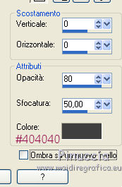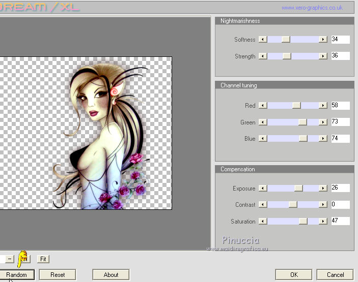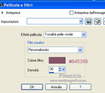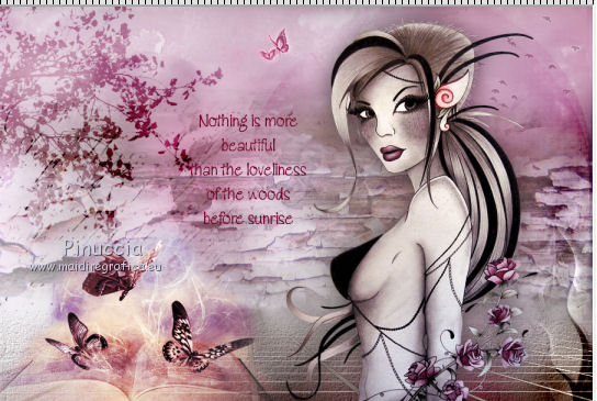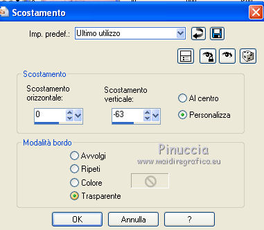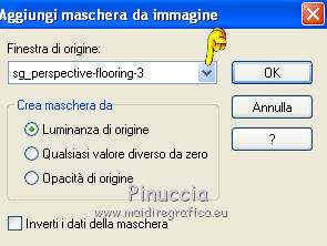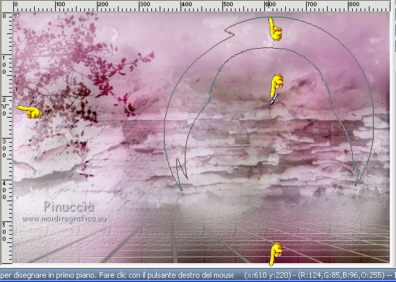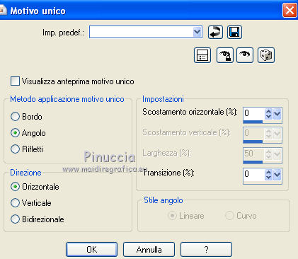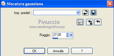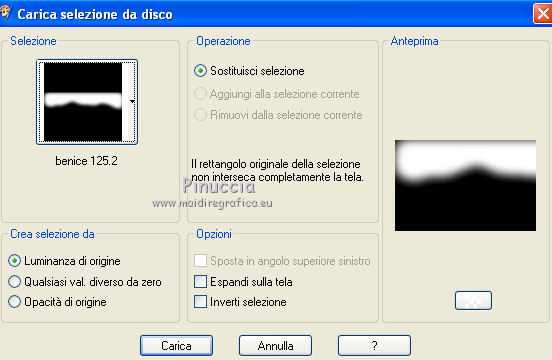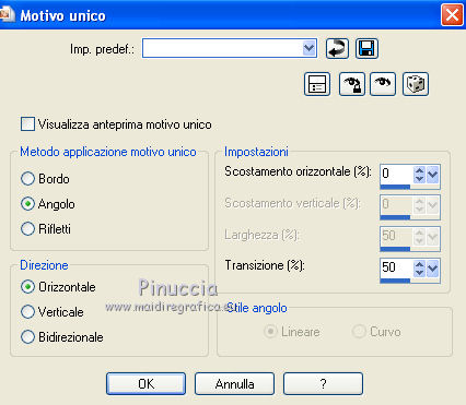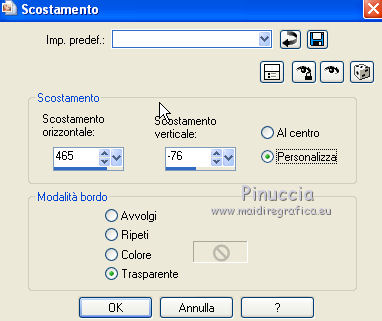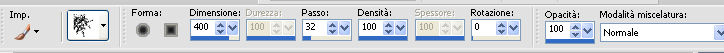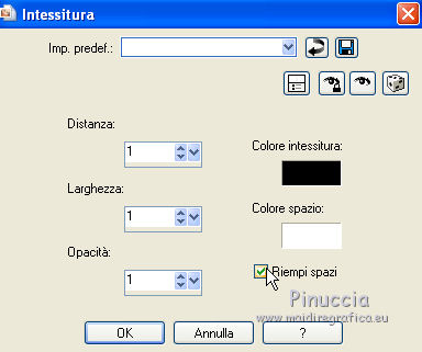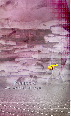 qui puoi trovare qualche risposta ai tuoi dubbi. Se l'argomento che ti interessa non è presente, ti prego di segnalarmelo. Occorrente: Materiale qui Il tube della donna è di Jenny ![]() Metti i pennelli nella cartella Pennelli. Attenzione, ogni pennello è composto da due files che non devono essere separati. Vedi gli appunti sui pennelli qui La trama Corel_15_036 è standard nelle nuove versioni di PSP, e corrisponde alla trama standard Calcestruzzo delle versioni precedenti Se non la trovi nel tuo PSP, metti quella fornita nella cartella Trame. sulle diverse denominazioni degli strumenti vedi qui Metti le selezioni nella cartella Selezioni. Apri la maschera in PSP e minimizzala con il resto del materiale. Imposta il colore di primo piano con #766d68. ![]() 1. Apri una nuova immagine trasparente 900 x 600 pixels. Selezione>Seleziona tutto. Apri l'immagine Bg Les125 e vai a Modifica>Copia. Torna al tuo lavoro e vai a Modifica>Incolla nella selezione. Selezione>Deseleziona. 2. Apri il tube Jen_Vroux 427_16-04-2011 e vai a Modifica>Copia. Torna al tuo lavoro e vai a Modifica>Incolla come nuovo livello. Regola>Sfocatura>Sfocatura gaussiana - raggio 100. ![]() Effetti>Effetti di immagine>Motivo unico. ![]() Cambia la modalità di miscelatura di questo livello in Saturazione (esistente). Livelli>Unisci>Unisci giù. Effett>Effetti di immagine>Motivo unico. ![]() Regola>Sfocatura>Sfocatura gaussiana - raggio 17. ![]() Livelli>Duplica. Cambia la modalità di miscelatura di questo livello in Rafforza, e abbassa l'opacità al 50%. Livelli>Unisci>Unisci giù. 3. Livelli>Nuovo livello raster. Selezione>Seleziona tutto. Apri l'immagine Textures_74 e vai a Modifica>Copia. Torna al tuo lavoro e vai a Modifica>Incolla nella selezione. Selezione>Deseleziona. Cambia la modalità di miscelatura di questo livello in Luminanza (esistente), e abbassa l'opacità al 39%. Livelli>Duplica. Cambia la modalità di miscelatura di questo livello in Rafforza, e abbassa l'opacità al 27%. Livelli>Unisci>Unisci visibile. 4. Apri il tube Benice_L125 boomschors e vai a Modifica>Copia. Torna al tuo lavoro e vai a Modifica>Incolla come nuovo livello. (Il tube è già impostato in modalità di miscelatura Luce netta, opacità 43). Effetti>Effetti di immagine>Scostamento. ![]() Livelli>Unisci>Unisci giù. 5. Selezione>Carica/Salva selezione>Carica selezione da disco. Cerca e carica la selezione Benice 125.1. ![]() Selezione>Innalza selezione a livello. Regola>Sfocatura>Sfocatura gaussiana - raggio 27. ![]() Effetti>Effetti di trama>Trama - seleziona la trama Corel-15-036 o Calcestruzzo. ![]() Selezione>Deseleziona. Cambia la modalità di miscelatura di questo livello in Rafforza, e abbassa l'opacità al 40%. Livelli>Unisci>Unisci giù. 6. Livelli>Nuovo livello raster. Riempi il livello con il colore di primo piano.Livelli>Nuovo livello maschera>Da immagine. Apri il menu sotto la finestra di origine e vedrai la lista dei files aperti. Seleziona la maschera sg_perspective-flooring-3. ![]() Livelli>Unisci>Unisci gruppo. Effetti>Effetti di bordo>Aumenta. Effetti>Effetti di immagine>Scostamento. ![]() Livelli>Unisci>Unisci visibile. 7. Selezione>Carica/Salva selezione>Carica selezione da disco. Cerca e carica la selezione Benice 125.2. ![]() Selezione>Innalza selezione a livello. Regola>Sfocatura>Sfocatura gaussiana - raggio 30. ![]() Selezione>Deseleziona. Immagine>Ridimensiona - 110 x 100%, tutti i livelli e mantieni proporzioni non selezionato. ![]() Effetti>Effetti di immagine>Scostamento. ![]() 8. Apri il tube Benice L125 wolken e vai a Modifica>Copia. Torna al tuo lavoro e vai a Modifica>Incolla come nuovo livello. Sposta il tube contro il bordo superiore.Regola>Messa a fuoco>Metti a fuoco. Livelli>Unisci>Unisci visibile. 9. Livelli>Nuovo livello raster. Attiva lo strumento Pennello ![]() cerca e seleziona il pennello Tree_borders_brushes_2_by_forestgirlstock-dzycrx0_46 ![]() applica il pennello nell'angolo in alto a sinistra, cliccando con il tasto sinistro del mouse per usare il colore di primo piano. ![]() Cambia la modalità di miscelatura di questo livello in Rafforza. 10. Imposta il colore di primo piano con #98134d. ![]() Livelli>Nuovo livello raster. Se non visualizzi i righelli, vai a Visualizza>Righelli. Attiva nuovamente lo strumento Pennello ![]() cerca e seleziona il pennello Designal_brushes_2_14 ![]() riduci l'immagine all'80% usando la rotellina del mouse, e applica il pennello cliccando nella coordinata x:610 y:220 con il tasto sinistro del mouse, per usare il colore di primo piano. ![]() se il tuo PSP non supporta pennelli superiori a 500 pixels, imposta il pennello alla dimensione massima consentita e, dopo averlo applicato, premi il tasto D per attivare lo strumento Deformazione ![]() e allarga il pennello pressappoco come nell'esempio. ![]() Effetti>Effetti di trama>Intessitura. ![]() Cambia la modalità di miscelatura di questo livello in Rafforza, e abbassa l'opacità al 49%. Se non vuoi più vedere i righelli, vai nuovamente a Visualizza>Righelli e spariranno. 11. Attiva lo strumento Gomma ![]() ![]() e cancella a destra la punta del pennello. ![]() Livelli>Duplica. Cambia la modalità di miscelatura di questo livello in Indebolisci, e abbassa l'opacità al 36%. 12. Apri il tube KTS_Tz03 copie e vai a Modifica>Copia. Torna al tuo lavoro e vai a Modifica>Incolla come nuovo livello. Immagine>Ridimensiona, al 75%, tutti i livelli non selezionato, non dimenticare di rimettere la selezione a Mantieni proporzioni. Effetti>Effetti di immagine>Scostamento. ![]() Livelli>Duplica. Regola>Tonalità e saturazione>Viraggio. ![]() Cambia la modalità di miscelatura di questo livello in Luce netta, e abbassa l'opacità al 72%. 13. Apri il tube Immortality2_lizztish e vai a Modifica>Copia. Torna al tuo lavoro e vai a Modifica>Incolla come nuovo livello. Regola>Tonalità e saturazione>Viraggio. ![]() Effetti>Effetti di immagine>Scostamento. ![]() Regola>Messa a fuoco>Accentua messa a fuoco. 14. Apri il tube Birds_in