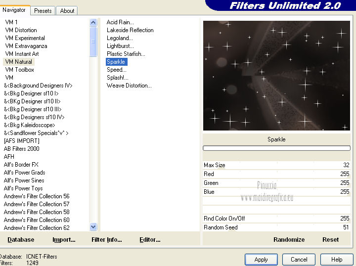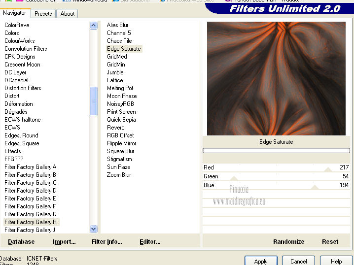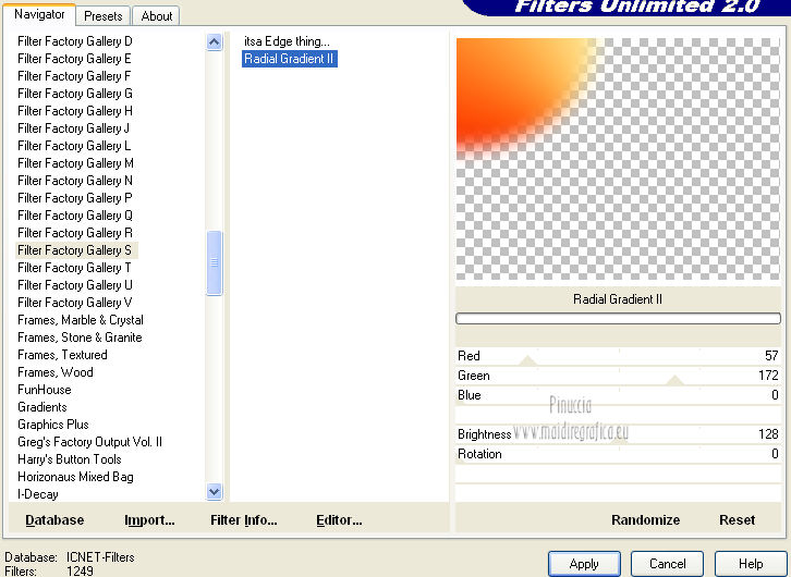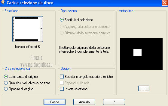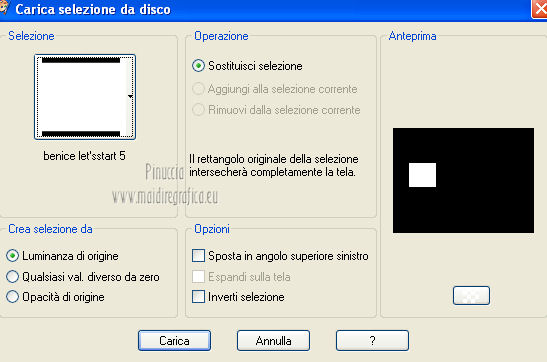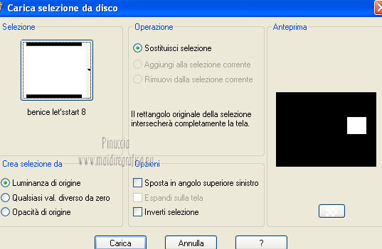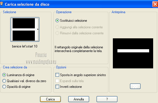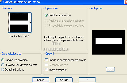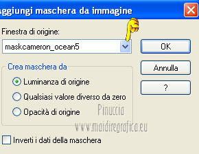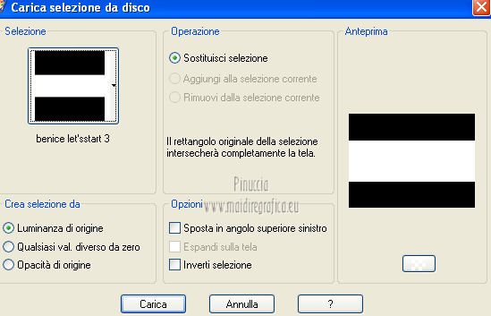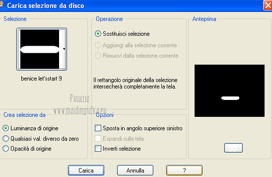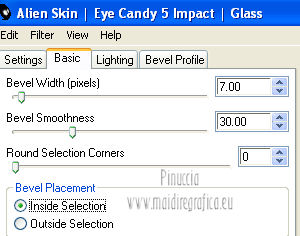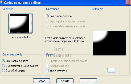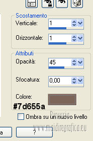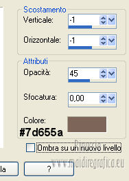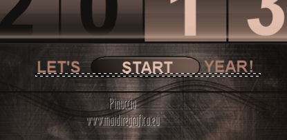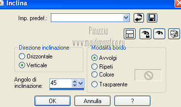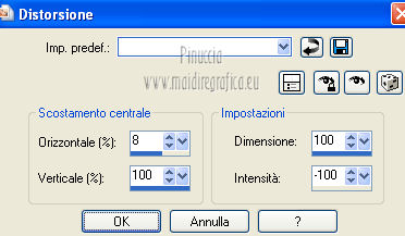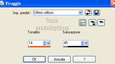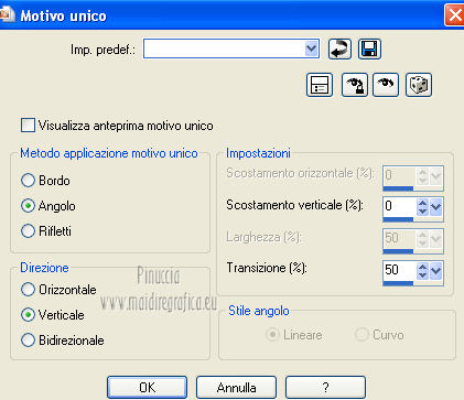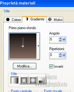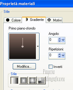 qui puoi trovare qualche risposta ai tuoi dubbi. Se l'argomento che ti interessa non è presente, ti prego di segnalarmelo. Occorrente: Materiale qui Filtri: consulta, se necessario, la mia sezione filtri qui Filters Unlimited 2.0 qui Filter Factory Gallery H qui Filter Factory Gallery S qui VM Natural qui I filtri Factory Gallery per essere usati devono prima essere convertiti. Come fare vedi qui Si usano importandoli in Filters Unlimited (come fare vedi qui) ma possono funzionare anche da soli. Le Factory fornite sono state già convertite. Anche i filtri VM Natural possono funzionare da soli o importati in Filters Unlimited. ![]() Metti le selezioni nella cartella Selezioni. Apri le maschere in PSP e minimizzala con il resto del materiale. Imposta il colore di primo piano con #141211, e il colore di sfondo con #876c61. ![]() 1. Apri una nuova immagine trasparente 800 x 600 pixels. Selezione>Seleziona tutto. Apri l'immagine Mod_article1695344_7 e vai a Modifica>Copia. Torna al tuo lavoro e vai a Modifica>Incolla nella selezione. Selezione>Deseleziona. 2. Livelli>Nuovo livello raster. Selezione>Seleziona tutto. Apri Overlay plaatje e vai a Modifica>Copia. Torna al tuo lavoro e vai a Modifica>Incolla nella selezione. Selezione>Deseleziona. Cambia la modalità di miscelatura di questo livello in Moltiplica, e abbassa l'opacità al 39%. Livelli>Unisci>Unisci giù. 3. Effetti>Effetti di immagine>Motivo unico. ![]() Effetti>Effetti geometrici>Inclina. ![]() Effetti>Effetti di distorsione>Distorsione. ![]() Immagine>Ridimensiona. ![]() Immagine>Capovolgi. 4. Selezione>Carica/Salva selezione>Carica selezione da disco. Cerca e carica la selezione Benice let'sstart 1. ![]() Selezione>Innalza selezione a livello. Selezione>Deseleziona. Immagine>Rifletti. Immagine>Capovolgi. Livelli>Unisci>Unisci giù. 5. Livelli>Duplica. Effetti>Plugins>Filters Unlimited 2.0 - Filter Factory Gallery H - Edge Saturate. ![]() Cambia la modalità di miscelatura di questo livello in Sovrapponi, e abbassa l'opacità al 26%. Livelli>Unisci>Unisci giù. 6. Selezione>Carica/Salva selezione>Carica selezione da disco. Cerca e carica la selezione Benice let'sstart 2. ![]() Selezione>Innalza selezione a livello. Selezione>Deseleziona. Effetti>Plugins>Filters Unlimited 2.0 - Filter Factory Gallery S - Radial Gradiente 11. ![]() Livelli>Duplica. Immagine>Rifletti. Immagine>Capovolgi. Livelli>Unisci>Unisci giù. Cambia la modalità di miscelatura di questo livello in Indebolisci, e abbassa l'opacità al 27%. Livelli>Unisci>Unisci giù. 7. Livelli>Duplica. Effetti>Effetti di trama>Manto. ![]() Regola>Tonalità e saturazione>Viraggio. ![]() Cambia la modalità di miscelatura di questo livello in Indebolisci, e abbassa l'opacità al 50%. Livelli>Duplica. Riporta la modalità di miscelatura di questo livello a Normale, e aumenta l'opacità al 46%. Livelli>Unisci>Unisci visibile. 8. Livelli>Nuovo livello raster. Riempi il livello con il colore di primo piano.Livelli>Nuovo livello maschera>Da immagine. Apri il menu sotto la finestra di origine e vedrai la lista dei files aperti. Seleziona la maschera maskcameron_ocean5, con i seguenti settaggi: ![]() Livelli>Unisci>Unisci gruppo. Livelli>Unisci>Unisci giù. Finestra>Duplica (o sulla tastiera maiuscola+D) per fare una copia. Minimizza il duplicato e torna al tuo lavoro originale. 9. Livelli>Nuovo livello raster. Selezione>Carica/Salva selezione>Carica selezione da disco. Cerca e carica la selezione Benice let'sstart 3. ![]() Riempi la selezione con il colore di primo piano.Selezione>Modifica>Contrai - 3 pixels. Premi sulla tastiera il tasto CANC. Selezione>Deseleziona. 10. Livelli>Nuovo livello raster. Selezione>Carica/Salva selezione>Carica selezione da disco. Cerca e carica la selezione Benice let'sstart 4. ![]() Riempi la selezione con il colore di primo piano.Selezione>Deseleziona. Effetti>Effetti 3D>Sfalsa ombra. ![]() Effetti>Effetti 3D>Sfalsa ombra. ![]() 11. Passa il colore di primo piano a Gradiente, stile lineare. ![]() Livelli>Nuovo livello raster. Selezione>Carica/Salva selezione>Carica selezione da disco. Cerca e carica la selezione Benice let'sstart 5. ![]() Riempi la selezione con il gradiente.Selezione>Deseleziona. 12. Selezione>Carica/Salva selezione>Carica selezione da disco. Cerca e carica la selezione Benice let'sstart 6. ![]() Riempi la selezione con il gradiente.Selezione>Deseleziona. 13. Cambia i settaggi del gradiente selezionando Inverti. ![]() Selezione>Carica/Salva selezione>Carica selezione da disco. Cerca e carica la selezione Benice let'sstart 7. ![]() Riempi la selezione con il gradiente.Selezione>Deseleziona. 14. Selezione>Carica/Salva selezione>Carica selezione da disco. Cerca e carica la selezione Benice let'sstart 8. ![]() Riempi la selezione con il gradiente.Selezione>Deseleziona. Livelli>Unisci>Unisci giù. 15. Riporta il colore di primo piano al colore iniziale #141211. Livelli>Nuovo livello raster. Selezione>Carica/Salva selezione>Carica selezione da disco. Cerca e carica la selezione Benice let'sstart 9. ![]() Riempi la selezione con il colore di primo piano.Selezione>Modifica>Contrai - 2 pixels. Riporta il colore di primo piano a Gradiente, con i seguenti settaggi. ![]() Riempi la selezione con il gradiente.Selezione>Deseleziona. Livelli>Duplica. Effetti>Plugins>Alien Skin Eye Candy 5 Impact - Glass. Seleziona il preset Clear e ok. per il mio esempio, ho cambiato il settaggio Bevel Width ![]() Abbassa l'opacità di questo livello al 28%. Livelli>Unisci>Unisci giù. 16. Attiva il livello Raster 2. Selezione>Carica/Salva selezione>Carica selezione da disco. Cerca e carica la selezione Benice let'sstart 10. ![]() Selezione>Innalza selezione a livello. Selezione>Deseleziona. Cambia la modalità di miscelatura di questo livello in Filtra, e abbassa l'opacità al 17%. Imposta il colore di primo piano con #e0bdac, e il colore di sfondo con #141211. ![]() 17. Attiva il livello superiore. Attiva lo strumento Testo ![]() font Arial, con i seguenti settag