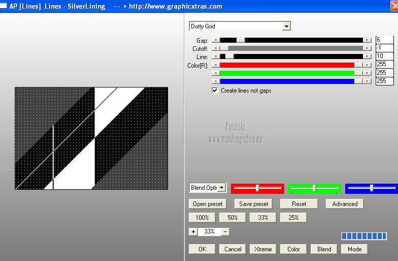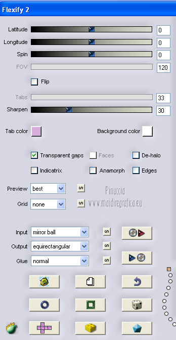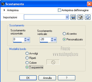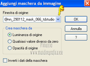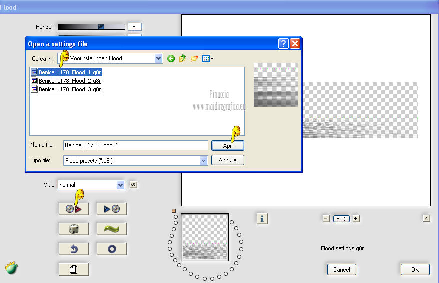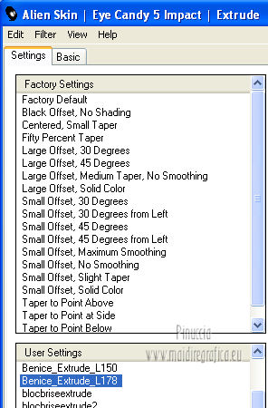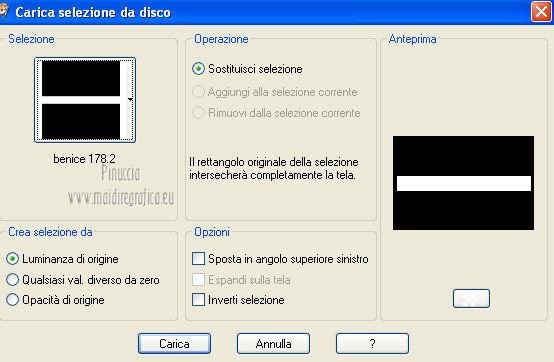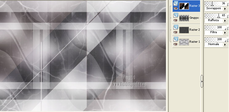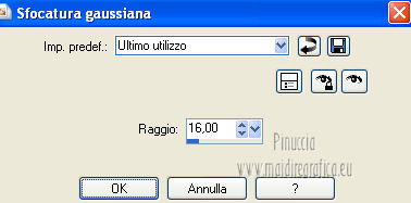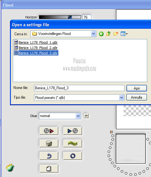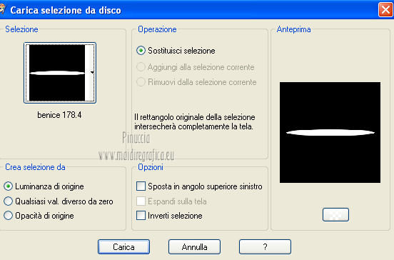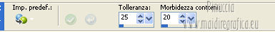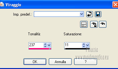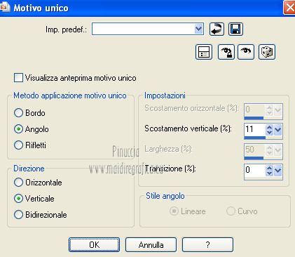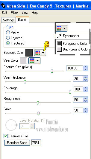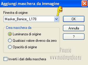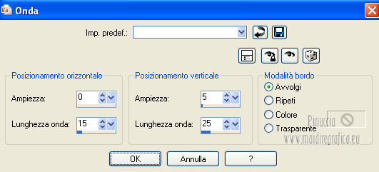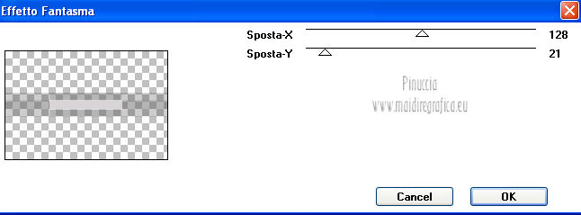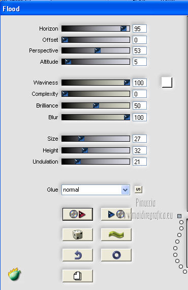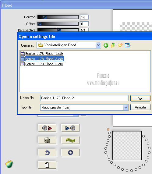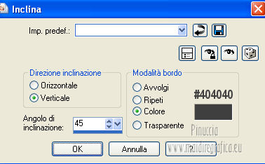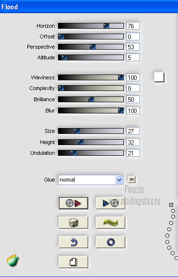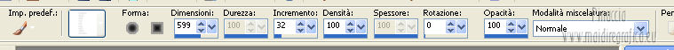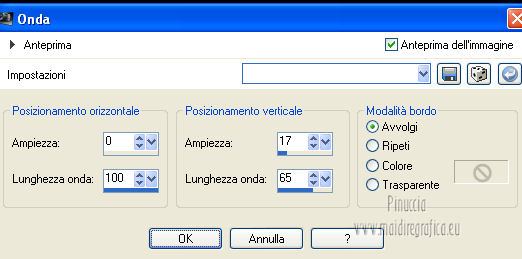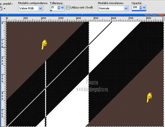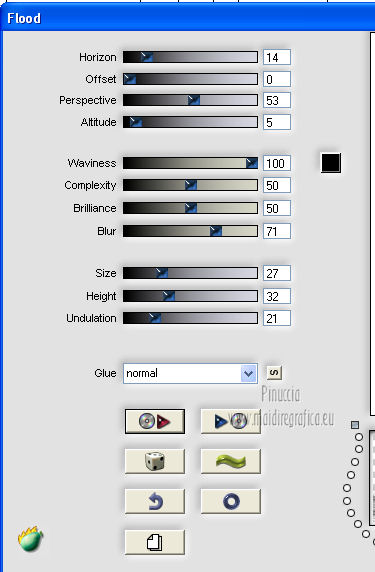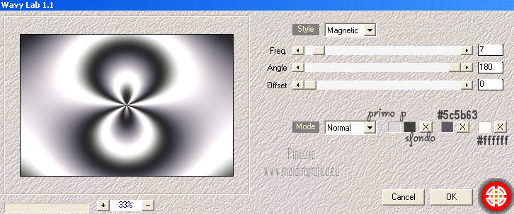 qui puoi trovare qualche risposta ai tuoi dubbi. Se l'argomento che ti interessa non è presente, ti prego di segnalarmelo. Occorrente: Materiale qui I due tubes sono di Guismo. Filtri: consulta, se necessario, la mia sezione filtri qui Flaming Pear - Flood qui Flaming Pear - Flexify 2 qui AP Lines - Lines SilverLining qui Alien Skin Eye Candy 5 Impact qui It@lian Editors Effect qui Alien Skin Eye Candy 5 Textures qui Mehdi - Wavy Lab 1.1 qui ![]() Metti il preset Benice_Extrude_L178 nella cartella del filtro Alien Skin Eye Candy 5 Impact>Settings>Extrude. Cliccando sul file una o due volte (a seconda delle tue impostazioni), automaticamente il preset si installerà nella cartella corretta. "Perchè uno o due clic?" vedi qui Metti il pennello nella cartella Pennelli. Attenzione, il pennello è composto da due files che non devono essere separati. Vedi gli appunti sui pennelli qui Metti i preset per Flaming Pear Flood in una cartella a tua scelta. Li importerai da questa cartella quando ti serviranno. Metti le selezioni nella cartella Selezioni. Apri le maschere in PSP e minimizzale con il resto del materiale. Imposta il colore di primo piano con #404040, e il colore di sfondo con #d9d4d8. ![]() 1. Apri una nuova immagine trasparente 900 x 600 pixels. Effetti>Plugins>Mehdi - Wavy Lab 1.1. i primi due colori sono automaticamente quelli impostati nella paletta dei materiali; imposta il terzo colore con #5c5b63 e il quarto con #ffffff. ![]() Effetti>Effetti di immagine>Motivo unico. ![]() Regola>Sfocatura>Sfocatura gaussiana - raggio 40. ![]() 2. Livelli>Nuovo livello raster. Riempi con il colore di primo piano.Livelli>Nuovo livello maschera>Da immagine. Apri il menu sotto la finestra di origine e vedrai la lista dei files aperti. Seleziona la maschera @nn-290112_mask_066, con i seguenti settaggi. ![]() Livelli>Unisci>Unisci gruppo. Effetti>Effetti di immagine>Motivo unico. ![]() Effetti>Effetti di distorsione>Onda. ![]() Cambia la modalità di miscelatura di questo livello in Filtra. Livelli>Unisci>Unisci giù. 3. Dovresti avere questo. ![]() 4. Livelli>Nuovo livello raster. Riempi con il colore di primo piano.Effetti>Plugins>Alien Skin Eye Candy 5 Impact - Textures - Marble. Bedrock Color: colore di primo piano. Vein Color: Colore di sfondo. ![]() Cambia la modalità di miscelatura di questo livello in Filtra. 5. Livelli>Nuovo livello raster. Riempi con il colore di primo piano.Livelli>Nuovo livello maschera>Da immagine. Apri il menu sotto la finestra di origine e seleziona la maschera Masker_Benice_L178. ![]() Livelli>Unisci>Unisci gruppo. Cambia la modalità di miscelatura di questo livello in Rafforza, e abbassa l'opacità al 65%. 6. Livelli>Nuovo livello raster. Selezione>Seleziona tutto. Apri l'immagine Patterncamerontags_black&white10 e vai a Modifica>Copia. Torna al tuo lavoro e vai a Modifica>Incolla nella selezione. Selezione>Deseleziona. Immagine>Ridimensiona, al 105%, tutti i livelli non selezionato. ![]() Effetti>Effetti di immagine>Scostamento. ![]() 7. Su questo livello: Attiva lo strumento Ritaglio ![]() seleziona l'opzione unito opaco e clicca sul segno di spunta a sinistra per applicare il ritaglio. ![]() Effetti>Effetti geometrici>Inclina - colore #404040. ![]() Selezione>Carica/Salva selezione>Carica selezione da disco. Cerca e carica la selezione Benice 178.1. ![]() Effetti>Plugins>AP Lines - SilverLining. ![]() 8. Imposta il colore di primo piano con #48342f. ![]() Attiva lo strumento Riempi colore ![]() con i seguenti settaggi ![]() Cliccando nell'angolo in alto a destra con il tasto sinistro del mouse per usare il colore di primo piano, avrai questo ![]() se stai usando versioni meno recenti di PSP, non avrai questo strumento. Imposta lo strumento Riempimento con i seguenti settaggi, e riempi con il colore di primo piano, cliccando negli angoli in alto a sinistra e in basso a destra. ![]() Cambia la modalità di miscelatura di questo livello in Sovrapponi, e abbassa l'opacità al 36%. 10. Dovresti avere questo. ![]() con Corel X, usando lo strumento Riempimento al posto di Cambia colore, dovresti avere questo. ![]() 11. Imposta il colore di primo piano con #000000. ![]() 12. Livelli>Nuovo livello raster. Attiva lo strumento Pennello ![]() cerca e seleziona il pennello Benice_L178, con i seguenti settaggi. ![]() Applica il pennello a sinistra, cliccando con il tasto sinistro del mouse, per usare il colore nero di primo piano. ![]() se il tuo PSP non supporta pennelli superiori a 500 pixels, imposta la dimensione massima di 500 pixels e, dopo aver applicato il pennello ![]() premi il tasto D per attivare lo strumento Deformazione ![]() in modalità Scala, usa i nodi centrali per allargare il pennello come nell'esempio. ![]() Livelli>Duplica. Immagine>Rifletti. Livelli>Unisci>Unisci giù. Abbassa l'opacità di questo livello al 50%. 13. Livelli>Nuovo livello raster. Selezione>Carica/Salva selezione>Carica selezione da disco. Cerca e carica la selezione Benice 178.2. ![]() Attiva lo strumento Riempimento ![]() e riempi la selezione con il colore di sfondo. Selezione>Deseleziona. Effetti>Plugins>Italian Editors Effects - Effetto Fantasma. ![]() Effetti>Plugins>Flexify 2. ![]() Effetti>Effetti di distorsione>Onda. ![]() Livelli>Duplica. Effetti>Effetti di immagine>Scostamento. ![]() Cambia la modalità di miscelatura di questo livello in Indebolisci, e abbassa l'opacità al 10%. Livelli>Unisci>Unisci visibile. 14. Imposta il colore di primo piano con il colore iniziale #404040. ![]() 15. Sullo stesso livello: Selezione>Carica/Salva selezione>Carica selezione da disco. Cerca e carica la selezione Benice 178.3. ![]() Regola>Sfocatura>Sfocatura gaussiana - raggio 16. ![]() Livelli>Nuovo livello raster. Riempi la selezione con il colore di primo piano.Clicca due volte per rafforzare il colore. Effetti>Plugins>Flaming Pear - Flood. Clicca sull'icona della freccia rossa cerca la cartella in cui hai salvato i preset e seleziona il preset Benice_L178_Flood_1; clicca Apri per appli