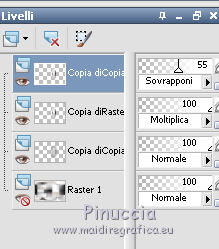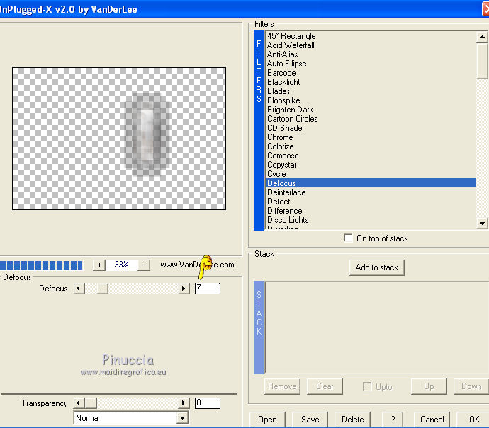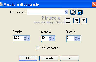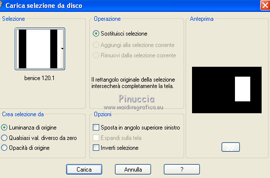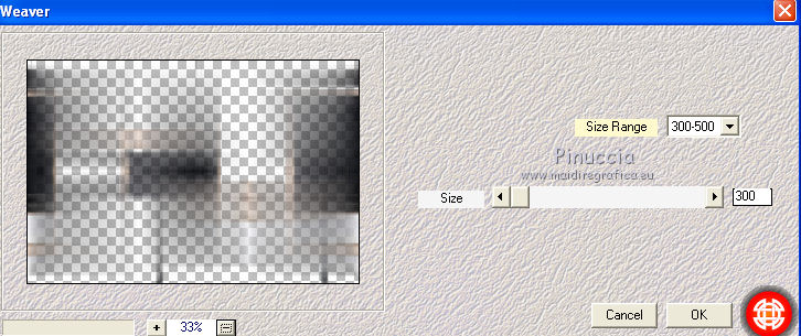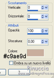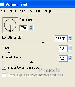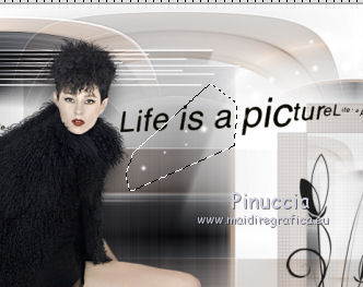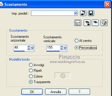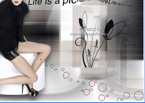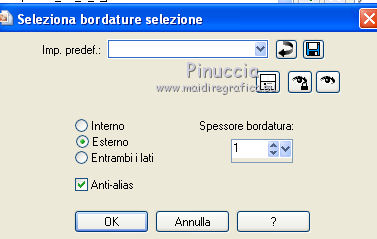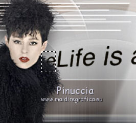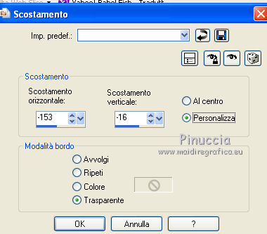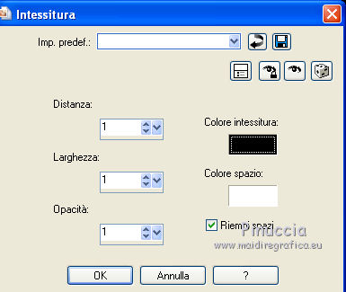 qui puoi trovare qualche risposta ai tuoi dubbi. Se l'argomento che ti interessa non è presente, ti prego di segnalarmelo. Occorrente: Materiale qui Il tube della donna è di Grace Filtri: consulta, se necessario, la mia sezione filtri qui Eye Candy 4000 qui Mehdi qui SuperRune Filters qui Vizros 4 qui VanDerLee - Unplugged-X qui ![]() Metti i pennelli nella cartella Pennelli. Attenzione, ogni pennello è composto da due files che non devono essere separati. Vedi gli appunti sui pennelli qui Metti le selezioni nella cartella Selezioni. Imposta il colore di primo piano con #ffffff, e il colore di sfondo con #000000. ![]() 1. Apri una nuova immagine trasparente 900 x 600 pixels e riempila con il colore di primo piano.2. Apri il tube Grace's_TLC-On_the_Box e vai a Modifica>Copia. non chiuderlo perchè ti servirà ancora Torna al tuo lavoro e vai a Modifica>Incolla come nuovo livello. Effetti>Effetti di immagine>Motivo unico. ![]() Effetti>Plugins>Mehdi - Weaver. ![]() Livelli>Unisci>Unisci giù. 3. Livelli>Duplica. Effetti>Plugins>SuperRune Filters - SuperCubic Reverse. ![]() Regola>Messa a fuoco>Accentua messa a fuoco. Livelli>Unisci>Unisci giù. Livelli>Duplica. Cambia la modalità di miscelatura di questo livello in Sovrapponi, e abbassa l'opacità al 50%. Livelli>Unisci>Unisci giù. 4. Livelli>Duplica. Selezione>Carica/Salva selezione>Carica selezione da disco. Cerca e carica la selezione Benice 120.1. ![]() Effetti>Plugins>Vizros 4 - Magnifier. ![]() Selezione>Inverti. Premi sulla tastiera il tasto CANC. Selezione>Deseleziona. Immagine>Ridimensiona - 60% x 90% - tutti i livelli e mantieni proporzioni non selezionato. ![]() 5. Livelli>Duplica. Effetti>Plugins>VanDerLee - Unplugged X. ![]() Effetti>Effetti di trama>Intessitura. ![]() Livelli>Disponi>Sposta giù. Attiva il livello superiore. Cambia la modalità di miscelatura di questo livello in Moltiplica. Livelli>Duplica. Cambia la modalità di miscelatura di questo livello in Sovrapponi, e abbassa l'opacità al 55%. Chiudi il livello inferiore, rimanendo posizionato sul livello superiore. ![]() Livelli>Unisci>Unisci visibile. Effetti>Effetti 3D>Sfalsa ombra, con il colore #c9ae9d. ![]() Riapri il livello inferiore. 6. Rimani posizionato sul livello superiore. Selezione>Seleziona tutto. Selezione>Mobile. Selezione>Modifica>Seleziona bordature selezione. ![]() Ingrandisci l'immagine almeno al 250%, per visualizzare meglio lo spazio da riempire,e riempi la selezione con il colore di sfondo.Selezione>Deseleziona. Effetti>Effetti di immagine>Scostamento. ![]() Abbassa l'opacità di questo livello al 56%. 7. Imposta il colore di primo piano con #ddc1b2. ![]() Livelli>Nuovo livello raster. Selezione>Carica/Salva selezione>Carica selezione da disco. Cerca e carica la selezione Benice 120.2. ![]() Riempi la selezione con il colore di sfondo.Selezione>Modifica>Contrai - 1 pixel. Livelli>Nuovo livello raster. Ingrandisci l'immagine al 250%,e riempi la selezione con il colore di primo piano.Selezione>Deseleziona. Cambia la modalità di miscelatura di questo livello in Luce netta. Livelli>Unisci>Unisci giù. Effetti>Plugins>Eye Candy 4000 - Motion Trail. ![]() 8. Imposta nuovamente il colore di primo piano con #ffffff. ![]() Livelli>Nuovo livello raster. Selezione>Carica/Salva selezione>Carica selezione da disco. Carica nuovamente la selezione Benice 120.2. ![]() Riempi la selezione con il colore di primo piano.Selezione>Deseleziona. Livelli>Unisci>Unisci giù. Cambia la modalità di miscelatura di questo livello in Sovrapponi. 9. Apri il tube Flowers e vai a Modifica>Copia. Torna al tuo lavoro e vai a Modifica>Incolla come nuovo livello. Sposta il tube come nell'esempio.![]() 10. Livelli>Nuovo livello raster. Attiva lo strumento Pennello ![]() Cerca e seleziona il pennello 4_Tiny_Tekst_Brushes_Large_By_Starlight_1986_50, con i seguenti settaggi ![]() Applica il pennello due volte a sinistra, cliccando con il tasto sinistro del mouse, per usare il colore di primo piano. ![]() Livelli>Duplica. Immagine>Rifletti. Livelli>Unisci>Unisci giù. Abbassa l'opacità di questo livello al 40%. 11. Apri il tube PWT03-SuddenlyArtistic e vai a Modifica>Copia. Torna al tuo lavoro e vai a Modifica>Incolla come nuovo livello. Effetti>Effetti di immagine>Scostamento. ![]() 12. Attiva nuovamente il tube Grace's_TLC_On_the_Box e vai a Modifica>Copia. Torna al tuo lavoro e vai a Modifica>Incolla come nuovo livello. Immagine>Ridimensiona, al 90%, tutti i livelli non selezionato, mantieni proporzioni selezionato. Regola>Messa a fuoco>Maschera di contrasto. ![]() Effetti>Effetti di immagine>Scostamento. ![]() Effetti>Effetti 3D>Sfalsa ombra. ![]() 13. Attiva il livello con il testo. Attiva lo strumento Selezione ![]() e seleziona la lettera alle spalle della donna. ![]() Premi sulla tastiera il tasto CANC. Selezione>Deseleziona. 14. Attiva il livello superiore. Livelli>Nuovo livello raster. Attiva nuovamente lo strumento Pennello ![]() Cerca e seleziona il pennello Designal brushes 1_399, con i seguenti settaggi. Attenzione, la rotazione è impostata a 180. ![]() Applica il pennello in basso a destra, cliccando con il tasto sinistro del mouse, per usare il colore di primo piano. ![]() Livelli>Duplica. Immagine>Capovolgi. 15. Attiva lo strumento Selezione a mano libera , da punto a punto,e traccia una selezione come nell'esempio. ![]() Premi sulla tastiera il tasto CANC. Selezione>Deseleziona. Livelli>Unisci>Unisci giù. 16. Livelli>Unisci>Unisci tutto. Immagine>Aggiungi bordatura, 1 pixel, simmetriche, con il colore #000000. Immagine>Aggiungi bordatura, 1 pixel, simmetriche, con il colore #ffffff. Aggiungi il tuo nome e/o il tuo watermark e salva in formato jpg. ![]() Se hai problemi o dubbi, o trovi un link non funzionante, o anche soltanto per un saluto, scrivimi 9 Settembre 2012 |