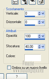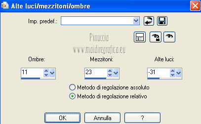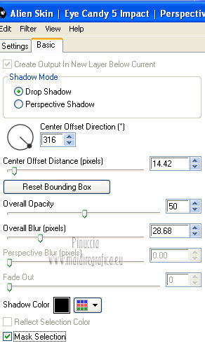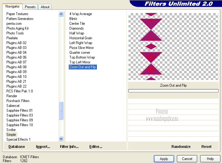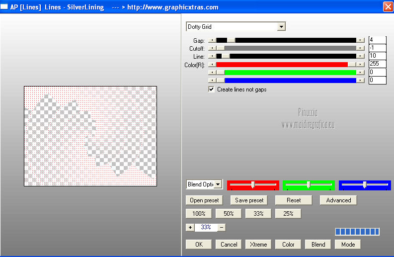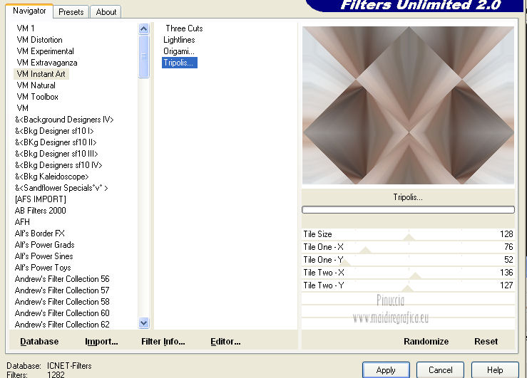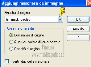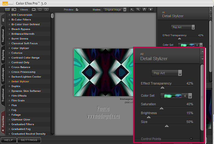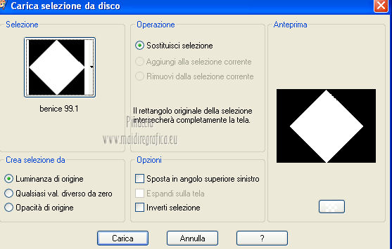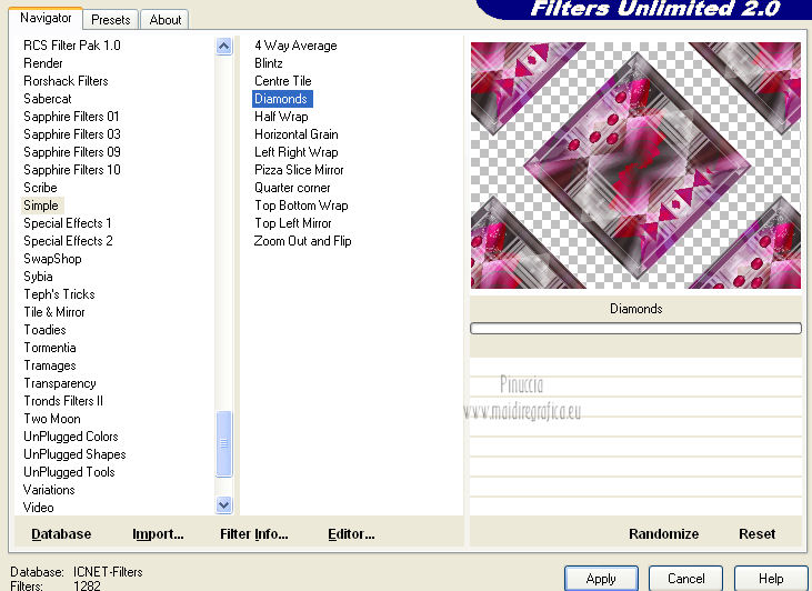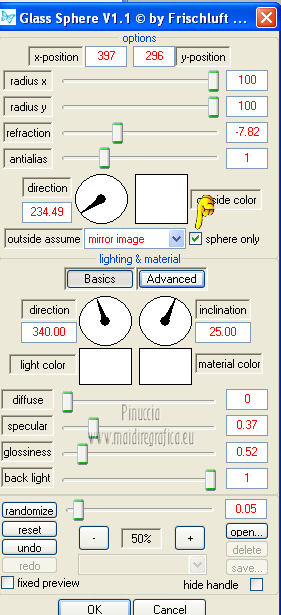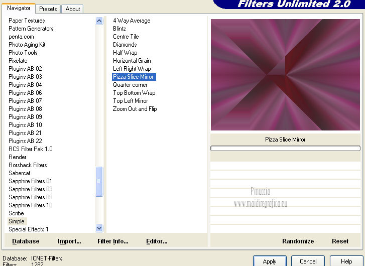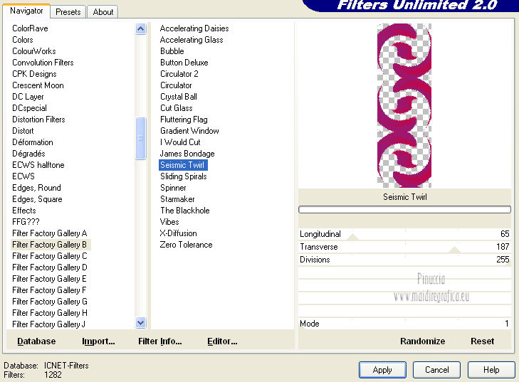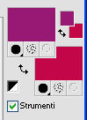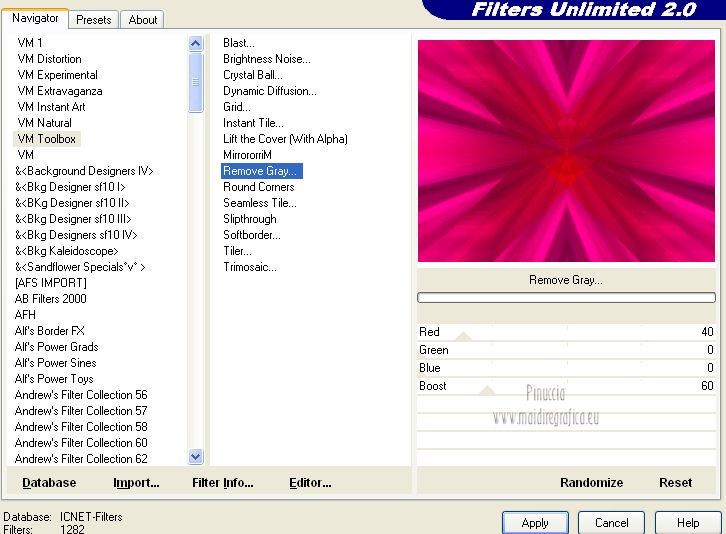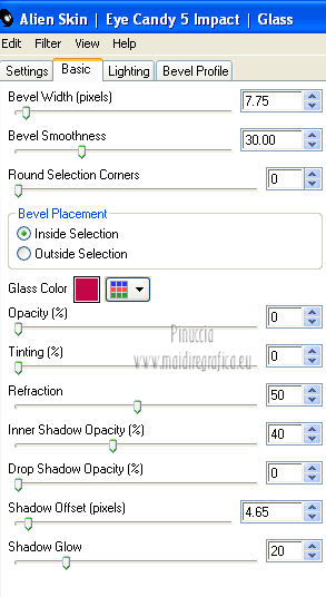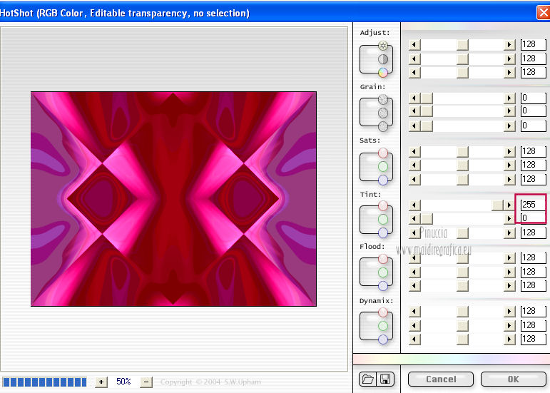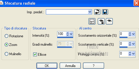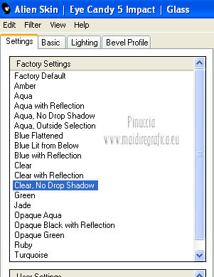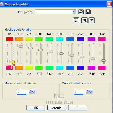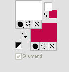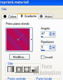 qui puoi trovare qualche risposta ai tuoi dubbi. Se l'argomento che ti interessa non è presente, ti prego di segnalarmelo. Occorrente: Materiale qui Filtri: consulta, se necessario, la mia sezione filtri qui Filters Unlimited 2.0 qui Filter Factory Gallery B qui AP Lines - Lines SilverLining qui Alien Skin Eye Candy 5 Impact qui Final Impact - HotShot qui Flair Frischluft qui Nik Software - Color Efex qui Simple qui VM Instant Art qui VM Toolbox qui I filtri Factory Gallery per essere usati devono prima essere convertiti. Come fare vedi qui Si usano importandoli in Filters Unlimited (come fare vedi qui) ma possono funzionare anche da soli. Le factory fornite sono state già convertite. Anche i filtri Simple, e i filtri che fanno parte della serie Visman (VM Instant Art, VM Toolbox), si possono usare da soli o importati in Unlimited. ![]() Metti le selezioni nella cartella Selezioni. Apri le maschere in PSP e minimizzale con il resto del materiale. Imposta il colore di primo piano con #ffffff, e il colore di sfondo con #c20647. ![]() 1. Apri una nuova immagine trasparente 800 x 600 pixels. Selezione>Seleziona tutto. Apri Benice BG L99 e vai a Modifica>Copia. Torna al tuo lavoro e vai a Modifica>Incolla nella selezione. Selezione>Deseleziona. Effetti>Plugins>Filters Unlimited 2.0 - VM Instant Art - Tripolis ![]() Effetti>Plugins>Simple - Top Left Mirror. ![]() Effetti>Plugins>Nik Software - Color Efex Pro: Detail Stylizer - Pop Art - Colorset 4 ![]() Effetti>Plugins>Final Impact - HotShot ![]() Finestra>Duplica (o, sulla tastiera, maiuscola+D) per fare una copia. Minimizza il duplicato che userai più tardi e torna al tuo lavoro originale. 2. Livelli>Nuovo livello raster. Riempi il livello con il colore di primo piano.Livelli>Nuovo livello maschera>Da immagine. Apri il menu sotto la finestra di origine e vedrai la lista dei files aperti. Seleziona la maschera jillbluemask130, con i seguenti settaggi: ![]() Livelli>Unisci>Unisci gruppo. Livelli>Unisci>Unisci giù. 3. Selezione>Carica/Salva selezione>Carica selezione da disco. Cerca e carica la selezione Benice 99.1. ![]() Selezione>Innalza selezione a livello. Selezione>Deseleziona. Immagine>Ruota per gradi - 90 gradi a sinistra. ![]() Cambia la modalità di miscelatura di questo livello in Filtra, e abbassa l'opacità al 50%. Livelli>Unisci>Unisci giù. 4. Livelli>Nuovo livello raster. Riempi il livello con il colore di primo piano.Livelli>Nuovo livello maschera>Da immagine. Apri il menu sotto la finestra di origine e seleziona la maschera hjr_mask_circles, con i seguenti settaggi: ![]() Livelli>Unisci>Unisci gruppo. Effetti>Plugins>AP Lines - Lines SilverLining. ![]() Cambia la modalità di miscelatura di questo livello in Saturazione (esistente). Livelli>Unisci>Unisci giù. 5. Imposta il colore di primo piano con #971a74. ![]() Passa il colore di primo piano a Gradiente, stile Lineare. ![]() 6. Livelli>Nuovo livello raster. Selezione>Carica/Salva selezione>Carica selezione da disco. Cerca e carica la selezione Benice 99.2. ![]() Riempi la selezione con il gradiente.Selezione>Deseleziona. Effetti>Plugins>Simple - Zoom Out and Flip ![]() Selezione>Seleziona tutto. Selezione>Mobile. Selezione>Immobilizza. Livelli>Duplica. Effetti>Plugins>Filter Factory Gallery B - Seismic Twirl ![]() Cambia la modalità di miscelatura di questo livello in Indebolisci, e abbassa l'opacità al 17%. Selezione>Deseleziona. Livelli>Unisci>Unisci giù. Effetti>Plugins>Alien Skin Eye Candy 5 Impact - Glass seleziona il preset Clear, No drop shadow, e sotto Basic: ![]() Immagine>Ridimensiona, al 60%, tutti i livelli non selezionato. Effetti>Effetti di immagine>Scostamento. ![]() Effetti>Effetti 3D>Sfalsa ombra, con il colore bianco. ![]() 7. Livelli>Nuovo livello raster. Riempi il livello con il colore di sfondo.Effetti>Plugins>Frischluft - GlassSphere ![]() Immagine>Ridimensiona, al 10%, tutti i livelli non selezionato. Livelli>Duplica 4 volte e avrai 5 sfere. Posiziona le sfere come nell'esempio.![]() Chiudi i due livelli inferiori, rimanendo posizionato sul livello superiore. Livelli>Unisci>Unisci visibile. Effetti>Effetti 3D>Sfalsa ombra, con i settaggi precedenti. ![]() Riapri i due livelli inferiori. 8. Immagine>Aggiungi bordatura, 2 pixels, simmetriche, con il colore bianco #ffffff. Immagine>Ridimensiona, all'80%, tutti i livelli selezionato. Regola>Messa a fuoco>Metti a fuoco. Modifica>Copia, e minimizza l'immagine per precauzione, nel caso la perdessi dalla memoria. 9. Attiva il duplicato che hai minimizzato al punto 1. ![]() Regola>Sfocatura>Sfocatura radiale. ![]() 10. Modifica>Incolla come nuovo livello. ![]() Effetti>Plugins>Simple - Diamonds ![]() Regola>Sfocatura>Sfocatura radiale, come al punto 9. Cambia la modalità di miscelatura di questo livello in Saturazione (esistente). Livelli>Unisci>Unisci giù. Effetti>Plugins>Simple - Pizza Slice Mirror ![]() Livelli>Duplica. Immagine>Rifletti. Abbassa l'opacità di questo livello al 50%. Livelli>Unisci>Unisci giù. Livelli>Duplica. Effetti>Plugins>Plugins>VM Toolbox - Remove Gray ![]() Cambia la modalità di miscelatura di questo livello in Saturazione. 11. Modifica>Incolla come nuovo livello (l'immagine originale dovrebbe essere ancora in memoria, se per qualsiasi motivo l'avessi "persa", attiva nuovamente il lavoro originale lasciato in attesa e copialo). Livelli>Unisci>Unisci visibile. Selezione>Seleziona tutto. Selezione>Modifica>Contrai - 3 pixels. Effetti>Effetti 3D>Sfalsa ombra, con i settaggi precedenti. ![]() 12. Apri il tube Calguisglamourred10129 e vai a Modifica>Copia. Torna al tuo lavoro e vai a Modifica>Incolla come nuovo livello. Immagine>Ridimensiona, al 72%, tutti i livelli non selezionato. Regola>Tonalità e saturazione>Mappa Tonalità. Dal menu delle impostazioni seleziona "Predefinite" per annullare eventuali precedenti settaggi, e cambia il primo valore a 337. ![]() Regola>Luminosità e contrasto>Alte luci/Mezzi toni/Ombre. ![]() Regola>Messa a fuoco>Metti a fuoco. Posiziona il tube