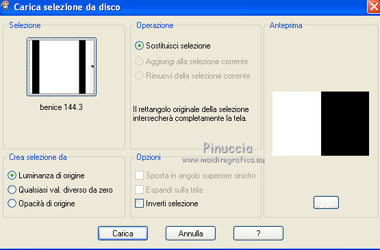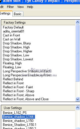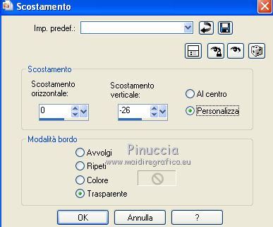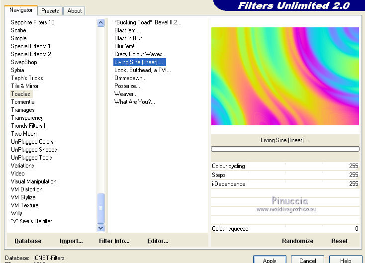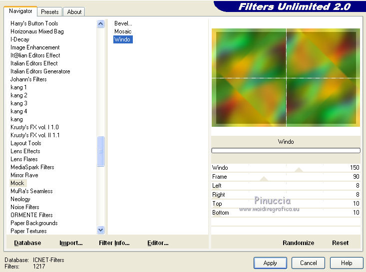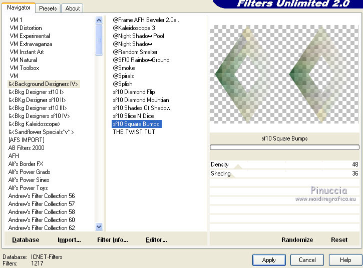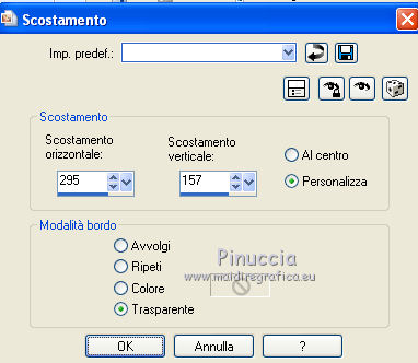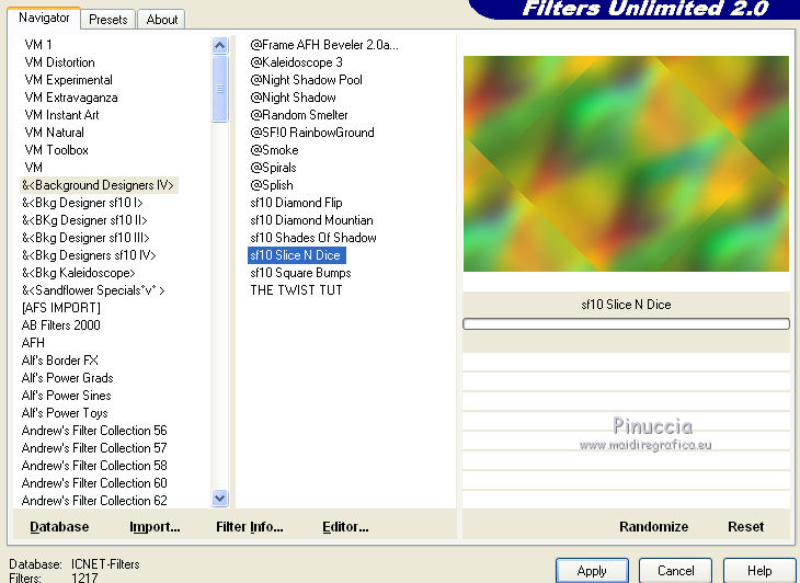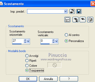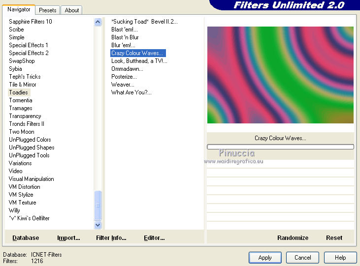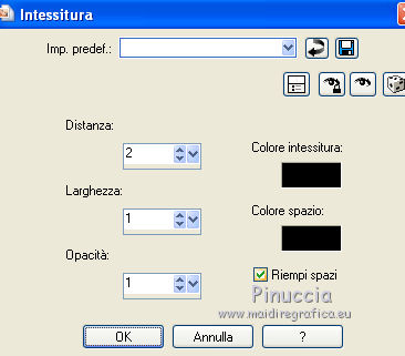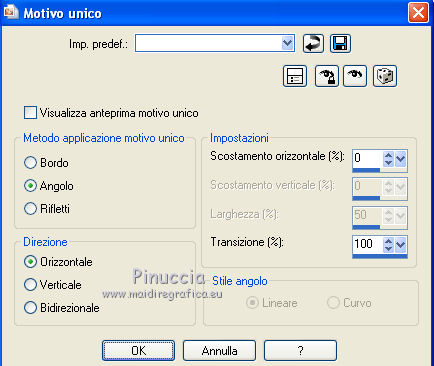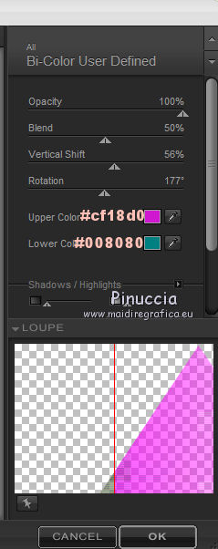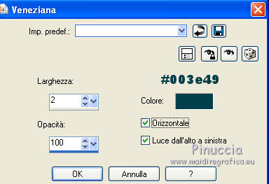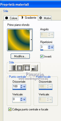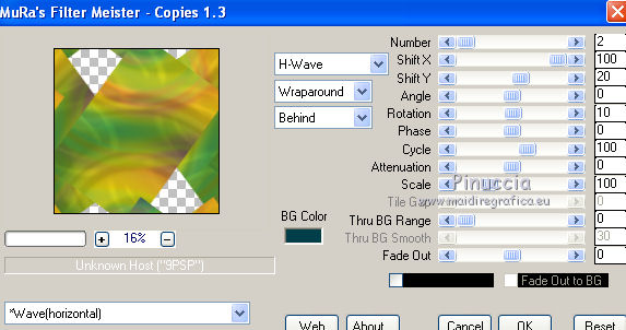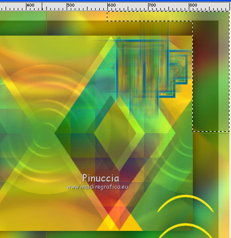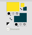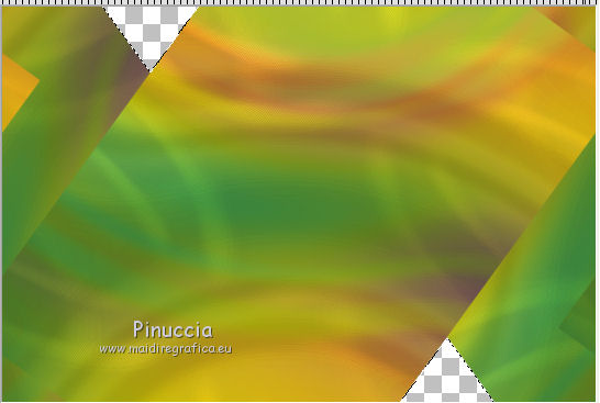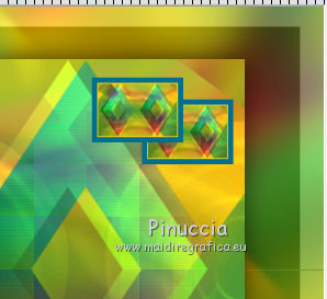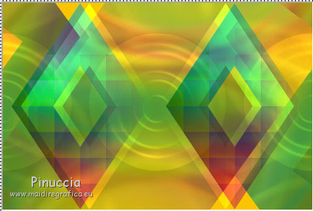 qui puoi trovare qualche risposta ai tuoi dubbi. Se l'argomento che ti interessa non è presente, ti prego di segnalarmelo. Occorrente: Materiale qui Il tube della donna è di Annelies Filtri: consulta, se necessario, la mia sezione filtri qui Filters Unlimited 2.0 qui &<Background Designer IV (da importare in Unlimited) qui Mock qui Mura's Meister - Copies qui Nik Software Color Efex Pro qui Toadies qui Toadies - Living Sine(linear) (lo trovi nello zip; il formato dell'effetto impone l'importazione in Unlimited) Alien Skin Eye Candy 5 Impact qui I filtri Mocks e Toadies si possono usare da soli o importati in Unlimited ![]() Metti il preset Benice_shadow_L144 nella cartella del filtro Alien Skin Eye Candy 5 Impact>Settings>Shadow. Cliccando sul file, automaticamente il preset si installerà nella cartella corretta. Metti le selezioni nella cartella Selezioni. Imposta il colore di primo piano con #f7c501, e il colore di sfondo con #003e49. ![]() Passa il colore di primo piano a Gradiente, stile Sprazzo di luce. ![]() 1. Apri una nuova immagine trasparente 900 x 600 pixels, e riempila con il gradiente.Regola>Sfocatura>Sfocatura gaussiana - raggio 100. ![]() 2. Livelli>Duplica. Effetti>Plugins>Filters Unlimited 2.0 - Toadies - Crazy Colour Waves. ![]() Effetti>Effetti di bordo>Aumenta. Cambia la modalità di miscelatura di questo livello in Luminanza, e abbassa l'opacità al 26%. Livelli>Unisci>Unisci giù. 3. Livelli>Duplica. Effetti>Plugins>Filters Unlimited 2.0 - Toadies - Living Sine (linear). ![]() Immagine>Rifletti. Immagine>Capovolgi. Cambia la modalità di miscelatura di questo livello in Luce diffusa, e abbassa l'opacità al 55%. 4. Apri il tube Benice_L144_Overlay e vai a Modifica>Copia. Torna al tuo lavoro e vai a Modifica>Incolla come nuovo livello. Effetti>Effetti di trama>Intessitura. ![]() Cambia la modalità di miscelatura di questo livello in Indebolisci, e abbassa l'opacità al 28%. 5. Livelli>Unisci>Unisci visibile. Immagine>Ruota per gradi - 90 gradi a destra. ![]() Effetti>Plugins>Mura's Meister - Copies. ![]() 6. Riporta il colore di primo piano al colore iniziale #f7c501. ![]() Attiva lo strumento Bacchetta magica ![]() ![]() Clicca nelle due parti trasparenti per selezionarle. ![]() Selezione>Modifica>Espandi - 2 pixels. Livelli>Nuovo livello raster. Riempi la selezione con il colore di primo piano.Selezione>Deseleziona. Livelli>Disponi>Sposta giù. Attiva il livello superiore. Livelli>Unisci>Unisci giù. Dovresti avere questo: ![]() 7. Selezione>Carica/Salva selezione>Carica selezione da disco. Cerca e carica la selezione Benice 144.1. ![]() Selezione>Innalza selezione a livello. Effetti>Effetti di trama>Veneziana, con il colore #003e49. ![]() Selezione>Deseleziona. 8. Livelli>Duplica. Effetti>Plugins>Filters Unlimited 2.0 - &<Background Designers IV> - sf10 Square Bumps. ![]() Effetti>Plugins>Nik Software - Color Efex Pro 3.0 Complete Bi-Color User Defined upper color #cf18d0 - lower color #008080. ![]() Cambia la modalità di miscelatura di questo livello in Differenza, e abbassa l'opacità al 72%. Livelli>Unisci>Unisci visibile. 9. Apri il tube Benice_L144_cirkel e vai a Modifica>Copia. Torna al tuo lavoro e vai a Modifica>Incolla come nuovo livello. Effetti>Effetti di immagine>Scostamento. ![]() Effetti>Effetti di immagine>Motivo unico. ![]() Cambia la modalità di miscelatura di questo livello in Indebolisci, e abbassa l'opacità al 44%. Livelli>Unisci>Unisci giù. 10. Selezione>Carica/Salva selezione>Carica selezione da disco. Cerca e carica la selezione Benice 144.2. ![]() Selezione>Innalza selezione a livello. Selezione>Deseleziona. Effetti>Effetti di immagine>Scostamento. ![]() Livelli>Duplica. Immagine>Rifletti. Livelli>Unisci>Unisci giù. Cambia la modalità di miscelatura di questo livello in Indebolisci. Livelli>Unisci>Unisci visibile. Dovresti avere questo: ![]() 11. Finestra>Duplica (o, sulla tastiera maiuscola+D) per fare una copia. Minimizza il duplicato che ti servirà più tardi. 12. Torna al tuo lavoro originale. Livelli>Duplica. Immagine>Ridimensiona, all'80%, tutti i livelli non selezionato. ![]() Effetti>Plugins>Alien Skin Eye Candy 5 Impact - Perspective Shadow. Seleziona il preset Benice_shadow_L144 e ok. ![]() 13. Chiudi il livello superiore, e attiva il livello inferiore. Regola>Sfocatura>Sfocatura gaussiana - raggio 30. ![]() Effetti>Plugins>Filters Unlimited 2.0 - &<Background Designers IV> - sf10 Slice N Dice. ![]() 14. Selezione>Carica/Salva selezione>Carica selezione da disco. Cerca e carica la selezione Benice 144.3. ![]() Premi sulla tastiera il tasto CANC. Selezione>Deseleziona. Livelli>Duplica (la metà rimasta). Immagine>Rifletti. Immagine>Capovolgi. Livelli>Unisci>Unisci giù. Regola>Sfocatura>Sfocatura gaussiana - raggio 4. ![]() 15. Livelli>Duplica. Effetti>Plugins>Filters Unlimited 2.0 - Mock - Windo. ![]() 16. Imposta il colore di primo piano con #fce321. ![]() Apri e attiva il livello superiore. 17. Livelli>Nuovo livello raster. Selezione>Carica/Salva selezione>Carica selezione da disco. Cerca e carica la selezione Benice 144.4. ![]() Riempi la selezione con il colore di primo piano.Selezione>Deseleziona. Effetti>Plugins>Alien Skin Eye Candy 5 Impact - Perspective Shadow, con i settaggi precedenti. ![]() Cambia la modalità di miscelatura di questo livello in Luce netta. 18. Attiva il duplicato che hai minimizzato al punto 11. Sul duplicato: Immagine>Ridimensiona, al 10%, tutti i livelli selezionato. Immagine>Aggiungi bordatura, 1 pixel, simmetriche, con il colore #fce321. Immagine>Aggiungi bordatura, 6 pixels, simmetriche, con il colore #046e8e. Modifica>Copia. Torna al tuo lavoro e vai a Modifica>Incolla come nuovo livello. Effetti>Effetti di immagine>Scostamento. ![]() Livelli>Duplica. Spostalo un po' più in alto e a destra dell'originale.![]() Livelli>Duplica. Spostalo davanti ai precedenti.![]() Livelli>Unisci>Unisci giù - 2 volte. 19. Livelli>Duplica. Effetti>Effetti di bordo>Aumenta di più. Effetti>Effetti di dis