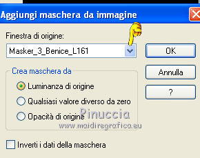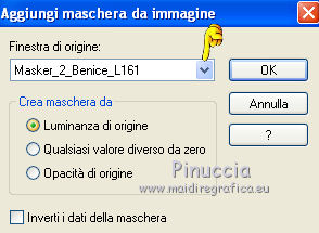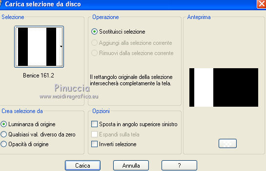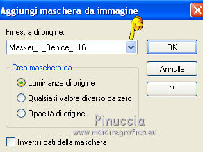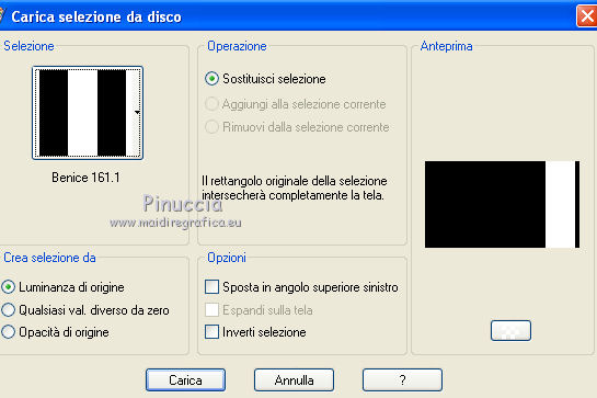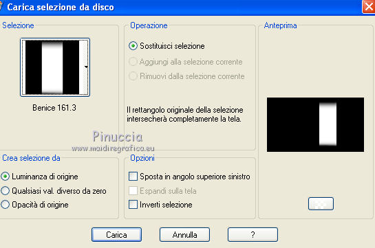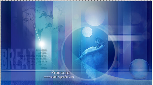 qui puoi trovare qualche risposta ai tuoi dubbi. Se l'argomento che ti interessa non è presente, ti prego di segnalarmelo. Occorrente: Materiale qui ![]() Metti le selezioni nella cartella Selezioni. Apri le maschere in PSP e minimizzale con il resto del materiale. Imposta il colore di primo piano con #005ff5, e il colore di sfondo con #456fc2. ![]() 1. Apri l'immagine BG_Benice_L161. Finestra>Duplica (o, sulla tastiera, maiuscola+D) per fare una copia. Chiudi l'originale. La copia sarà la base del tuo lavoro. 2. Livelli>Nuovo livello raster. Riempi con il colore di primo piano.Livelli>Nuovo livello maschera>Da immagine. Apri il menu sotto la finestra di origine e vedrai la lista dei files aperti. Seleziona la maschera Masker_1_Benice_L161. ![]() Livelli>Unisci>Unisci gruppo. 3. Livelli>Nuovo livello raster. Selezione>Carica/Salva selezione>Carica selezione da disco. Cerca e carica la selezione Benice 161.1. ![]() Riempi la selezione con il colore di sfondo.Selezione>Deseleziona. Abbassa l'opacità di questo livello al 32%. 4. Imposta il colore di primo piano con #5c88b1, e il colore di sfondo con #2f349d. ![]() 5. Livelli>Nuovo livello raster. Riempi il livello con il colore di primo piano.Livelli>Nuovo livello maschera>Da immagine. Apri il menu sotto la finestra di origine e seleziona la maschera Masker_2_Benice_L161. ![]() Livelli>Unisci>Unisci gruppo. 6. Livelli>Nuovo livello raster. Selezione>Carica/Salva selezione>Carica selezione da disco. Cerca e carica la selezione Benice 161.2. ![]() Riempi la selezione con il colore di sfondo.Selezione>Deseleziona. Abbassa l'opacità di questo livello al 61%. 7. Imposta il colore di primo piano con #3697b6, e il colore di sfondo con #7aa8d1. ![]() 8. Livelli>Nuovo livello raster. Riempi il livello con il colore di primo piano.Livelli>Nuovo livello maschera>Da immagine. Apri il menu sotto la finestra di origine e seleziona la maschera Masker_3_Benice_L161. ![]() Livelli>Unisci>Unisci gruppo. 9. Apri il tube Lijnen_1_Benice_L161 e vai a Modifica>Copia. Torna al tuo lavoro e vai a Modifica>Incolla come nuovo livello. Effetti>Effetti di immagine>Scostamento. ![]() Regola>Messa a fuoco>Metti a fuoco. 10. Apri il tube Lijnen_2_Benice_L161 e vai a Modifica>Copia. Torna al tuo lavoro e vai a Modifica>Incolla come nuovo livello. Effetti>Effetti di immagine>Scostamento. ![]() Regola>Messa a fuoco>Metti a fuoco. 11. Livelli>Nuovo livello raster. Selezione>Carica/Salva selezione>Carica selezione da disco. Cerca e carica la selezione Benice 161.3. ![]() Riempi la selezione con il colore di sfondo.Selezione>Deseleziona. Abbassa l'opacità di questo livello al 55%. 12. Apri il tube Lijnen_3_Benice_L161 e vai a Modifica>Copia. Torna al tuo lavoro e vai a Modifica>Incolla come nuovo livello. Lascialo come sta. E' già correttamente posizionato. Regola>Messa a fuoco>Metti a fuoco. 13. Apri il tube Misted_Woman_Benice-L161 e vai a Modifica>Copia. Torna al tuo lavoro e vai a Modifica>Incolla come nuovo livello. Spostalo come nell'esempio.![]() Cambia la modalità di miscelatura di questo livello in Sovrapponi. 14. Apri il tube HeavenLess_Networking e vai a Modifica>Copia. Torna al tuo lavoro e vai a Modifica>Incolla come nuovo livello. Immagine>Ridimensiona, al 65%, tutti i livelli non selezionato. Spostalo in basso a destra.![]() Abbassa l'opacità di questo livello al 38%. 15. Apri il tube Grass_Benice_L161 e vai a Modifica>Copia. Torna al tuo lavoro e vai a Modifica>Incolla come nuovo livello. Spostalo in basso, sul bordo.![]() Cambia la modalità di miscelatura di questo livello in Luminanza (esistente), e abbassa l'opacità al 50%. 16. Apri il tube Misted_Shining_Benice_L161 e vai a Modifica>Copia. Torna al tuo lavoro e vai a Modifica>Incolla come nuovo livello. Immagine>Rifletti. Spostalo nell'angolo in alto a destra.![]() Cambia la modalità di miscelatura di questo livello in Luce netta, e abbassa l'opacità al 15%. 17. Apri il tube Ko_dream_01 e vai a Modifica>Copia. Torna al tuo lavoro e vai a Modifica>Incolla come nuovo livello. Immagine>Ridimensiona, al 75%, tutti i livelli non selezionato. Immagine>Rifletti. Spostalo nell'angolo in alto a sinistra.![]() Attiva lo strumento Selezione , rettangolo![]() Seleziona la parte finale del tube. ![]() Premi sulla tastiera il tasto CANC. Selezione>Deseleziona. 18. Attiva il livello Raster 6. Attiva lo strumento Selezione a mano libera , da punto a punto,![]() ingrandisci l'immagine al 300% usando la rotellina del mouse, e seleziona le due linee chiare che passano sopra l'uccello ![]() Premi sulla tastiera il tasto CANC. Selezione>Deseleziona. 19. Attiva il livello superiore. Cambia la modalità di miscelatura di questo livello in Luce diffusa, e abbassa l'opacità al 60%. 20. Apri il tube Shiny_frame e vai a Modifica>Copia. Torna al tuo lavoro e vai a Modifica>Incolla come nuovo livello. Spostalo sulla donna.![]() Cambia la modalità di miscelatura di questo livello in Luce netta, e abbassa l'opacità al 50%. 21. Apri il tube Breathe Quote e vai a Modifica>Copia. Torna al tuo lavoro e vai a Modifica>Incolla come nuovo livello. Immagine>Ridimensiona, al 50%, tutti i livelli non selezionato. Spostalo in basso a sinistra, come nell'esempio.![]() Cambia la modalità di miscelatura di questo livello in Luminanza (esistente), e abbassa l'opacità al 40%. 22. Apri il tube Halo_Benice_L161 e vai a Modifica>Copia. Torna al tuo lavoro e vai a Modifica>Incolla come nuovo livello. Spostalo sotto il tube degli uccelli.![]() Abbassa l'opacità di questo livello al 75%. 23. Apri il tube Deco_Benice_L161 e vai a Modifica>Copia. Torna al tuo lavoro e vai a Modifica>Incolla come nuovo livello. Spostalo a sinistra, sopra il testo.![]() Cambia la modalità di miscelatura di questo livello in Luce netta, e abbassa l'opacità al 70%. 24. Livelli>Unisci>Unisci tutto. Immagine>Aggiungi bordatura, 1 pixel, simmetriche, con il colore bianco #ffffff. Aggiungi il tuo nome e/o il tuo watermark e salva in formato jpg. ![]() Se hai problem