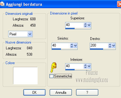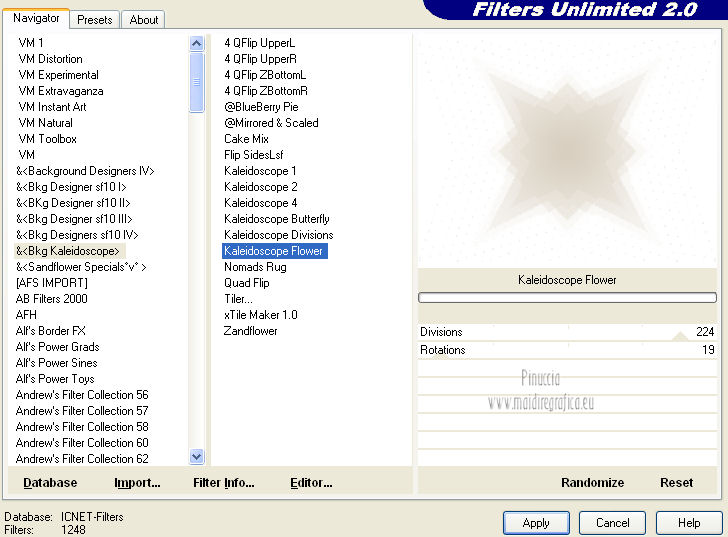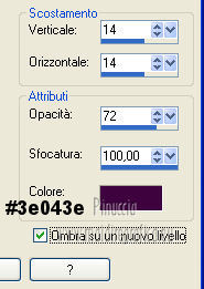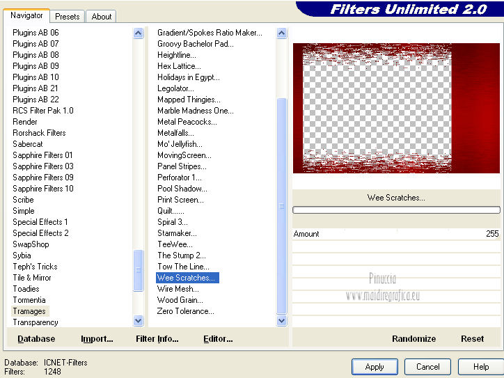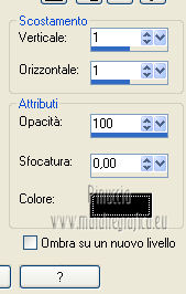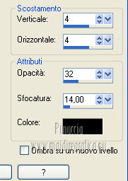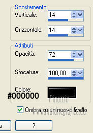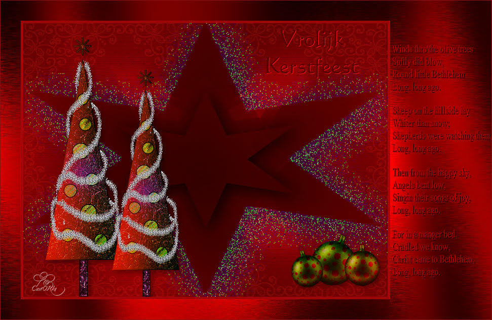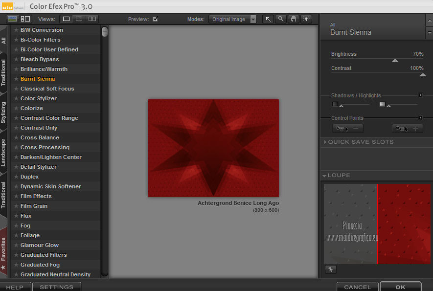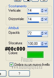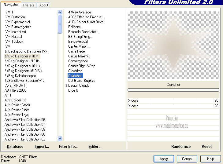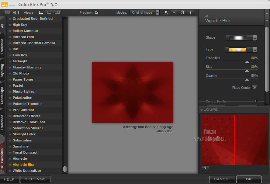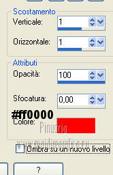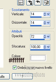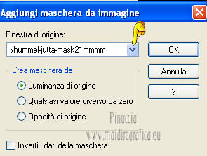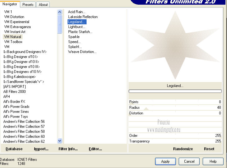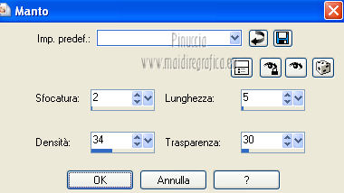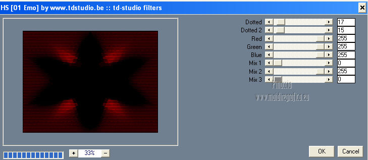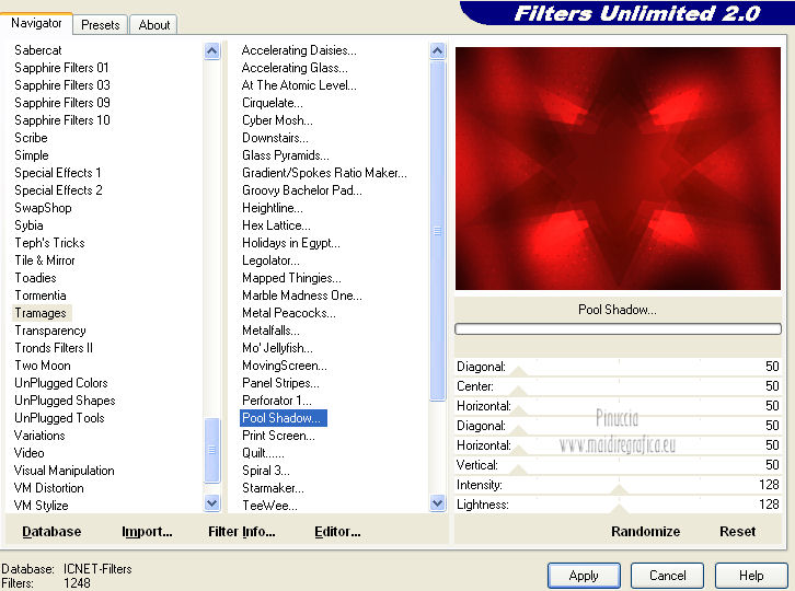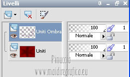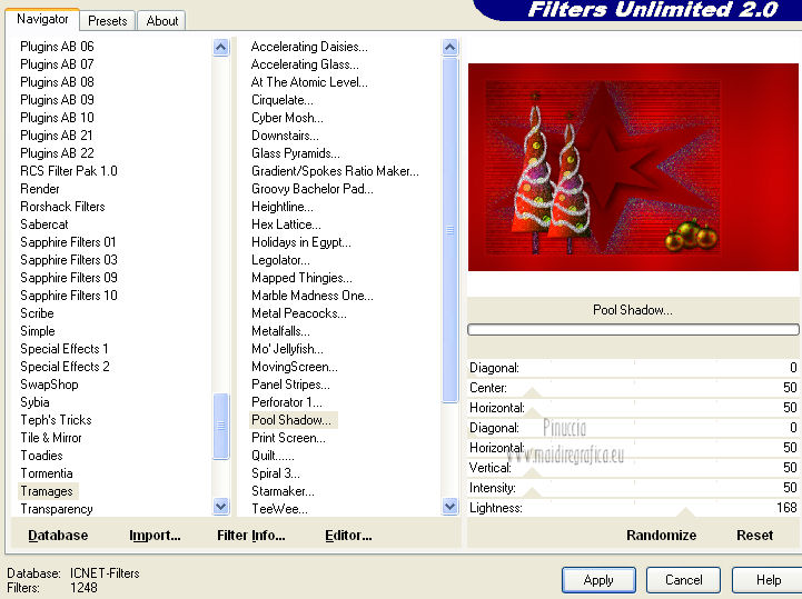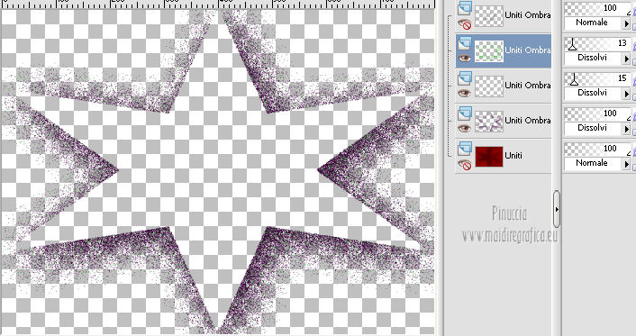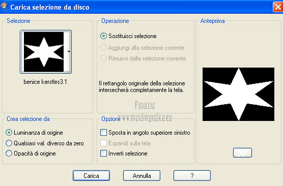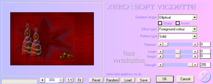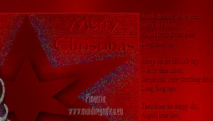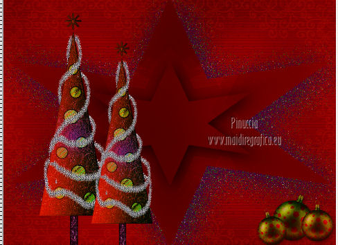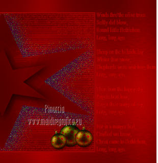 qui puoi trovare qualche risposta ai tuoi dubbi. Se l'argomento che ti interessa non è presente, ti prego di segnalarmelo. Occorrente: Materiale qui Filtri: consulta, se necessario, la mia sezione filtri qui Filters Unlimited 2.0 qui &<Bkg Designer sf10I> (da importare in Unlimited) qui &<Bkg Kaleidoscope> (da importare in Unlimited) qui TD-studio - HS[[001 Emo]S qui Tramages qui Nik Software - Color Efex Pro qui VM Natural qui Xero - Soft Vignette qui ![]() Metti le selezioni nella cartella Selezioni. Apri la maschera in PSP e minimizzala con il resto del materiale. Imposta il colore di primo piano con #ffffff (bianco), e il colore di sfondo con #920201. ![]() 1. Apri Achtergrond Benice Long Ago. Questa immagine sarà la base del tuo lavoro. Attiva lo strumento Bacchetta magica ![]() Clicca nella parte bianca per selezionarla. ![]() Effetti>Plugins>Filters Unlimited 2.0 - VM Natural - Legoland. ![]() Selezione>Inverti. Selezione>Innalza selezione a livello. Selezione>Deseleziona. Effetti>Plugins>Filters Unlimited 2.0 - &<Bkg Designer sf10I> - Cruncher. ![]() Livelli>Unisci>Unisci visibile. 2. Livelli>Duplica. Effetti>Plugins>Filters Unlimited 2.0 - &<Bkg Designer Kaleidoscope> - Kaleidoscope Flower. ![]() Cambia la modalità di miscelatura di questo livello in Differenza, e abbassa l'opacità al 73%. Livelli>Unisci>Unisci giù. Effetti>Plugins>Nik Software - Color Efex Pro - Burnt Sienna. ![]() Effetti>Plugins>Nik Software - Color Efex Pro - Vignette Blur. ![]() 3. Livelli>Duplica. Effetti>Plugins>TD-studio - HS [[001 Emo]] ![]() Cambia la modalità di miscelatura di questo livello in Indebolisci, e abbassa l'opacità al 79%. Livelli>Unisci>Unisci giù. 4. Livelli>Duplica. Effetti>Plugins>Filters Unlimited - Tramages - Pool Shadow. ![]() Cambia la modalità di miscelatura di questo livello in Luce diffusa. Livelli>Unisci>Unisci giù. 5. Livelli>Duplica. Effetti>Effetti di bordo>Aumenta. Abbassa l'opacità di questo livello al 37%. Attiva il livello inferiore. Regola>Sfocatura>Sfocatura gaussiana - raggio 100. ![]() 6. Attiva nuovamente il livello superiore. Livelli>Nuovo livello raster. Riempi il livello con il colore bianco di primo piano.Livelli>Nuovo livello maschera>Da immagine. Apri il menu sotto la finestra di origine e vedrai la lista dei files aperti. Seleziona la maschera ©hummel-jutta-mask21mmm, con i seguenti settaggi: ![]() Livelli>Unisci>Unisci gruppo. Cambia la modalità di miscelatura di questo livello in Luce diffusa, e abbassa l'opacità al 49%. 7. Selezione>Carica/Salva selezione>Carica selezione da disco. Cerca e carica la selezione Benice kerstles3.2. ![]() Premi sulla tastiera il tasto CANC. Selezione>Deseleziona. Livelli>Unisci>Unisci visibile. 8. Selezione>Carica/Salva selezione>Carica selezione da disco. Cerca e carica la selezione Benice kerstles3.1. ![]() Effetti>Effetti 3D>Sfalsa ombra - ombra su nuovo livello selezionato. ![]() Mantieni selezionato e rimani sul livello dell'ombra. Livelli>Disponi>Porta in alto, e il livello dell'ombra sarà il livello superiore. ![]() Livelli>Duplica. Livelli>Unisci>Unisci giù. Cambia la modalità di miscelatura di questo livello in Dissolvi. 9. Effetti>Effetti 3D>Sfalsa ombra, ombra su nuovo livello selezionato. ![]() Mantieni selezionato e rimani sul livello dell'ombra. Livelli>Disponi>Porta in alto. Cambia la modalità di miscelatura di questo livello in Dissolvi, e abbassa l'opacità al 13%. ![]() 10. Effetti>Effetti 3D>Sfalsa ombra, ombra su nuovo livello selezionato. ![]() Mantieni selezionato. Cambia la modalità di miscelatura di questo livello in Dissolvi, e abbassa l'opacità al 15%. ![]() 11. Effetti>Effetti 3D>Sfalsa ombra, ombra su nuovo livello selezionato. ![]() Selezione>Deseleziona. Livelli>Disponi>Porta in alto. Immagine>Ridimensiona, al 50%, tutti i livelli non selezionato. 12. Chiudi il livello superiore e il livello inferiore, e attiva il secondo livello dall'alto. ![]() Livelli>Unisci>Unisci visibile. Livelli>Visualizza>Tutti. 13. Attiva il livello superiore. Apri il tube Stock_xchng_1073069_67083018 e vai a Modifica>Copia. Torna al tuo lavoro e vai a Modifica>Incolla come nuovo livello. Immagine>Ridimensiona, al 30%, tutti i livelli non selezionato. Effetti>Effetti di trama>Manto. ![]() Livelli>Duplica. Immagine>Ridimensiona, all'80%, tutti i livelli non selezionato. Livelli>Duplica. Immagine>Ridimensiona, al 90%, tutti i livelli non selezionato. 14. Attiva il livello Raster 1 (il livello con la pallina più grande). Immagine>Ruota per gradi - 20 gradi a destra. ![]() Regola>Messa a fuoco>Metti a fuoco. Attiva il livello superiore. Immagine>Ruota per gradi - 15 gradi a sinistra. ![]() Regola>Messa a fuoco>Metti a fuoco. Posiziona le palline in basso a destra.![]() Attiva il livello superiore. Livelli>Unisci>Unisci giù - 2 volte. Regola>Luminosità e contrasto>Luminosità e contrasto. ![]() Regola>Messa a fuoco>Metti a fuoco. Effetti>Effetti 3D>Sfalsa ombra, attenzione, non dimenticare di togliere la selezione a Ombra su nuovo livello. ![]() Effetti>Plugins>Nik Software - Color Efex Pro - Bi-Color User Defined. ![]() 15. Apri il tube Tree & Trim CCD e vai a Modifica>Copia. Torna al tuo lavoro e vai a Modifica>Incolla come nuovo livello. Immagine>Ridimensiona, al 65%, tutti i livelli non selezionato. Regola>Luminosità e contrasto>Luminosità e contrasto. ![]() Regola>Messa a fuoco>Metti a fuoco. Livelli>Duplica. Immagine>Ridimensiona, al 90%, tutti i livelli non selezionato. Sposta il tube in basso a sinistra.![]() Assicurati di essere posizionato sul livello superiore. Livelli>Unisci>Unisci giù. Effetti>Effetti 3D>Sfalsa ombra. ![]() 16. Livelli>Unisci>Unisci tutto. Immagine>Aggiungi bordatura, 2 pixels, simmetriche, con il colore #b30908. Immagine>Aggiungi bordatura, 1 pixel, simmetriche, con il colore #540000. Immagine>Aggiungi bordatura, 2 pixels, simmetriche, con il colore #b30908. Immagine>Ridimensiona, al 75%, tutti i livelli selezionato. Regola>Messa a fuoco>Metti a fuoco. 17. Immagine>Aggiu