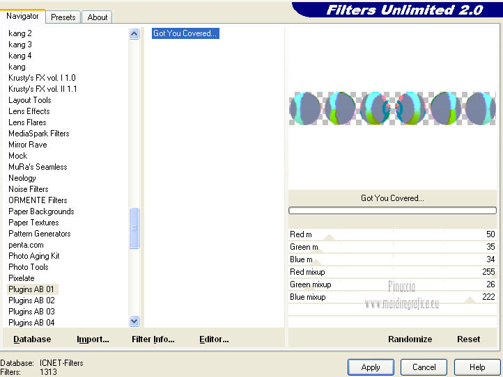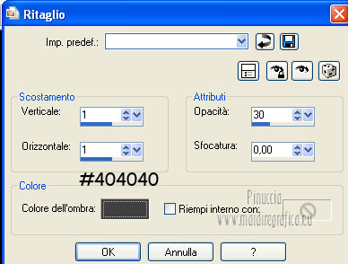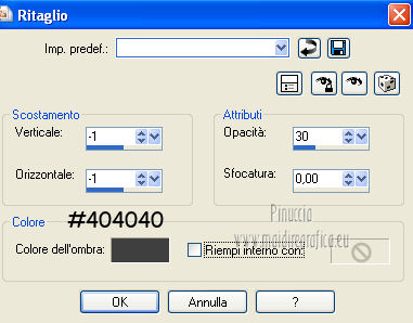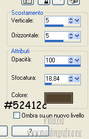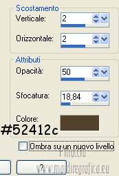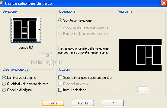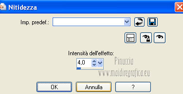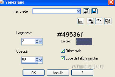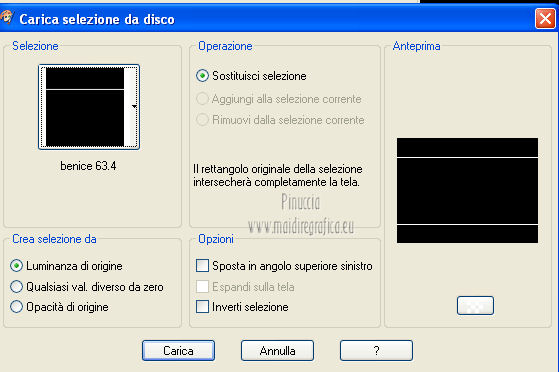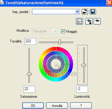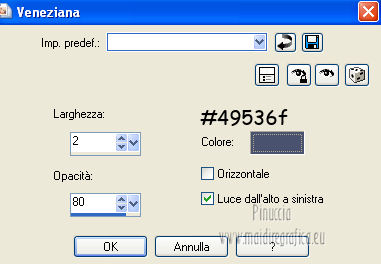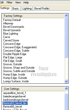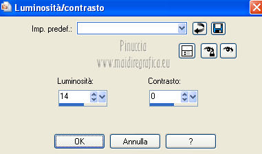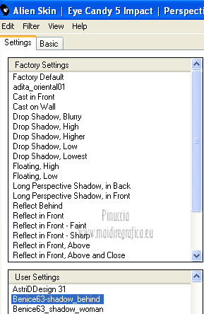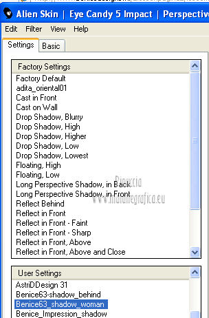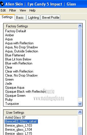 qui puoi trovare qualche risposta ai tuoi dubbi. Se l'argomento che ti interessa non è presente, ti prego di segnalarmelo. Occorrente: Materiale qui Filtri: consulta, se necessario, la mia sezione filtri qui Filters Unlimited 2.0 qui Alien Skin Eye Candy 5 Impact qui Graphics Plus qui Plugins AB 01 (da importare in Unlimited) qui ![]() Metti i preset nelle rispettive cartelle del filtro Alien Skin Eye Candy 5 Impact>Settings>.... Cliccando sul file una o due volte (a seconda delle tue impostazioni), automaticamente il preset si installerà nella cartella corretta. Metti il pennello nella cartella Pennelli. Attenzione, il pennello è composto da due files che non devono essere separati. Vedi gli appunti sui pennelli qui Metti le selezioni nella cartella Selezioni. Imposta il colore di primo piano con il colore bianco, e il colore di sfondo con #7b86a2. ![]() 1. Apri una nuova immagine trasparente 800 x 600 pixels. Selezione>Seleziona tutto. Apri l'immagine di sfondo Benice 63, e vai a Modifica>Copia. Torna al tuo lavoro e vai a Modifica>Incolla nella selezione. Selezione>Deseleziona. 2. Livelli>Nuovo livello raster. Selezione>Seleziona tutto. Apri il tube Overlay e vai a Modifica>Copia. Torna al tuo lavoro e vai a Modifica>Incolla nella selezione. Selezione>Deseleziona. Cambia la modalità di miscelatura di questo livello in Indebolisci, e abbassa l'opacità al 49%. 3. Livelli>Nuovo livello raster. Selezione>Carica/Salva selezione>Carica selezione da disco. Cerca e carica la selezione Benice 63. ![]() Riempi la selezione con il colore di sfondo.Selezione>Deseleziona. Effetti>Effetti di trama>Veneziana - colore #49536f. ![]() Effetti>Effetti di bordo>Aumenta di più. Effetti>Effetti di distorsione>Vento, da destra, intensità 100. ![]() Cambia la modalità di miscelatura di questo livello in Differenza, e abbassa l'opacità al 53%. Livelli>Duplica. Immagine>Rifletti. 4. Livelli>Nuovo livello raster. Selezione>Carica/Salva selezione>Carica selezione da disco. Cerca e carica la selezione Benice 63.1. ![]() Effetti>Effetti 3D>Sfalsa ombra, con il colore #52412c. ![]() Selezione>Modifica>Contrai - 5 pixels. Livelli>Nuovo livello raster. Riempi la selezione con il colore bianco.Selezione>Modifica>Contrai - 5 pixels. Premi sulla tastiera il tasto CANC. Selezione>Deseleziona. Effetti>Effetti di bordo>Aumenta. Livelli>Unisci>Unisci giù. 5. Livelli>Nuovo livello raster. Selezione>Carica/Salva selezione>Carica selezione da disco. Cerca e carica la selezione Benice 63.2. ![]() Effetti>Effetti 3D>Sfalsa ombra, come al punto 4. Selezione>Modifica>Contrai - 3 pixels. Livelli>Nuovo livello raster. Riempi la selezione con il colore di sfondo.Effetti>Plugins>Filters Unlimited 2.0 - Plugins AB 01 - Get You Covered. ![]() Selezione>Deseleziona. Cambia la modalità di miscelatura di questo livello in Luminanza (esistente). Effetti>Plugins>Alien Skin Eye Candy 5 Impact - Glass. Seleziona il preset Benice63_Glass_cirkel e ok. ![]() 6. Livelli>Nuovo livello raster. Selezione>Carica/Salva selezione>Carica selezione da disco. Cerca e carica la selezione Benice 63.3. ![]() Riempi la selezione con il colore bianco.Selezione>Modifica>Contrai - 3 pixels. Apri l'immagine Texturacameron_metal 1 e vai a Modifica>Copia. Torna al tuo lavoro e vai a Modifica>Incolla nella selezione. Mantieni selezionato. Regola>Tonalità e saturazione>Tonalità/Saturazione/Luminosità. ![]() Livelli>Nuovo livello raster. Effetti>Effetti 3D>Ritaglio - colore #404040. ![]() Livelli>Nuovo livello raster. Effetti>Effetti 3D>Ritaglio, colore #404040. ![]() Selezione>Deseleziona. Livelli>Unisci>Unisci giù - 2 volte. Effetti>Effetti 3D>Sfalsa ombra, colore #52412c. ![]() 7. Livelli>Nuovo livello raster. Selezione>Carica/Salva selezione>Carica selezione da disco. Cerca e carica la selezione Benice 63.4. ![]() Riempi la selezione con il colore bianco.Effetti>Effetti di trama>Veneziana, colore #49536f. ![]() Effetti>Plugins>Alien Skin Eye Candy 5 Impact - Bevel. Seleziona il preset Benice_bevel_lijn e ok. ![]() Selezione>Deseleziona. 8. Livelli>Nuovo livello raster. Selezione>Carica/Salva selezione>Carica selezione da disco. Cerca e carica la selezione Benice 63.5. ![]() Riempi la selezione con il colore bianco.Selezione>Deseleziona. Effetti>Effetti 3D>Sfalsa ombra, colore #52412c. ![]() Effetti>Effetti di bordo>Aumenta di più. Abbassa l'opacità di questo livello all'80%. Livelli>Duplica. Immagine>Rifletti. Livelli>Unisci>Unisci giù. 9. Livelli>Nuovo livello raster. Selezione>Carica/Salva selezione>Carica selezione da disco. Cerca e carica la selezione Benice 63.6. ![]() Apri l'immagine Texturacameron_pincel1. Attiva lo strumento Ritaglio ![]() ritaglia la parte centrale, e clicca sul segno di spunta per applicare il ritaglio. ![]() Modifica>Copia. Torna al tuo lavoro e vai a Modifica>Incolla nella selezione. Selezione>Deseleziona. Cambia la modalità di miscelatura di questo livello in Luminanza (esistente). 10. Apri il tube DBK AA Mod-Cel-2594 e vai a Modifica>Copia. Torna al tuo lavoro e vai a Modifica>Incolla come nuovo livello. Immagine>Ridimensiona, al 65%, tutti i livelli non selezionato. Sposta il tube a destra.Il prossimo passaggio è adatto al tube utilizzato; se stai usando un altro tube passa direttamente all'applicazione di Perspective Shadow. Regola>Luminosità e contrasto>Luminosità e contrasto. ![]() Regola>Messa a fuoco>Metti a fuoco. Regola>Luminosità e contrasto>Nitidezza. ![]() Selezione>Seleziona tutto. Selezione>Mobile. Selezione>Modifica>Sfuma - 1 pixel. Selezione>Inverti. Premi sulla tastiera 3 o 4 volte il tasto CANC. Selezione>Deseleziona. Effetti>Plugins>Alien Skin Eye Candy 5 Impact - Perspective Shadow. Seleziona il preset Benice63_shadow_behind e ok. ![]() Di nuovo Effetti>Plugins>Alien Skin Eye Candy 5 Impact - Perspective Shadow. Seleziona il preset Benice63_shadow_woman e ok. ![]() 11. Livelli>Nuovo livello raster. Attiva lo strumento Pennello cerca e seleziona il pennello PinkMLyrics 002, con i seguenti setta
