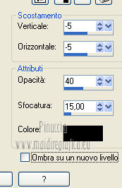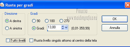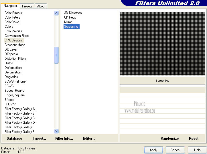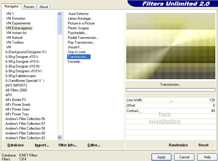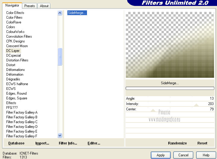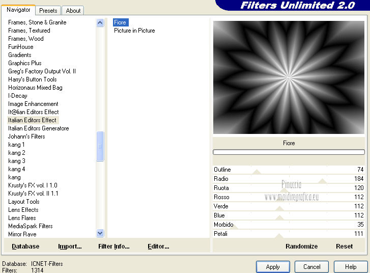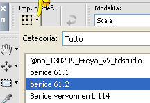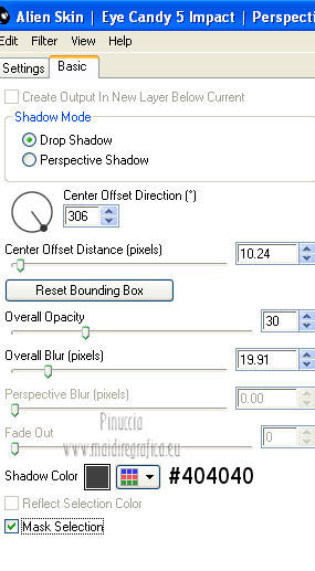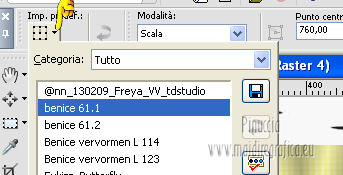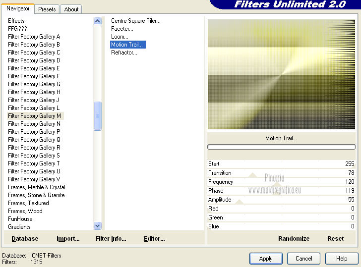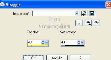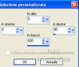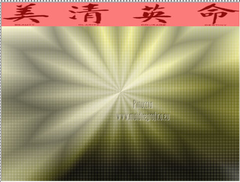 qui puoi trovare qualche risposta ai tuoi dubbi. Se l'argomento che ti interessa non è presente, ti prego di segnalarmelo. Occorrente: Materiale qui Filtri: consulta, se necessario, la mia sezione filtri qui Filters Unlimited 2.0 qui CPK Designs qui Filter Factory Gallery M qui Italian Editors Effect qui DC Layer qui Alien Skin Eye Candy 5 Impact qui Adjust - Variations qui Bordermania qui VM Extravaganza qui I filtri Factory Gallery per essere usati devono prima essere convertiti. Come fare vedi qui Si usano importandoli in Filters Unlimited (come fare vedi qui) ma possono funzionare anche da soli. Anche i filtri CPK, Italian Editors, Dc Layer e VM Extravaganza si possono usare da soli o importati in Unlimited. ![]() Apri il font e minimizzalo. Lo troverai nella lista dei font disponibili quando ti servirà. Metti i preset "Preset RasterDeform_benice 61.1" e "Preset RasterDeform_benice 61.1" nella cartella Impostazioni predefinite. Imposta entrambi i colori della paletta con #404040. ![]() 1. Apri l'immagine di sfondo Benice 61. Questa sarà la base del tuo lavoro. Livelli>Duplica. Effetti>Plugins>Filters Unlimited 2.0 - CPK Designs - Screening. ![]() Cambia la modalità di miscelatura di questo livello in Sovrapponi. Livelli>Unisci>Unisci giù. 2. Livelli>Duplica. Effetti>Plugins>Filters Unlimited 2.0 - DC Layer - Side Merge. ![]() Cambia la modalità di miscelatura di questo livello in Rafforza, e abbassa l'opacità al 40%. Livelli>Duplica. Immagine>Capovolgi. Porta l'opacità di questo livello all'80%. Livelli>Unisci>Unisci visibile. Finestra>Duplica (o, sulla tastiera, maiuscola+D) per fare una copia. Minimizza la copia che ti servirà più tardi. 3. Torna al tuo lavoro originale. Livelli>Duplica. Effetti>Plugins>Filters Unlimited 2.0 - Italian Editors Effect - Fiore. ![]() Cambia la modalità di miscelatura di questo livello in Luce netta, e abbassa l'opacità al 40%. Livelli>Unisci>Unisci visibile. 4. Livelli>Nuovo livello raster. Attiva lo strumento Selezione ,clicca sull'icona Selezione personalizzata ![]() e imposta i seguenti settaggi: ![]() Apri il tube tekens. Attiva il livello Raster 1 e vai a Modifica>Copia. Torna al tuo lavoro e vai a Modifica>Incolla nella selezione. Selezione>Modifica selezione, e l'area selezionata diventerà rossa. ![]() Immagine>Capovolgi, e l'area rossa si troverà in basso. ![]() Selezione>Modifica Selezione, l'area rossa sparirà. Livelli>Nuovo livello raster. Attiva nuovamente il tube tekens e copia il livello Raster 2. Torna al tuo lavoro e vai a Modifica>Incolla nella selezione. Selezione>Deseleziona. 5. Livelli>Nuovo livello raster. Di nuovo Selezione personalizzata ![]() ![]() Attiva ancora il tube tekens, e copia il livello Raster 3. Torna al tuo lavoro e vai a Modifica>Incolla nella selezione. Selezione>Modifica Selezione. Immagine>Rifletti. Selezione>Modifica Selezione. Livelli>Nuovo livello raster. Attiva ancora una volta il tube tekens, e copia il livello Raster 4. Torna al tuo lavoro e vai a Modifica>Incolla nella selezione. Selezione>Deseleziona. 5. Attiva il livello Raster 4. Premi il tasto D per attivare lo strumento Deformazione ![]() apri il menu delle impostazioni e seleziona il preset Benice 61.1. ![]() Premi il tasto M per deselezionare lo strumento. Livelli>Disponi>Sposta giù - 3 volte. Attiva il livello Raster 3. Premi nuovamente il tasto D, e seleziona il preset Benice 61.2. ![]() Premi il tasto M per deselezionare lo strumento. Livelli>Disponi>Sposta giù - 2 volte. Chiudi il livello Uniti. Attiva il livello superiore. Livelli>Unisci>Unisci visibile. Abbassa l'opacità di questo livello al 10%. Effetti>Effetti di bordo>Aumenta di più. Riapri il livello inferiore. 6. Rimani posizionato sul livello superiore. Apri il tube Hazelaar_en_chinees_doosje e vai a Modifica>Copia. Torna al tuo lavoro e vai a Modifica>Incolla come nuovo livello. Immagine>Ridimensiona, al 70%, tutti i livelli non selezionato. Sposta il tube nell'angolo in basso a destra del bordo interno.Cambia la modalità di miscelatura di questo livello in Luminanza, e abbassa l'opacità al 60%. 7. Apri il tube Maxyran_06_10_09 Women97 e vai a Modifica>Copia. Torna al tuo lavoro e vai a Modifica>Incolla come nuovo livello. Effetti>Plugins>Adjust - Variations, un clic su Original, per annullare eventuali precedenti settaggi memorizzati dal filtro, un clic su More Yellow e ok. ![]() Sposta il tube a sinistra.Livelli>Duplica. Regola>Sfocatura>Sfocatura gaussiana - raggio 20. ![]() Livelli>Disponi>Sposta giù. Attiva il livello superiore. Effetti>Effetti 3D>Sfalsa ombra. ![]() 8. Immagine>Aggiungi bordatura, 2 pixels, simmetriche, con il colore #404040. Effetti>Plugins>Bordermania - Frame#1. ![]() Immagine>Ridimensiona, al 75%, tutti i livelli selezionato. Regola>Messa a fuoco>Metti a fuoco. Lascia l'immagine in attesa. 9. Attiva la copia che hai minimizzato al punto 2. ![]() Questa sarà la nuova base del tuo lavoro. Livelli>Duplica. Effetti>Plugins>Filters Unlimited 2.0 - VM Extravaganza - Transmission. ![]() Abbassa l'opacità di questo livello al 50%. Effetti>Plugins>Filters Unlimited 2.0 - Filter Factory Gallery M - Motion Trail. ![]() Livelli>Duplica. Immagine>Rifletti. Abbassa l'opacità di questo livello al 15%. 10. Attiva il lavoro lasciato in attesa al punto 8. Modifica>Copia. Torna al duplicato e vai a Modifica>Incolla come nuovo livello. Effetti>Effetti di immagine>Scostamento. ![]() 11. Apri il tube Laurak_antique_element6 e vai a Modifica>Copia. Torna al tuo lavoro e vai a Modifica>Incolla come nuovo livello. Immagine>Ridimensiona, al 50%, tutti i livelli non selezionato. Sposta il tube a sinistra.Regola>Tonalità e saturazione>Viraggio. ![]() Effetti>Plugins>Alien Skin Eye Candy 5 Impact - Perspective Shadow. Settings: Drop Shadow Low. Basic ![]() 12. Apri il tube Annytubes_floral 05-20-09-2009 e vai a Modifica>Copia. Torna al tuo lavoro e vai a Modifica>Incolla come nuovo livello. Immagine>Ridimensiona, al 18%, tutti i livelli non selezionato. Immagine>