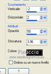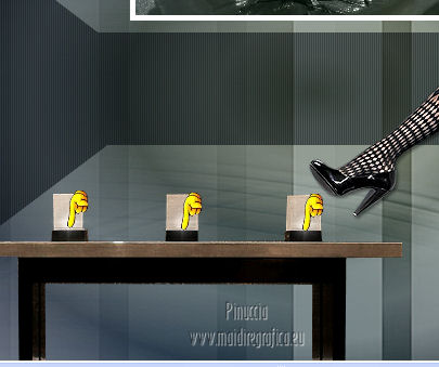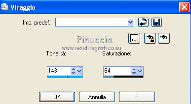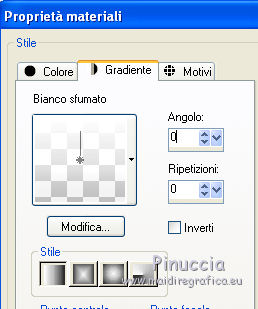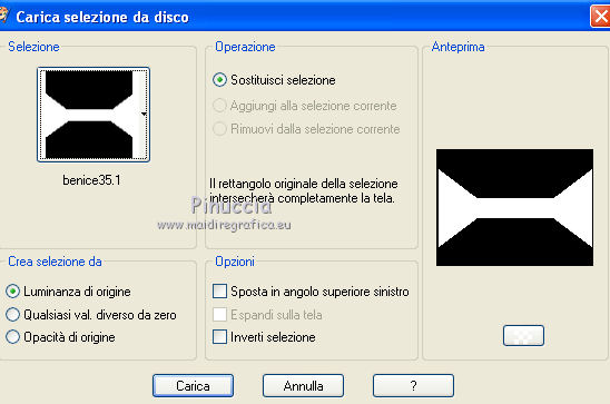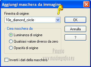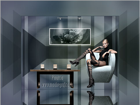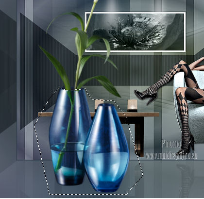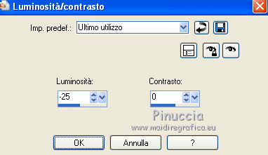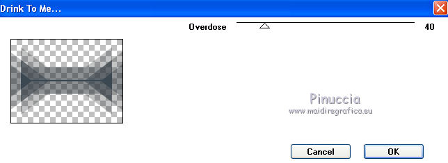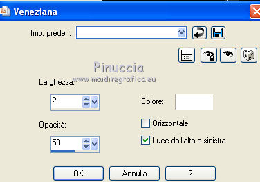 qui puoi trovare qualche risposta ai tuoi dubbi. Se l'argomento che ti interessa non è presente, ti prego di segnalarmelo. Occorrente: Materiale qui Filtri: consulta, se necessario, la mia sezione filtri qui Filters Unlimited 2.0 qui Filter Factory Gallery J qui I filtri Factory Gallery per essere usati devono prima essere convertiti. Come fare vedi qui Si usano importandoli in Filters Unlimited (come fare vedi qui) ma possono funzionare anche da soli. Le Factory fornite sono state già convertite. ![]() Il gradiente Vervaging wit corrisponde al gradiente standard Bianco sfumato, nelle versioni più recenti di PSP Corel_. Se non lo trovi nel tuo PSP, metti quello fornito nella cartella Gradienti. Metti le selezioni nella cartella Selezioni. Metti l'ornamento kleine witte flikkering nella cartella Ornamenti. Apri la maschera 10e_diamond_cicle in PSP e minimizzala con il resto del materiale. Imposta il colore di primo piano con #e7f2e3, e il colore di sfondo con #51616d. ![]() 1. Apri una nuova immagine trasparente 800 x 600 pixels. Selezione>Seleziona tutto. Apri l'immagine Background L35 e vai a Modifica>Copia. Torna al tuo lavoro e vai a Modifica>Incolla nella selezione. Selezione>Deseleziona. Effetti>Effetti di bordo>Aumenta. Livelli>Duplica. Immagine>Capovolgi. Abbassa l'opacità di questo livello al 50%. Livelli>Unisci>Unisci visibile. Livelli>Duplica. Immagine>Rifletti. Abbassa l'opacità di questo livello al 15%. Livelli>Unisci>Unisci giù. Regola>Luminosità e contrasto>Luminosità e contrasto. ![]() 2. Livelli>Nuovo livello raster. Riempi il livello con il colore di primo piano.Livelli>Nuovo livello maschera>Da immagine. Apri il menu sotto la finestra di origine e vedrai la lista dei files aperti. Seleziona la maschera 10e_diamond_circle, con i seguenti settaggi: ![]() Livelli>Unisci>Unisci gruppo. Regola>Messa a fuoco>Accentua messa a fuoco. Abbassa l'opacità di questo livello al 30%. Livelli>Duplica. Immagine>Rifletti. Abbassa l'opacità di questo livello al 5%. Livelli>Unisci>Unisci giù. Livelli>Duplica. Abbassa l'opacità di questo livello al 50%. 3. Livelli>Nuovo livello raster. Selezione>Carica/Salva selezione>Carica selezione da disco. Cerca e carica la selezione Benice 35.1. ![]() Riempi la selezione con il colore di sfondo.Selezione>Deseleziona. Cambia la modalità di miscelatura di questo livello in Moltiplica, e abbassa l'opacità al 70%. Effetti>Effetti di trama>Veneziana. ![]() Finestra>Duplica (o, sulla tastiera, maiuscola+D) per fare una copia. Minimizza il duplicato (senza unire i livelli) che ti servirà più tardi. 3. Torna al tuo lavoro originale. Imposta il colore di primo piano con il colore bianco. Livelli>Nuovo livello raster. Attiva lo strumento Selezione ,clicca sull'icona Selezione personalizzata ![]() e imposta i seguenti settaggi: ![]() Riempi la selezione con il colore bianco.Selezione>Modifica>Contrai - 5 pixels. ![]() Apri l'immagine Poppey e vai a Modifica>Copia. Torna al tuo lavoro e vai a Modifica>Incolla nella selezione. Selezione>Deseleziona. Cambia la modalità di miscelatura di questo livello in Luminanza (esistente). Effetti>Effetti 3D>Sfalsa ombra. ![]() 4. Apri il tube Tafel e vai a Modifica>Copia. Torna al tuo lavoro e vai a Modifica>Incolla come nuovo livello. Sposta il tavolino in basso a sinistra.Regola>Messa a fuoco>Metti a fuoco. 5. Apri Tube692_Woman_06_08_sharlimar e vai a Modifica>Copia. Torna al tuo lavoro e vai a Modifica>Incolla come nuovo livello. Immagine>Ridimensiona, all'80%, tutti i livelli non selezionato. Regola>Messa a fuoco>Maschera di contrasto. ![]() Regola>Messa a fuoco>Metti a fuoco. Sposta il tube a destra.Effetti>Effetti 3D>Sfalsa ombra. ![]() 6. Apri il tube Spotje e vai a Modifica>Copia. Torna al tuo lavoro e vai a Modifica>Incolla come nuovo livello. Spostalo in alto al centro, contro il bordo superiore.![]() Regola>Messa a fuoco>Metti a fuoco. 7. Passa il colore di primo piano a Gradiente bianco sfumato. ![]() Livelli>Nuovo livello raster. Selezione>Carica/Salva selezione>Carica selezione da disco. Cerca e carica la selezione Benice 35.2. ![]() Riempi la selezione con il gradiente.Selezione>Deseleziona. Livelli>Duplica. Immagine>Rifletti. 8. Livelli>Nuovo livello raster. Attiva lo strumento Ornamento ![]() cerca e seleziona l'ornamento kleine witte flikkering, e applicalo tre volte sulle candele del tavolino Abbassa l'opacità di questo livello al 60%. Attiva lo strumento Gomma ![]() e cancella le tracce dell'ornamento esterne ai piccoli contenitori. ![]() 9. Immagine>Aggiungi bordatura, 2 pixels, simmetriche, con il colore #2c3944. Immagine>Ridimensiona, al 70%, tutti i livelli selezionato. Lascia l'immagine in attesa. 10. Attiva il duplicato che hai minimizzato al punto 3, che sarà la nuova base del tuo lavoro. Chiudi il livello superiore e attiva uno dei livelli visibili. Livelli>Unisci>Unisci visibile. Rimani su questo livello Uniti. Regola>Sfocatura>Sfocatura gaussiana - raggio 40. ![]() Apri e attiva il livello superiore. Abbassa l'opacità di questo livello al 50%. Livelli>Duplica. Effetti>Plugins>Filter Factory J - Drink To Me. ![]() Abbassa l'opacità del livello sottostante dell'originale al 30%. 11. Rimani posizionato sul livello superiore. Attiva il lavoro che hai lasciato in attesa al punto 9. Modifica>Copia. Torna al duplicato e vai a Modifica>Incolla come nuovo livello. Regola>Messa a fuoco>Metti a fuoco. Livelli>Duplica. Immagine>Capovolgi. Sposta il livello in basso,contro l'originale. ![]() Abbassa l'opacità di questo livello all'11%. 12. Apri il tube Misssilly-Bluevase2007 e vai a Modifica>Copia. Torna al tuo lavoro e vai a Modifica>Incolla come nuovo livello. Attiva lo strumento Selezione a mano libera ![]() e seleziona i vasi ![]() Regola>Tonalità e saturazione>Viraggio. ![]() Immagine>Rifletti. Immagine>Ridimensiona, al 40%, tutti i livelli non selezionato. Sposta il tube in basso a destra.13. Apri il tube Lamp e vai a Modifica>Copia. Torna al tuo lavoro e vai a Modifica>Incolla co