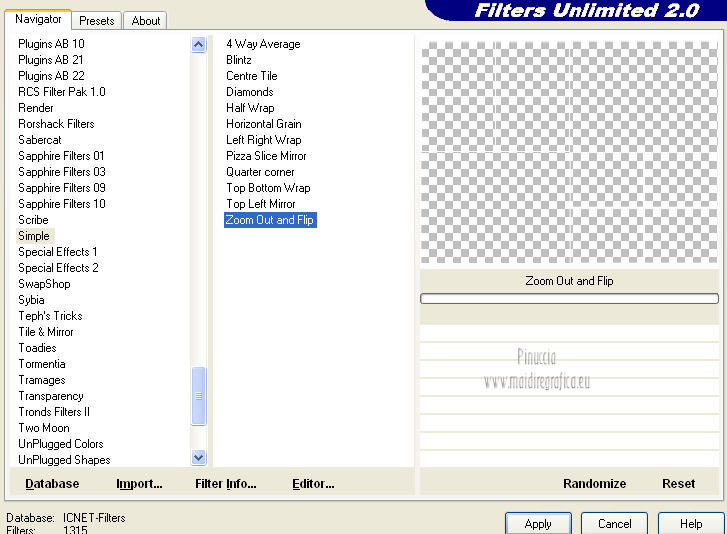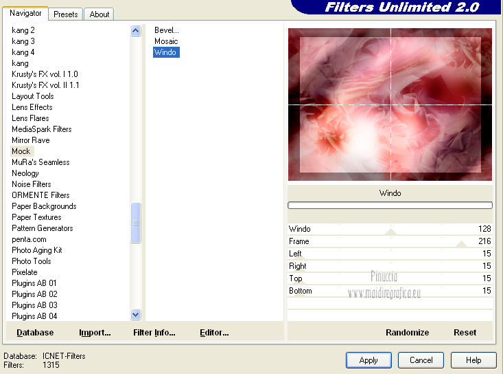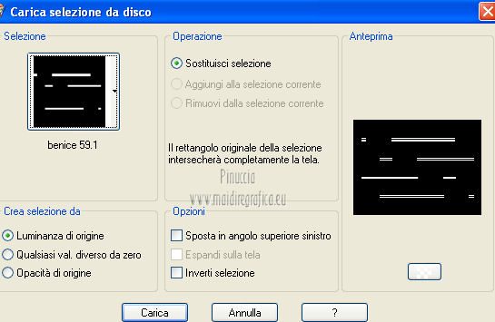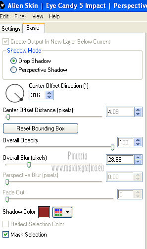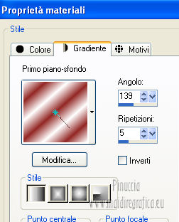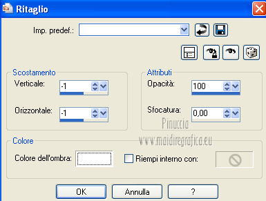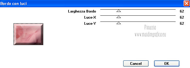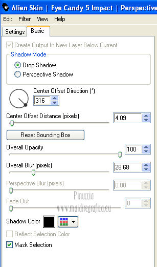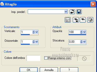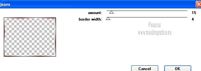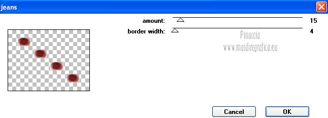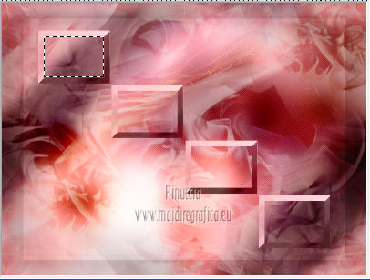 qui puoi trovare qualche risposta ai tuoi dubbi. Se l'argomento che ti interessa non è presente, ti prego di segnalarmelo. Occorrente: Materiale qui Il tube è di Johanna Filtri: consulta, se necessario, la mia sezione filtri qui Filters Unlimited 2.0 qui Mock qui Graphics Plus qui Penta.com qui Italian Editors qui Alien Skin Eye Candy 5 Impact qui Simple qui Tutti questi filtri, tranne Alien Skin, si possono usare da soli o importati in Filters Unlimited (come fare vedi qui ![]() Metti il pennello nella cartella Pennelli. Attenzione, il pennello è composto da due files che non devono essere separati. Vedi gli appunti sui pennelli qui Metti la selezione nella cartella Selezioni. Imposta il colore di primo piano con il colore bianco, e il colore di sfondo con #922724. ![]() 1. Apri una nuova immagine trasparente 800 x 600 pixels. Selezione>Seleziona tutto. Apri l'immagine Achtergrond L 59, e vai a Modifica>Copia. Torna al tuo lavoro e vai a Modifica>Incolla nella selezione. Selezione>Deseleziona. 2. Livelli>Duplica. Effetti>Plugins>Filters Unlimited 2.0 - Mock - Windo. ![]() Chiudi il livello Raster 1 e rimani posizionato sul livello copia di Raster 1. Attiva lo strumento Bacchetta magica ![]() e clicca nello spazio trasparente creato dal filtro. Ingrandisci bene l'immagine per visualizzare meglio lo spazio da selezionare.![]() Livelli>Nuovo livello raster. Riempi la selezione con il colore bianco.Selezione>Deseleziona. Abbassa l'opacità di questo livello al 24%. Riapri il livello Raster 1. 3. Adesso dobbiamo creare un livello con linee bianche, che servirà come livello di supporto e verrà successivamente rimosso. Attiva il livello Raster 2. Attiva lo strumento Bacchetta magica ![]() e clicca nelle sezioni in alto a sinistra e in basso a destra. ![]() Riempi la selezione con il colore bianco.Selezione>Modifica>Contrai - 4 pixels. Premi sulla tastiera il tasto CANC. Selezione>Deseleziona. Effetti>Plugins>Filters Unlimited 2.0 - Simple - Zoom Out and Flip. ![]() Immagine>Ridimensiona, al 101%, tutti i livelli non selezionato. 4. Attiva nuovamente lo strumento Bacchetta magica ![]() e clicca nel riquadro in alto a sinistra. ![]() Attiva il livello inferiore. Selezione>Innalza selezione a livello. Mantieni selezionato. Effetti>Plugins>Italian Editors Effect - Bordo Con Luci. ![]() Selezione>Modifica>Contrai - 16 pixels. Premi sulla tastiera il tasto CANC. Selezione>Deseleziona. Livelli>Disponi>Sposta su. Cambia la modalità di miscelatura di questo livello in Luminanza (esistente). 5. Livelli>Duplica. Effetti>Effetti di immagine>Scostamento. ![]() Livelli>Unisci>Unisci giù. Livelli>Duplica. Effetti>Effetti di immagine>Scostamento. ![]() Livelli>Unisci>Unisci giù. Immagine>Ridimensiona, all'80%, tutti i livelli non selezionato. Adesso puoi eliminare il livello Raster 2. 6. Attiva nuovamente lo strumento Bacchetta magica ![]() e clicca al centro del riquadro superiore. Livelli>Nuovo livello raster. Apri l'immagine Plaatje Benice, e vai a Modifica>Copia. Torna al tuo lavoro e vai a Modifica>Incolla nella selezione. Mantieni selezionato. Livelli>Nuovo livello raster. Effetti>Effetti 3D>Ritaglio, con il colore bianco. ![]() Livelli>Nuovo livello raster. Effetti>Effetti 3D>Ritaglio, con il colore bianco. ![]() Selezione>Deseleziona. Livelli>Unisci>Unisci giù - 2 volte. Livelli>Duplica. Sposta l'immagine sulla seconda cornice.Livelli>Duplica, e sposta l'immagine sulla terza cornice.Livelli>Duplica, e sposta l'immagine sulla quarta cornice.Assicurati di essere posizionato sul livello superiore. Livelli>Unisci>Unisci giù - 3 volte. Effetti>Plugins>Penta.com - Jeans. ![]() Regola>Messa a fuoco>Accentua messa a fuoco. 7. Attiva il livello inferiore. Livelli>Duplica. Effetti>Effetti geometrici>Cerchio. ![]() Selezione>Seleziona tutto. Selezione>Mobile. Selezione>Modifica>Contrai - 2 pixels. Selezione>Inverti. Regola>Sfocatura>Sfocatura. Selezione>Deseleziona. Regola>Messa a fuoco>Accentua messa a fuoco. 9. Attiva il livello Raster 2, il livello con le 4 immagini. Selezione>Seleziona tutto. Selezione>Mobile. Attiva il livello con il cerchio. Premi sulla tastiera il tasto CANC. Selezione>Deseleziona. 9. Passa il colore di primo piano a Gradiente, stile Lineare. ![]() Attiva il livello superiore. Livelli>Nuovo livello raster. Selezione>Carica/Salva selezione>Carica selezione da disco. Cerca e carica la selezione Benice 59.1. ![]() Riempi la selezione con il gradiente.Selezione>Deseleziona. Effetti>Plugins>Graphics Plus - Cross Shadow ![]() Effetti>Plugins>Alien Skin Eye Candy 5 Impact - Perspective Shadow Settings : Drop Shadow Blurry Basic ![]() 10. Apri il tube Circles e vai a Modifica>Copia. Torna al tuo lavoro e vai a Modifica>Incolla come nuovo livello. Sposta il tube in alto a destra.11. Apri il tube JHanna_138_tube_100309 e vai a Modifica>Copia. Torna al tuo lavoro e vai a Modifica>Incolla come nuovo livello. Immagine>Ridimensiona, al 75%, tutti i livelli non selezionato. Regola>Messa a fuoco>Accentua messa a fuoco. Posiziona Il tube come nel mio esempio.Effetti>Plugins>Alien Skin Eye Candy 5 Impact - Perspective Shadow, con i settaggi precedenti, ma con il colore nero. ![]() 12. Imposta il colore di primo piano con il colore bianco. Livelli>Nuovo livello raster. Attiva lo strumento Pennello ![]() cerca e seleziona il pennello Brush_Ik2, con i seguenti settaggi. ![]() Applica il pennello nell'angolo in basso a sinistra, clicca con il tasto sinistro del mouse per usare il colore bianco di primo piano. ![]() 13. Riporta il colore di primo piano a Gradiente. Immagine>Aggiungi bordatura, 2 pixels, simmetriche, con il colore bianco. Immagine>Aggiungi bordatura, 10 pixels, simmetriche, con il colore #922724. Seleziona il bordo da 10 pixels con la bacchetta magica ![]() Selezione>Innalza selezione a livello. Riempi la selezione con il gradiente.Effetti>Plugins>Penta.com - Jeans. ![]() Effetti>Effetti di bordo>Aumenta. Effetti>Plugins>Graphics Plus - Cross Shadow ![]() Abbassa l'opacità di questo l