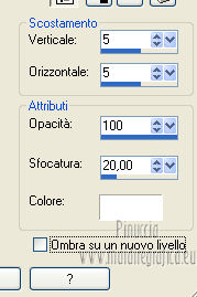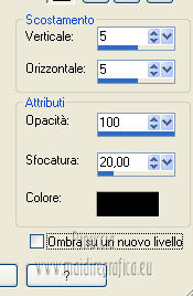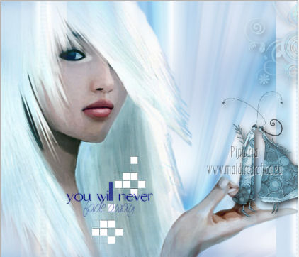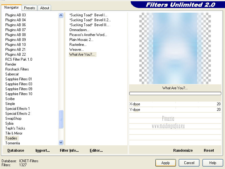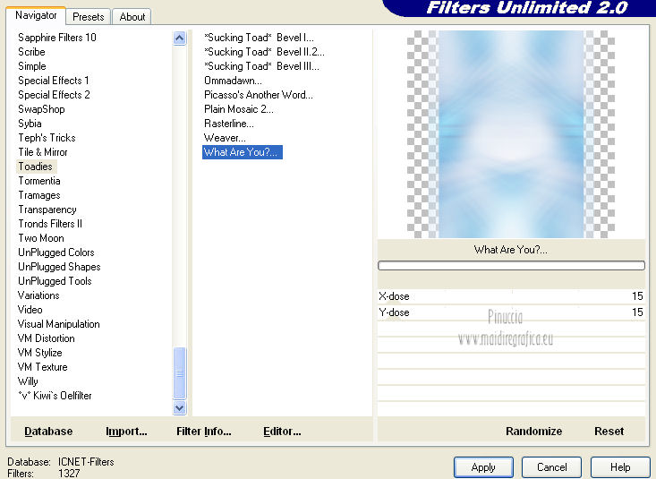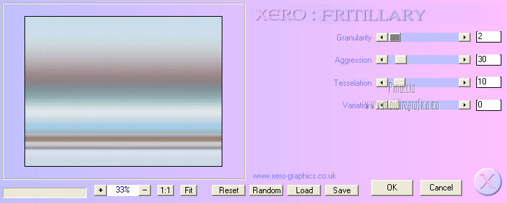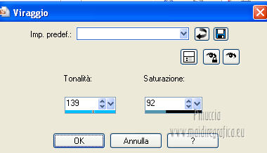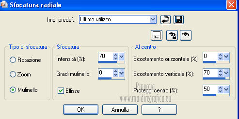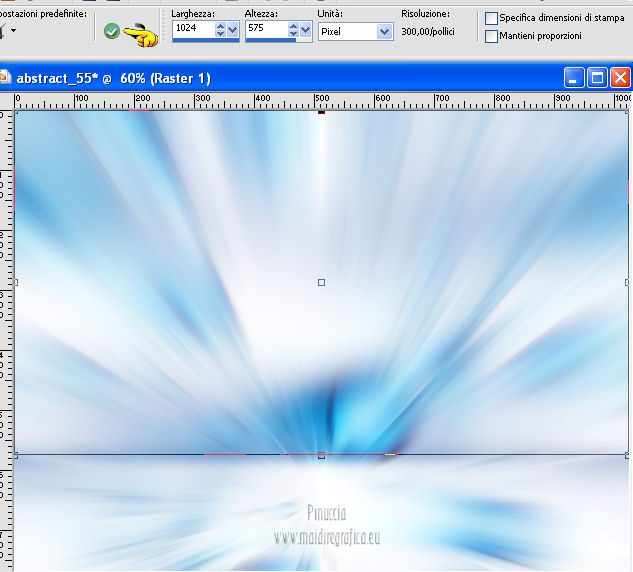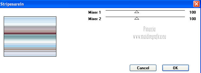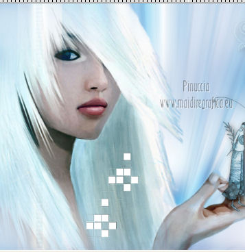 qui puoi trovare qualche risposta ai tuoi dubbi. Se l'argomento che ti interessa non è presente, ti prego di segnalarmelo. ![]() qui trovi i lavori delle partecipanti Occorrente: Materiale qui Filtri: consulta, se necessario, la mia sezione filtri qui Filters Unlimited 2.0 qui Horizonaus Mixed Bag - Stripesareln qui Toadies - What are you qui Xero - Fritillary qui I filtri Toadies e Horizonaus si possono usare da soli o importati in Filters Unlimited (come fare vedi qui) Se un filtro fornito appare con questa icona ![]() 1. Apri l'immagine Abstract_55. Su questa immagine: Effetti>Effetti di immagine>Motivo unico. ![]() Regola>Sfocatura>Sfocatura radiale. ![]() Attiva lo strumento Ritaglio ![]() e traccia un ritaglio della parte superiore dell'immagine. Premi sul segno di spunta per applicare il ritaglio. ![]() Modifica>Copia, e minimizza l'immagine perchè ti servirà ancora. 2. Apri una nuova immagine trasparente 800 x 600 pixels. Selezione>Seleziona tutto. Modifica>Incolla nella selezione. Selezione>Deseleziona. Livelli>Duplica. Immagine>Capovolgi. Abbassa l'opacità di questo livello al 50%. Livelli>Unisci>Unisci giù. Livelli>Duplica. Immagine>Ruota per gradi - 90 gradi a sinistra. ![]() Effetti>Plugins>Filters Unlimited 2.0 - Toadies - What are you? ![]() Ripeti l'Effetto What are you con i settaggi standard. ![]() 3. Livelli>Nuovo livello raster. Attiva lo strumento Selezione , rettangolo,e seleziona il piccolo bordo interno. ![]() Imposta il colore di primo piano con il bianco. Riempi la selezione con il colore bianco.Effetti>Effetti di trama>Veneziana. ![]() Selezione>Deseleziona. Cambia la modalità di miscelatura di questo livello in Luce netta. Livelli>Duplica. Immagine>Rifletti. Livelli>Unisci>Unisci giù. Effetti>Effetti 3D>Sfalsa ombra, con il colore bianco. ![]() Ripeti l'Effetto Sfalsa ombra, cambiando verticale e orizzontale con -5. Livelli>Unisci>Unisci tutto. 4. Livelli>Nuovo livello raster. Attiva lo strumento Selezione , rettangolo,e seleziona la parte centrale ![]() Attiva l'immagine ritagliata Abstract_55 e vai Modifica>Copia. Torna al tuo lavoro e vai a Modifica>Incolla nella selezione. Selezione>Deseleziona. Livelli>Unisci>Unisci tutto. 5. Apri il tube Kikirou929_mist_woman e vai a Modifica>Copia. Torna al tuo lavoro e vai a Modifica>Incolla come nuovo livello. Immagine>Rifletti. Sposta il tube a sinistra.Livelli>Duplica. Livelli>Unisci>Unisci giù. 6. Apri il tube JHanna_169_G e vai Modifica>Copia. Torna al tuo lavoro e vai a Modifica>Incolla come nuovo livello. Regola>Tonalità e saturazione>Viraggio. ![]() Immagine>Ridimensiona, al 45%, tutti i livelli non selezionato. Sposta il tube sulle dita della donna.![]() Effetti>Effetti 3D>Sfalsa ombra, con il colore nero. ![]() Abbassa l'opacità di questo livello al 76%. 7. Apri il tube Graphsabine_design256 e vai Modifica>Copia. Torna al tuo lavoro e vai a Modifica>Incolla come nuovo livello. Immagine>Ridimensiona, al 45%, tutti i livelli non selezionato. Sposta il tube nell'angolo in alto a destra.![]() Effetti>Effetti 3D>Sfalsa ombra, con il colore nero. ![]() Abbassa l'opacità di questo livello al 30%. 8. Apri il tube Geo55 e vai a Modifica>Copia. Torna al tuo lavoro e vai a Modifica>Incolla come nuovo livello. Immagine>Ridimensiona, al 70%, tutti i livelli non selezionato. Immagine>Ruota per gradi - 90 gradi a sinistra. ![]() Sposta il tube in basso a sinistra.![]() 9. Apri il tube tekst e vai a Modifica>Copia. Torna al tuo lavoro e vai a Modifica>Incolla come nuovo livello. Sposta il testo sul tube precedente.![]() Cambia la modalità di miscelatura di questo livello in Luminanza (Esistente). 10. Immagine>Aggiungi bordatura, 1 pixel, simmetriche, con il colore bianco. Immagine>Aggiungi bordatura, 20 pixels, simmetriche, con #cee5f2. Immagine>Aggiungi bordatura, 1 pixel, simmetriche, con il colore bianco. Seleziona il bordo da 20 pixels con la bacchetta magica ![]() Livelli>Nuovo livello raster. Riempi con il colore bianco.Effetti>Effetti di trama>Veneziana, come al punto 3. ![]() Abbassa l'opacità di questo livello al 15%. Selezione>Deseleziona. Livelli>Unisci>Unisci tutto. Livelli>Duplica. Immagine>Ridimensiona, all'80%, tutti i livelli non selezionato. Attiva il livello inferiore. Effetti>Plugins>Horizonaus Mixed Bag - Stripesarel. ![]() Regola>Sfocatura>Sfocatura radiale, come al punto 1. ![]() Effetti>Plugins>Xero - Fritillary. ![]() Livelli>Unisci>Unisci tutto. Aggiungi il tuo nome e/o il tuo watermark e salva in formato jpg. ![]() Se hai problemi o dubbi, o trovi un link non funzionante, o anche soltanto per un saluto, scrivimi 4 Novembre 2012 |