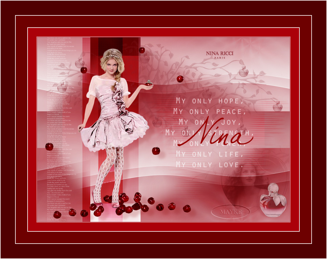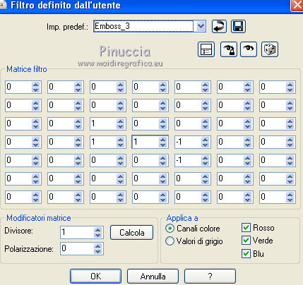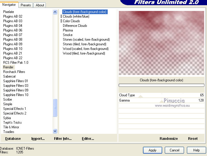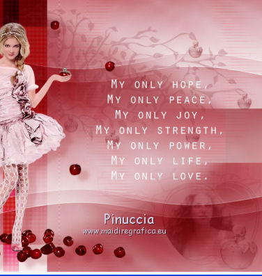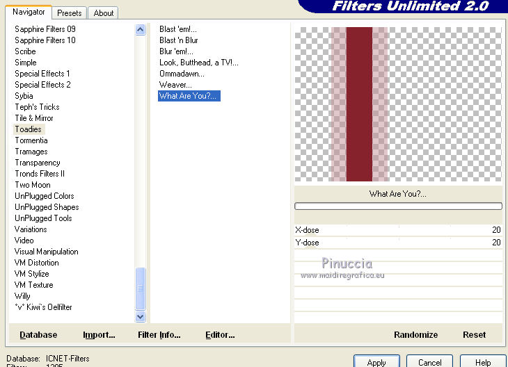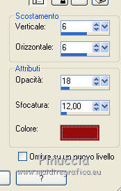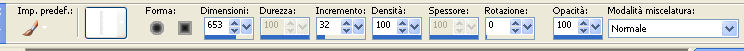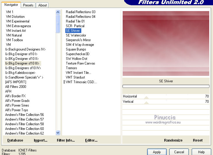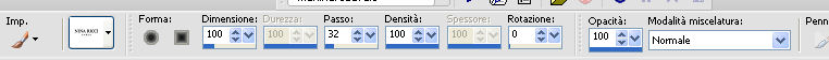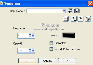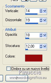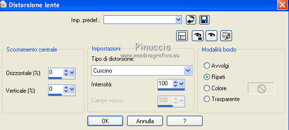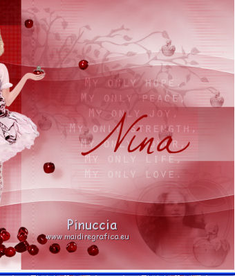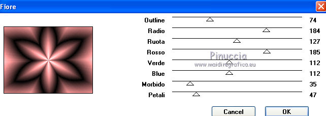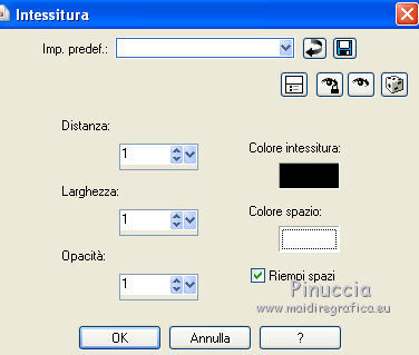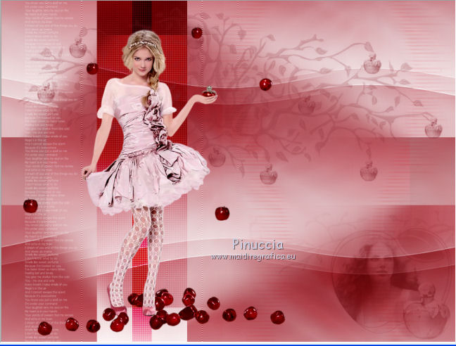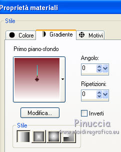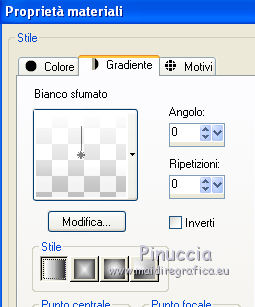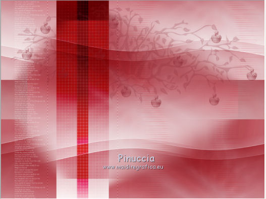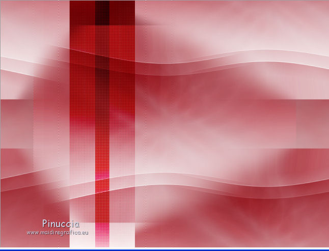 qui puoi trovare qualche risposta ai tuoi dubbi. Se l'argomento che ti interessa non è presente, ti prego di segnalarmelo. Occorrente: Materiale qui Il tube della donna è di Benice, e non può essere usato per altri tutorial. Filtri: consulta, se necessario, la mia sezione filtri qui Filters Unlimited 2.0 qui &<Bkg Designer sf10III> qui Toadies qui Transparency - Eliminate Black qui Italian Editors Effect qui i filtri Toadies, Transparency e Italian Editors si possono usare importati in Unlimited, ma possono funzionare anche da soli ![]() Metti i pennelli nella cartella Pennelli. Attenzione, ogni pennello è composto da due files che non devono essere separati. Vedi gli appunti sui pennelli qui Il gradiente Corel_06_028 è standard nelle versioni più recenti di PSP, e corrisponde al gradiente standard Bianco sfumato. Se non lo trovi nel tuo PSP, metti quello fornito nella cartella Gradienti. Metti il preset Emboss 3 nella cartella Impostazioni predefinite. Metti le selezioni nella cartella Selezioni. Apri la maschera in PSP e minimizzala con il resto del materiale. Imposta il colore di primo piano con #ffffff e il colore di sfondo con #86222c. ![]() Passa il colore di primo piano a Gradiente, stile Lineare, con i seguenti settaggi. ![]() 1. Apri una nuova immagine trasparente 870 x 653 pixels. ![]() Riempi l'immagine trasparente con il gradiente.2. Imposta come Gradiente il gradiente Bianco sfumato (Corel_06_028), stile lineare, con i seguenti settaggi. ![]() 3. Livelli>Nuovo livello raster. Riempi il livello con il gradiente.Effetti>Plugins>Filters Unlimited 2.0 - Render - Clouds(fore-/background color): ![]() Abbassa l'opacità di questo livello al 30%. Livelli>Unisci>Unisci giù. 4. Livelli>Duplica. Effetti>Plugins>It@,lian Editors Effect - Fiore. ![]() Effetti>Plugins>Transparency - Eliminate black. Cambia la modalità di miscelatura di questo livello in Rafforza, e abbassa l'opacità al 44%. 5. Selezione>Carica/Salva selezione>Carica selezione da disco. Cerca e carica la selezione Benice 158.1. ![]() Premi sulla tastiera il tasto CANC. Selezione>Deseleziona. 6. Livelli>Unisci>Unisci giù. Dovresti avere questo: ![]() 7. Livelli>Duplica. Effetti>Plugins>&<Bkg Designer@ sf10 III - SE Shiver ![]() Effetti>Filtro definito dall'utente, apri il menu delle impostazioni e seleziona Emboss_3. ![]() Effetti>Effetti di distorsione>Distorsione lente. ![]() Immagine>Ridimensiona - all'80%, tutti i livelli non selezionato. Livelli>Duplica. Cambia la modalità di miscelatura di questo livello in Sovrapponi, e abbassa l'opacità al 40%. 8. Livelli>Unisci>Unisci giù. Effetti>Effetti di immagine>Motivo unico. ![]() 9. Livelli>Nuovo livello raster. Selezione>Carica/Salva selezione>Carica selezione da disco. Cerca e carica la selezione Benice 158.2. ![]() Riempi la selezione con il colore di sfondo.Selezione>Deseleziona. Effetti>Plugins>Filters Unlimited 2.0 - Toadies - What are you - 2 volte con i settaggi standard. ![]() Effetti>Effetti di trama>Intessitura. ![]() Cambia la modalità di miscelatura di questo livello in Rafforza. 10. Imposta nuovamente il colore di primo piano con #ffffff. ![]() 11. Livelli>Nuovo livello raster. Selezione>Carica/Salva selezione>Carica selezione da disco. Cerca e carica la selezione Benice 158.3. ![]() Ingrandisci almeno al 200% l'immagine per visualizzare meglio lo stretto spazio da riempire. Riempi la selezione con il colore di primo piano, cliccando tre volte.Selezione>Deseleziona. Effetti>Effetti di trama>Veneziana. ![]() Cambia la modalità di miscelatura di questo livello in Sovrapponi. 12. Dovresti avere questo: ![]() 13. Livelli>Nuovo livello raster. Riempi il livello con il colore di sfondo.Livelli>Nuovo livello maschera>Da immagine. Apri il menu sotto la finestra di origine e vedrai la lista dei files aperti. Seleziona la maschera Masker_Benice_L158_Nina_Boom, con i seguenti settaggi: ![]() Livelli>Unisci>Unisci gruppo. 14. Livelli>Nuovo livello raster. Attiva lo strumento Pennello ![]() cerca e seleziona il pennello Benice_L158_Tekst ![]() Applicalo a sinistra, cliccando con il tasto sinistro del mouse, per usare il colore di primo piano. ![]() Se il tuo PSP non supporta pennelli superiori a 500 pixels, il pennello apparirà con la dimensione di 32 pixels. ![]() Imposta la dimensione massima consentita, ![]() e, dopo averlo applicato, premi sulla tastiera il tasto D per attivare lo strumento Deformazione ![]() in modalità Scala, usando i nodi centrali, allarga leggermente il pennello, e allungalo fino a riempire tutta l'altezza della tela. ![]() 15. Livelli>Nuovo livello raster. Selezione>Carica/Salva selezione>Carica selezione da disco. Cerca e carica la selezione Benice 158.4. ![]() Ingrandisci l'immagine almeno al 200%. Attenzione: la selezione lascia il colore molto chiaro, per questo all'inizio non vedrai nulla; sarà necessario cliccare 3 volte per riempirla. Riempi la selezione con il colore di sfondo, cliccando 3 volte.Selezione>Deseleziona. Cambia la modalità di miscelatura di questo livello in Luce netta. 16. Dovresti avere questo: ![]() 17. Livelli>Nuovo livello raster. Attiva nuovamente lo strumento Pennello ![]() cerca e seleziona il pennello Benice_L158_Nina ![]() Applicalo nell'angolo in basso a destra, cliccando con il tasto sinistro del mouse per usare il colore di primo piano. ![]() Immagine>Immagine negativa. se stai usando PSP 9: Regola>Bilanciamento colore>Immagine negativa Cambia la modalità di miscelatura di questo livello in Luce diffusa. 18. Apri il tube Benice_L158_Nina_Woman e vai a Modifica>Copia. Torna al tuo lavoro e vai a Modifica>Incolla come nuovo livello. Sposta il tube come nell'esempio.![]() Effetti>Effetti 3D>Sfalsa ombra, con il colore #960d0d. ![]() 19. Apri il tube Evanescene_lyrics_brushes__by_Sankaku69_86 e vai a Modifica>Copia. Torna al tuo lavoro e vai a Modifica>Incolla come nuovo livello. Immagine>Ridimensiona - all'85%, tutti i livelli non selezionato. Immagine>Immagine negativa. se stai usando PSP 9: Reg