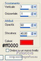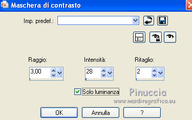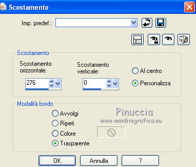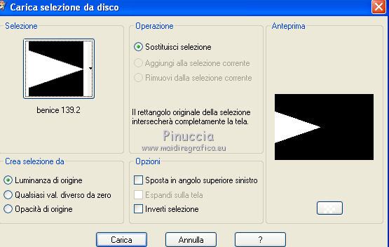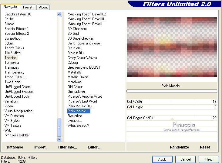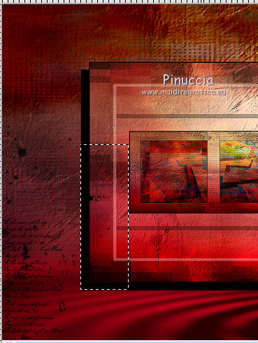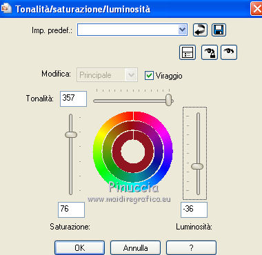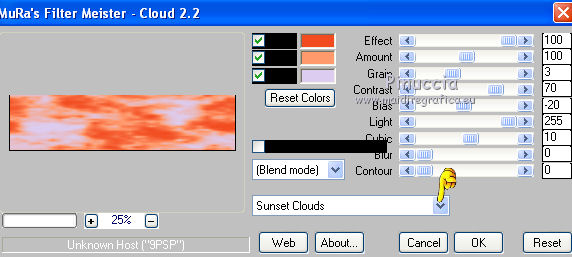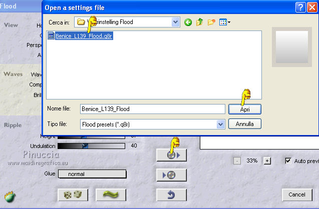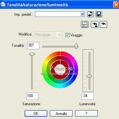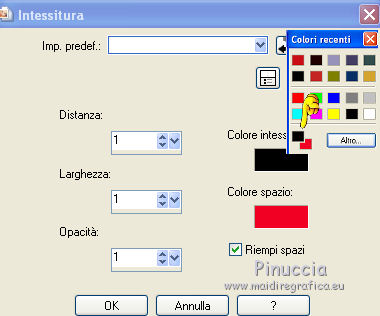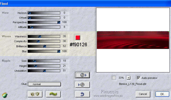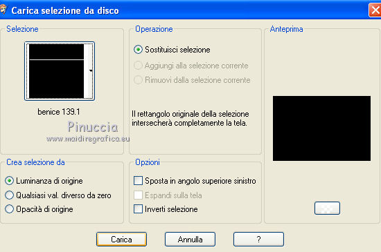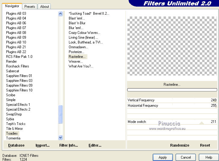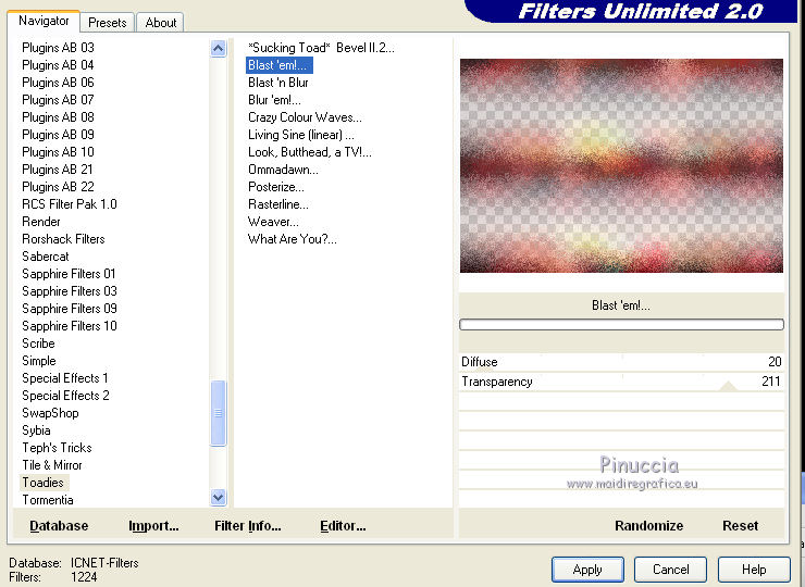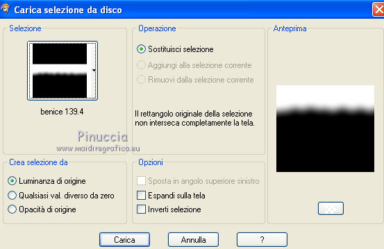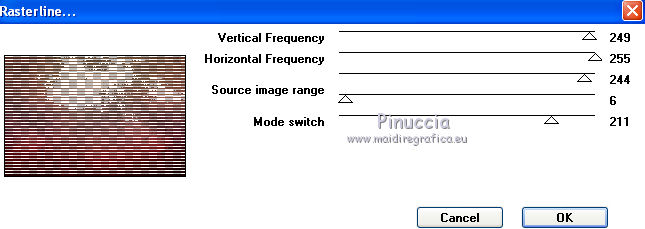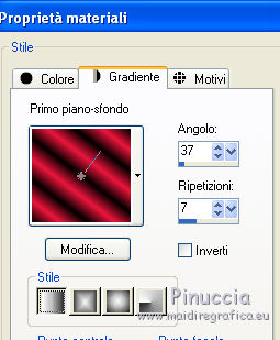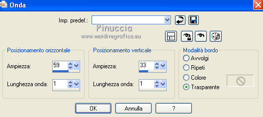 qui puoi trovare qualche risposta ai tuoi dubbi. Se l'argomento che ti interessa non è presente, ti prego di segnalarmelo. Occorrente: Materiale qui Filtri: consulta, se necessario, la mia sezione filtri qui Filters Unlimited 2.0 qui Flaming Pear - Flood qui Toadies qui Mura's Meister - Cloud qui I filtri Toadies si possono usare da soli o importati in Filters Unlimited ![]() Metti il preset per il filtro Flood nella cartella in cui hai scompattato il materiale. Lo importerai da questa cartella, quando ti servirà. Metti Emboss_3 nella cartella Impostazioni predefinite. Metti le selezioni nella cartella Selezioni. Imposta il colore di primo piano con #000000, e il colore di sfondo con #ec163c. ![]() 1. Apri una nuova immagine trasparente 900 x 600 pixels. Selezione>Seleziona tutto. Apri l'immagine Achtergrond_L139 e vai a Modifica>Copia. Torna al tuo lavoro e vai a Modifica>Incolla nella selezione. Selezione>Deseleziona. 2. Livelli>Nuovo livello raster. Selezione>Seleziona tutto. Apri l'immagine Hg-arms_wide_open21 e vai a Modifica>Copia. Torna al tuo lavoro e vai a Modifica>Incolla nella selezione. Selezione>Deseleziona. Effetti>Filtro definito dall'utente apri il menu delle impostazioni e seleziona il preset Emboss_3. ricorda che i preset sono settaggi salvati per un uso futuro. Se hai problemi con i preset, puoi impostare manualmente i settaggi che vedi nella schermata ![]() Cambia la modalità di miscelatura di questo livello in Luce netta. Livelli>Unisci>Unisci giù. 3. Finestra>Duplica (o, sulla tastiera, maiuscola+D) 2 volte, per fare due copie del lavoro. Minimizza i due duplicati e torna al tuo lavoro originale. 4. Livelli>Duplica. Effetti>Plugins>Toadies - Rasterline. ![]() ho usato il filtro da solo, perchè importandolo in Unlimited, il livello spariva. ![]() Cambia la modalità di miscelatura di questo livello in Indebolisci, e abbassa l'opacità al 26%. 5. Livelli>Nuovo livello raster. Selezione>Seleziona tutto. Apri l'immagine 96_by_iveseen the future, e vai a Modifica>Copia. Torna al tuo lavoro e vai a Modifica>Incolla nella selezione. Selezione>Deseleziona. Cambia la modalità di miscelatura di questo livello in Sovrapponi. 6. Livelli>Unisci>Unisci tutto. Immagine>Ridimensiona - 100 x 50%, tutti i livelli selezionato, e mantieni proporzioni non selezionato. ![]() Immagine>Aggiungi bordatura, 3 pixels, simmetriche, con il colore #210102. Immagine>Ridimensiona - 900 x 300 pixels, tutti i livelli selezionato, mantieni proporzioni non selezionato. ![]() Regola>Messa a fuoco>Metti a fuoco. Modifica>Copia, e minimizza l'immagine che ti servirà ancora. 7. Attiva uno dei duplicati del punto 3, che diventerà il tuo nuovo lavoro. Modifica>Incolla come nuovo livello, e avrai questo. ![]() 8. Effetti>Effetti di immagine>Motivo unico. ![]() Effetti>Plugins>Filters Unlimited 2.0 - Toadies - Ommadawn. ![]() Effetti>Plugins>Filters Unlimited 2.0 - Toadies - Blast'em!. ![]() Cambia la modalità di miscelatura di questo livello in Indebolisci, e abbassa l'opacità all'84%. 9. Livelli>Duplica. Effetti>Plugins>Filters Unlimited 2.0 - Toadies - Plain Mosaic. ![]() se non visualizzi l'Effetto nella lista del filtro, usa il filtro fornito nell'anteprima del tutorial, elimina il filtro importato nel tuo Unlimited (tasto destro del mouse su Toadies e clicca su Delete), e importa la nuova cartella Cambia la modalità di miscelatura di questo livello in Sovrapponi, e abbassa l'opacità al 60%. Effetti>Effetti di bordo>Aumenta. Livelli>Unisci>Unisci visibile. 10. Livelli>Nuovo livello raster. Selezione>Seleziona tutto. Apri il tube Lijst e vai a Modifica>Copia. Torna al tuo lavoro e vai a Modifica>Incolla nella selezione. Selezione>Deseleziona. Cambia la modalità di miscelatura di questo livello in Luce netta, e abbassa l'opacità al 28%. 11. Attiva l'immagine del punto 6 e vai a Modifica>Copia. Torna al tuo lavoro e vai a Modifica>Incolla come nuovo livello. Immagine>Ridimensiona, al 76%, tutti i livelli non selezionato, mantieni proporzioni selezionato. ![]() Regola>Messa a fuoco>Metti a fuoco. 12. Livelli>Nuovo livello raster. Selezione>Carica/Salva selezione>Carica selezione da disco. Cerca e carica la selezione Benice 139.1. ![]() Ingrandisci l'immagine per visualizzare meglio le selezioni,e riempi la selezione con il colore di primo piano.Selezione>Deseleziona. 13. Livelli>Unisci>Unisci tutto. Immagine>Aggiungi bordatura, 3 pixels, simmetriche, con il colore #210102. Immagine>Ridimensiona, al 65%, tutti i livelli selezionato. ![]() Regola>Messa a fuoco>Metti a fuoco. 14. Passa il colore di primo piano a Gradiente, stile Lineare. ![]() 15. Attiva il secondo duplicato minimizzato al punto 3 e lavora su questo duplicato. Livelli>Nuovo livello raster. Selezione>Carica/Salva selezione>Carica selezione da disco. Cerca e carica la selezione Benice 139.2. ![]() Riempi la selezione con il gradiente.Selezione>Deseleziona. Effetti>Effetti di distorsione>Onda. ![]() Livelli>Duplica. Immagine>Rifletti. Immagine>Capovolgi. Livelli>Unisci>Unisci visibile. 16. Selezione>Carica/Salva selezione>Carica selezione da disco. Cerca e carica la selezione Benice 139.3. ![]() Effetti>Plugins>Flaming Pear - Flood, clicca sull'icona della freccia a destra, e cerca - nella cartella in cui lo hai salvato - il preset Benice_L139_Flood.18r. ![]() ricorda che i preset sono settaggi salvati per un uso futuro, se hai problemi con i preset, puoi anche impostare manualmente i settaggi che vedi nella schermata ![]() Selezione>Deseleziona. 17. Apri il tube Benice_tube_Flood_L139 e vai a Modifica>Copia. Torna al tuo lavoro e vai a Modifica>Incolla come nuovo livello. Effetti>Effetti di immagine>Scostamento. ![]() Livelli>Unisci>Unisci giù. 18. Selezione>Carica/Salva selezione>Carica selezione da disco. Cerca e carica la selezione Benice 139.4. ![]() Selezione>Innalza selezione a livello. Effetti>Plugins>Mura's Meister - Cloud. Seleziona il preset Sunset Cloud e ok. ![]() ricorda che il risultato di questo filtro è sempre casu