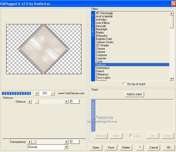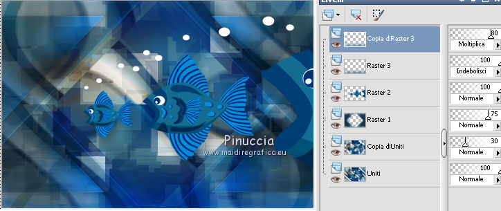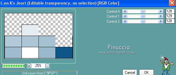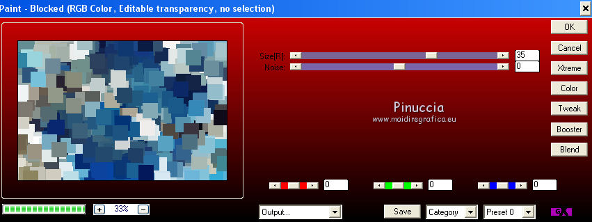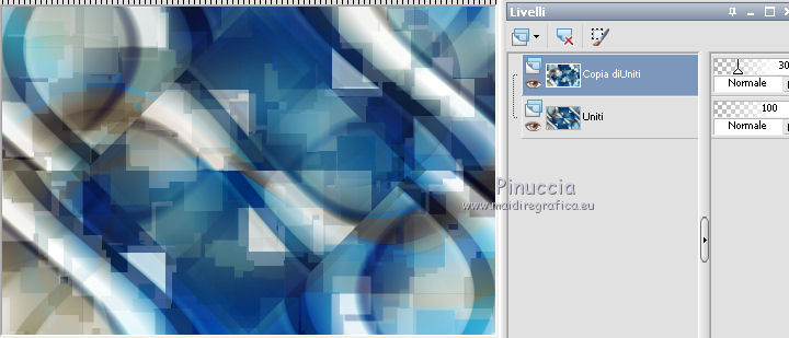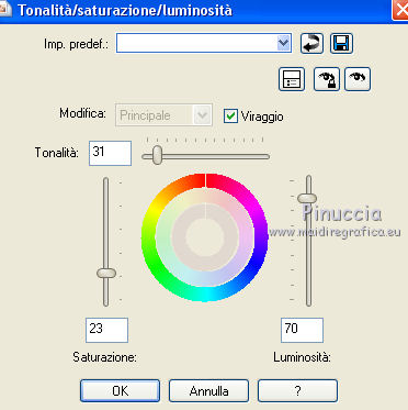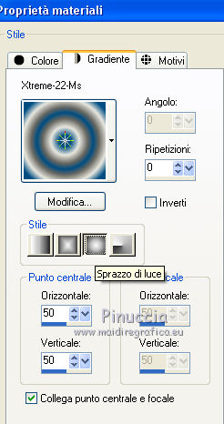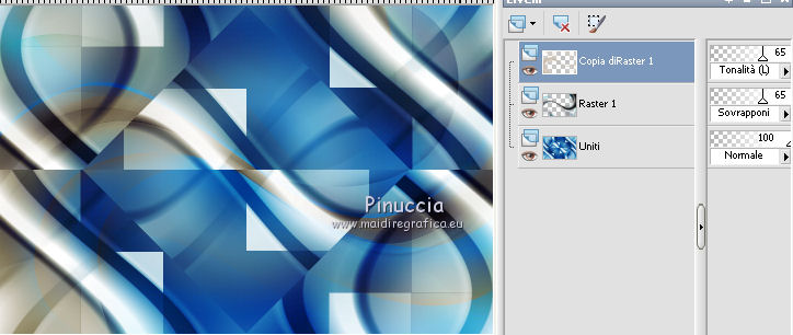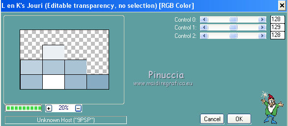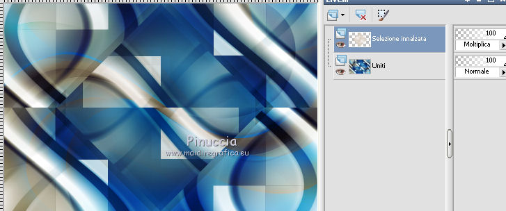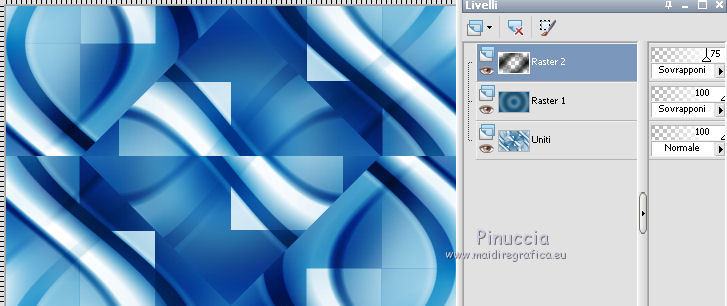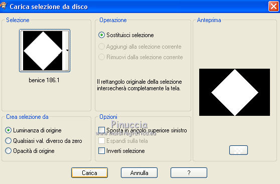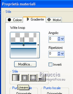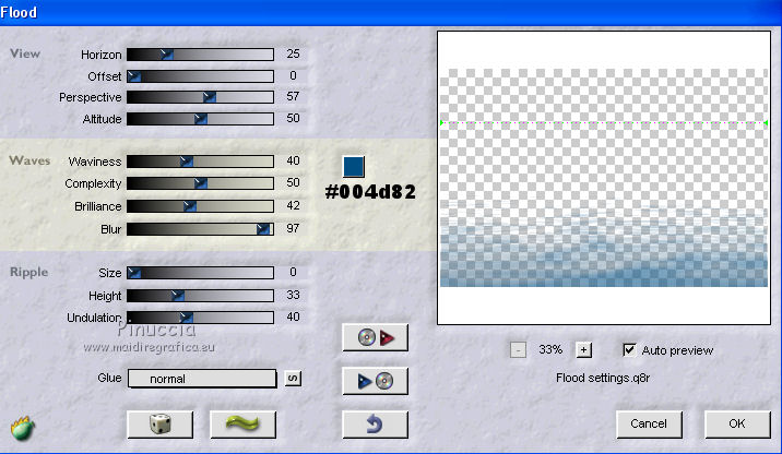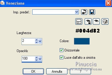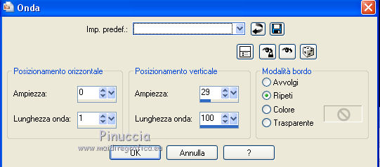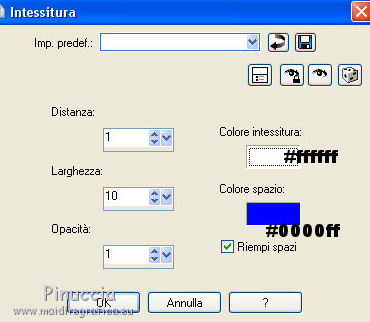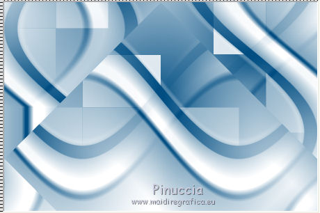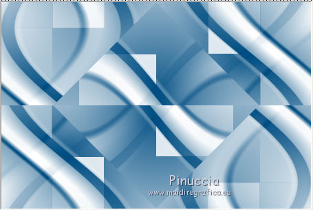 qui puoi trovare qualche risposta ai tuoi dubbi. Se l'argomento che ti interessa non è presente, ti prego di segnalarmelo. Occorrente: Materiale qui Filtri: consulta, se necessario, la mia sezione filtri qui Filters Unlimited 2.0 qui Transparency - Eliminate Black qui Simple qui VanDerLee - Unplugged-X qui Flaming Pear - Flood 120 qui L&K - Jouri qui AP 14 [Motion] - qui I filtri Transparency e Simple si possono usare da soli o importati in Filters Unlimited (come fare vedi qui) Se un filtro fornito appare con questa icona ![]() Metti i gradienti nella cartella Gradienti. Metti le selezioni nella cartella Selezioni. Imposta il colore di primo piano con #004d82, e il colore di sfondo con #fffff. ![]() Passa il colore di primo piano a Gradiente di primo piano/sfondo, stile Sprazzo di luce. ![]() 1. Apri una nuova immagine trasparente 900 x 600 pixels, e riempila con il gradiente.2. Cambia il gradiente con il gradiente witte knop, stile Lineare. ![]() Attenzione, se stai usando un diverso colore di primo piano, il gradiente avrà un altro aspetto. Questi sono i miei colori. ![]() 3. Livelli>Nuovo livello raster. Riempi il livello con il gradiente.Effetti>Effetti di distorsione>Onda. ![]() Livelli>Duplica. Chiudi il livello superiore e attiva il livello raster 2. ![]() Effetti>Plugins>L&K's - L&K's Jouri. ![]() Attenzione, se hai impostato la visualizzazione dell'anteprima con una percentuale differente, vedrai ovviamente un'anteprima diversa. Per esempio se la tua percentuale è impostata sul 20%, vedrai questo. ![]() Naturalmente, la percentuale dell'anteprima non ha alcuna influenza sulle impostazioni del filtro Selezione>Seleziona tutto. Selezione>Mobile. Selezione>Immobilizza. Effetti>Plugins>Transparency - Eliminate Black. Selezione>Deseleziona. 4. Riapri e attiva il livello superiore. Effetti>Effetti di immagine>Motivo unico. ![]() 5. Livelli>Unisci>Unisci visibile. Dovresti avere questo. ![]() 6. Su questo livello: Effetti>Plugins>Simple - Blintz. Risultato: ![]() Attiva lo strumento Selezione ![]() clicca sull'icona Selezione personalizzata ![]() e imposta i seguenti settaggi. ![]() Premi sulla tastiera il tasto CANC ![]() Selezione>Deseleziona. Livelli>Duplica. Immagine>Rifletti. Immagine>Capovolgi. Livelli>Unisci>Unisci visibile. ![]() 7. Cambia il gradiente con Xtreme-22-MS, stile Sprazzo di luce. ![]() Nota. Anche questo gradiente è influenzato dal colore di primo piano. Questi i miei colori. ![]() 8. Livelli>Nuovo livello raster. Riempi il livello con il gradiente.Regola>Sfocatura>Sfocatura gaussiana - raggio 30. ![]() Effetti>Effetti di trama>Veneziana - colore #004d82. ![]() Cambia la modalità di miscelatura di questo livello in Sovrapponi. 9. Apri il tube Benice_Overlay_L186 e vai a Modifica>Copia. Torna al tuo lavoro e vai a Modifica>Incolla come nuovo livello. Lascialo come sta. Effetti>Effetti di trama>Intessitura. Colore intessitura #ffffff, colore spazio #0000ff. ![]() Cambia la modalità di miscelatura di questo livello in Sovrapponi, e abbassa l'opacità al 75%. ![]() 10. Livelli>Unisci>Unisci visibile. 11. Livelli>Nuovo livello raster. Selezione>Seleziona tutto. Apri il tube Benice_Deco_1 e vai a Modifica>Copia. Torna al tuo lavoro e vai a Modifica>Incolla nella selezione. Selezione>Deseleziona. Cambia la modalità di miscelatura di questo livello in Sovrapponi, e abbassa l'opacità al 65%. 12. Livelli>Duplica. Immagine>Rifletti. Immagine>Capovolgi. Regola>Tonalità e saturazione>Tonalità/Saturazione/Luminosità. ![]() Cambia la modalità di miscelatura di questo livello in Tonalità (esistente), e lascia l'opacità al 65%. ![]() 13. Livelli>Unisci>Unisci visibile. Selezione>Carica/Salva selezione>Carica selezione da disco. Cerca e carica la selezione Benice 186.1 ![]() Selezione>Innalza selezione a livello. Selezione>Deseleziona. Regola>Tonalità e saturazione>Tonalità/Saturazione/Luminosità. ![]() Effetti>Plugins>VanDerLee - Unplugged-X - Defocus. ![]() Cambia la modalità di miscelatura di questo livello in Moltiplica. ![]() 14. Livelli>Unisci>Unisci visibile. Livelli>Duplica. ![]() Abbassa l'opacità di questo livello al 30%. ![]() 16. Apri il tube Benice_Deco_2 e vai a Modifica>Copia. Torna al tuo lavoro e vai a Modifica>Incolla come nuovo livello. Lascialo come sta. Abbassa l'opacità di questo livello al 75%. 17. Apri il tube Benice_Deco_3 e vai a Modifica>Copia. Torna al tuo lavoro e vai a Modifica>Incolla come nuovo livello. Effetti>Effetti di immagine>Scostamento. ![]() Effetti>Effetti 3D>Sfalsa ombra. ![]() 18. Sei posizionato sul livello superiore. Modifica>Copia Unione. Modifica>Incolla come nuovo livello. Selezione>Carica/Salva selezione>Carica selezione da disco. Cerca e carica la selezione Benice 186.2. ![]() Selezione>Inverti. Premi sulla tastiera il tasto CANC ![]() Di nuovo Selezione>Inverti. Regola>Sfocatura>Sfocatura gaussiana - raggio 10. ![]() Selezione>Deseleziona. Effetti>Plugins>Flaming Pear - Flood - colore #004d82. ![]() Cambia la modalità di miscelatura di questo livello in Indebolisci. Livelli>Duplica. Cambia la modalità di miscelatura di questo livello in Motliplica, e abbassa l'opacità all'80%. ![]() 19. Apri il tube Benice_Deco_4_L186 e vai a Modifica>Copia. Torna al tuo lavoro e vai a Modifica>Incolla come nuovo livello. Spostalo nell'angolo in basso a sinistra.![]() 20. Apri il tube Benice_Deco_5_L186 e vai a Modifica>Copia. Torna al tuo lavoro e vai a Modifica>Incolla come nuovo livello. Spostalo nell'angolo in basso a destra.![]() 21. Apri il tube Benice_Tekst_L186 e vai a Modifica>Copia. Torna al tuo lavoro e vai a Modifica>Incolla come nuovo livello. Spostalo in alto a sinistra.![]() 22. Livelli>Unisci>Unisci tutto. Immagine>Aggiungi bordatura, 1 pixel, simmetriche, con il colore #004d82. Immagine>Aggiungi bordatura, 20 pixels, simmetriche, con il colore bianco #ffffff. Immagine>Aggiungi bordatura, 1 pixel, simmetriche, con il colore #004d82. Immagine>Aggiungi bordatura, 40 pixels, simmetriche, con il colore bianco #fff
