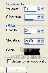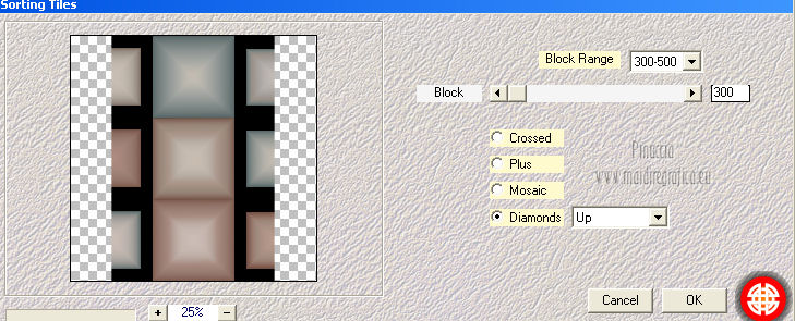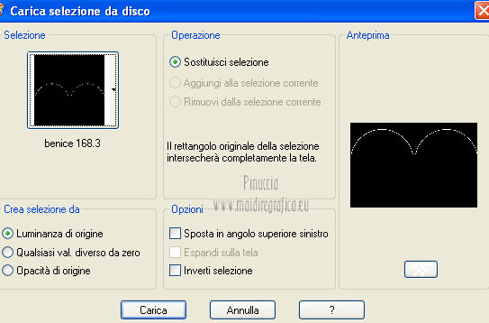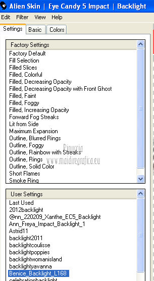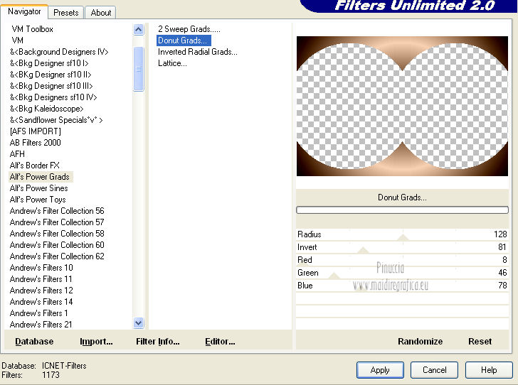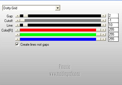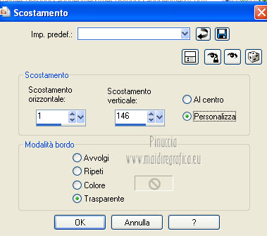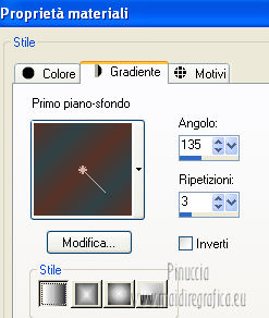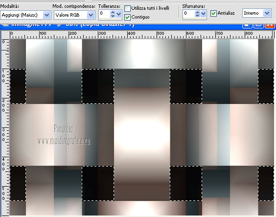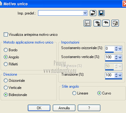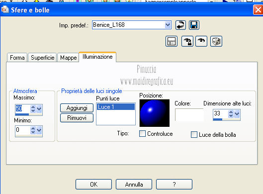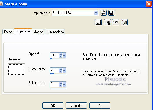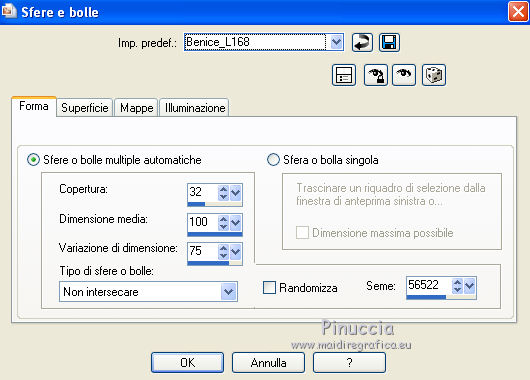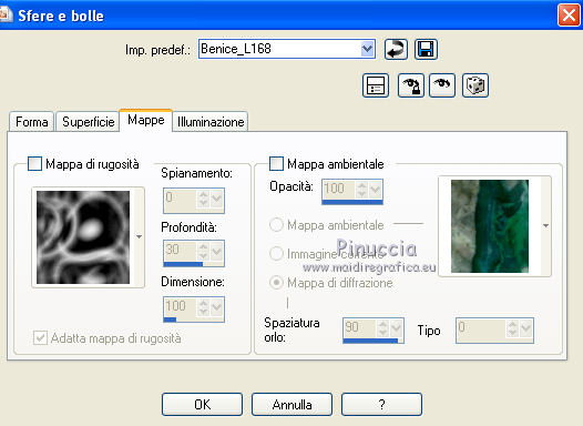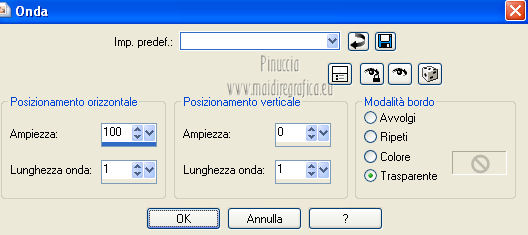 qui puoi trovare qualche risposta ai tuoi dubbi. Se l'argomento che ti interessa non è presente, ti prego di segnalarmelo. Occorrente: Materiale qui Il tube della donna è di Benice e non può essere usato per altri tutorial. Filtri: consulta, se necessario, la mia sezione filtri qui Filters Unlimited 2.0 qui Alf's Power Grads (da importare in Unlimited) qui AP Lines - Lines SilverLining qui Mehdi - Sorting Tiles qui Mehdi - Wavy Lab 1.1 qui VM Natural qui Alien Skin Eye Candy 5 Impact qui I filtri VM Natural, come tutti quelli della serie Visman, si possono usare importati in Filters Unlimited, ma possono funzionare anche da soli ![]() Metti il preset nella cartella del filtro Alien Skin Eye Candy 5 Impact>Settings>Backlight. Cliccando sul file, il preset sarà automaticamente importato nella cartella corretta. Metti il preset "Preset BallsAndBubbles_Benice_L168" nella cartella Impostazioni predefinite. Metti le selezioni nella cartella Selezioni. Imposta il colore di primo piano con #583227, e il colore di sfondo con #304246. ![]() 1. Apri una nuova immagine trasparente 900 x 600 pixels. Effetti>Plugins>Mehdi - Wavy Lab 1.1. ![]() Regola>Sfocatura>Sfocatura gaussiana - raggio 70. ![]() 2. Livelli>Duplica. Effetti>Plugins>Mehdi - Sorting Tile. ![]() Cambia la modalità di miscelatura di questo livello in Luminanza (Esistente), e abbassa l'opacità al 50%. Livelli>Unisci>Unisci giù. 3. Livelli>Duplica. Immagine>Ruota per gradi - 90 gradi a destra. ![]() Effetti>Plugins>Mehdi - Sorting Tiles. ![]() Effetti>Effetti di immagine>Motivo unico. ![]() Livelli>Unisci>Unisci giù. 4. Livelli>Duplica. Effetti>Plugins>Filters Unlimited 2.0 - VM Natural - Weave Distortion. ![]() Immagine>Ridimensiona - 100% x 110%, tutti i livelli e mantieni proporzioni non selezionato. ![]() Effetti>Effetti di immagine>Scostamento. ![]() 5. Attiva lo strumento Bacchetta magica ![]() e clicca negli spazi scuri per selezionarli. ![]() Selezione>Innalza selezione a livello. Selezione>Deseleziona. Effetti>Effetti di trama>Intessitura colore intessitura #dfd0bd - Riempi spazi #583227. ![]() Cambia la modalità di miscelatura di questo livello in Filtra, e abbassa l'opacità al 70%. Livelli>Unisci>Unisci visibile. 6. Dovresti avere questo. ![]() 7. Livelli>Nuovo livello raster. Effetti>Plugins>Filters Unlimited 2.0 - Alf's Power Grads - Donut Grads. ![]() Cambia la modalità di miscelatura di questo livello in Esclusione. 8. Attiva nuovamente lo strumento Bacchetta magica ![]() e clicca nello spazio trasparente per selezionarlo. ![]() Selezione>Modifica>Sfuma - 6 pixels. ![]() Regola>Sfocatura>Sfocatura gaussiana - raggio 100. ![]() Modifica>Ripeti Sfocatura gaussiana. Premi sulla tastiera il tasto CANC. Selezione>Deseleziona. Abbassa l'opacità di questo livello al 30%. 9. Livelli>Duplica. Effetti>Plugins>AP Lines - Lines SilverLining. ![]() Cambia la modalità di miscelatura di questo livello in Indebolisci, lascia l'opacità al 30%. Livelli>Unisci>Unisci visibile. 10. Dovresti avere questo. ![]() 11. Passa il colore di primo piano a Gradiente, stile Lineare. ![]() 12. Livelli>Nuovo livello raster. Selezione>Carica/Salva selezione>Carica selezione da disco. Cerca e carica la selezione Benice 168.1. ![]() Riempi la selezione con il gradiente.Selezione>Deseleziona. Effetti>Effetti di distorsione>Onda. ![]() 13. Livelli>Duplica. Immagine>Capovolgi. Livelli>Unisci>Unisci giù. Effetti>Effetti di immagine>Motivo unico. ![]() Cambia la modalità di miscelatura di questo livello in Sovrapponi, e abbassa l'opacità al 50%. 14. Livelli>Nuovo livello raster. Selezione>Carica/Salva selezione>Carica selezione da disco. Cerca e carica la selezione Benice 168.2. ![]() Effetti>Effetti artistici>Sfere e bolle. Apri il menu delle impostazioni predefinite, seleziona il preset Benice_L168. i preset sono settaggi salvati per poterli usare in future occasioni, pertanto, se hai problemi con il preset, puoi impostare manualmente i settaggi che vedi nelle schermate sotto. ![]() ![]() ![]() ![]() Selezione>Deseleziona. 15. Imposta il colore di primo piano con #583227. 16. Livelli>Nuovo livello raster. Selezione>Carica/Salva selezione>Carica selezione da disco. Cerca e carica la selezione Benice 168.3. ![]() Riempi la selezione con il colore di primo piano.Selezione>Deseleziona. Effetti>Plugins>Alien Skin Eye Candy 5 Impact - Backlight. Seleziona il preset Benice_BacklightL168 e ok. ![]() 17. Selezione>Carica/Salva selezione>Carica selezione da disco. Carica nuovamente la selezione Benice 168.2. ![]() Premi sulla tastiera il tasto CANC. Selezione>Deseleziona. Regola>Messa a fuoco>Metti a fuoco. Cambia la modalità di miscelatura di questo livello in Sovrapponi, e abbassa l'opacità al 75%. 18. Dovresti avere questo. ![]() 19. Livelli>Nuovo livello raster. Selezione>Carica/Salva selezione>Carica selezione da disco. Cerca e carica la selezione Benice 168.4. ![]() Riempi la selezione con il colore di sfondo.Selezione>Deseleziona. Effetti>Effetti 3D>Sfalsa ombra. ![]() 20. Apri il tube Benice_L168_Line e vai a Modifica>Copia. Torna al tuo lavoro e vai a Modifica>Incolla come nuovo livello. Lascialo come sta E' già correttamente posizionato. 21. Apri il tube Benice_L168_Blue tekst e vai a Modifica>Copia. Torna al tuo lavoro e vai a Modifica>Incolla come nuovo livello. Effetti>Effetti di immagine>Scostamento. ![]() Cambia la modalità di miscelatura di questo livello in Indebolisci, e abbassa l'opacità al 42%. 22. Livelli>Nuovo livello raster. Selezione>Carica/Salva selezione>Carica selezione da disco. Cerca e carica la selezione Benice 168.5. ![]() Ingrandisci l'immagine per visualizzare bene il ristretto spazio da riempire, e riempi la selezione con il colore di primo piano.Selezione>Deseleziona. 23. Livelli>Nuovo livello raster. Selezione>Seleziona tutto. Apri il tube Photo Light Effects - 009 e vai a Modifica>Copia. Torna al tuo lavoro e vai a Modifica>Incolla nella selezione. Selezione>Deseleziona. Cambia la modalità di miscelatura di quest