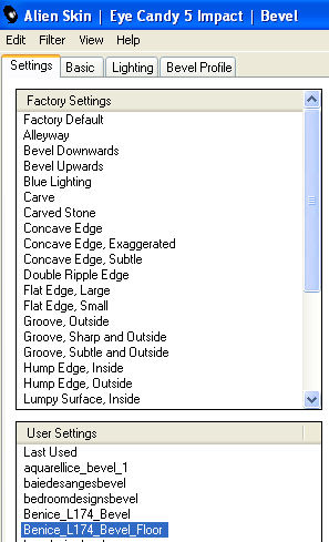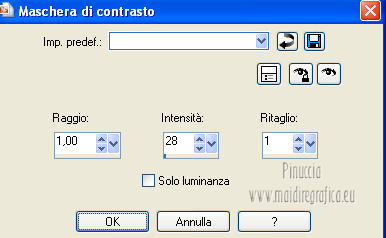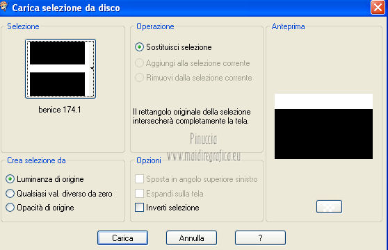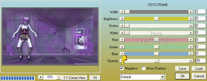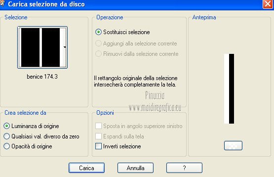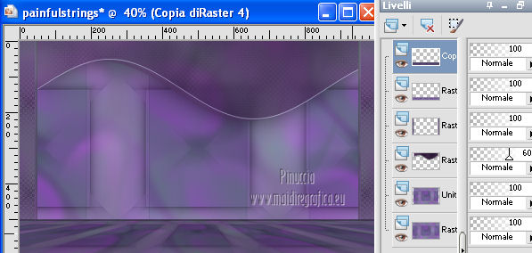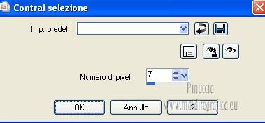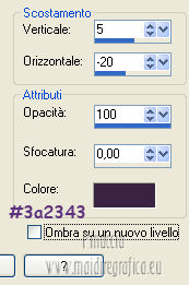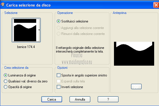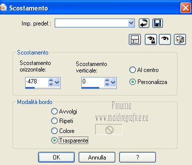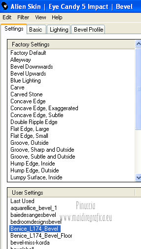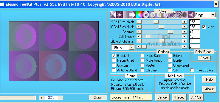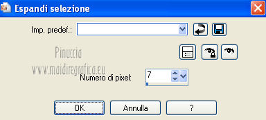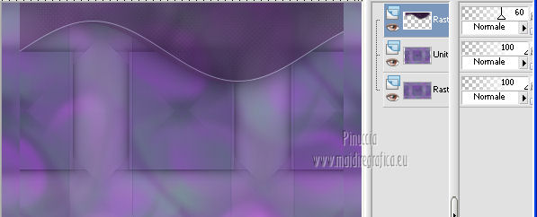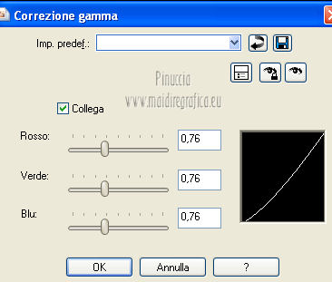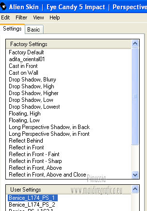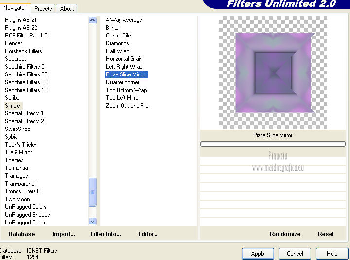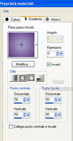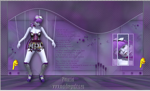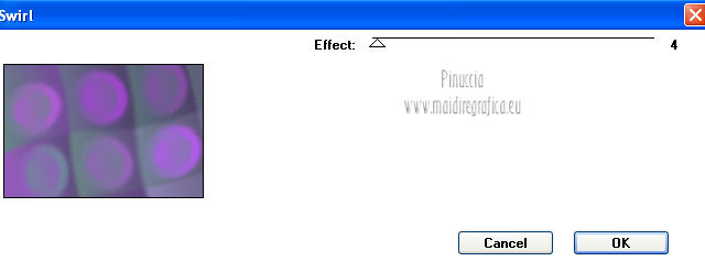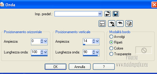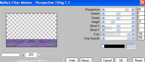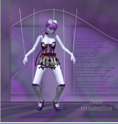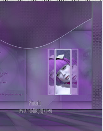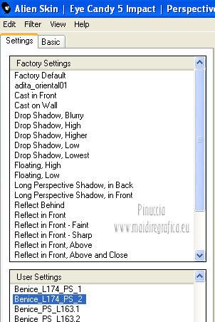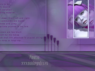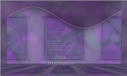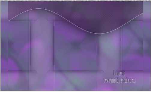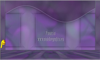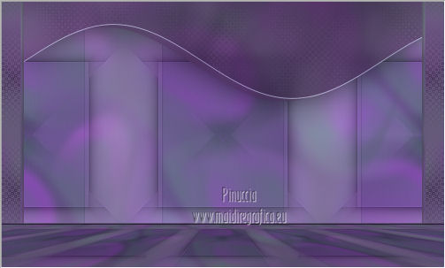 qui puoi trovare qualche risposta ai tuoi dubbi. Se l'argomento che ti interessa non è presente, ti prego di segnalarmelo. Occorrente: Materiale qui I tubes e la cornice sono di Benice e non possono essere condivisi nei gruppi, né usati per altri tutorial. Filtri: consulta, se necessario, la mia sezione filtri qui Filters Unlimited 2.0 qui Simple qui Forrest's Filters qui AAA Frames qui Mura's Meister qui Lotis Filters qui I filtri Simple si possono usare da soli, o importati in Filters Unlimited. Come importare un filtro in Unlimited qui ![]() Metti i preset nelle relative cartelle del filtro Alien Skin Eye Candy 5 Impact>Settings>Shadow/Bevel Cliccando sul file una o due volte (a seconda delle tue impostazioni), automaticamente il preset si installerà nella cartella corretta. Metti le selezioni nella cartella Selezioni. Imposta il colore di primo piano con #5d317c, e il colore di sfondo con #afafd3. ![]() Passa il colore di primo piano a Gradiente, stile Sprazzo di luce. ![]() 1. Apri una nuova immagine trasparente 900 x 600 pixels, e riempila con il gradiente.Selezione>Seleziona tutto. Apri il tube Benice_L174_Misted Puppet e vai a Modifica>Copia. minimizza il tube perchè ti servirà ancora Torna al tuo lavoro e vai a Modifica>Incolla nella selezione. Selezione>Deseleziona. 2. Sullo stesso livello. Effetti>Effetti di immagine>Motivo unico. ![]() Effetti>Plugins>Lotis Filters - Mosaic Toolkit Plus: ![]() Regola>Sfocatura>Sfocatura gaussiana - raggio 10. ![]() Effetti>Plugins>Forrest's Filters - Swirl. ![]() Effetti>Effetti di immagine>Motivo unico. ![]() 3. Dovresti avere questo. ![]() 4. Livelli>Duplica. Effetti>Plugins>AAA Frames - Foto Frame. ![]() Immagine>Ruota per gradi - 90 gradi a destra. ![]() Immagine>Ridimensiona, al 104%, tutti i livelli non selezionato. ![]() Effetti>Plugins>Filters Unlimited 2.0 - Simple - Pizza Slice Mirror. ![]() 5. Livelli>Duplica. Immagine>Rifletti. Abbassa l'opacità di questo livello al 50%. Livelli>Unisci>Unisci giù. Effetti>Effetti di immagine>Motivo unico. ![]() Premi sulla tastiera la combinazione di tasti Maiuscola+G per attivare Correzione Gamma. ![]() Effetti>Effetti di bordo>Aumenta. Abbassa l'opacità di questo livello al 55%. Livelli>Unisci>Unisci visibile. 6. Dovresti avere questo. ![]() 7. Finestra>Duplica (o, sulla tastiera, maiuscola+D) per fare una copia. Sul duplicato: Livelli>Unisci>Unisci tutto, e minimizzalo. 8. Passa il colore di primo piano da Gradiente al colore iniziale #5D317C. ![]() 9. Torna al tuo lavoro originale. Livelli>Nuovo livello raster. Selezione>Carica/Salva selezione>Carica selezione da disco. Cerca e carica la selezione Benice 174.1. ![]() Riempi la selezione con il colore di primo piano.Selezione>Deseleziona. Effetti>Effetti di distorsione>Onda. ![]() 10. Sullo stesso livello. Selezione>Seleziona tutto. Selezione>Mobile. Selezione>Immobilizza. Livelli>Nuovo livello raster. Apri il tube Benice_L174_Golf e vai a Modifica>Copia. Torna al tuo lavoro e vai a Modifica>Incolla nella selezione. Selezione>Deseleziona. Abbassa l'opacità di questo livello al 75%. Livelli>Unisci>Unisci giù. 11. Imposta il colore di sfondo con #cfd0ee. ![]() 12. Livelli>Nuovo livello raster. Selezione>Carica/Salva selezione>Carica selezione da disco. Cerca e carica la selezione Benice 174.2. ![]() Ingrandisci bene l'immagine per visualizzare meglio lo spazio da riempire.Riempi la selezione con il colore di sfondo.Selezione>Deseleziona. Effetti>Effetti di distorsione>Onda. ![]() Effetti>Effetti di immagine>Scostamento. ![]() Livelli>Unisci>Unisci giù. Effetti>Effetti 3D>Sfalsa ombra, con il colore #3a2343. ![]() 13. Sullo stesso livello. Selezione>Seleziona tutto. Selezione>Mobile. Selezione>Immobilizza. Attiva il livello inferiore. Regola>Sfocatura>Sfocatura gaussiana - raggio 10. ![]() Selezione>Deseleziona. 14. Attiva nuovamente il livello superiore. Effetti>Plugins>Alien Skin Eye Candy 5 Impact - Perspective Shadow. Seleziona il preset Benice_L174_PS_1 e ok. ![]() Abbassa l'opacità di questo livello al 60%. Immagine>Dimensioni tela. ![]() 15. Livelli>Nuovo livello raster. Selezione>Seleziona tutto. Attiva il duplicato che hai minimizzato al punto 7. ![]() Modifica>Copia. non chiuderlo perchè ti servirà ancora Torna al tuo lavoro e vai a Modifica>Incolla nella selezione. Selezione>Deseleziona. Regola>Sfocatura>Sfocatura gaussiana - raggio 10. Livelli>Disponi>Porta sotto. Dovresti avere questo. ![]() Lascia questo lavoro in attesa. 16. Imposta il colore di primo piano con #503b63. ![]() 17. Apri una nuova immagine trasparente 100 x 700 pixels. Selezione>Carica/Salva selezione>Carica selezione da disco. Cerca e carica la selezione Benice 174.3. ![]() Riempi la selezione con il colore di primo piano.Mantieni selezionato. Livelli>Duplica. Selezione>Modifica>Espandi - 7 pixels. ![]() Effetti>Plugins>Alien Skin Eye Candy 5 Impact - Bevel. Seleziona il preset Benice_L174_Bevel e ok. ![]() Livelli>Disponi>Sposta giù. Selezione>Modifica>Contrai - 7 pixels. ![]() 18. Attiva il livello superiore. Livelli>Nuovo livello raster. Apri il tube Benice_L174_Strookje e vai a Modifica>Copia. Torna al tuo lavoro e vai a Modifica>Incolla nella selezione. Selezione>Deseleziona. Abbassa l'opacità di questo livello al 50%. Livelli>Unisci>Unisci visibile. ![]() Modifica>Copia. Attiva il livello superiore dell'immagine originale. ![]() Modifica>Incolla come nuovo livello. Effetti>Effetti di immagine>Scostamento. ![]() Livelli>Duplica. Immagine>Rifletti. Livelli>Unisci>Unisci giù. 19. Attiva nuovamente il duplicato del punto 7. Su questo duplicato: Immagine>Ridimensiona, 1000 x 667 pixels, tutti i livelli selezionato. ![]() Modifica>Copia. Attiva il lavoro originale e vai a Modifica>Incolla come nuovo livello. Effetti>Plugins>Mura's Meister - Perspective Tiling. ![]() Effetti>Effetti di immagine>Scostamento. ![]() 20. Livelli>Duplica. Effetti>Plugins>Alien Skin Eye Candy 5 Impact - Bevel. Seleziona il preset Benice_L174_Bevel_Floor e ok. ![]() Effetti>E