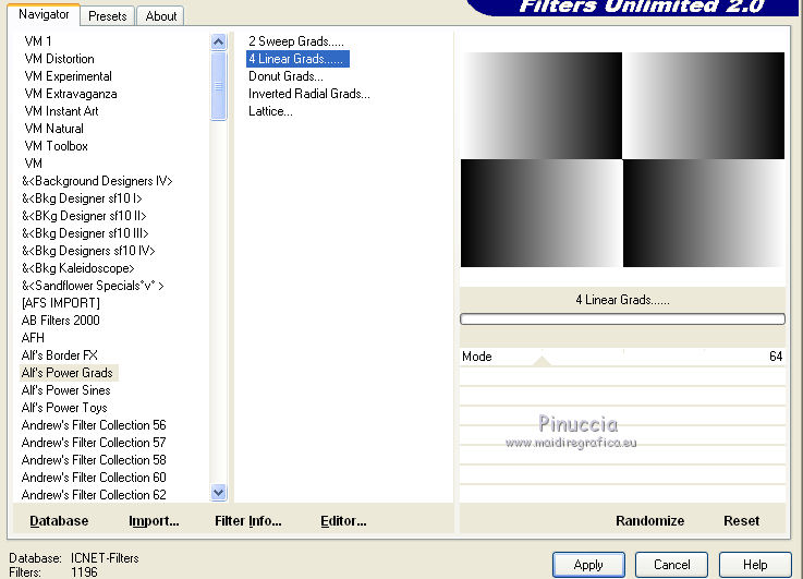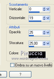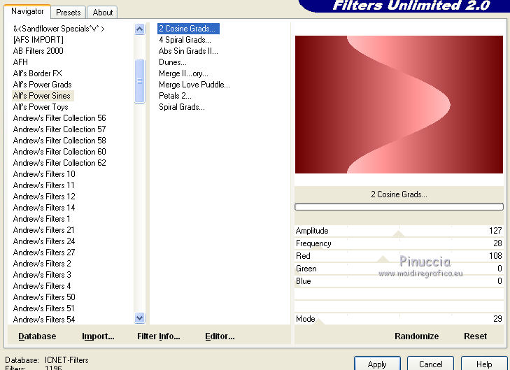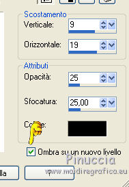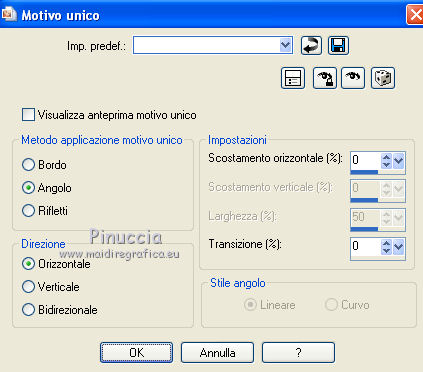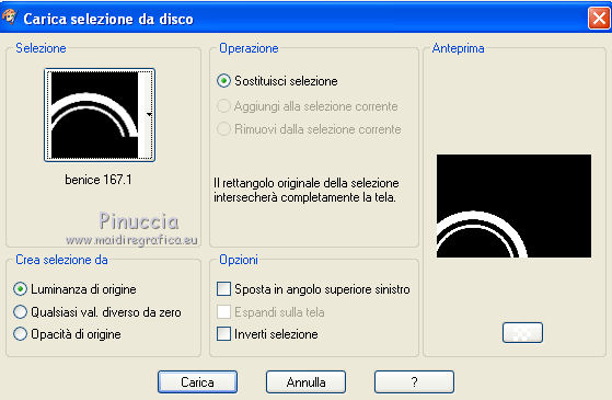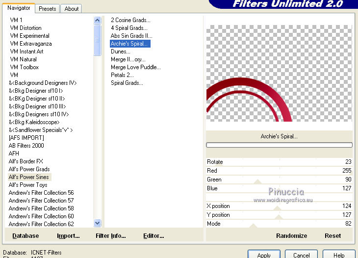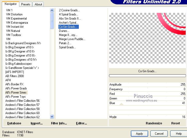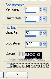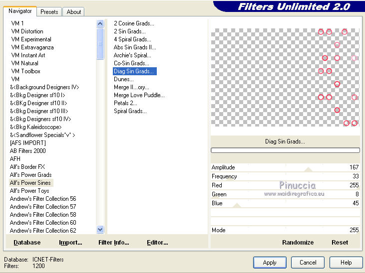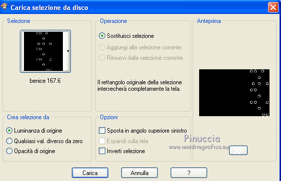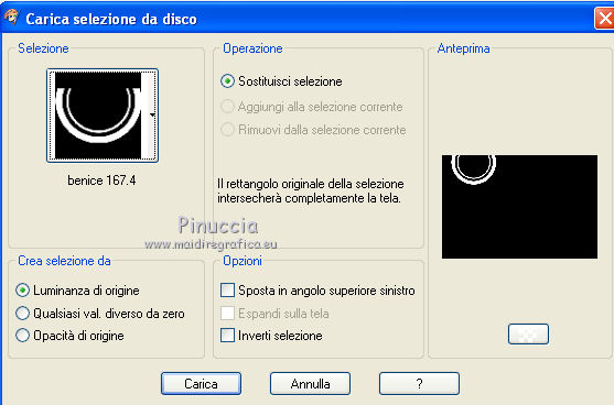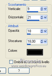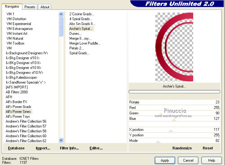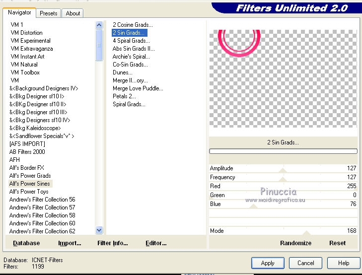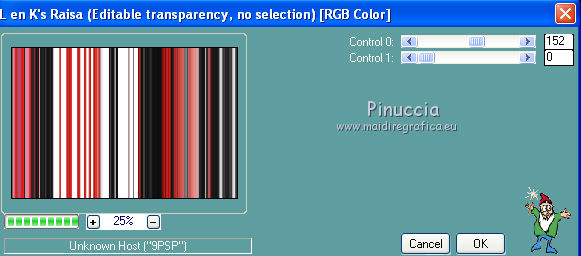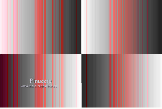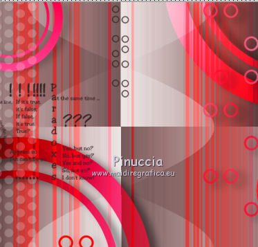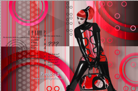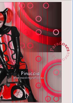qui puoi trovare qualche risposta ai tuoi dubbi. Se l'argomento che ti interessa non è presente, ti prego di segnalarmelo. Occorrente: Materiale qui Il tube della donna è di Benice e non può essere usato per altri tutorial. Filtri: consulta, se necessario, la mia sezione filtri qui Filters Unlimited 2.0 qui Alf's Power Sines (da importare in Unlimited) qui Alf's Power Grads (da importare in Unlimited) qui L&K Raisa qui Transparency - Eliminate Black qui ![]() Metti i pennelli nella cartella Pennelli. Attenzione, ogni pennello è composto da due files che non devono essere separati. Vedi gli appunti sui pennelli qui Metti le selezioni nella cartella Selezioni. Imposta il colore di primo piano con #ffffff, e il colore di sfondo con #000000. ![]() 1. Apri una nuova immagine trasparente 900 x 600 pixels, e riempila con il colore di primo piano.2. Livelli>Nuovo livello raster. Selezione>Seleziona tutto. Apri il tube Benice_Woman_L167 e vai a Modifica>Copia. Torna al tuo lavoro e vai a Modifica>Incolla nella selezione. Selezione>Deseleziona. Effetti>Effetti di immagine>Motivo unico. ![]() Livelli>Unisci>Unisci giù. 3. Sullo stesso livello: Effetti>Plugins>L&K - L&K Raisa. ![]() Effetti>Plugins>Transparency - Eliminate Black. Livelli>Unisci>Unisci tutto. 4. Livelli>Duplica. Effetti>Plugins>Filters Unlimited 2.0 - Alf's Power Grads - 4 Linear Grads. ![]() Immagine>Rifletti. Immagine>Capovolgi. Cambia la modalità di miscelatura di questo livello in Luminanza (esistente), e abbassa l'opacità all'85%. 5. Dovresti avere questo: ![]() 6. Livelli>Nuovo livello raster. Riempi il livello con il colore di primo piano.Effetti>Plugins>Filters Unlimited 2.0 - Alf's Power Sines - 2 Cosine Grads. ![]() Cambia la modalità di miscelatura di questo livello in Luminanza, e abbassa l'opacità al 36%. 7. Livelli>Duplica. Immagine>Rifletti. Cambia la modalità di miscelatura di questo livello in Sovrapponi, e mantieni l'opacità al 36%. Livelli>Unisci>Unisci visibile. 8. Livelli>Nuovo livello raster. Selezione>Carica/Salva selezione>Carica selezione da disco. Cerca e carica la selezione Benice 167.1. ![]() Riempi la selezione con il colore di sfondo.Selezione>Deseleziona. Effetti>Plugins>Filters Unlimited 2.0 - Alf's Power Sines - Archie's Spiral. ![]() Effetti>Effetti di immagine>Scostamento. ![]() Effetti>Effetti 3D>Sfalsa ombra. ![]() Cambia la modalità di miscelatura di questo livello in Luce netta. 9. Livelli>Nuovo livello raster. Selezione>Carica/Salva selezione>Carica selezione da disco. Cerca e carica la selezione Benice 167.2. ![]() Riempi la selezione con il colore di sfondo.Mantieni selezionato. Effetti>Plugins>Filters Unlimited 2.0 - Alf's Power Sines - Archie's Spiral. ![]() Selezione>Deseleziona. Cambia la modalità di miscelatura di questo livello in Colore. Effetti>Effetti 3D>Sfalsa ombra, ombra su nuovo livello selezionato. ![]() 10. Attiva il livello superiore. Livelli>Nuovo livello raster. Selezione>Carica/Salva selezione>Carica selezione da disco. Cerca e carica la selezione Benice 167.3. ![]() Riempi la selezione con il colore di sfondo.Selezione>Deseleziona. Effetti>Plugins>Filters Unlimited 2.0 - Alf's Power Sines - Co-Sin Grads. ![]() Effetti>Effetti 3D>Sfalsa ombra, ombra su nuovo livello non selezionato. ![]() Cambia la modalità di miscelatura di questo livello in Sovrapponi. 11. Livelli>Nuovo livello raster. Selezione>Carica/Salva selezione>Carica selezione da disco. Cerca e carica la selezione Benice 167.4. ![]() Riempi la selezione con il colore di sfondo.Selezione>Deseleziona. Effetti>Plugins>Filters Unlimited 2.0 - Alf's Power Sines - 2 Sin Grads. ![]() Effetti>Effetti 3D>Sfalsa ombra. ![]() Lascia la modalità di miscelatura di questo livello in Normale. 12. Dovresti avere questo. ![]() 13. Livelli>Nuovo livello raster. Selezione>Carica/Salva selezione>Carica selezione da disco. Cerca e carica la selezione Benice 167.5. ![]() Riempi la selezione con il colore di primo piano.Selezione>Deseleziona. Effetti>Effetti 3D>Sfalsa ombra. ![]() Abbassa l'opacità di questo livello al 20%. 14. Livelli>Nuovo livello raster. Selezione>Carica/Salva selezione>Carica selezione da disco. Cerca e carica la selezione Benice 167.6. ![]() Riempi la selezione con il colore di sfondo.Selezione>Deseleziona. Effetti>Plugins>Filters Unlimited 2.0 - Alf's Power Sines - Diag Sin Grads. ![]() Abbassa l'opacità di questo livello all'85%. Effetti>Effetti 3D>Sfalsa ombra, ombra su nuovo livello selezionato. ![]() Cambia la modalità di miscelatura del livello dell'ombra in Moltiplica. 15. Attiva il livello superiore. Apri il tube Cirkels_Benice_L167 e vai a Modifica>Copia. Torna al tuo lavoro e vai a Modifica>Incolla come nuovo livello. Effetti>Effetti di immagine>Scostamento. ![]() Effetti>Effetti 3D>Sfalsa ombra, ombra su nuovo livello non selezionato. ![]() 16. Dovresti avere questo. ![]() 17. Imposta il colore di primo piano con #372626. 18. Livelli>Nuovo livello raster. Attiva lo strumento Pennello ![]() Cerca e seleziona il pennello Benice_L167_Paradoxes, con i seguenti settaggi. ![]() Applica il pennello, come nel mio esempio, cliccando con il tasto sinistro del mouse, per usare il colore di primo piano. ![]() 19. Livelli>Nuovo livello raster. Cerca e seleziona il pennello Benice_L167_Deco, ![]() e applicalo a destra, sempre cliccando con il tasto sinistro del mouse, per usare il colore di primo piano. ![]() 20. Apri il tube Benice_Woman_L167 e vai a Modifica>Copia. Torna al tuo lavoro e vai a Modifica>Incolla come nuovo livello. Posiziona il tube come nel mio esempio.![]() Effetti>Effetti 3D>Sfalsa ombra. ![]() 21. Livelli>Unisci>Unisci tutto. Immagine>Aggiungi bordatura, 1 pixel, simmetriche, con il colore #382727. Immagine>Aggiungi bordatura, simmetriche non selezionato, con il colore #ebe2e2. ![]() 22. Apri il tube Tekst_Benice_L167 e vai a Modifica>Copia. Torna al tuo lavoro e vai a Modifica>Incolla come nuovo livello. Posiziona il tube come nel mio esempio.![]() 23. Immagine>Aggiungi bordatura